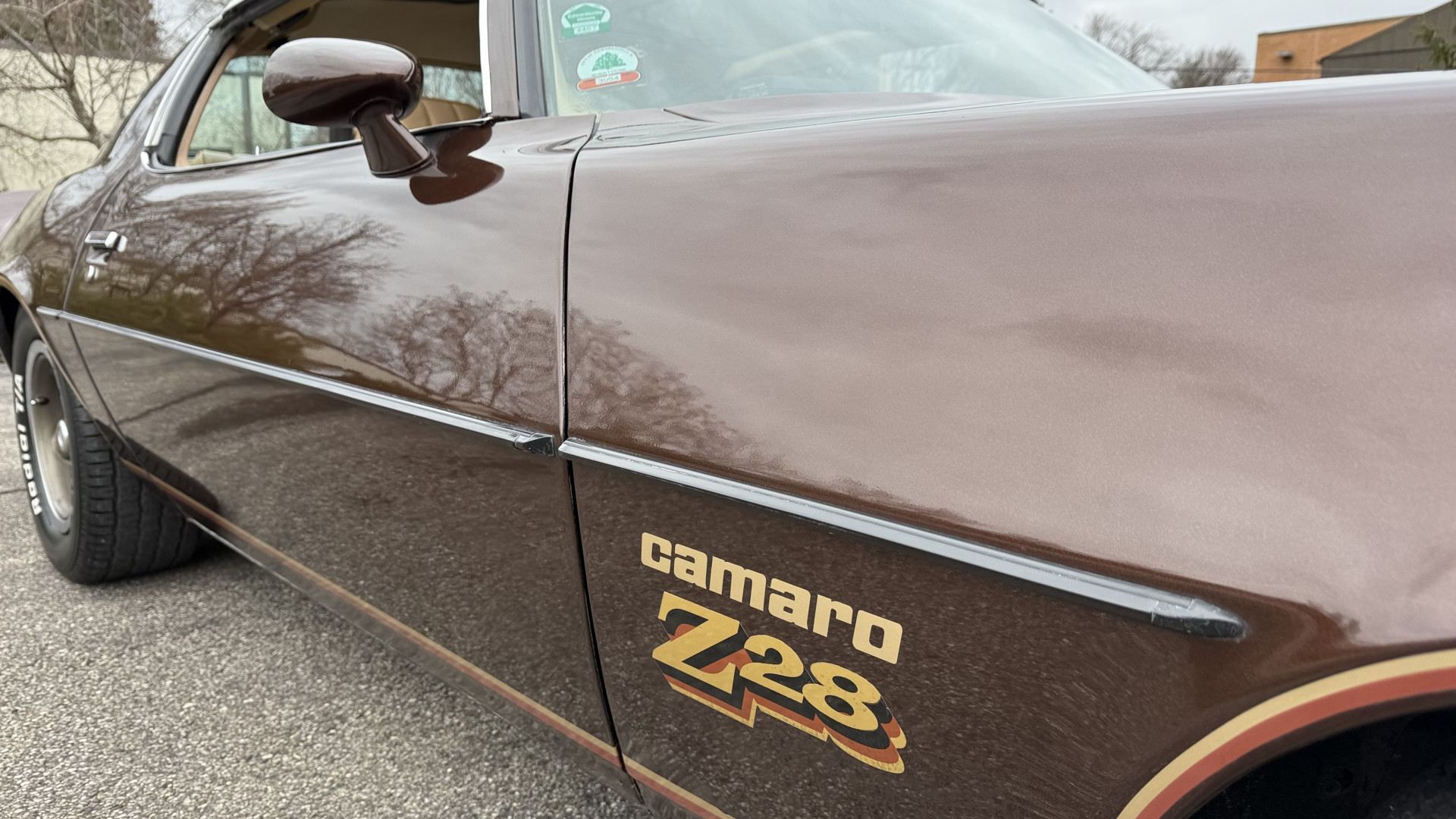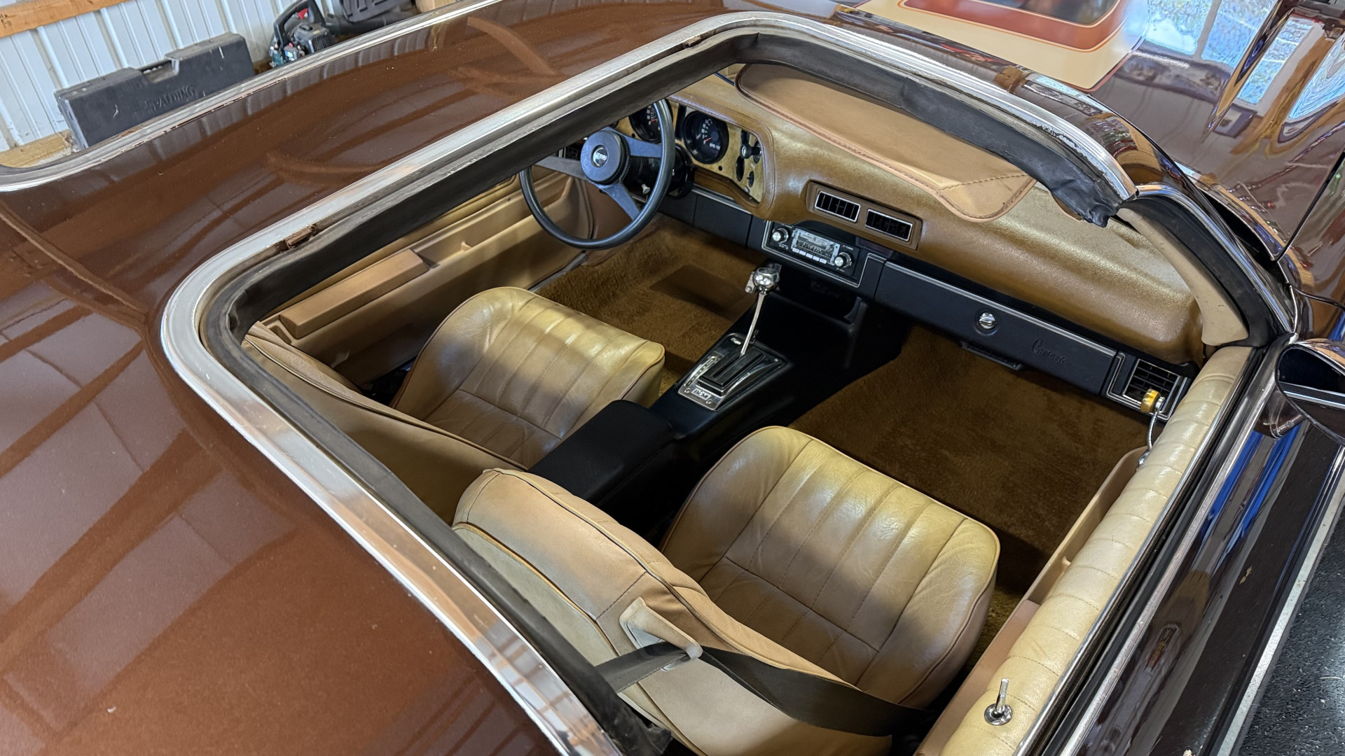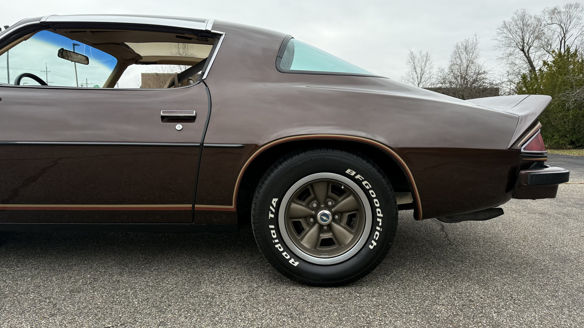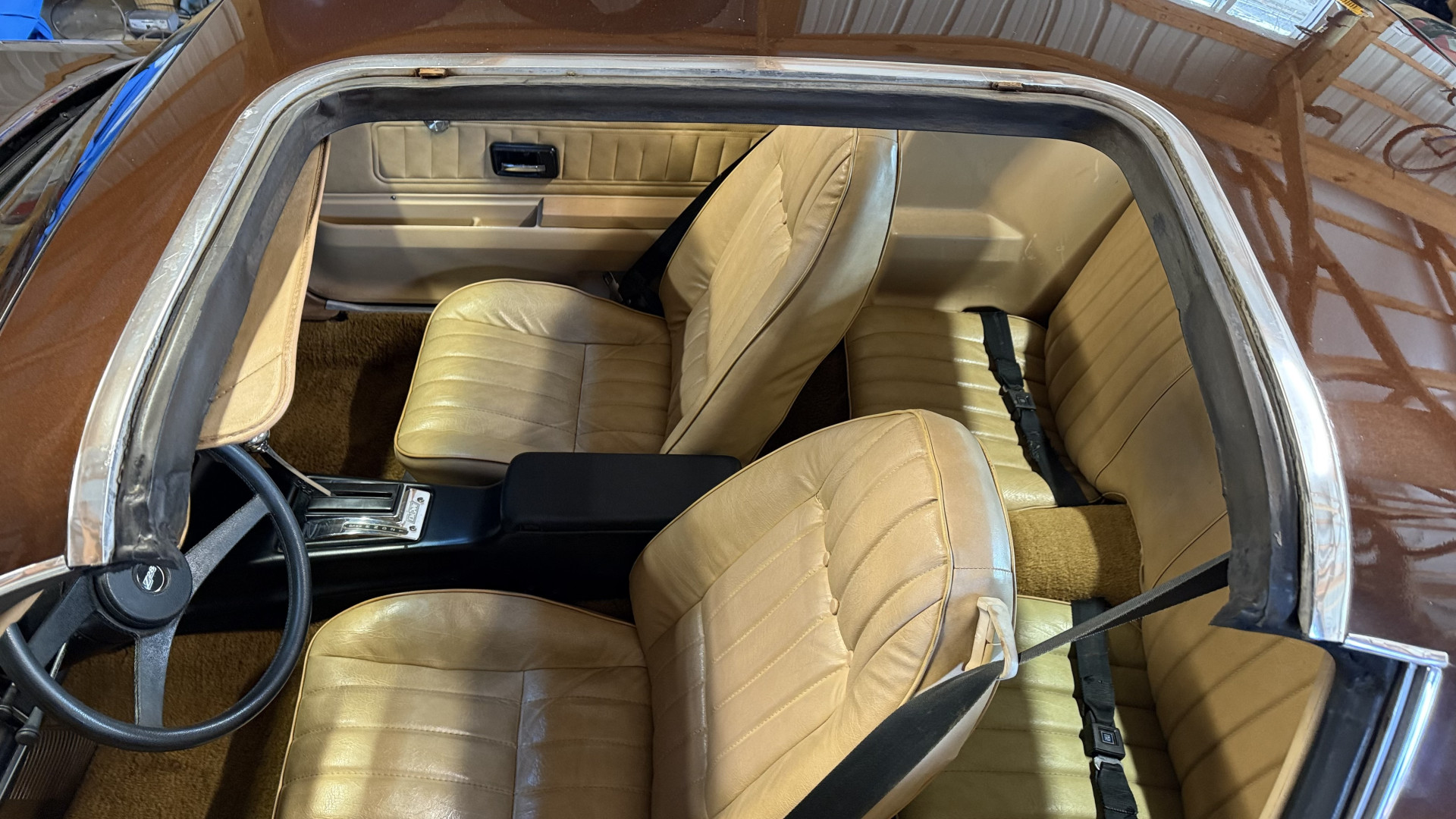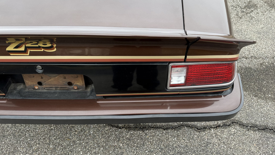 The Brown exterior is in nice stock condition. T Tops were added in 1978 and the receipt and product brochure are still with the car. These tops look great and come off and on nicely and seal very well. This Z28 features correct factory brown paint with Z28 decals and trim and was repainted. The paint is in great condition and shows well and the decals look new. Both bumpers are in good shape with no flaking paint. The paint has a nice shine and good gloss and is smooth to the touch. There may be some imperfections that are not noticeable in the photos, but nothing was intentionally excluded from the photos. The tires have good tread left and the factory wheels are in great shape. All weather stripping and window sweeps are in good condition. Trunk is very solid and clean with the original correct trunk mat and full size spare.