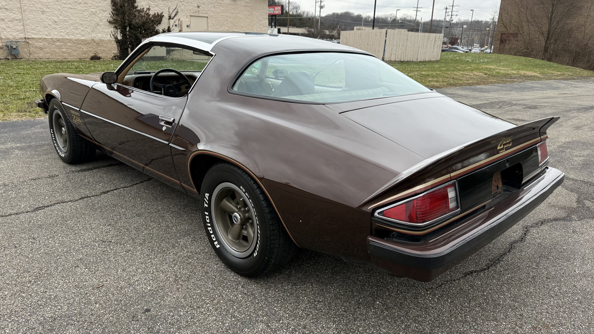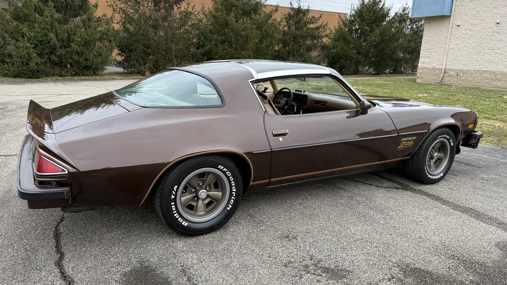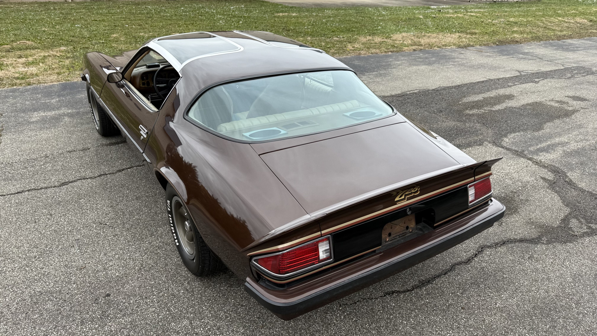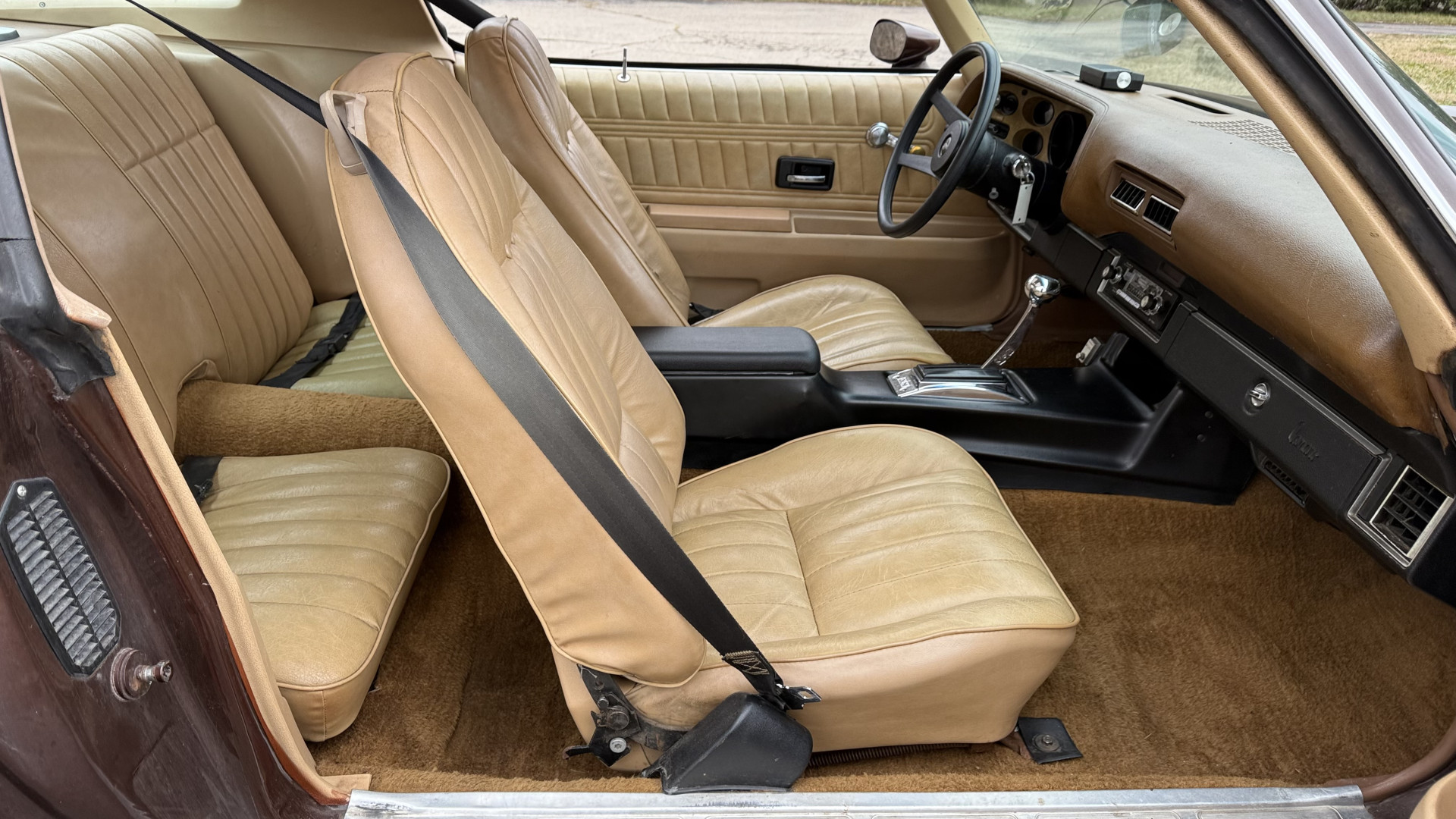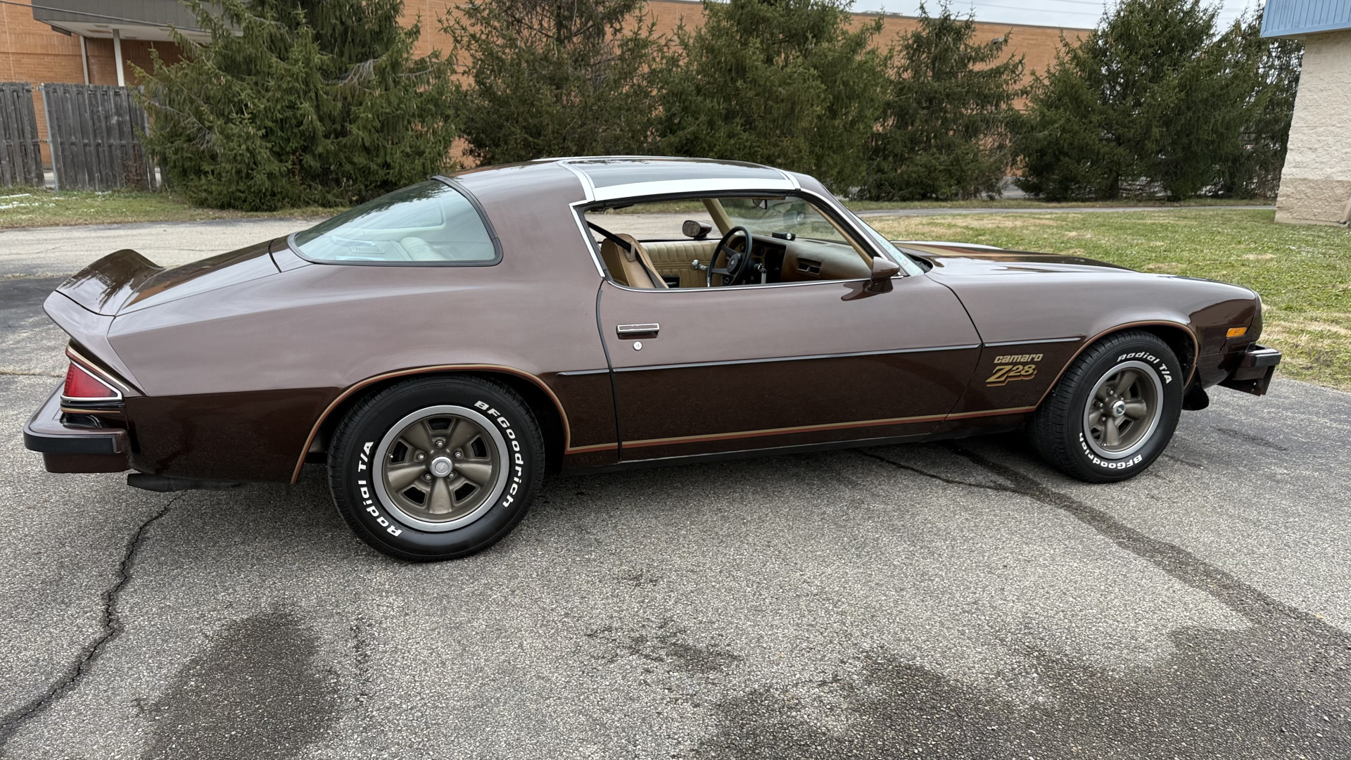 The Brown exterior is in nice stock condition. T Tops were added in 1978 and the receipt and product brochure are still with the car. These tops look great and come off and on nicely and seal very well. This Z28 features correct factory brown paint with Z28 decals and trim and was repainted. The paint is in great condition and shows well and the decals look new. Both bumpers are in good shape with no flaking paint. The paint has a nice shine and good gloss and is smooth to the touch. There may be some imperfections that are not noticeable in the photos, but nothing was intentionally excluded from the photos. The tires have good tread left and the factory wheels are in great shape. All weather stripping and window sweeps are in good condition. Trunk is very solid and clean with the original correct trunk mat and full size spare.