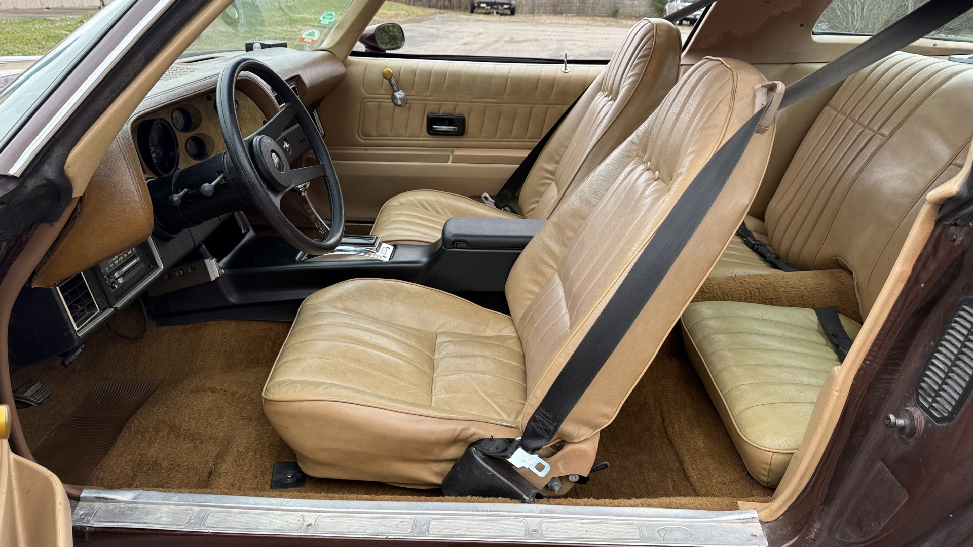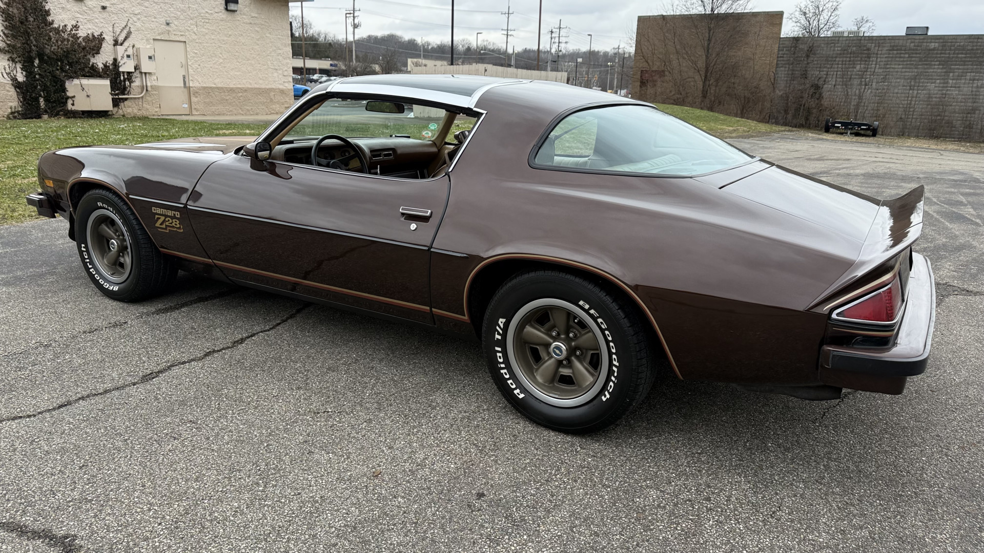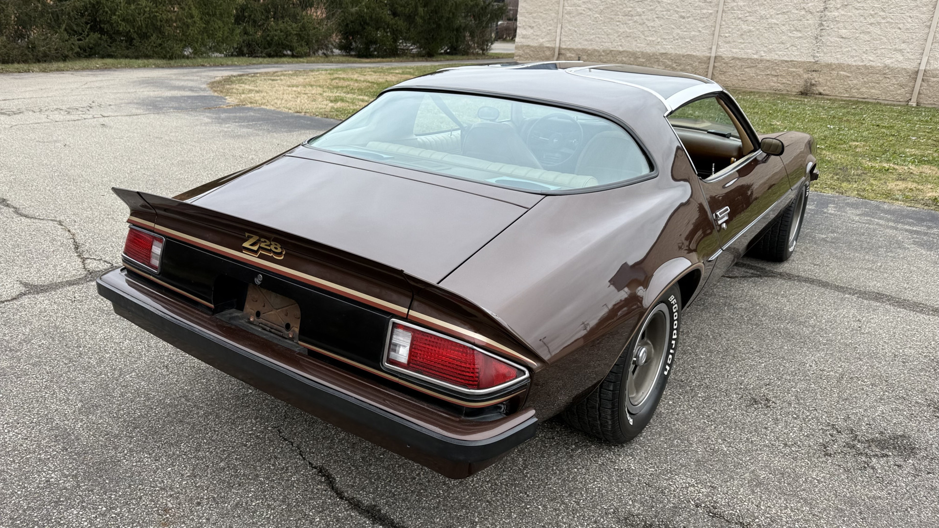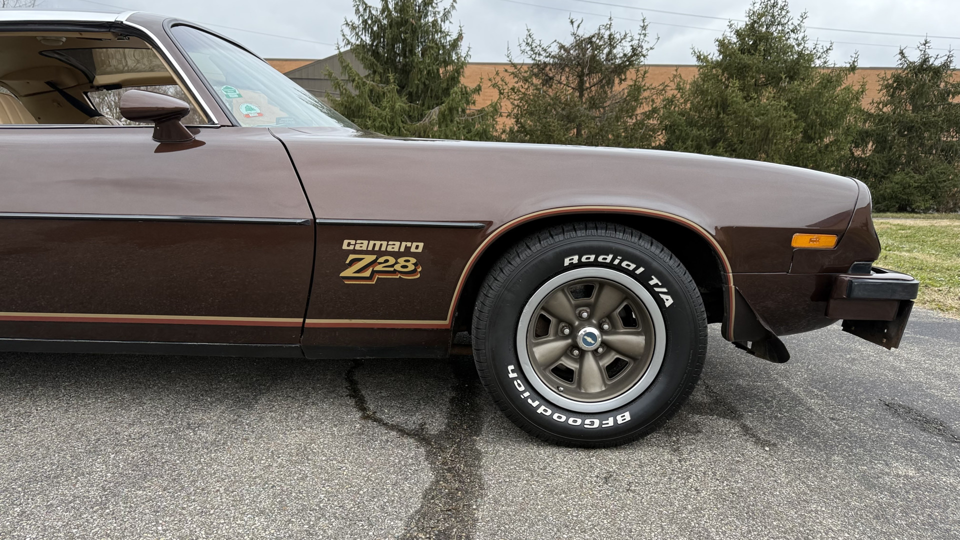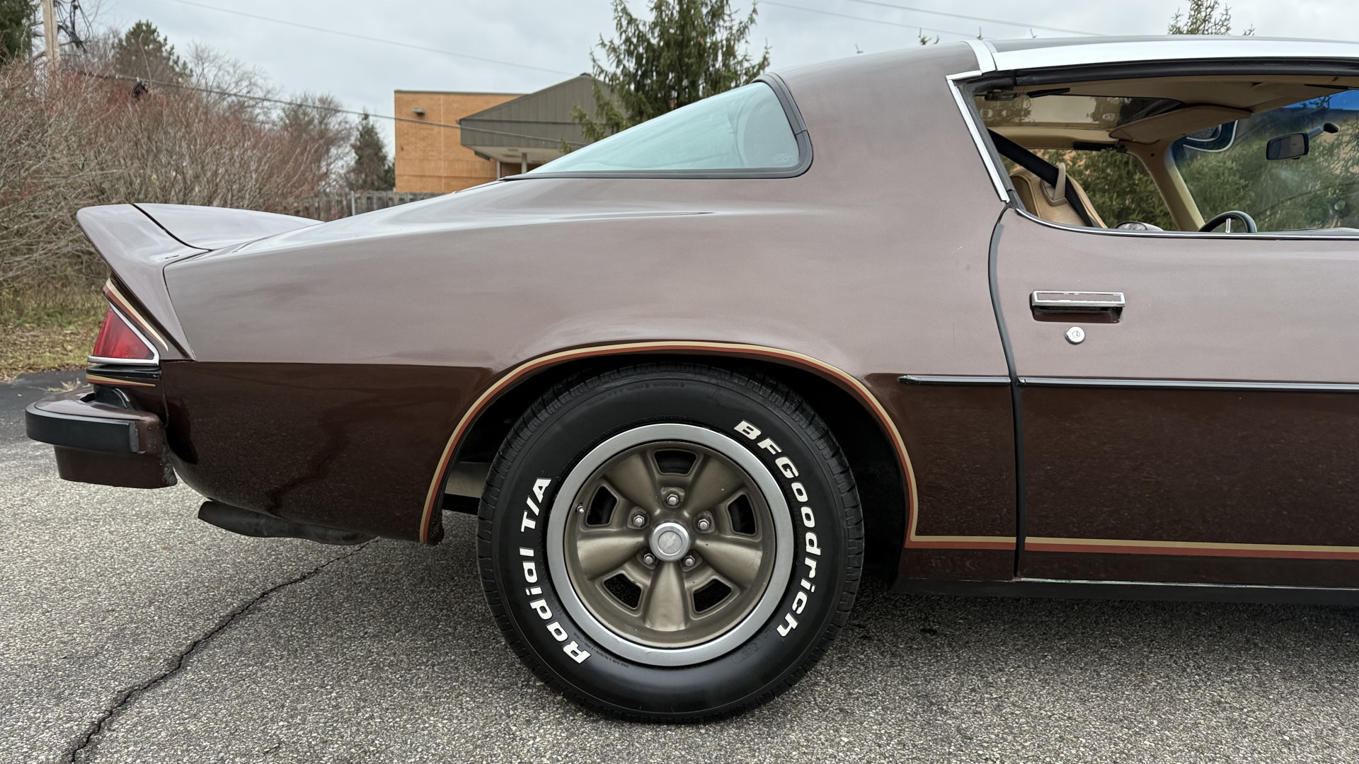 The Brown exterior is in nice stock condition. T Tops were added in 1978 and the receipt and product brochure are still with the car. These tops look great and come off and on nicely and seal very well. This Z28 features correct factory brown paint with Z28 decals and trim and was repainted. The paint is in great condition and shows well and the decals look new. Both bumpers are in good shape with no flaking paint. The paint has a nice shine and good gloss and is smooth to the touch. There may be some imperfections that are not noticeable in the photos, but nothing was intentionally excluded from the photos. The tires have good tread left and the factory wheels are in great shape. All weather stripping and window sweeps are in good condition. Trunk is very solid and clean with the original correct trunk mat and full size spare.