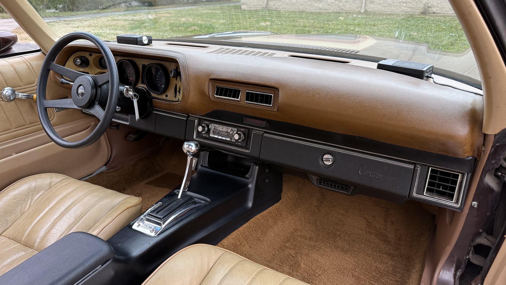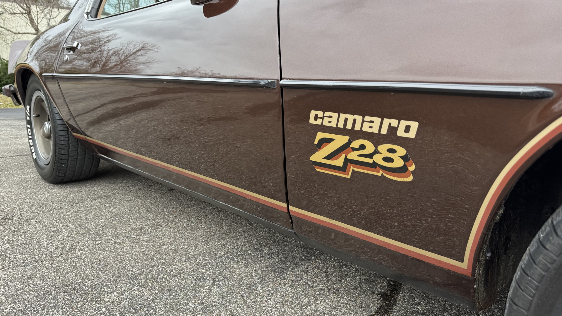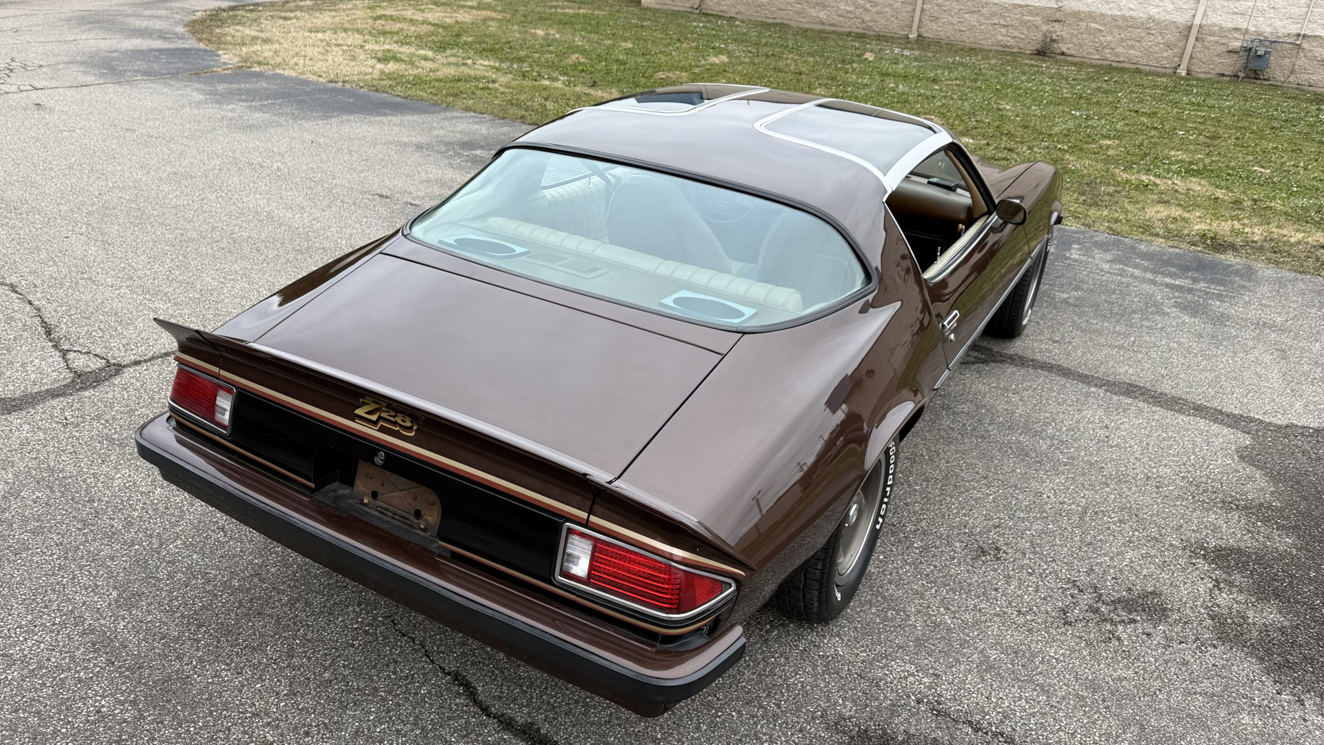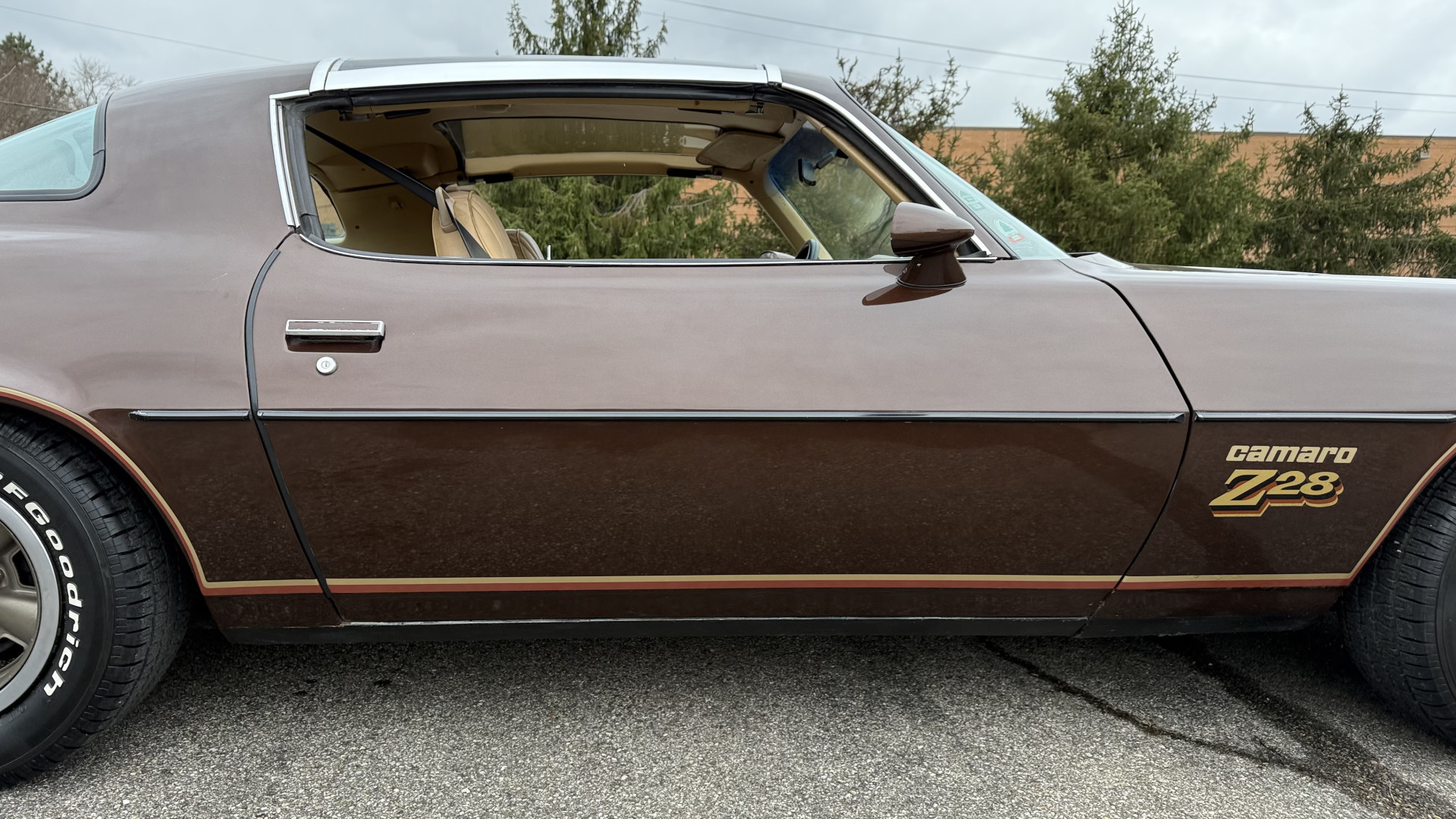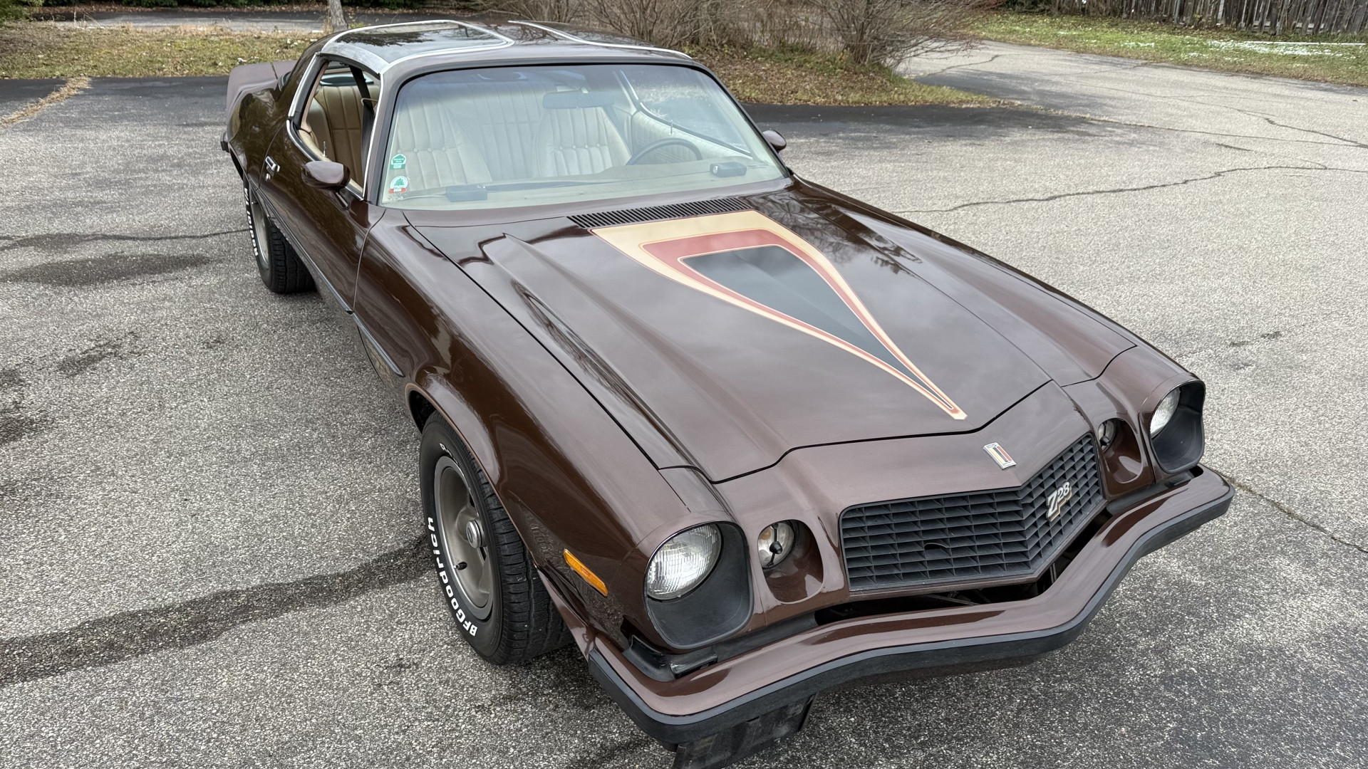 The Brown exterior is in nice stock condition. T Tops were added in 1978 and the receipt and product brochure are still with the car. These tops look great and come off and on nicely and seal very well. This Z28 features correct factory brown paint with Z28 decals and trim and was repainted. The paint is in great condition and shows well and the decals look new. Both bumpers are in good shape with no flaking paint. The paint has a nice shine and good gloss and is smooth to the touch. There may be some imperfections that are not noticeable in the photos, but nothing was intentionally excluded from the photos. The tires have good tread left and the factory wheels are in great shape. All weather stripping and window sweeps are in good condition. Trunk is very solid and clean with the original correct trunk mat and full size spare.