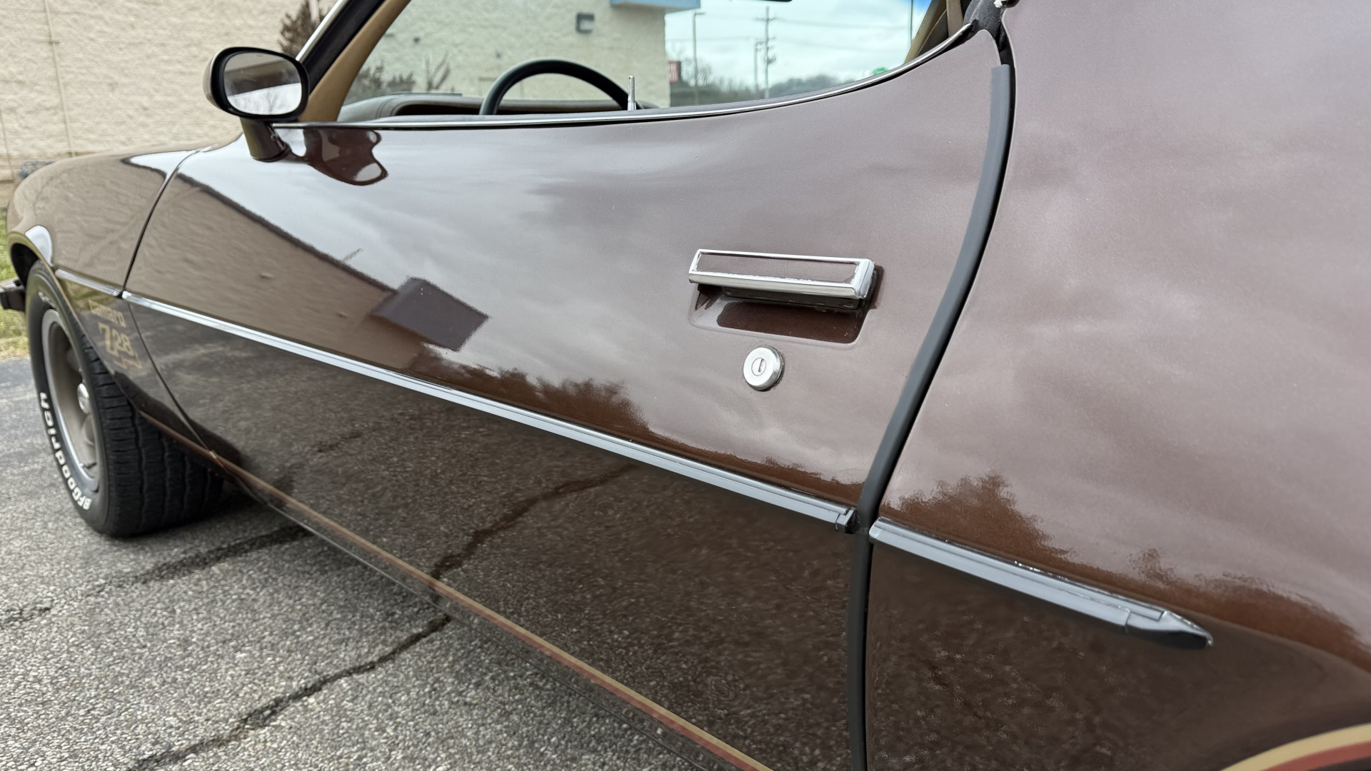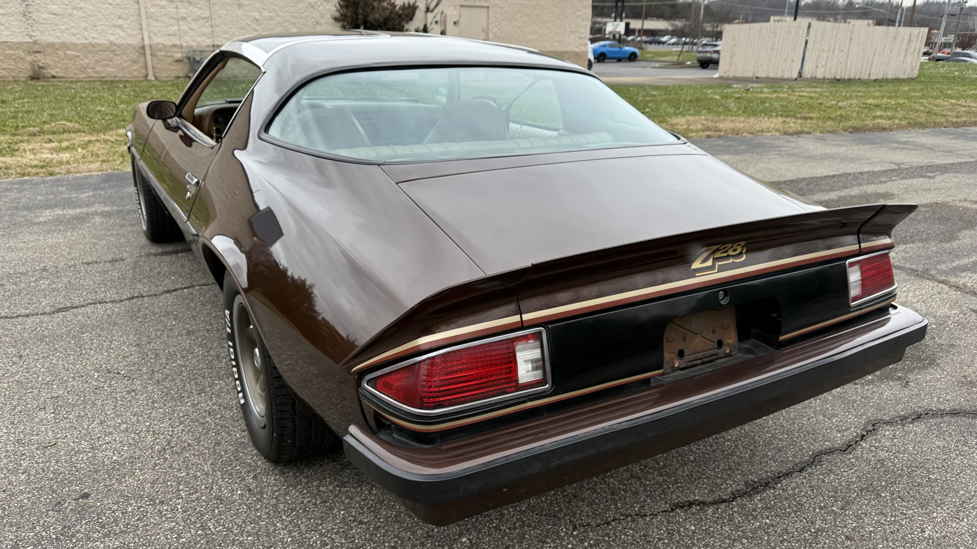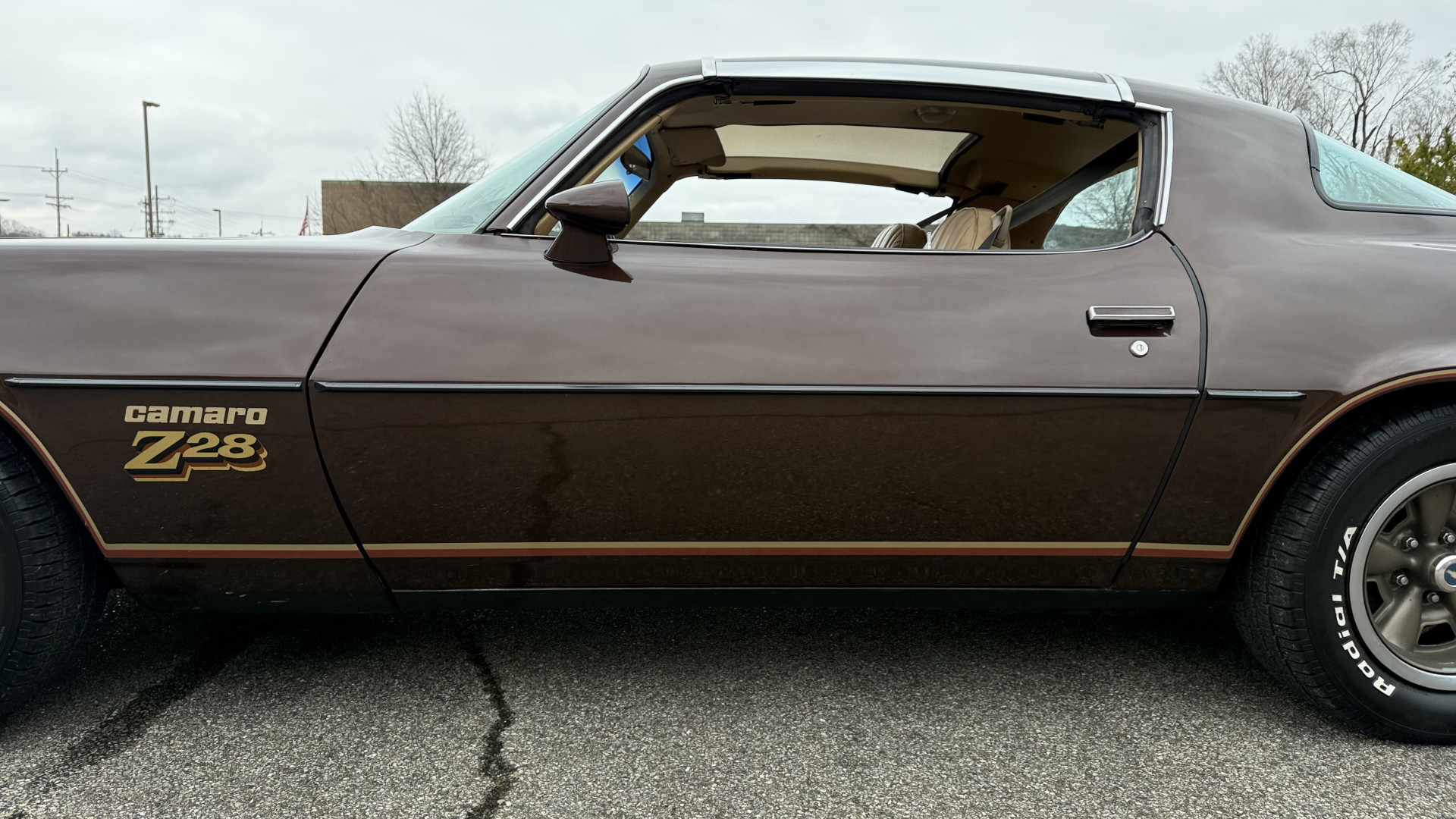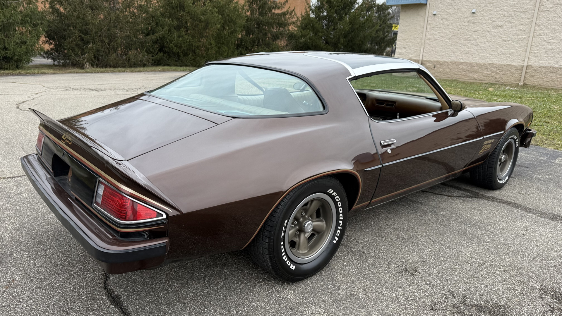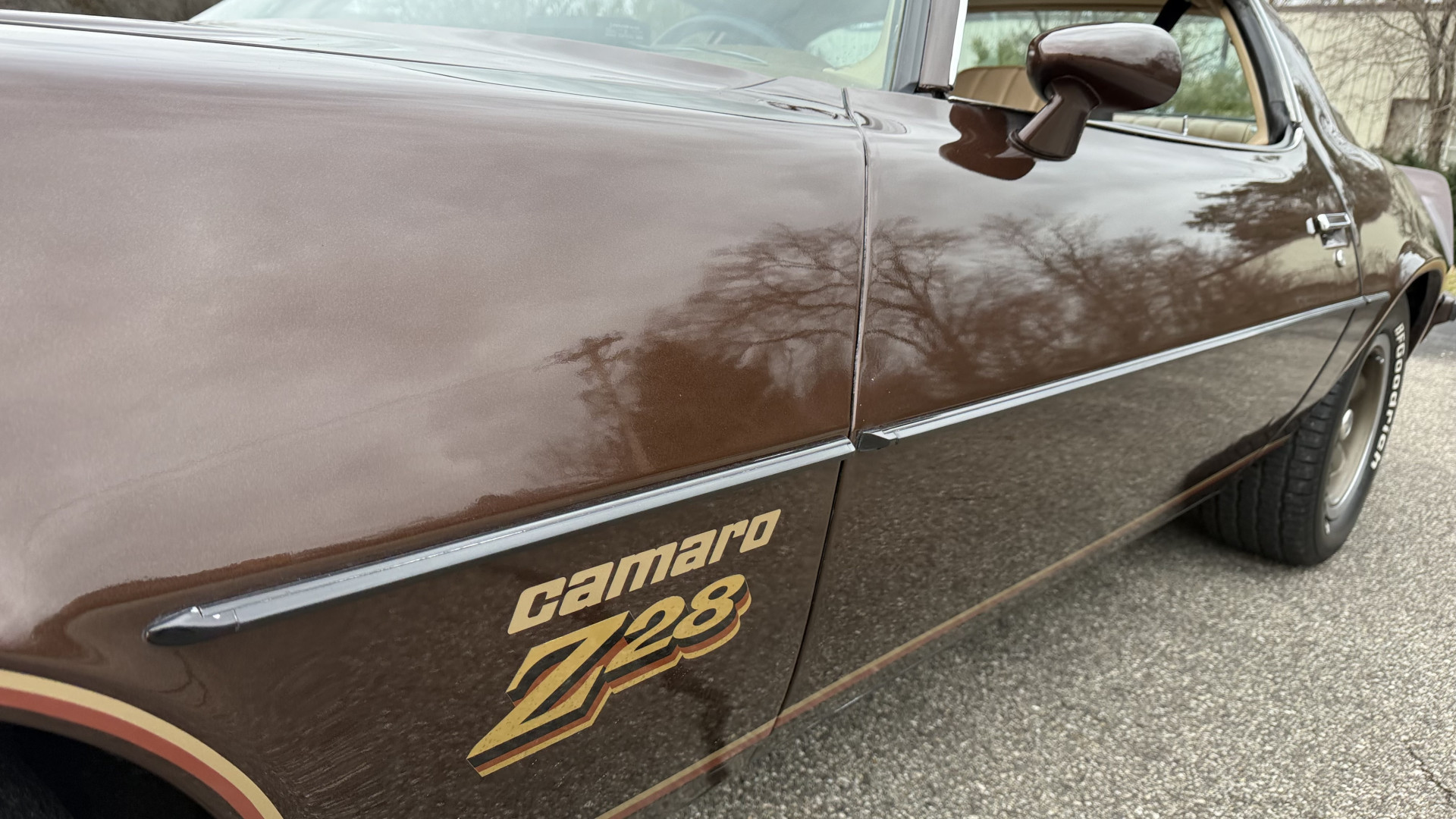 The Brown exterior is in nice stock condition. T Tops were added in 1978 and the receipt and product brochure are still with the car. These tops look great and come off and on nicely and seal very well. This Z28 features correct factory brown paint with Z28 decals and trim and was repainted. The paint is in great condition and shows well and the decals look new. Both bumpers are in good shape with no flaking paint. The paint has a nice shine and good gloss and is smooth to the touch. There may be some imperfections that are not noticeable in the photos, but nothing was intentionally excluded from the photos. The tires have good tread left and the factory wheels are in great shape. All weather stripping and window sweeps are in good condition. Trunk is very solid and clean with the original correct trunk mat and full size spare.