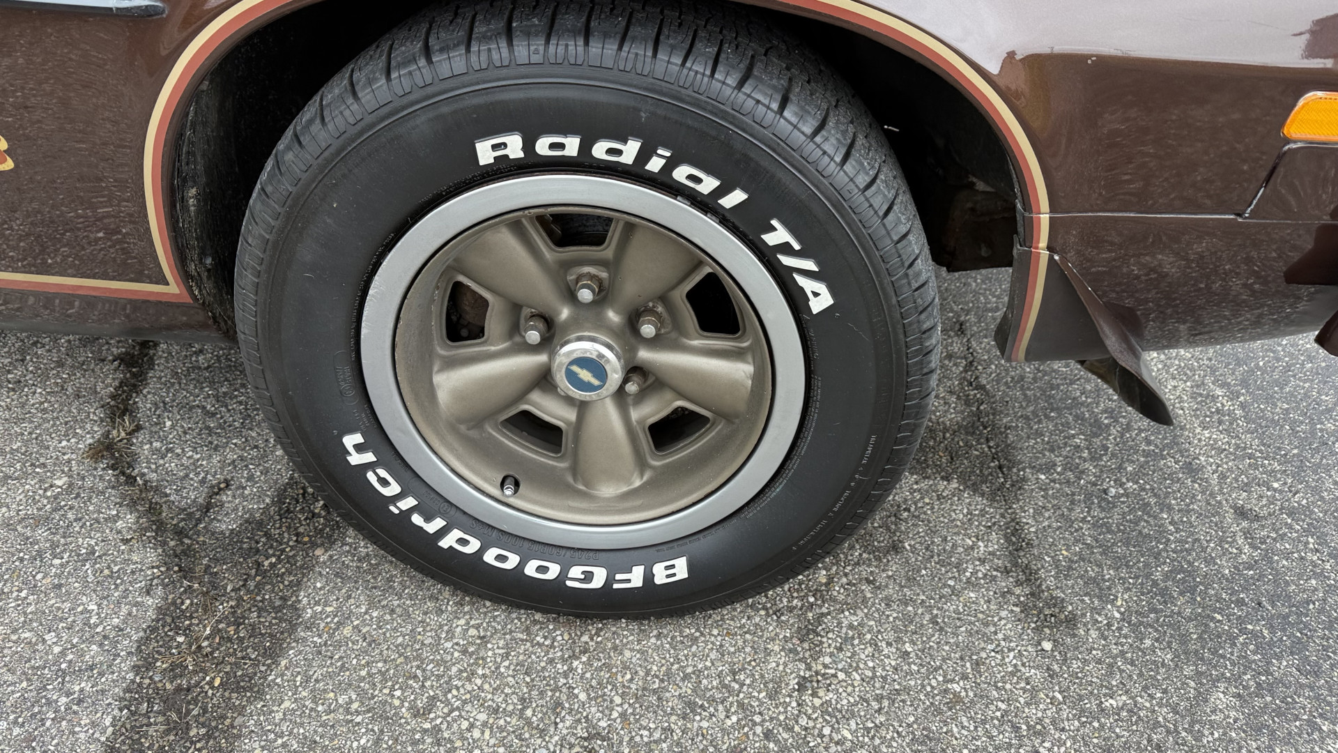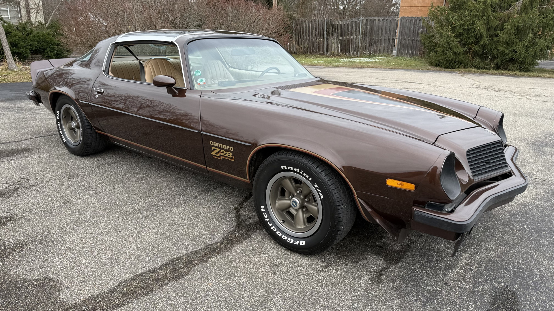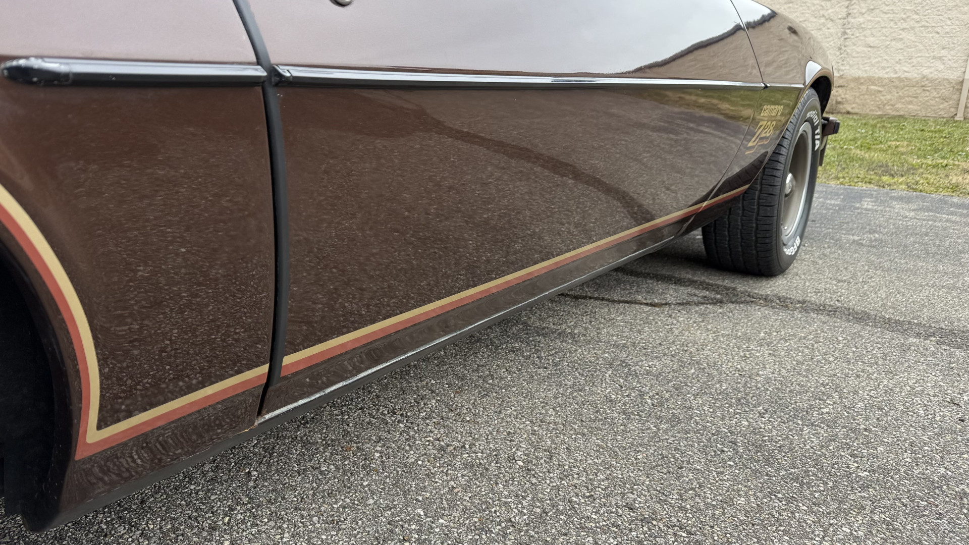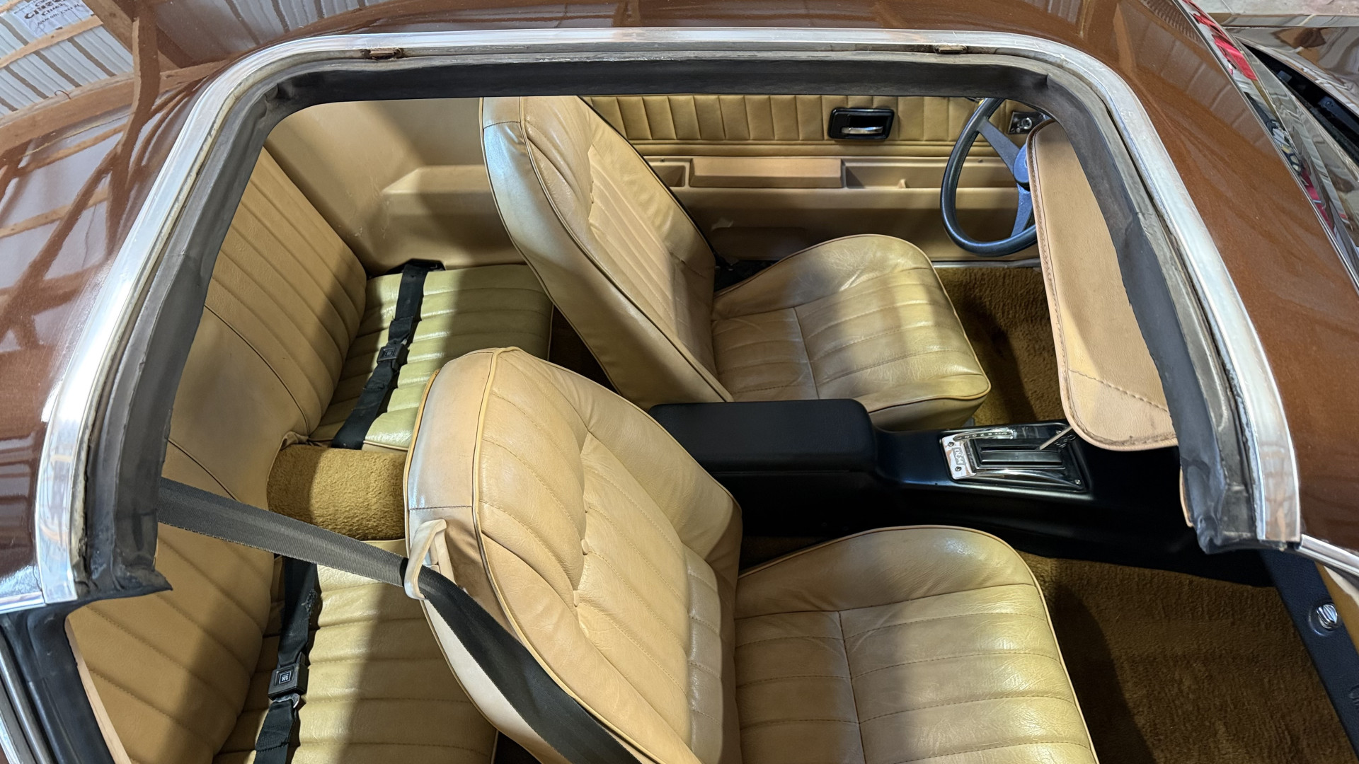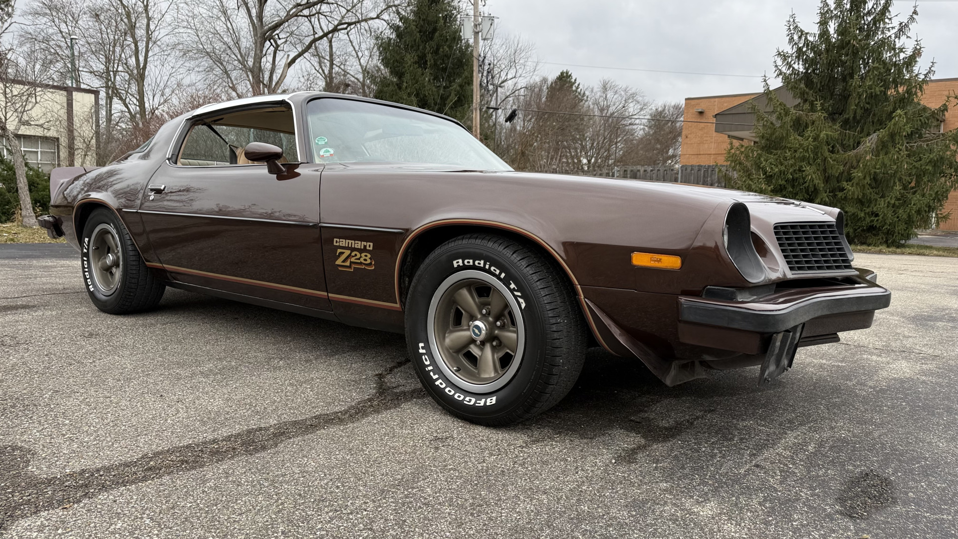 The Brown exterior is in nice stock condition. T Tops were added in 1978 and the receipt and product brochure are still with the car. These tops look great and come off and on nicely and seal very well. This Z28 features correct factory brown paint with Z28 decals and trim and was repainted. The paint is in great condition and shows well and the decals look new. Both bumpers are in good shape with no flaking paint. The paint has a nice shine and good gloss and is smooth to the touch. There may be some imperfections that are not noticeable in the photos, but nothing was intentionally excluded from the photos. The tires have good tread left and the factory wheels are in great shape. All weather stripping and window sweeps are in good condition. Trunk is very solid and clean with the original correct trunk mat and full size spare.