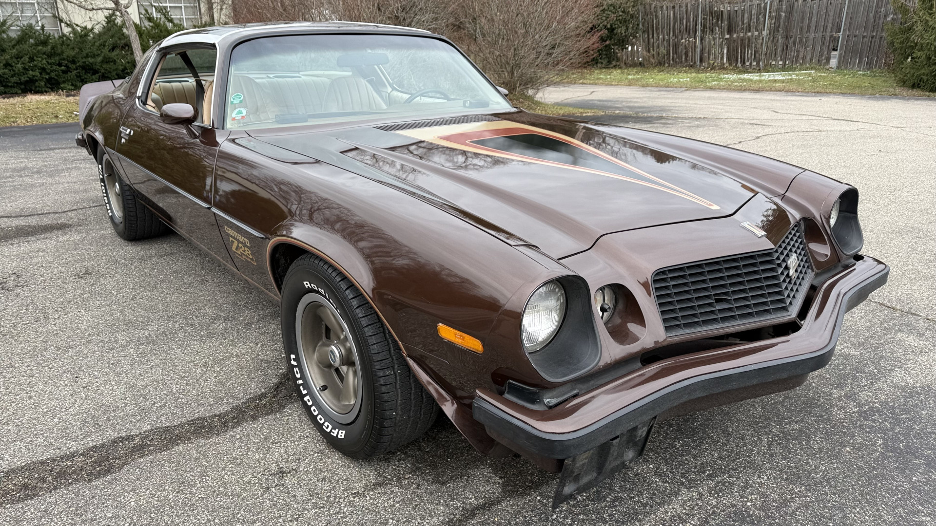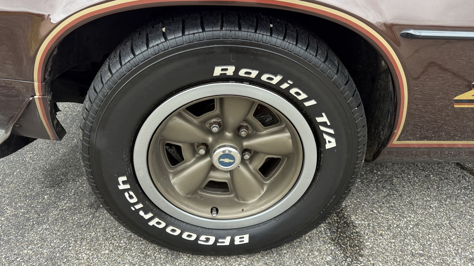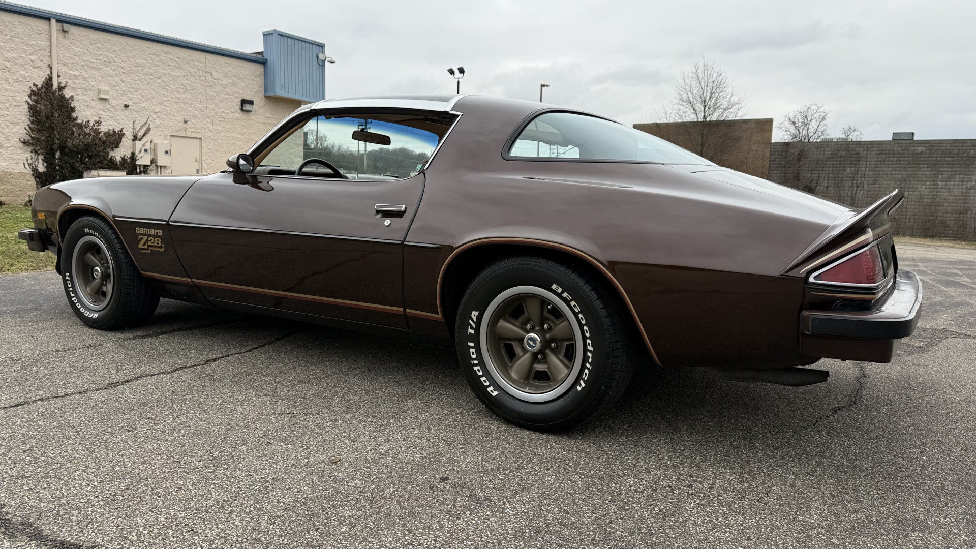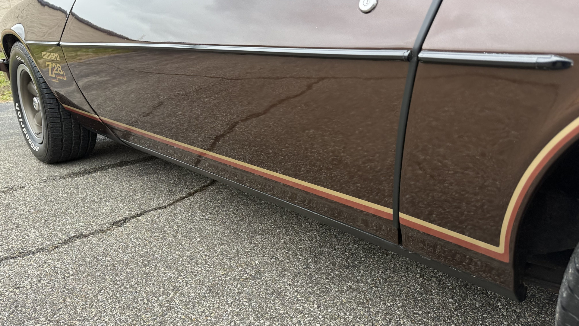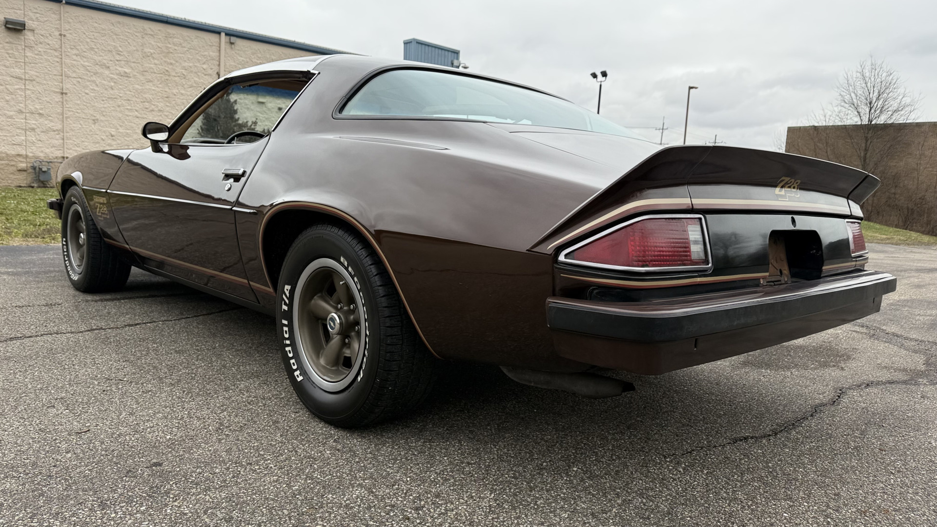 The Brown exterior is in nice stock condition. T Tops were added in 1978 and the receipt and product brochure are still with the car. These tops look great and come off and on nicely and seal very well. This Z28 features correct factory brown paint with Z28 decals and trim and was repainted. The paint is in great condition and shows well and the decals look new. Both bumpers are in good shape with no flaking paint. The paint has a nice shine and good gloss and is smooth to the touch. There may be some imperfections that are not noticeable in the photos, but nothing was intentionally excluded from the photos. The tires have good tread left and the factory wheels are in great shape. All weather stripping and window sweeps are in good condition. Trunk is very solid and clean with the original correct trunk mat and full size spare.