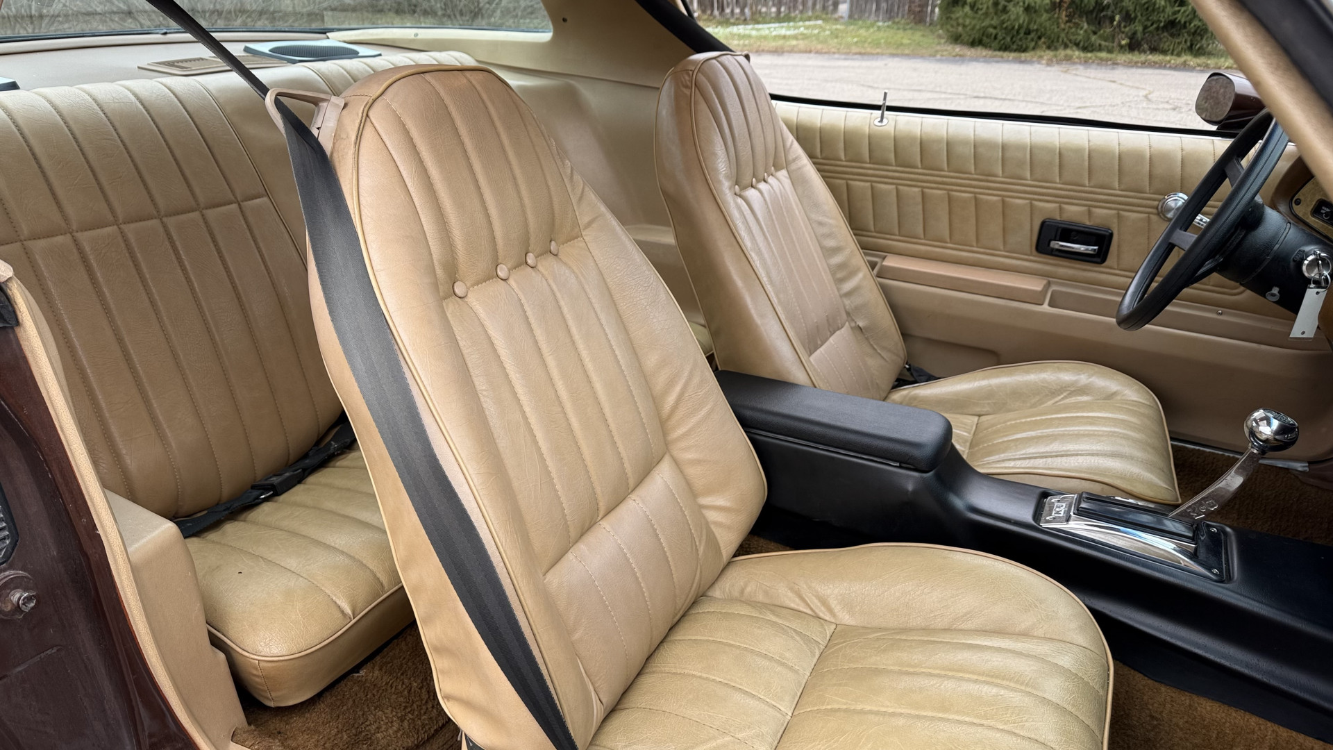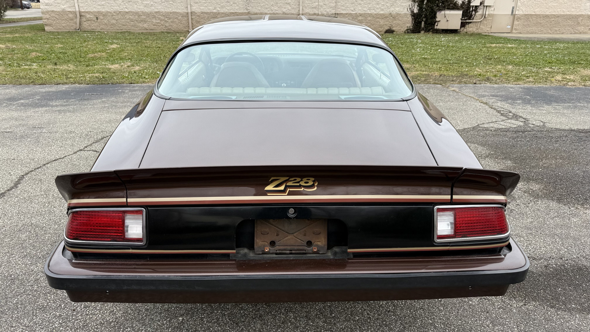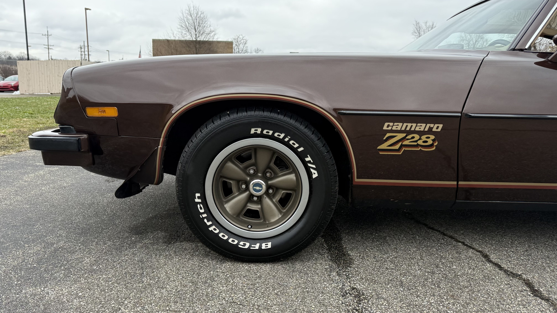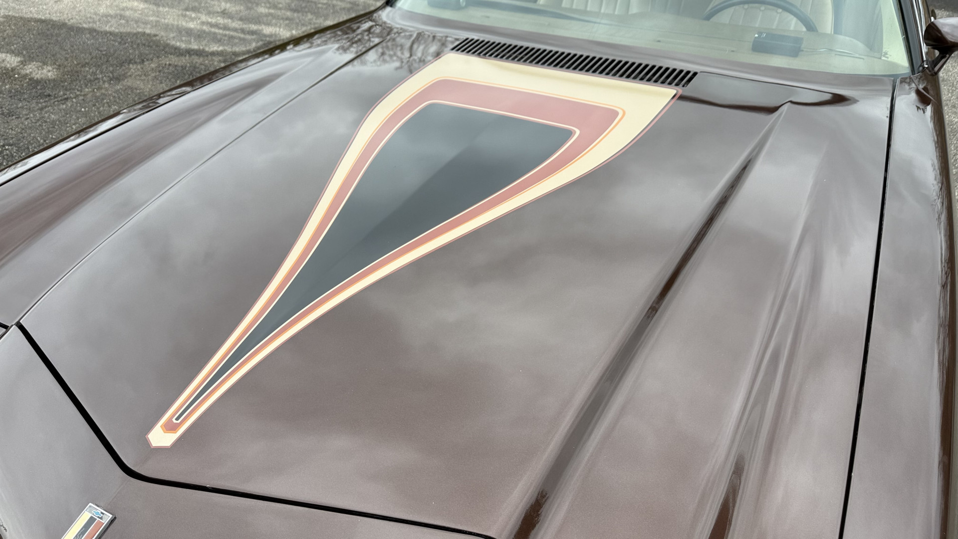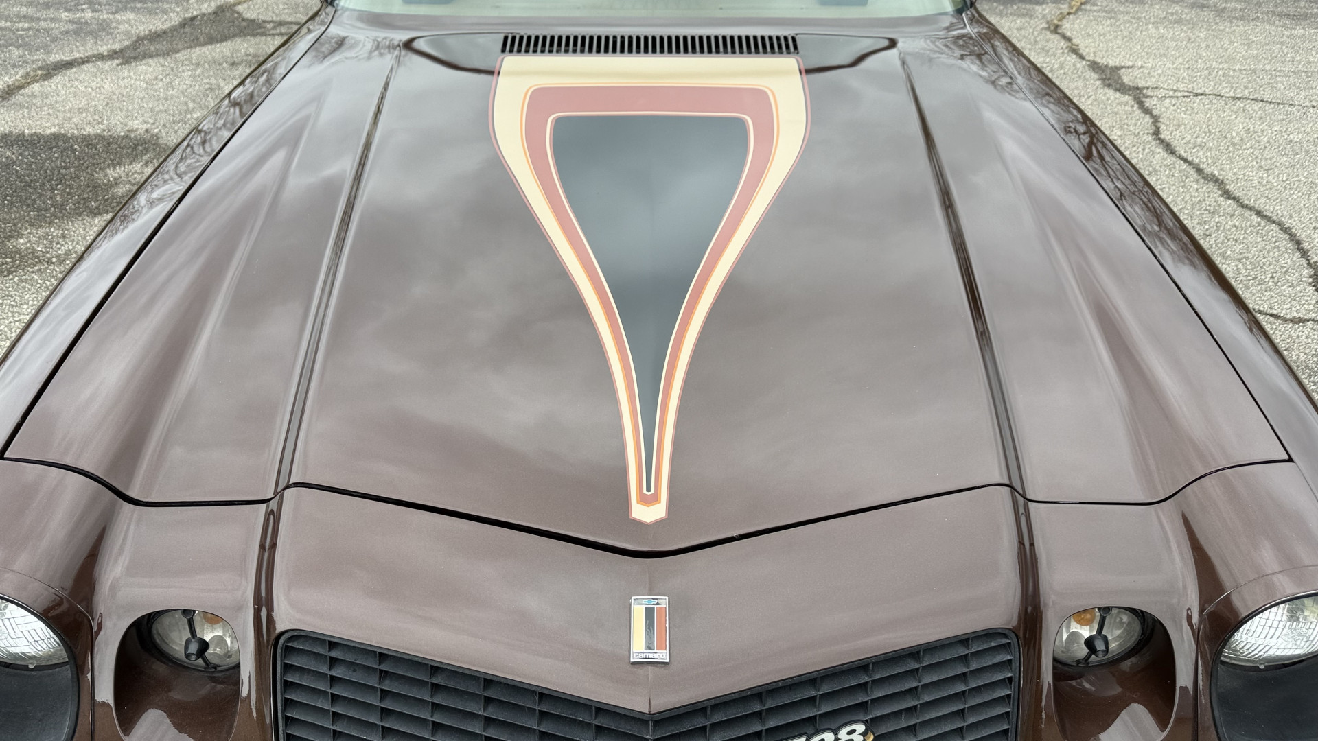 The Brown exterior is in nice stock condition. T Tops were added in 1978 and the receipt and product brochure are still with the car. These tops look great and come off and on nicely and seal very well. This Z28 features correct factory brown paint with Z28 decals and trim and was repainted. The paint is in great condition and shows well and the decals look new. Both bumpers are in good shape with no flaking paint. The paint has a nice shine and good gloss and is smooth to the touch. There may be some imperfections that are not noticeable in the photos, but nothing was intentionally excluded from the photos. The tires have good tread left and the factory wheels are in great shape. All weather stripping and window sweeps are in good condition. Trunk is very solid and clean with the original correct trunk mat and full size spare.