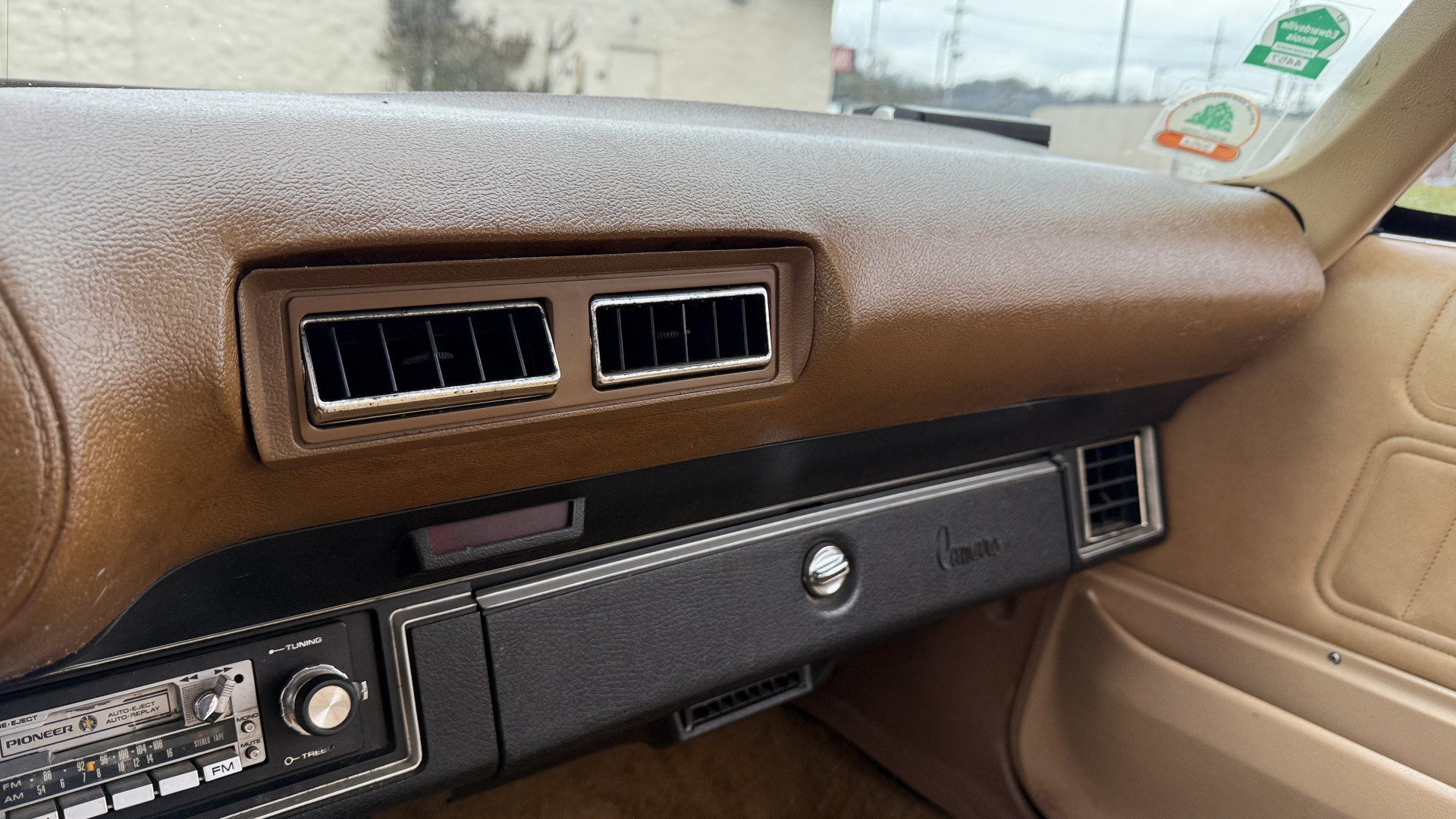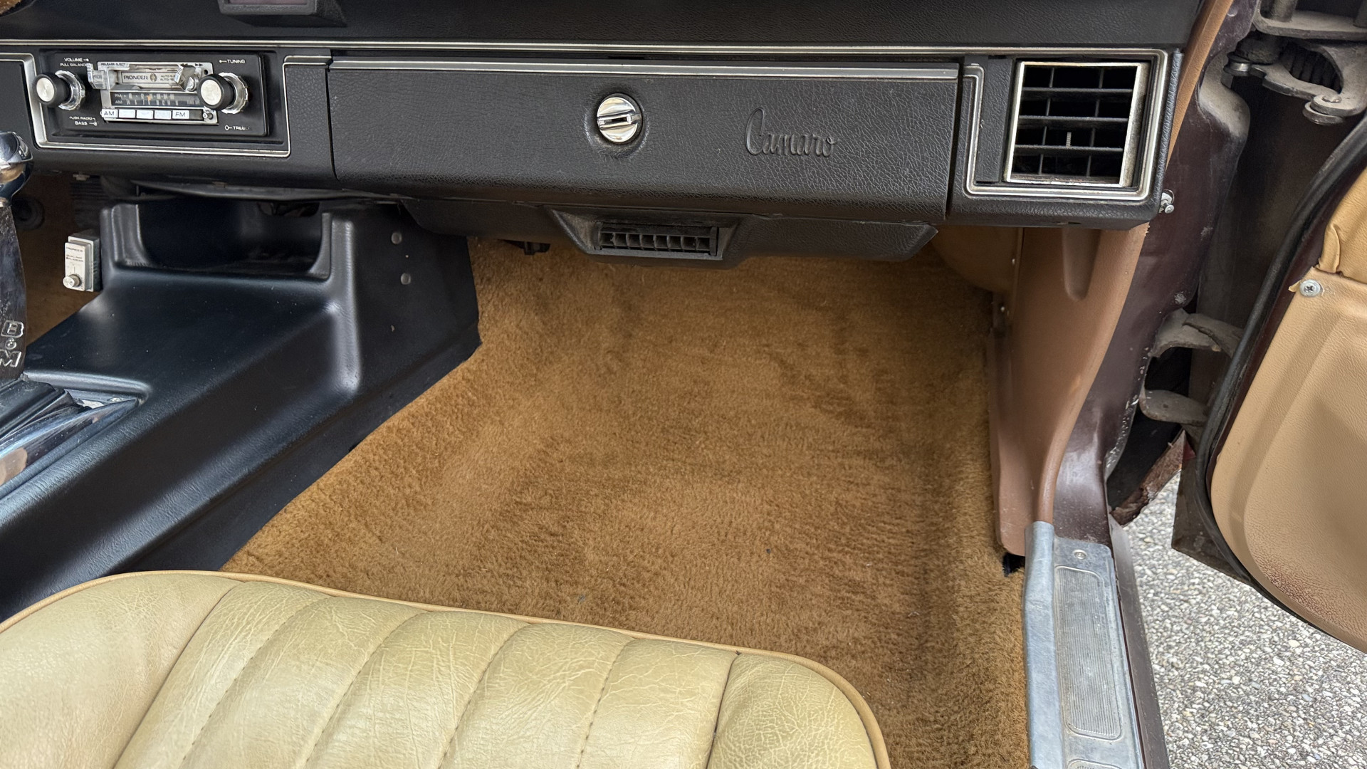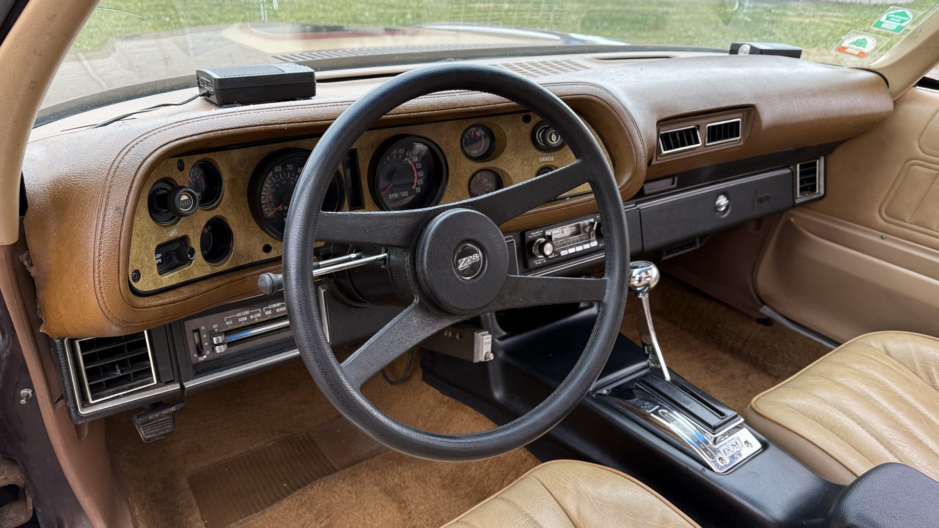 The Tan vinyl interior of this Z28 is mostly stock and in really good overall condition. The original seat covers are nice with no excessive wear or rips. The original carpet is in great shape with no major stains, rips, or holes. The original dash is in good condition and the dash bezel is in great condition. The stereo was upgraded to a cassette player and sounds good with 4 upgraded speakers. The original door panels are in great condition and both door pulls are solid and in tact. The headliner and package tray are both in excellent shape. All interior and exterior lights and gauges work as they should. The horn, stereo, wipers, and blower motor all work. This car has not been smoked in; there is no aroma what so ever.