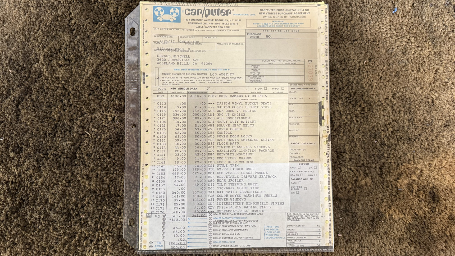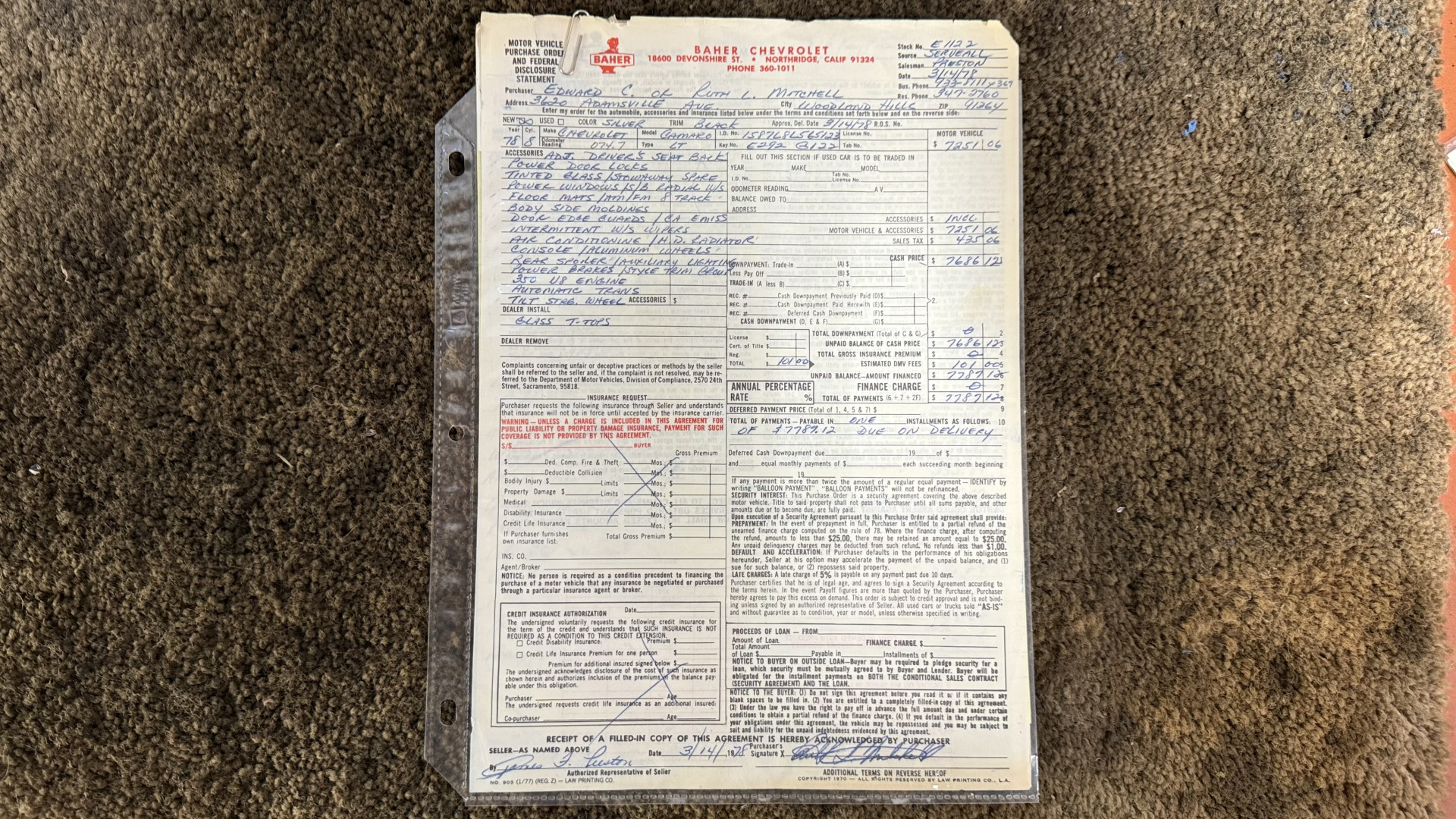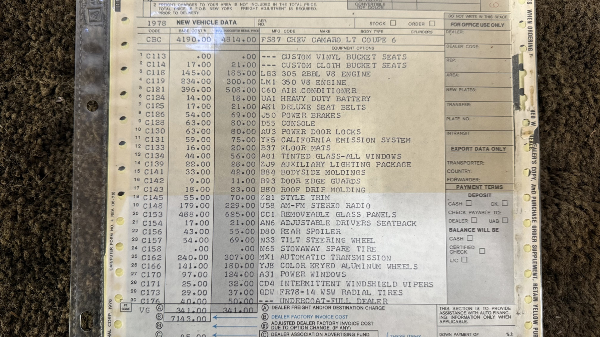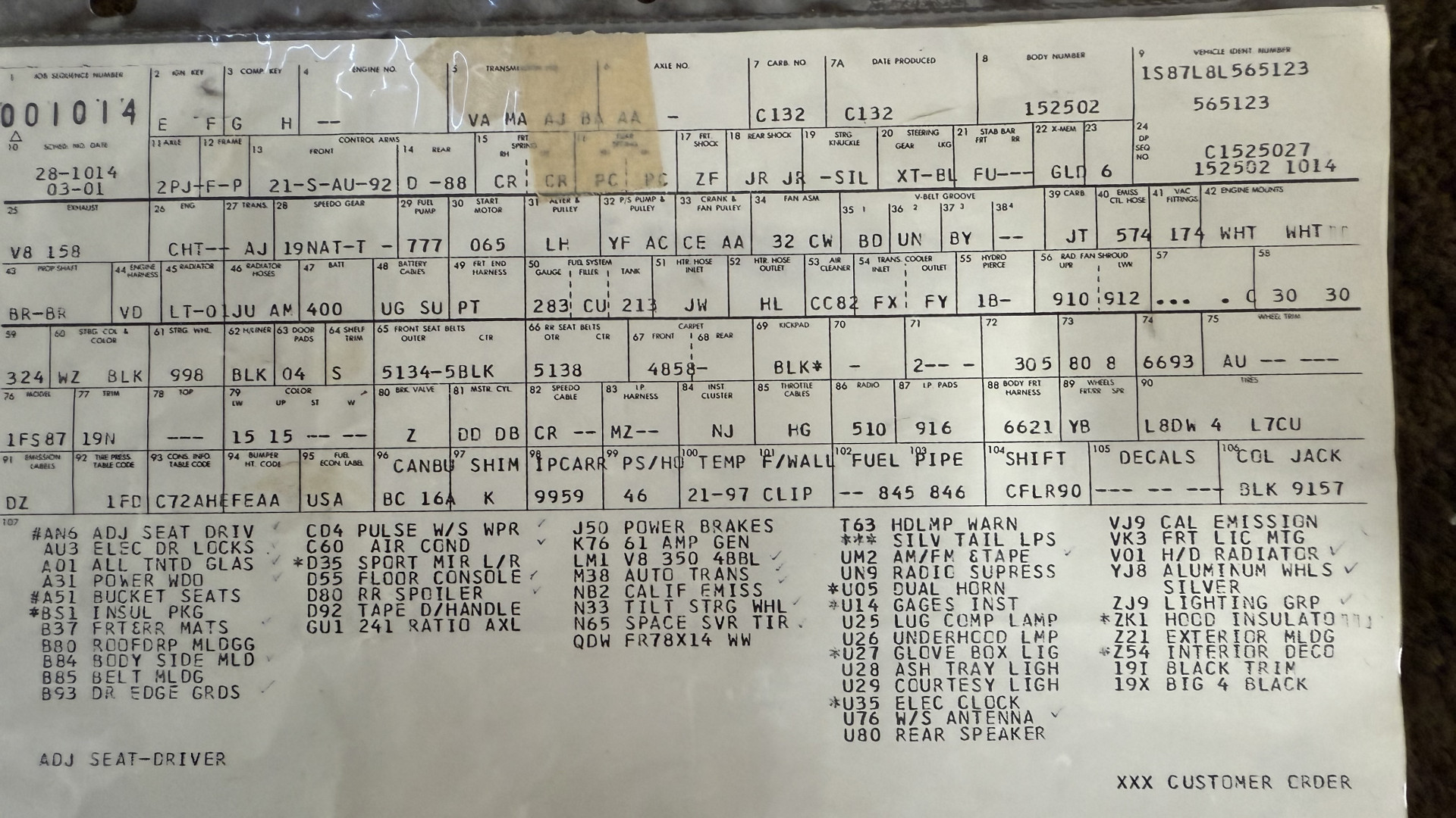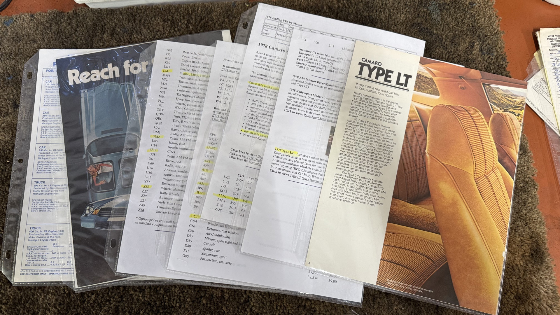 Cincy Classic Cars is proud to offer this 1978 Camaro Type LT which comes with a factory numbers matching 350 engine and Hurst T Tops. This factory Type LT Camaro comes many original dealer documents and brochures and the factory build sheet. This Camaro Type LT features believed to be partial original paint, a beautiful type lt interior, the original numbers matching 350 engine, and the original bill of sale and several dealer documents and build sheet. This Camaro is very solid with great lines and gaps and has no rust issues or bubbling paint anywhere around the car. This Camaro is finished in the beautiful and desirable color combinations of Silver over Type LT Black custom vinyl interior. This is the factory color scheme as verified on the trim tag pictured above. this is a Southern California car and stayed in California until 2025 when it shipped to Ohio.