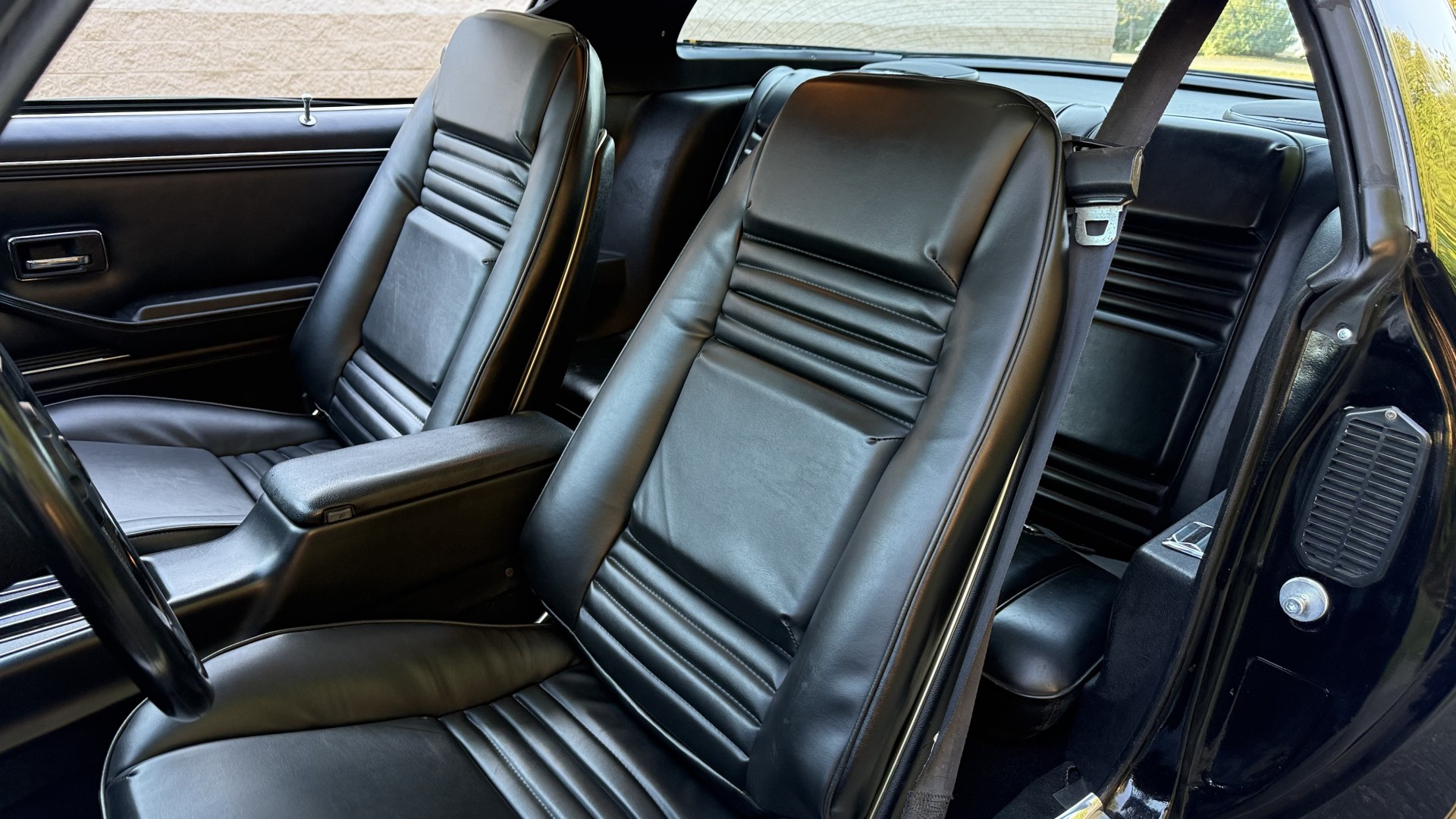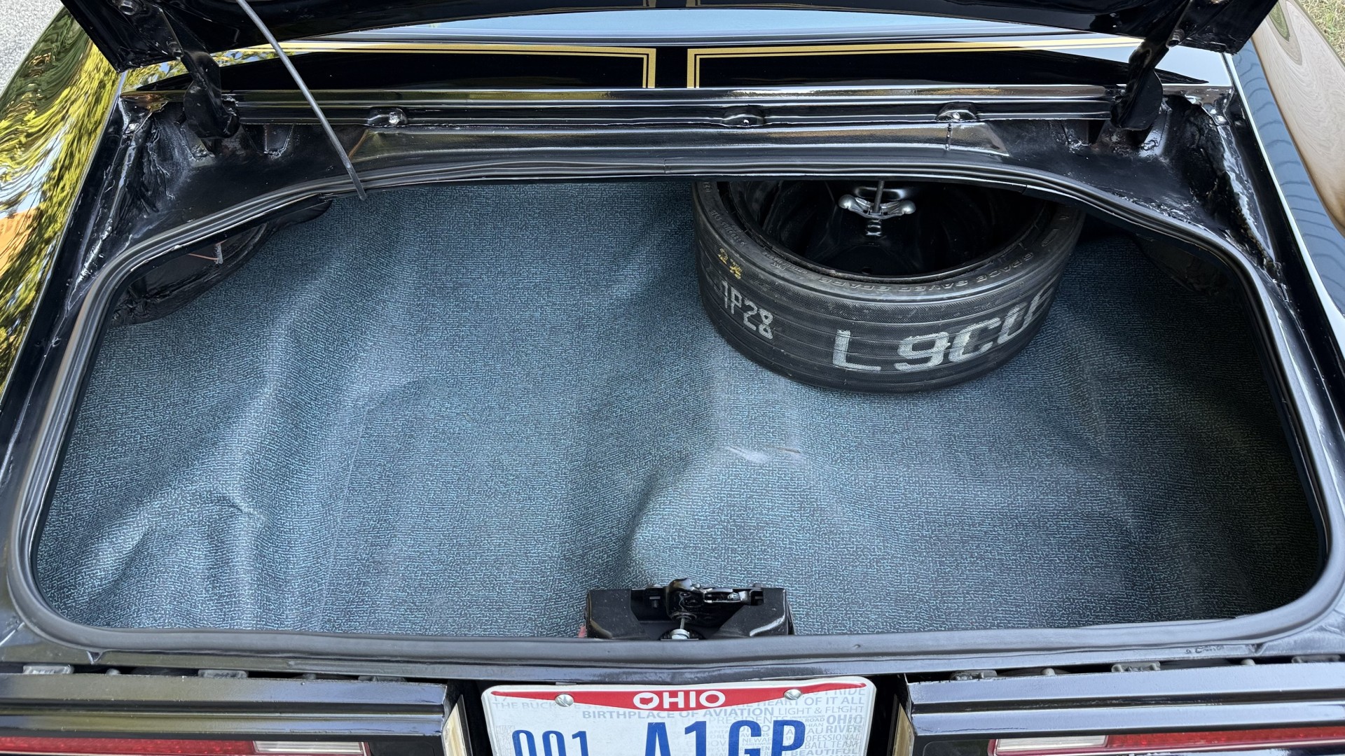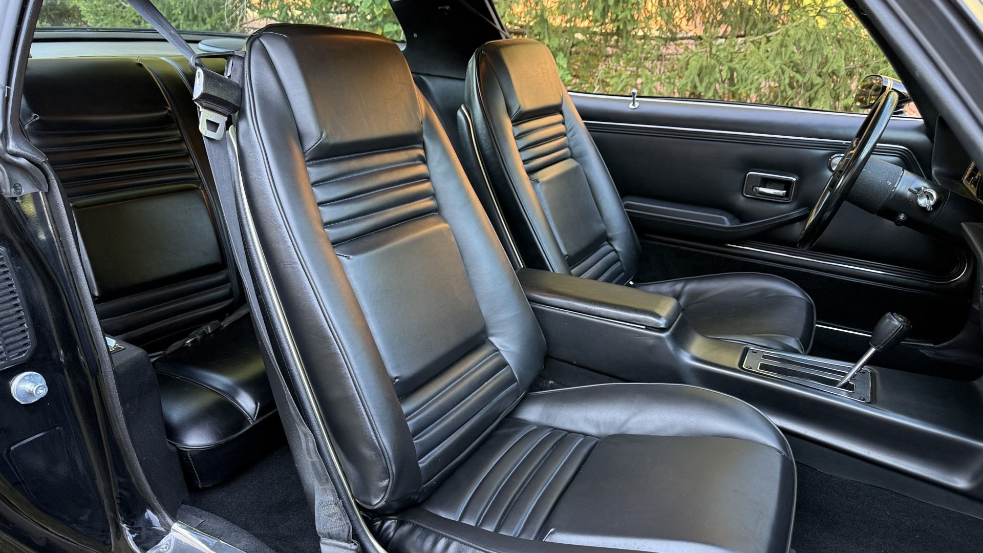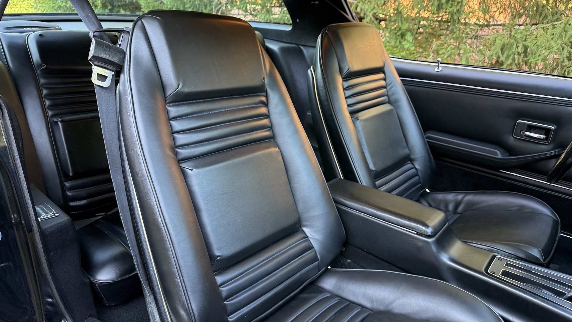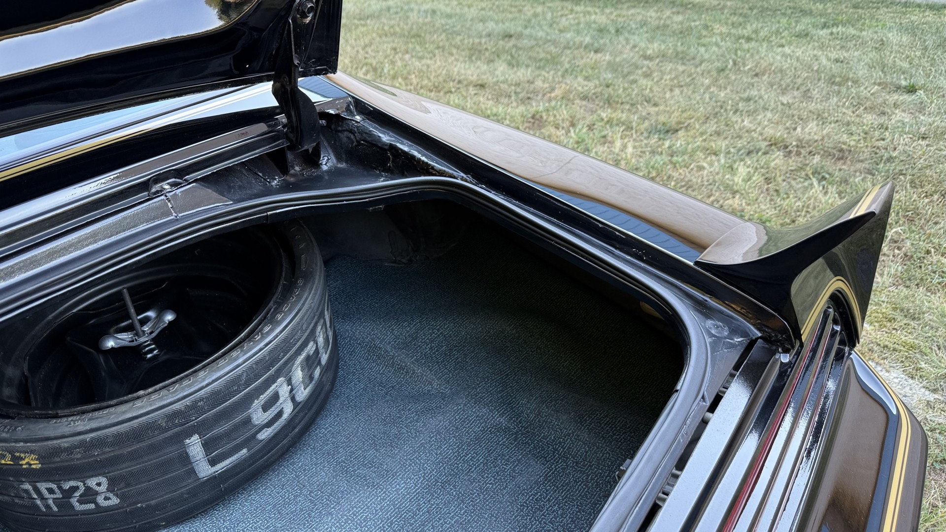The Black exterior is in terrific restored condition. This SE TA was treated to a professional repaint and shows very well, looks fresh, and in my opinion looks show quality. The paint is in great condition and both bumpers are in great shape. There may be some minor imperfections that are not noticeable in the photos, but nothing was intentionally excluded from the photos. The tires have full tread left and are sized 245/60/15 and the 15×8 snowflake wheels were are new and in excellent condition. All weather stripping and window sweeps are in great condition. Trunk is very solid and clean with an original style trunk mat and jack and accessories. The original jack and lug wrench are still in place. Underside is unbelievable on this TA and is fully restored with new parts and finished in correct red oxide primer. The body and underside are both very solid and there are no rust bubbles anywhere and no cracked paint. This TA was restored on a rotisserie and fully disassembled and restored slowly and correctly.