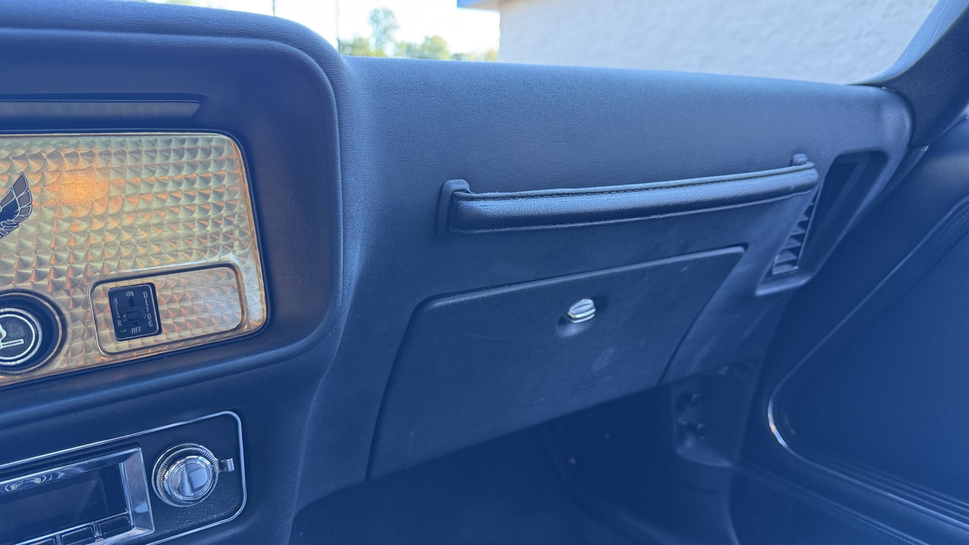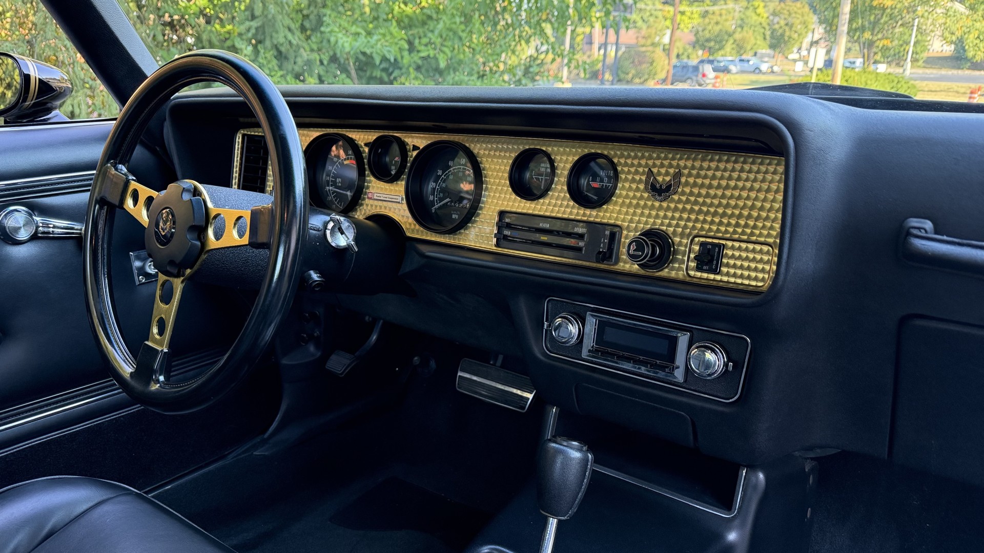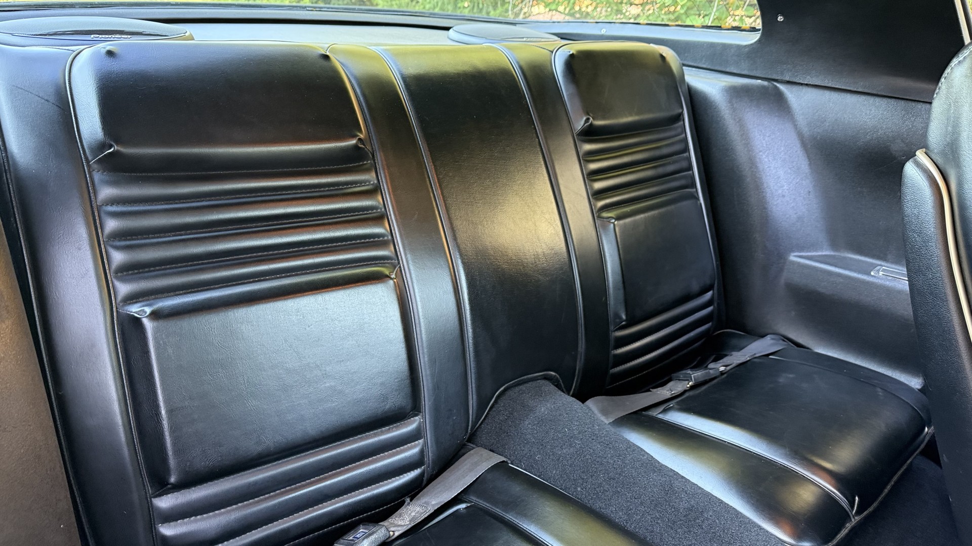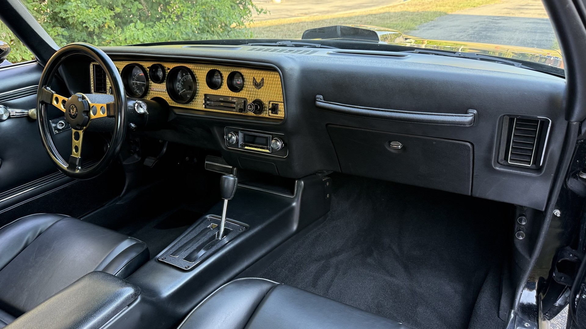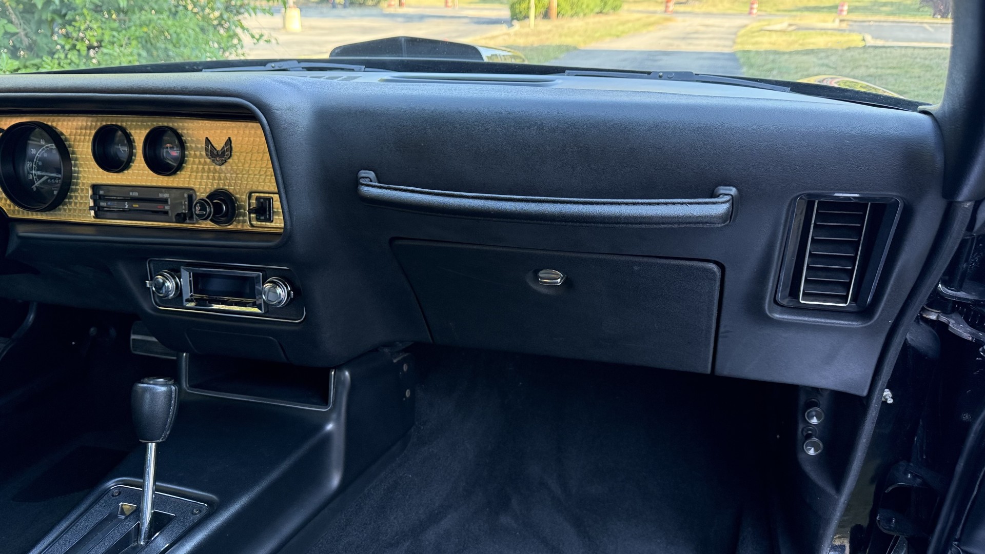The Black vinyl interior of this SE TA is in excellent overall condition. The seat covers are in like new condition with no major wear, seam splits, or rips or tears. The carpet is new with no stains, rips, or holes. The door panels are in excellent condition and both door pulls are solid and in tact. The dash is in excellent condition with no cracks or fading and the dash bezel is in great condition as well. The dash bezel was restored by Randy Combs. The upgraded digital stereo sounds great and the rear speakers were replaced. Thankfully the dash was not cut for a modern stereo. The package tray is new and not warped and was replaced. The headliner is new and all headliner trim is in excellent shape. All exterior lights and gauges work as they should, including the clock. The wipers, stereo, horn, and blower motor all work. This car has not been smoked in; there is no aroma what so ever.