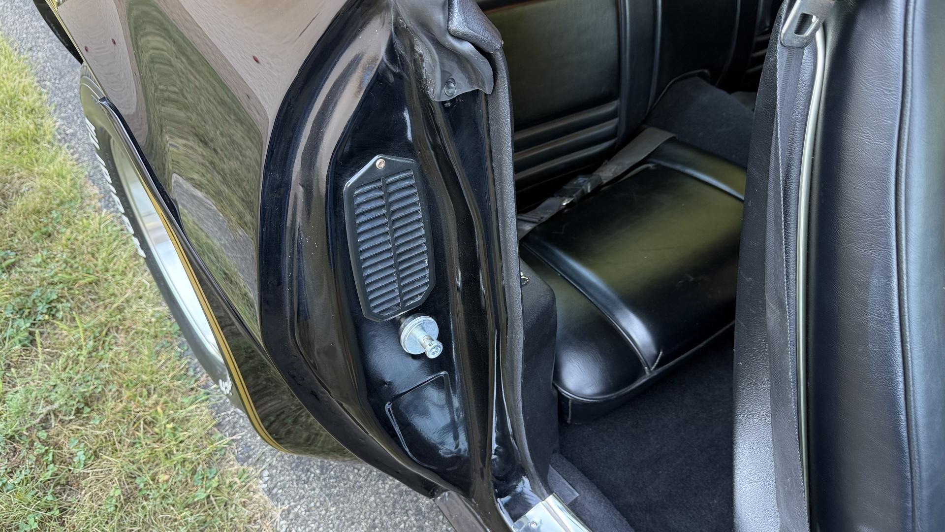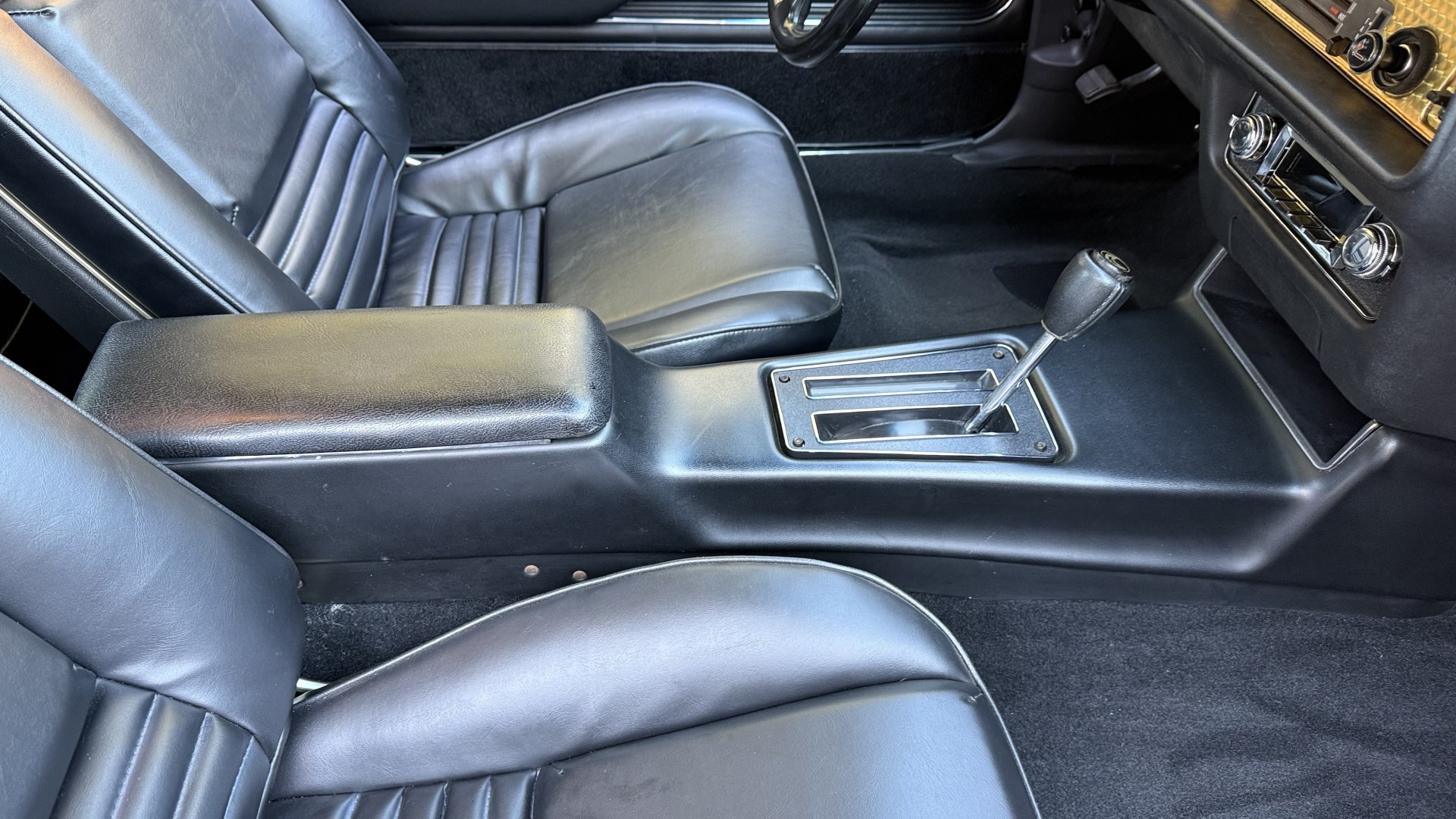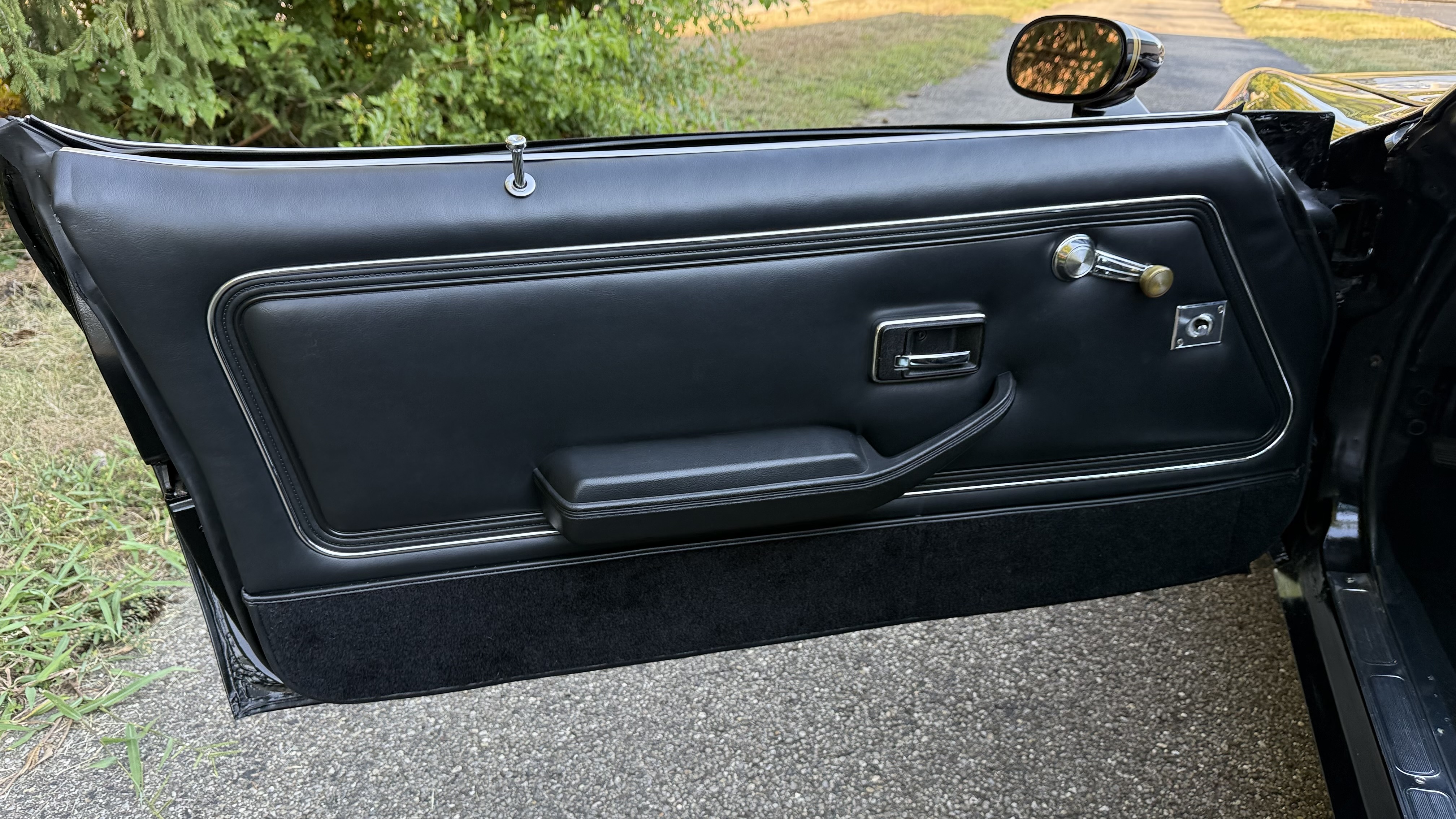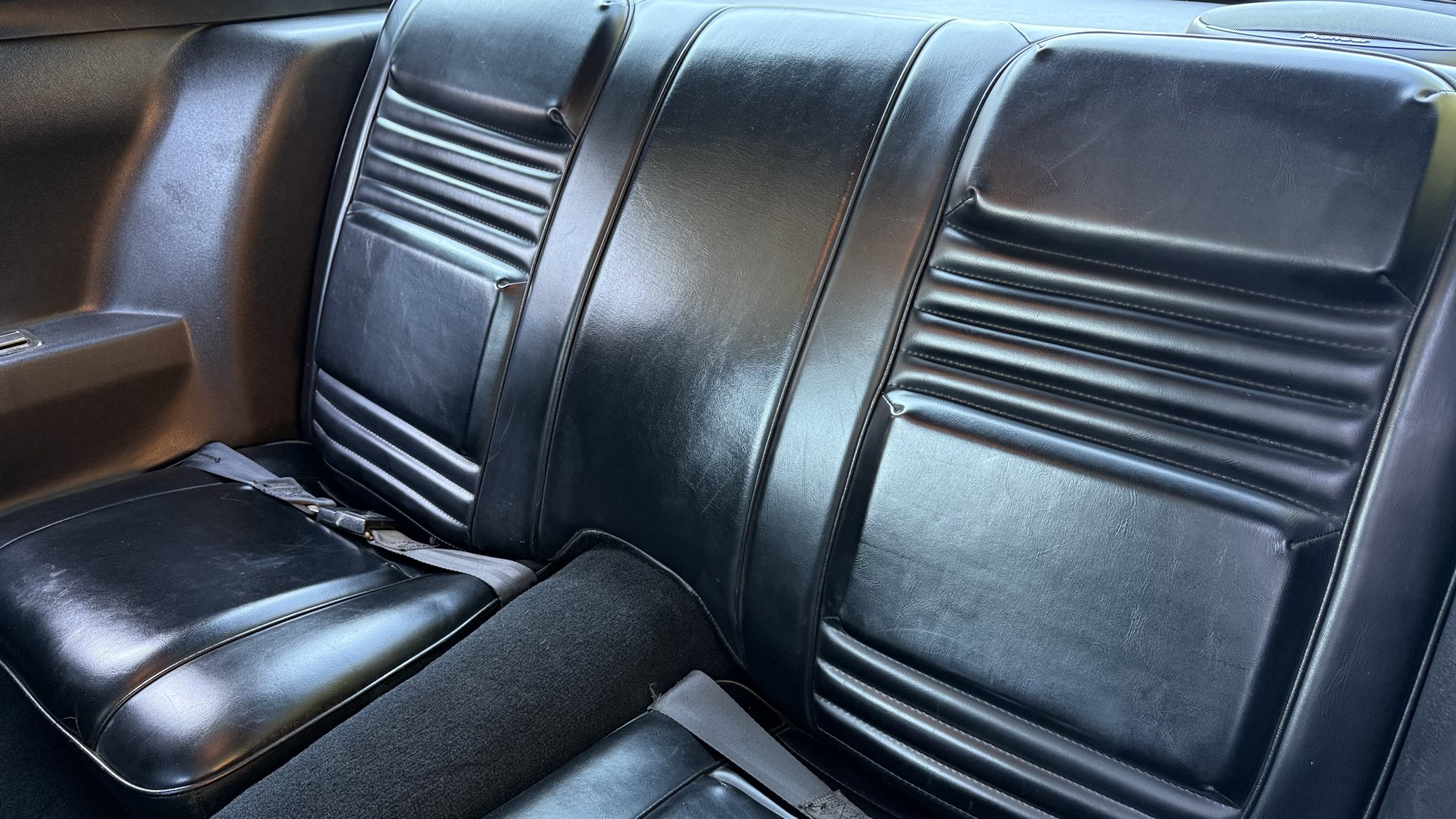 The Black vinyl interior of this SE TA is in excellent overall condition. The seat covers are in like new condition with no major wear, seam splits, or rips or tears. The carpet is new with no stains, rips, or holes. The door panels are in excellent condition and both door pulls are solid and in tact. The dash is in excellent condition with no cracks or fading and the dash bezel is in great condition as well. The dash bezel was restored by Randy Combs. The upgraded digital stereo sounds great and the rear speakers were replaced. Thankfully the dash was not cut for a modern stereo. The package tray is new and not warped and was replaced. The headliner is new and all headliner trim is in excellent shape. All exterior lights and gauges work as they should, including the clock. The wipers, stereo, horn, and blower motor all work. This car has not been smoked in; there is no aroma what so ever.