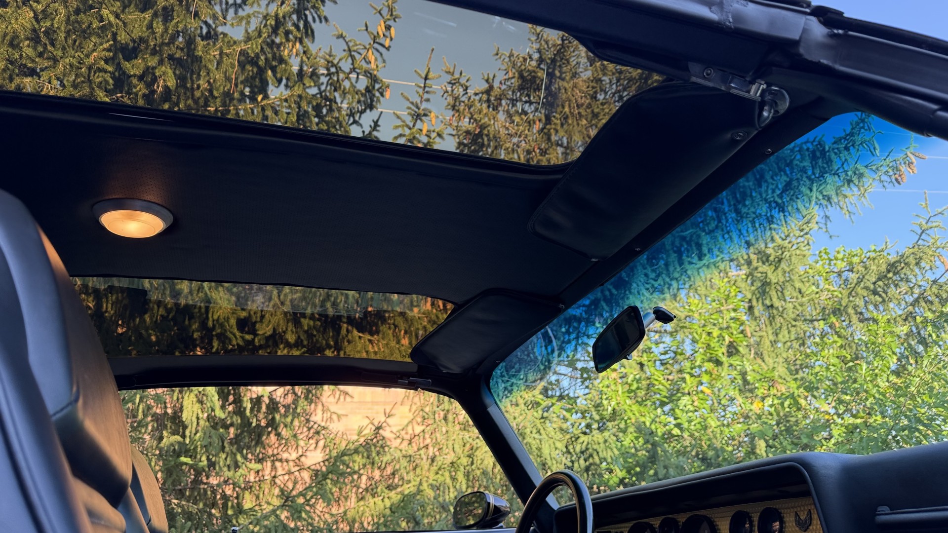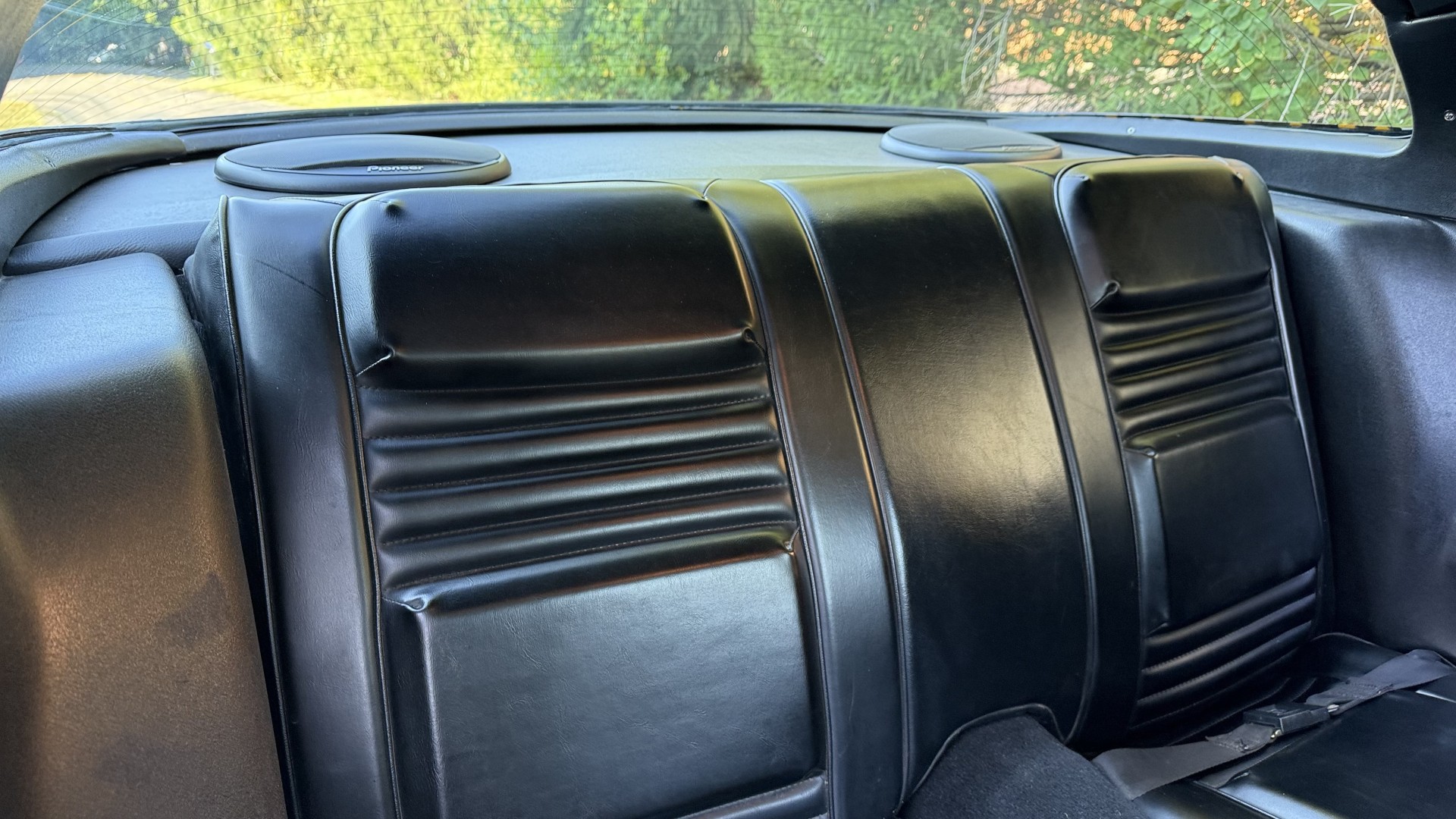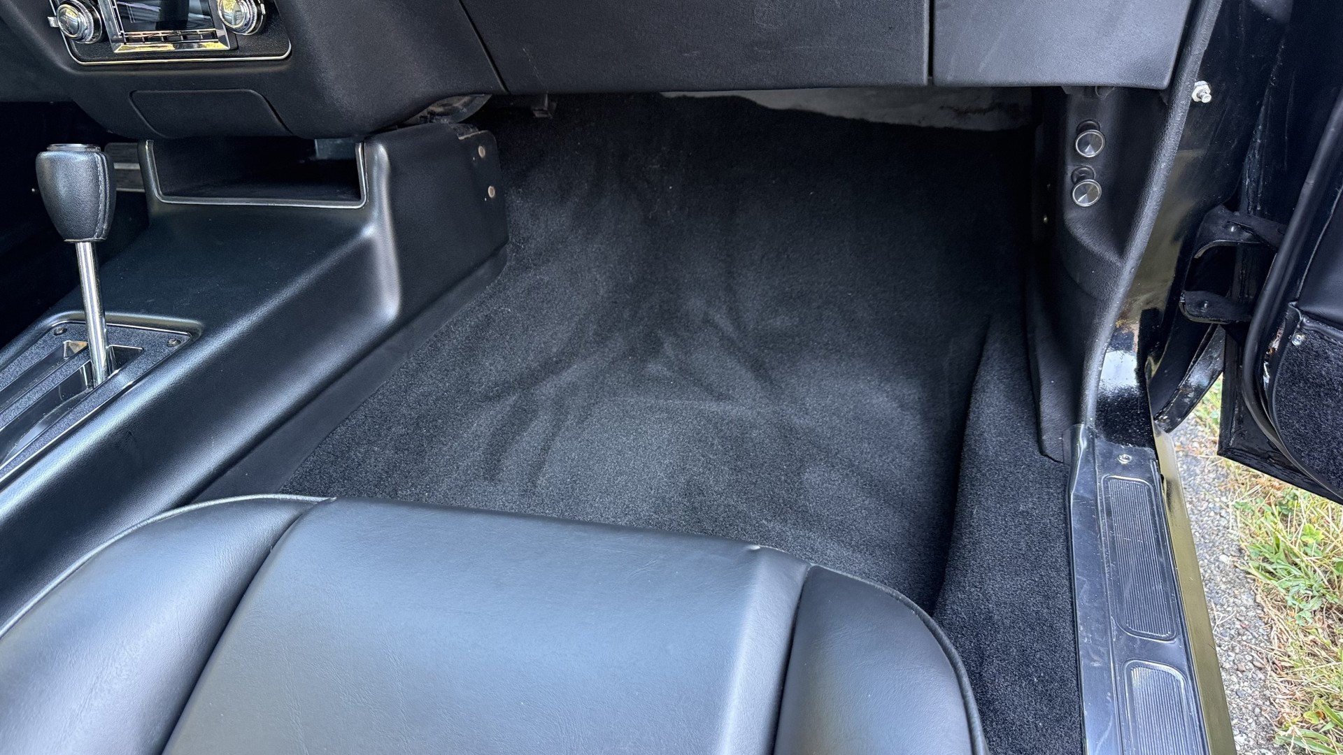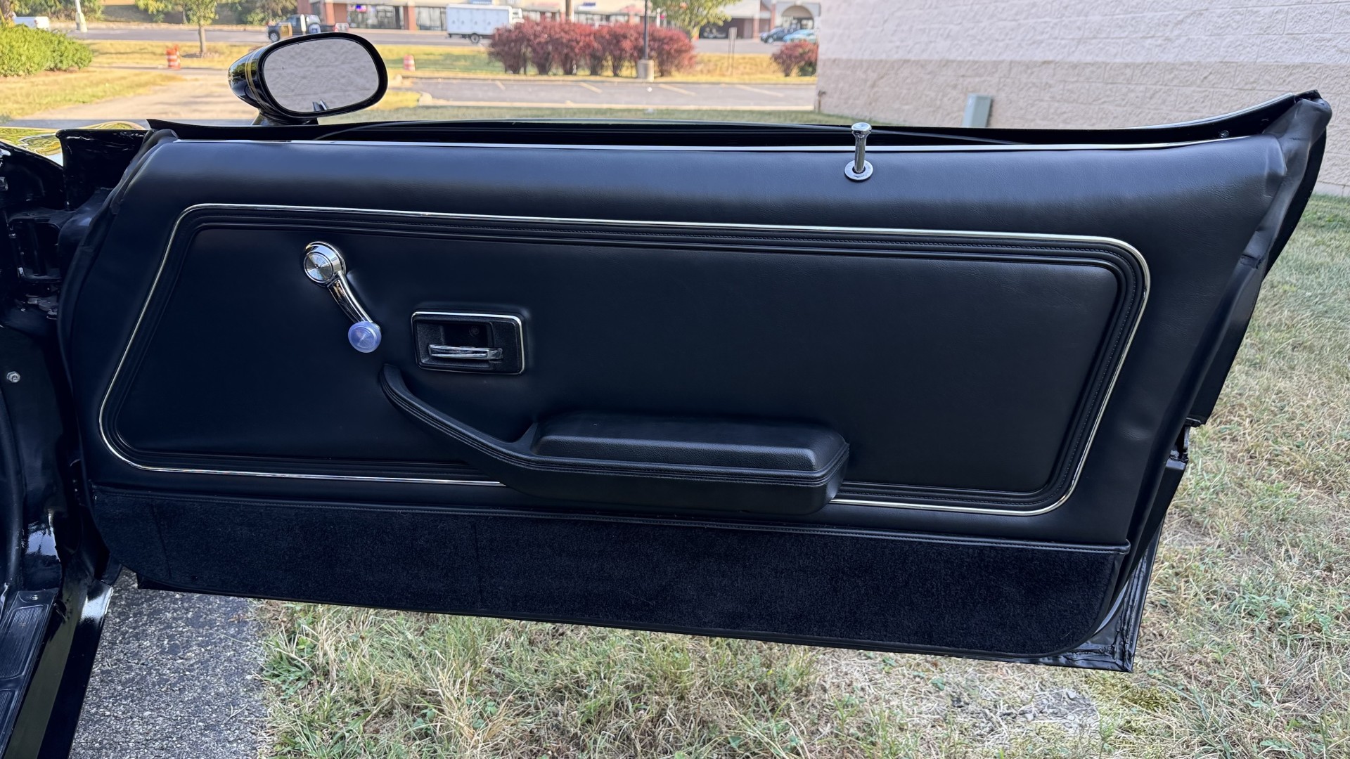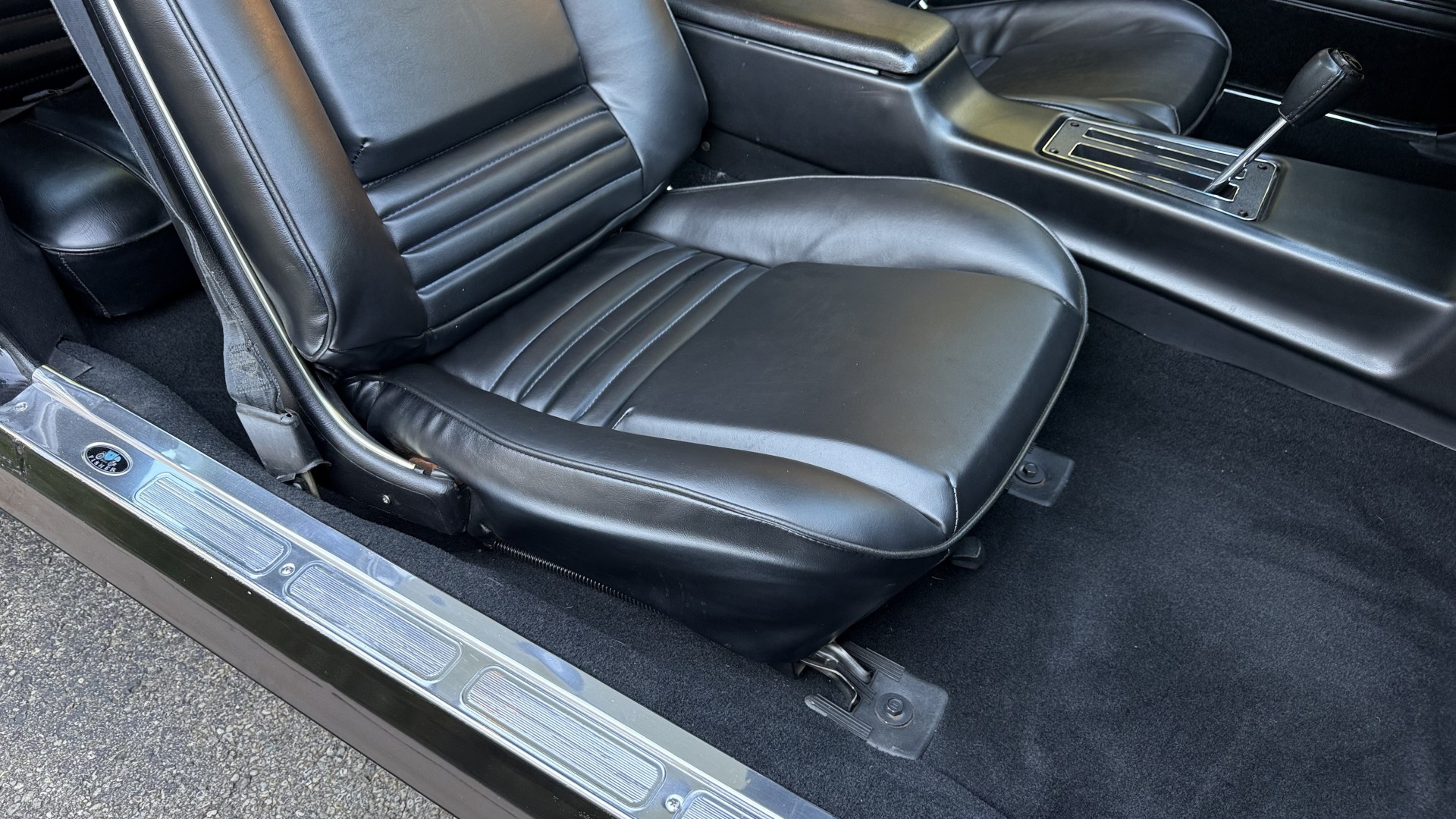The Black vinyl interior of this SE TA is in excellent overall condition. The seat covers are in like new condition with no major wear, seam splits, or rips or tears. The carpet is new with no stains, rips, or holes. The door panels are in excellent condition and both door pulls are solid and in tact. The dash is in excellent condition with no cracks or fading and the dash bezel is in great condition as well. The dash bezel was restored by Randy Combs. The upgraded digital stereo sounds great and the rear speakers were replaced. Thankfully the dash was not cut for a modern stereo. The package tray is new and not warped and was replaced. The headliner is new and all headliner trim is in excellent shape. All exterior lights and gauges work as they should, including the clock. The wipers, stereo, horn, and blower motor all work. This car has not been smoked in; there is no aroma what so ever.