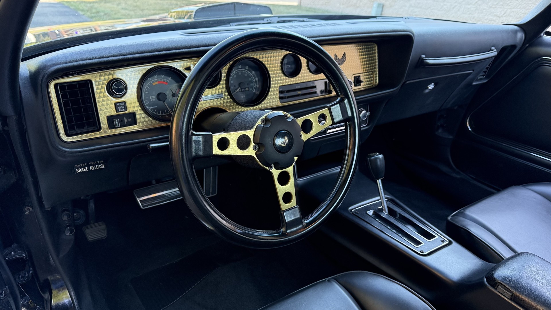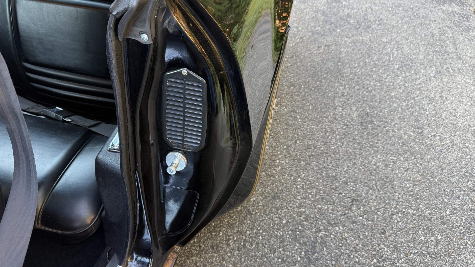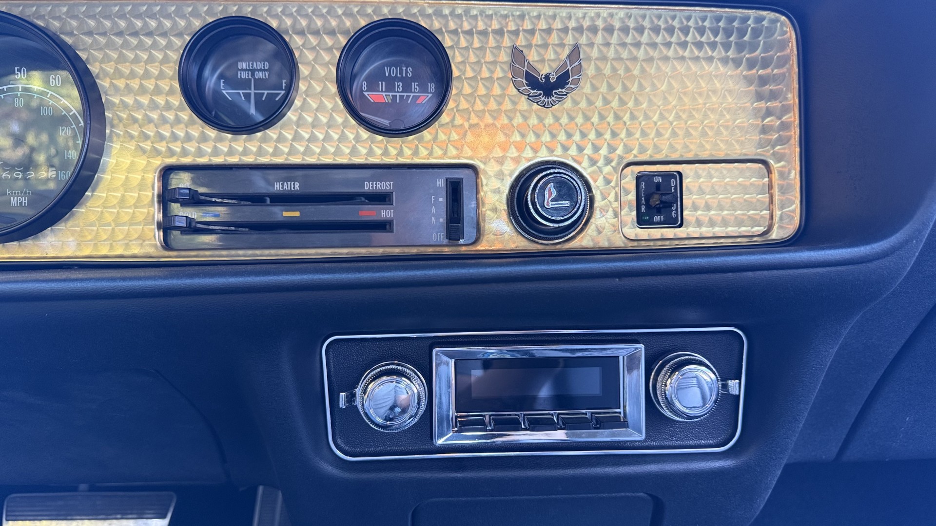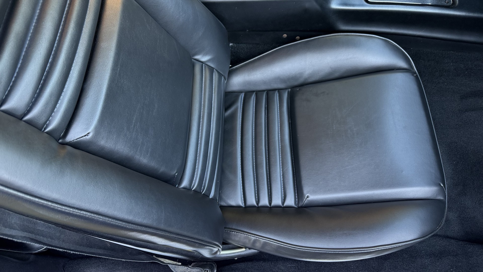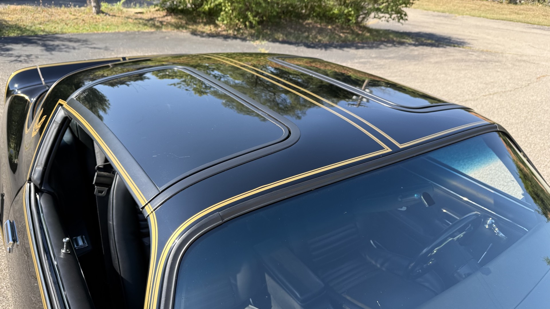 The Black vinyl interior of this SE TA is in excellent overall condition. The seat covers are in like new condition with no major wear, seam splits, or rips or tears. The carpet is new with no stains, rips, or holes. The door panels are in excellent condition and both door pulls are solid and in tact. The dash is in excellent condition with no cracks or fading and the dash bezel is in great condition as well. The dash bezel was restored by Randy Combs. The upgraded digital stereo sounds great and the rear speakers were replaced. Thankfully the dash was not cut for a modern stereo. The package tray is new and not warped and was replaced. The headliner is new and all headliner trim is in excellent shape. All exterior lights and gauges work as they should, including the clock. The wipers, stereo, horn, and blower motor all work. This car has not been smoked in; there is no aroma what so ever.