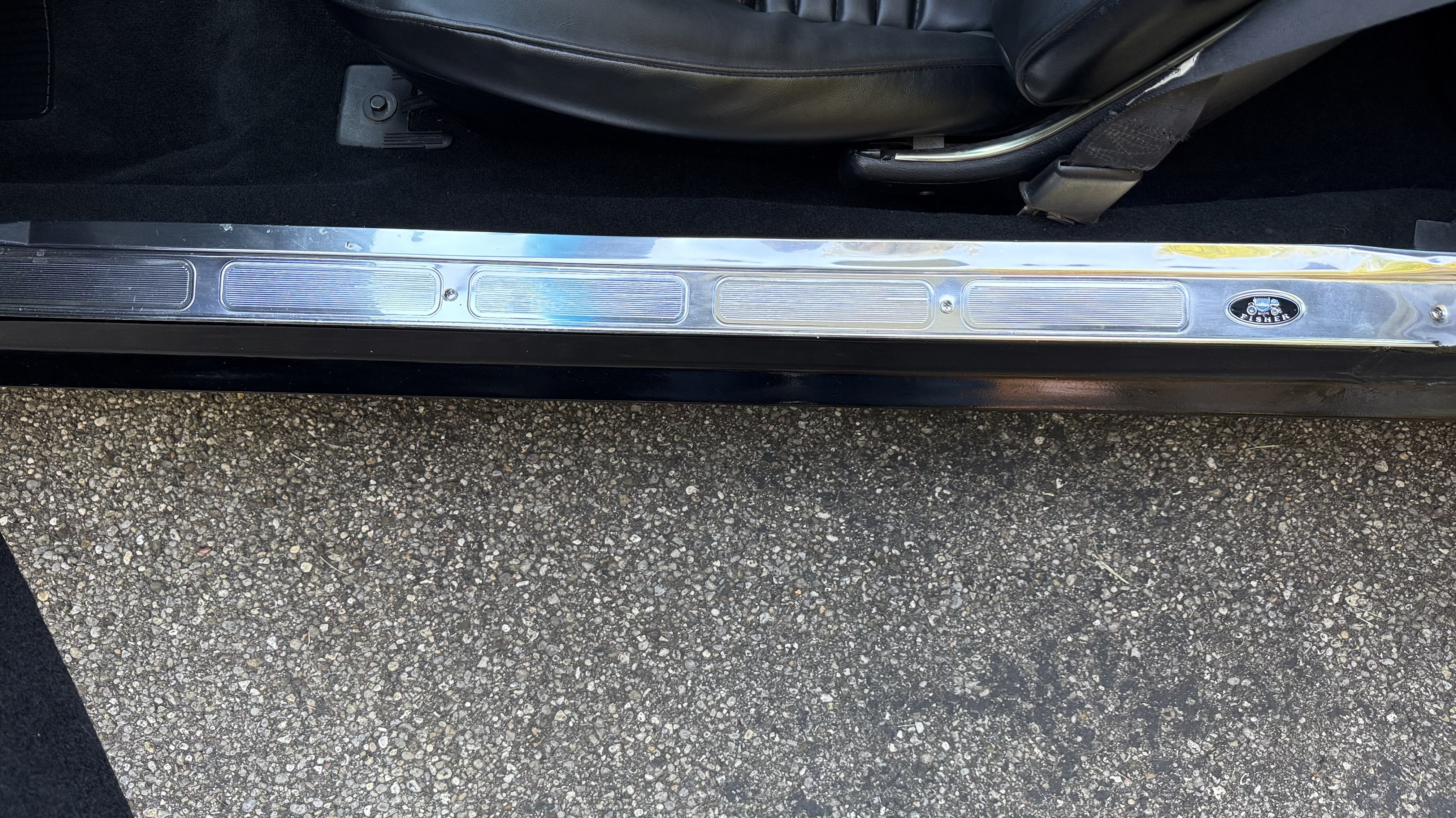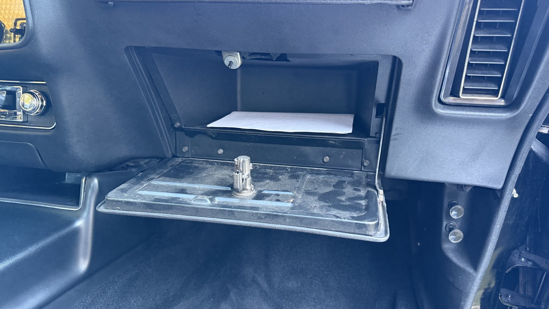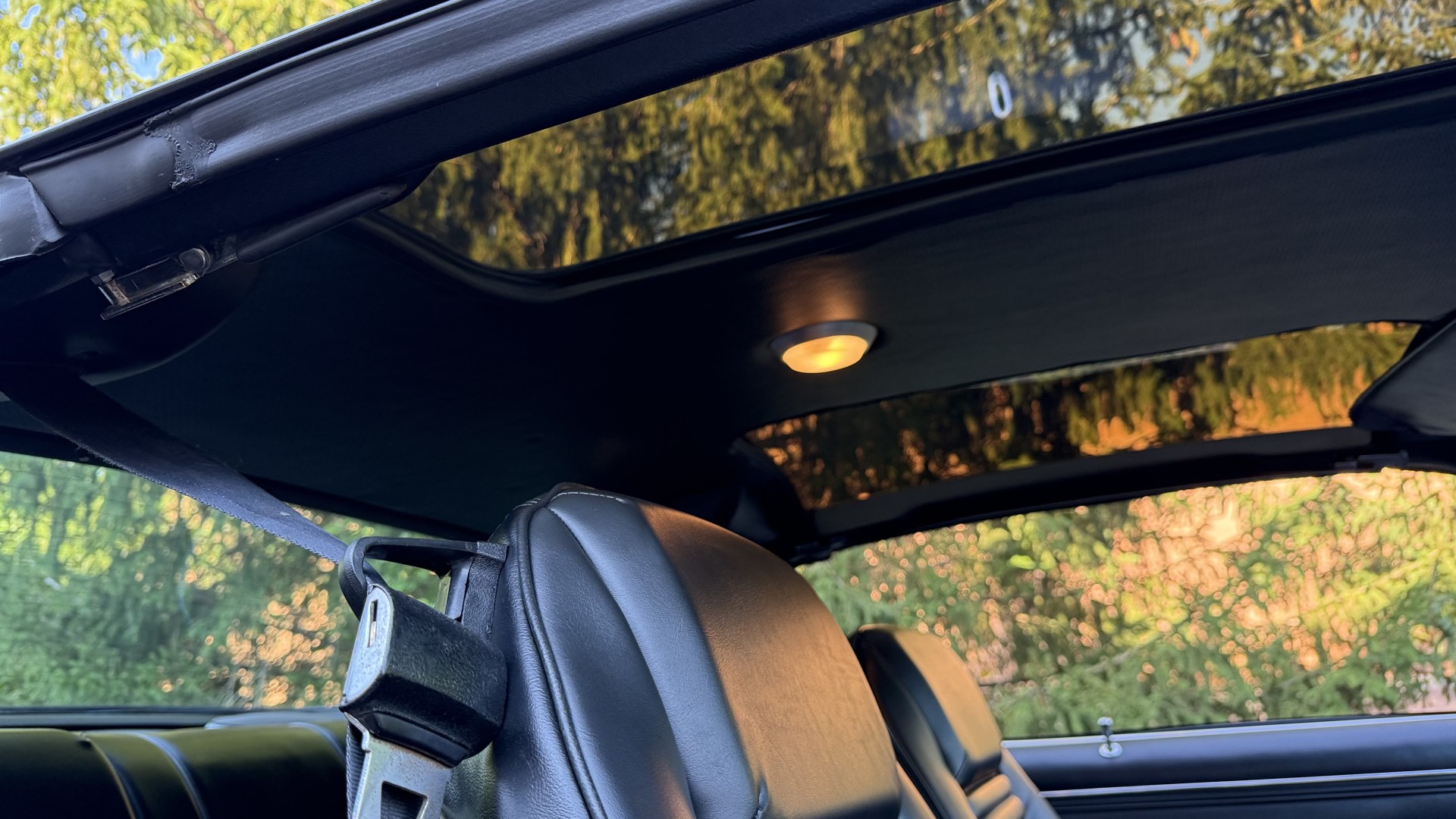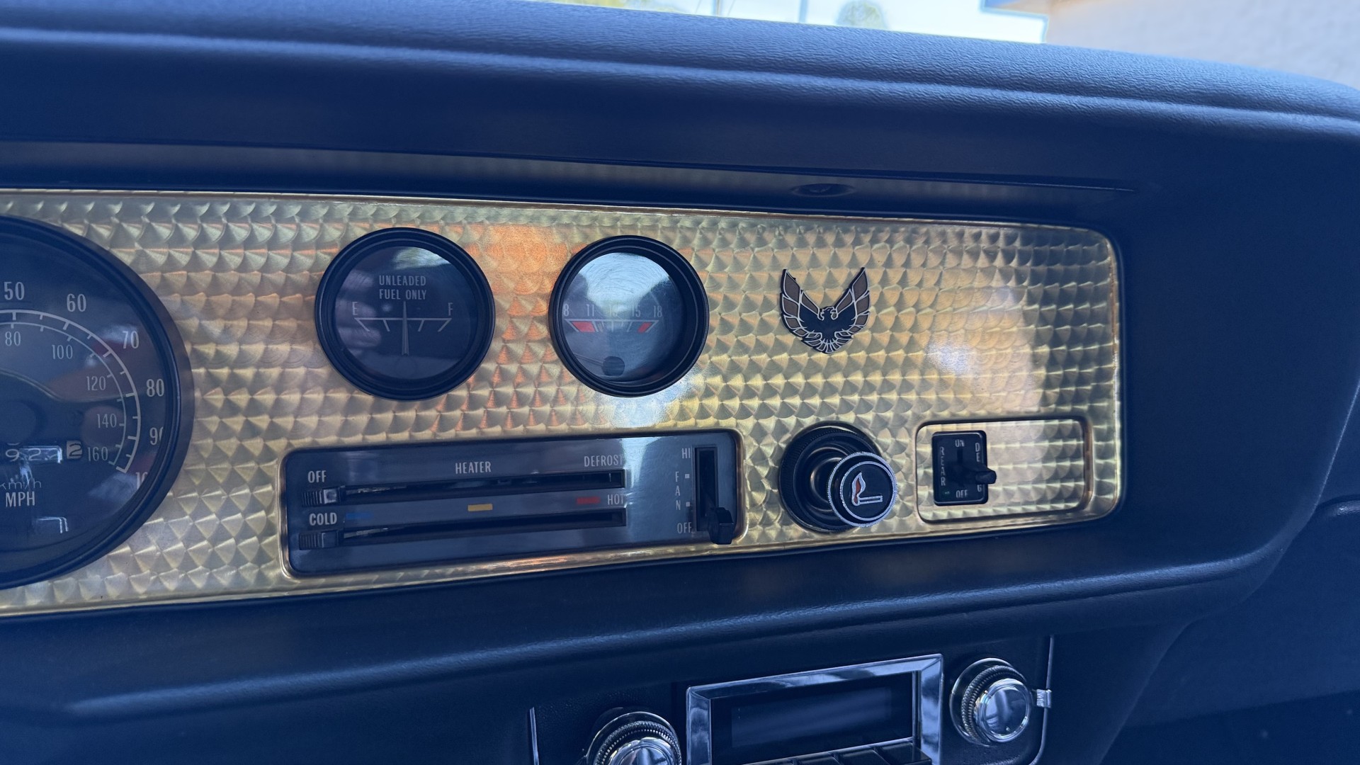 The Black vinyl interior of this SE TA is in excellent overall condition. The seat covers are in like new condition with no major wear, seam splits, or rips or tears. The carpet is new with no stains, rips, or holes. The door panels are in excellent condition and both door pulls are solid and in tact. The dash is in excellent condition with no cracks or fading and the dash bezel is in great condition as well. The dash bezel was restored by Randy Combs. The upgraded digital stereo sounds great and the rear speakers were replaced. Thankfully the dash was not cut for a modern stereo. The package tray is new and not warped and was replaced. The headliner is new and all headliner trim is in excellent shape. All exterior lights and gauges work as they should, including the clock. The wipers, stereo, horn, and blower motor all work. This car has not been smoked in; there is no aroma what so ever.