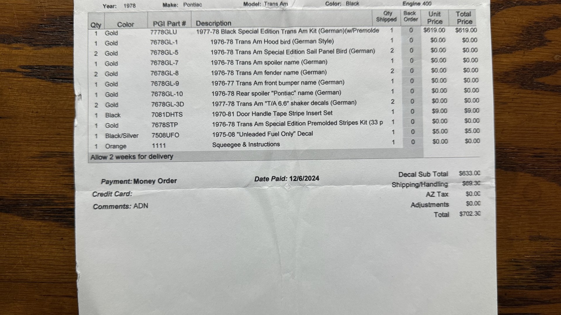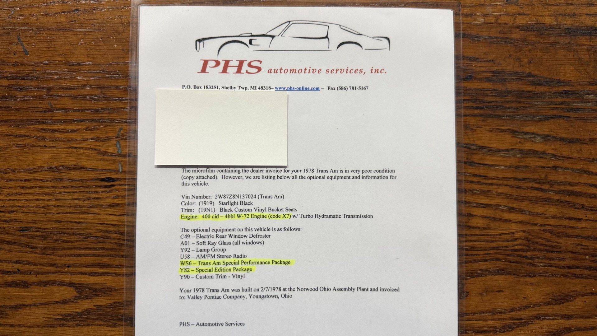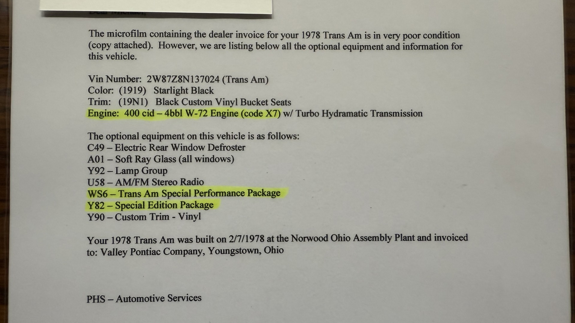 Cincy Classic Cars is proud to share this stunning 1978 Special Edition Trans AM which comes with its factory ordered Pontiac 400 engine which is numbers matching. Only 2856 1978 SE Trans Am’s came from the factory with automatic transmission. This SE TA comes with PHS documents validating this as a factory Special Edition TA. This TA comes with the very sought after factory ordered W72 high horsepower Pontiac 400 engine and WS6 special handling package. This SE TA was treated to a full rotisserie restoration featuring a beautiful repaint in factory Black with gold pin stripes with newer decals, a beautiful Black deluxe vinyl interior, the original Pontiac numbers matching 400 engine and automatic transmission, and PHS documents. This TA is very solid with great lines and gaps and has no rust issues or bubbling paint anywhere around the car. This TA is finished in the beautiful and desirable color combinations of Black over Black vinyl interior. This is the factory color scheme as verified on the trim tag pictured above and the included PHS documents. It’s a beautiful car that gets a ton of attention and shows really well in person and at car shows. Engine was removed from the car and fully restored at a cost of over $9200. The underside of this TA is just as nice as the rest and has been fully restored with new parts and looks incredible in factory red oxide primer. See included receipts.