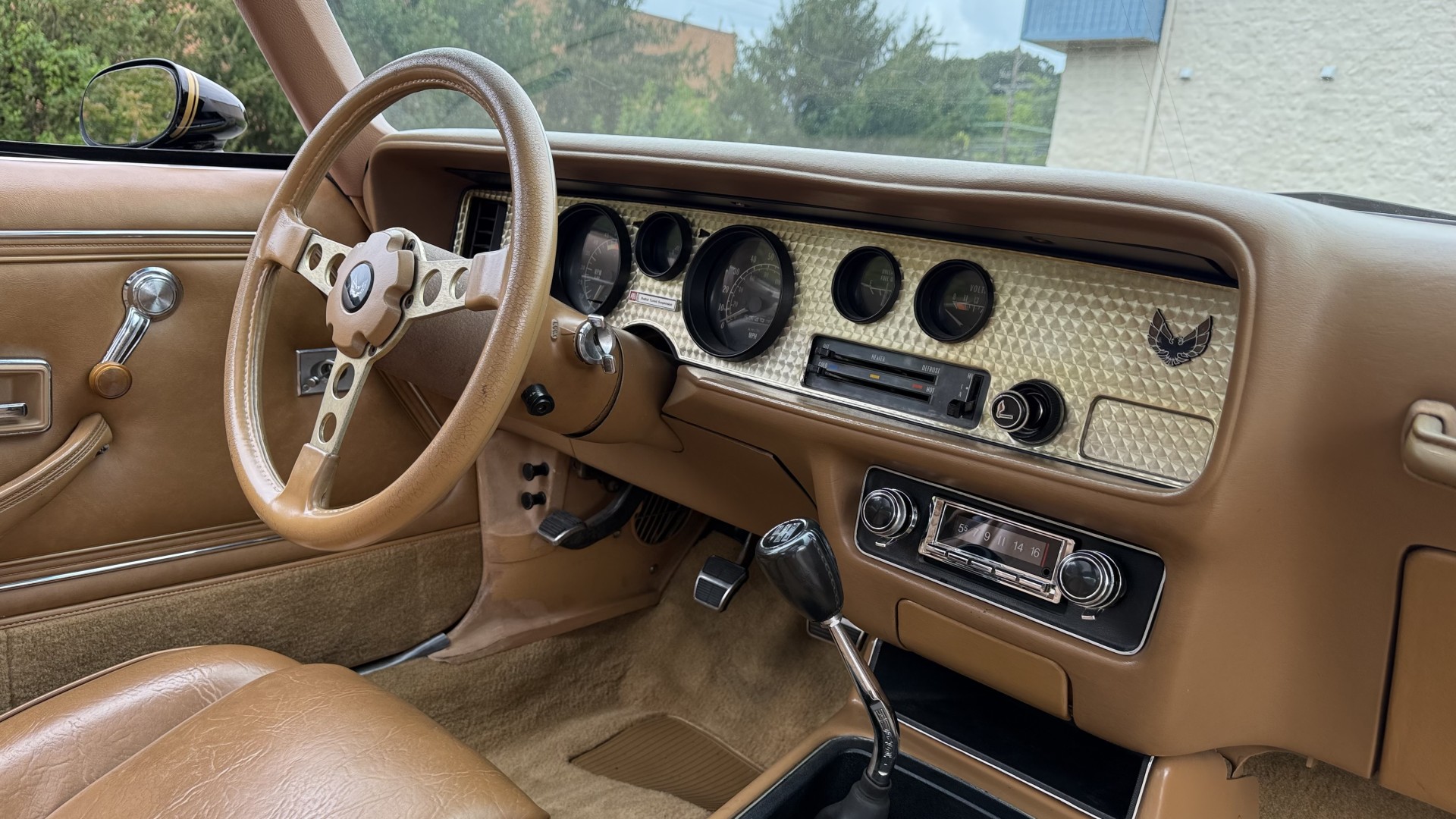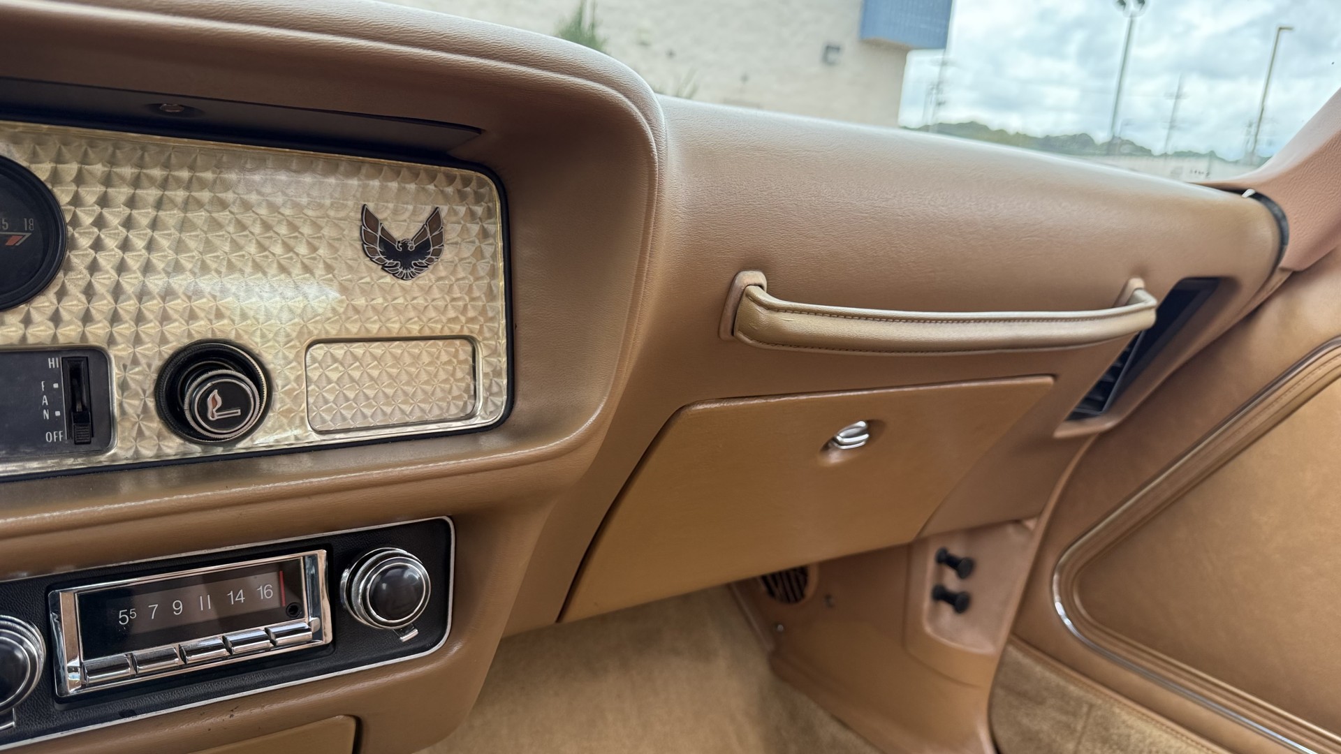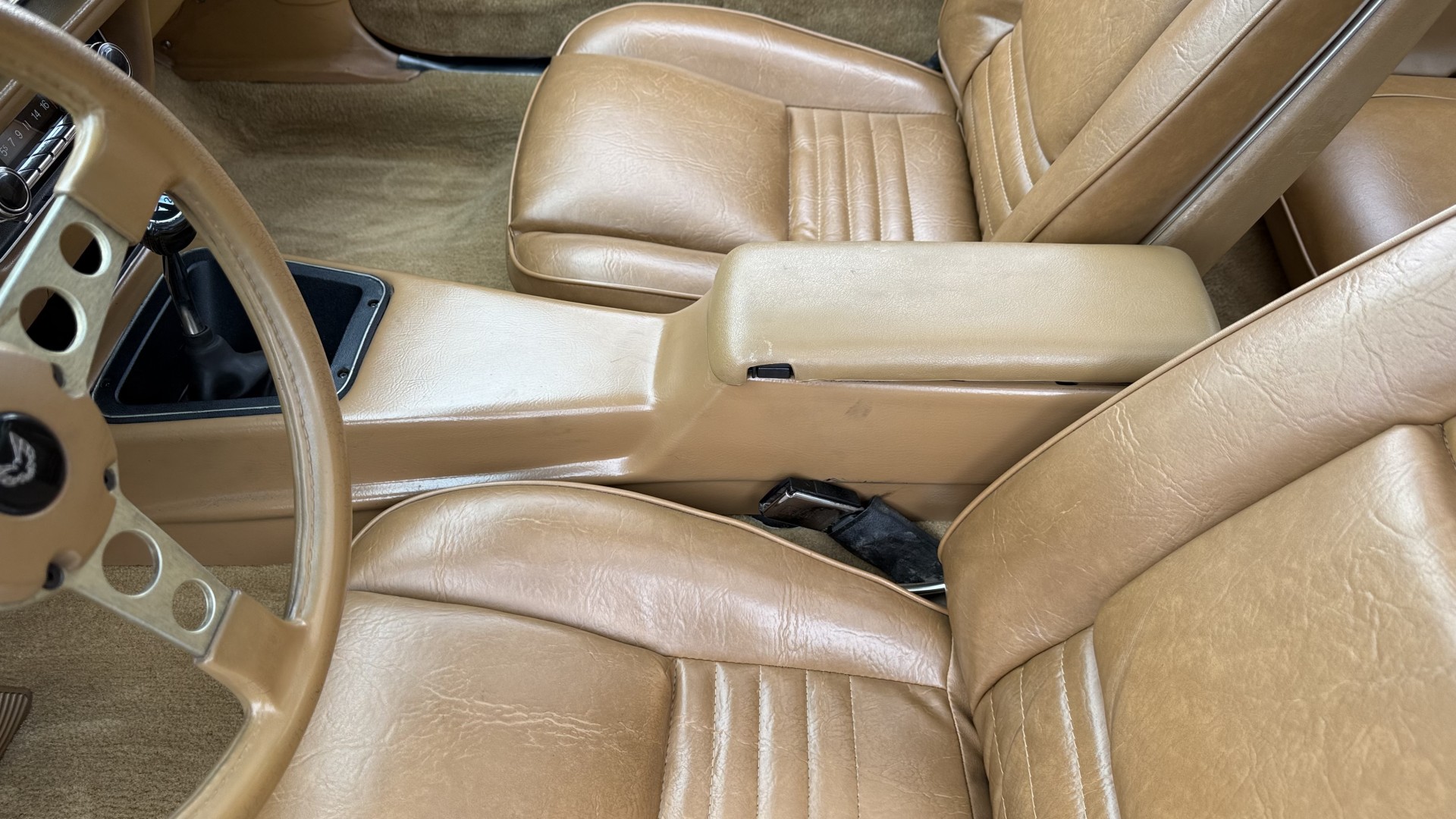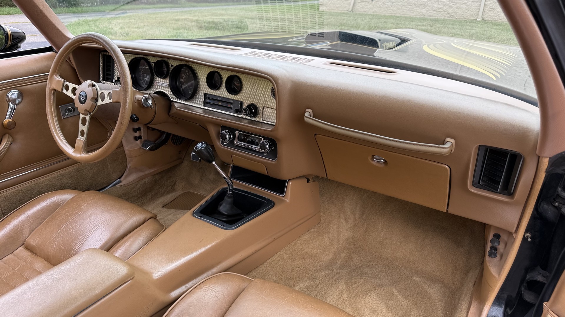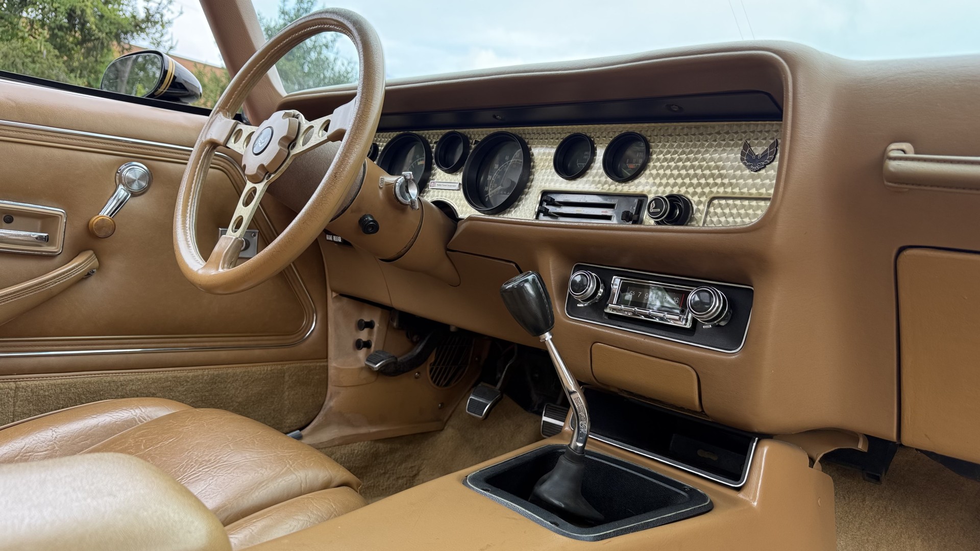 The Camel Tan deluxe vinyl interior of this Trans Am is in restored great overall condition. The seat covers were replaced with no major wear, no rips, or seam splits. These covers were replaced and the seat foams are in good condition as well. The carpet was replaced as well and is like new with no stains, rips, or holes. The original dash is in great condition with no cracks, no warping, and no fading. Most importantly this is the original dash, not a dash cap or the like. The dash bezel was restored by Randy Combs and truly makes the interior. The stereo system was fully upgraded with new speakers, new amplifier, and new digital mp3 deck. Thankfully the dash has not been cut for a modern stereo. The door panels are like new and were replaced and are in great condition and both door pulls are solid and in tact. New door cups and door lock pulls were added. New sill plates were added. The headliner was replaced. The entire center console is brand new including a new shifter bezel, new console lid and bin, and new map pocket. All interior and exterior lights and gauges work outside of the cigarette lighter and clock. The stereo, wipers, and blower motor all work. This car has not been smoked in; there is no aroma what so ever. The oil pressure gauge is intermittent.