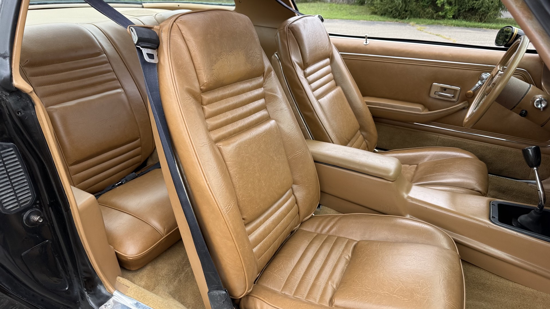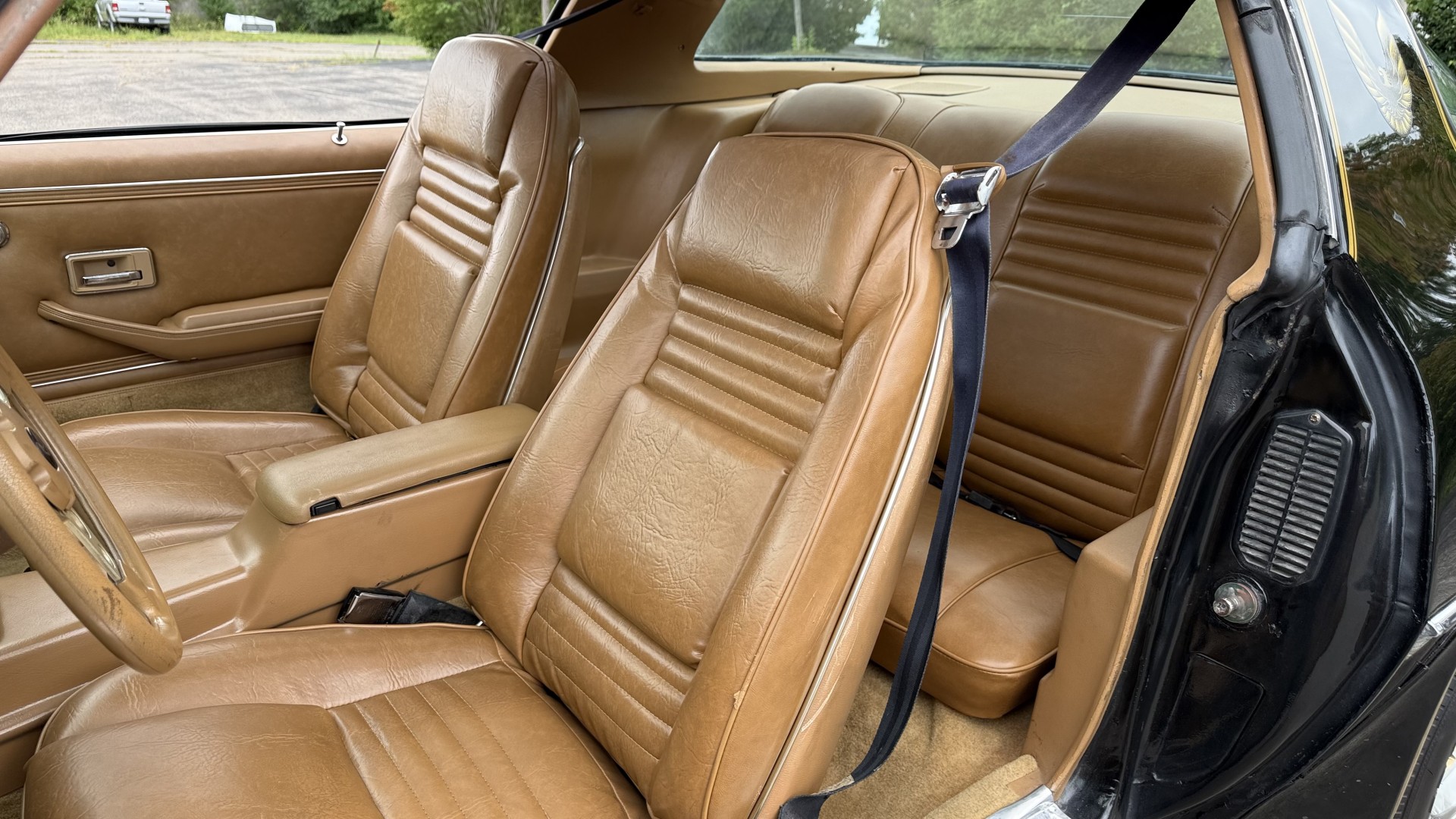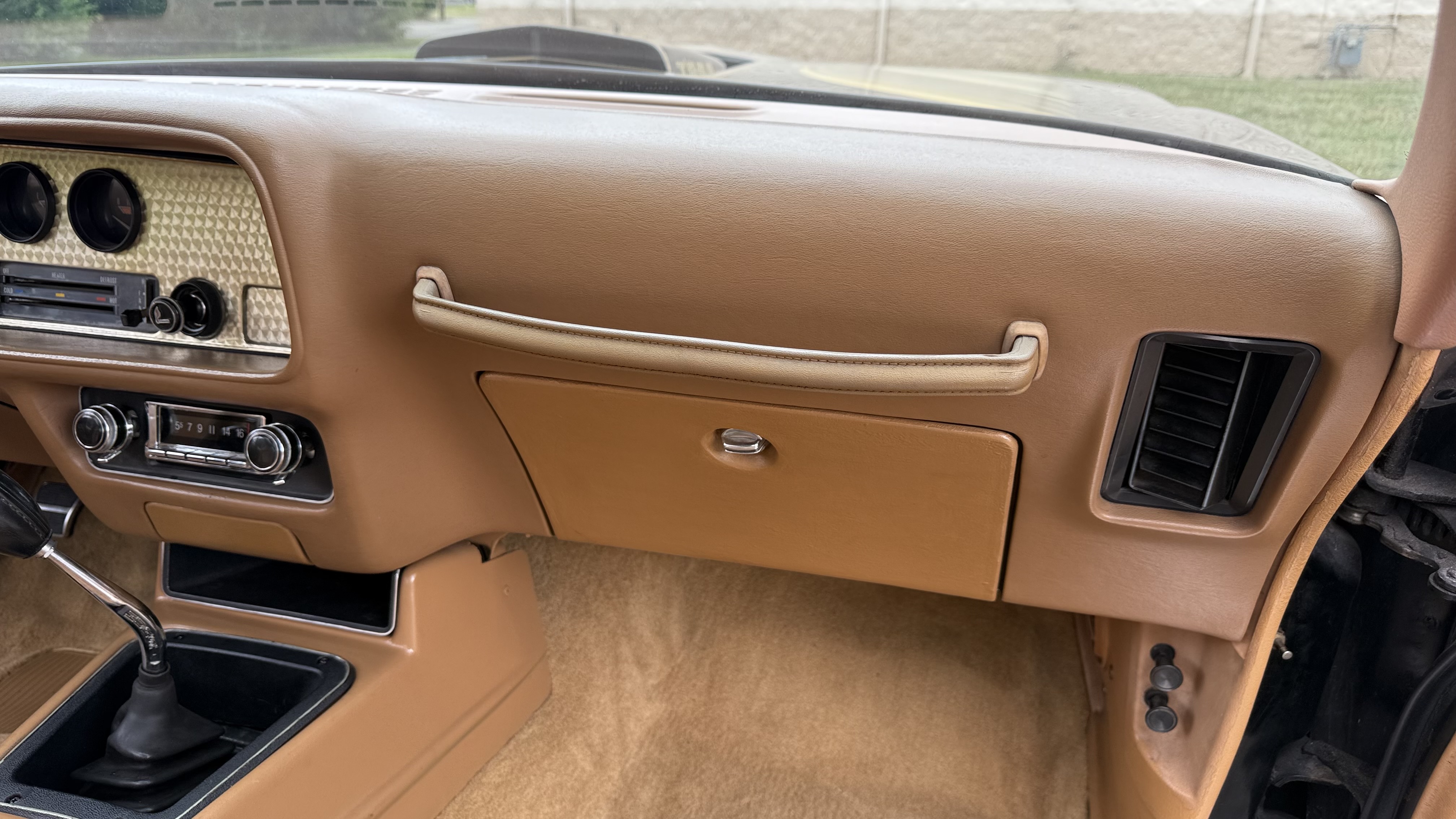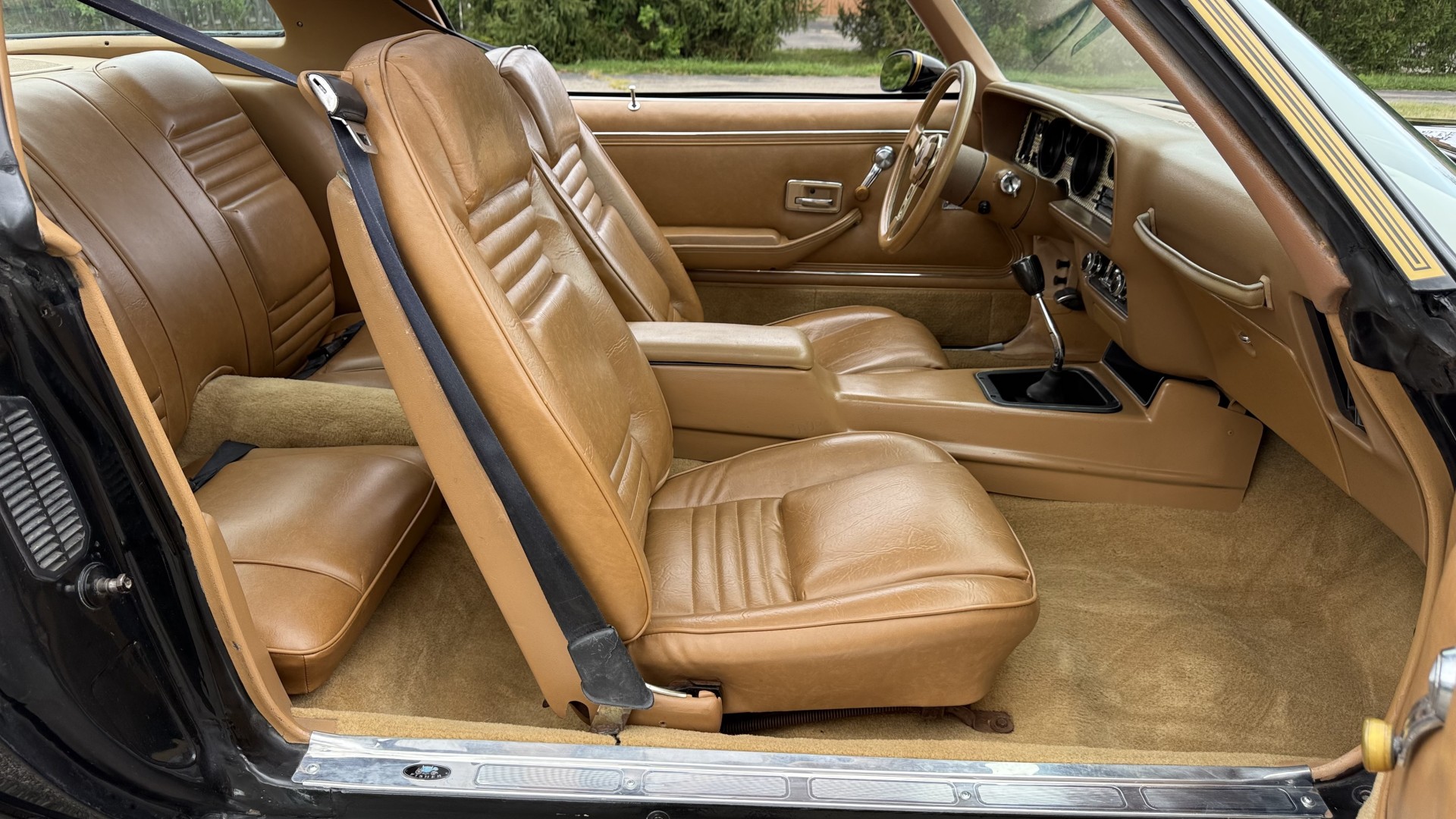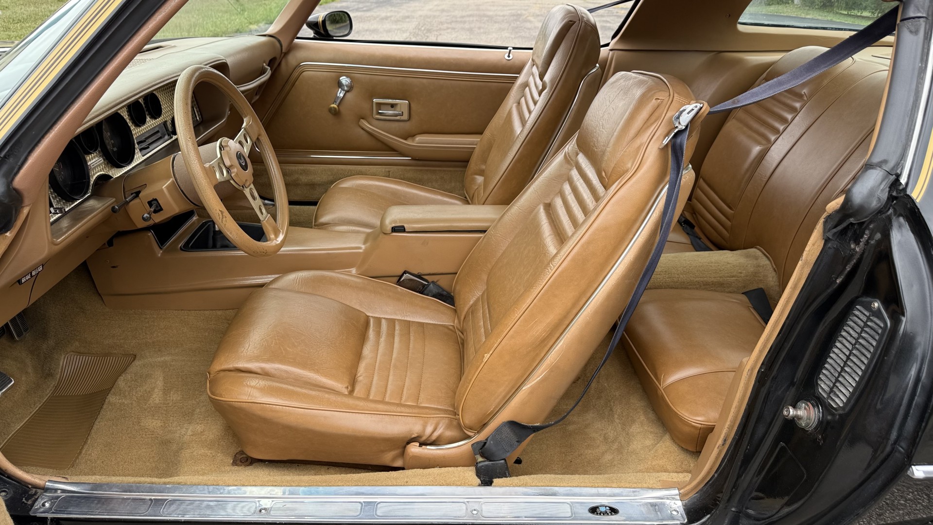 The Camel Tan deluxe vinyl interior of this Trans Am is in restored great overall condition. The seat covers were replaced with no major wear, no rips, or seam splits. These covers were replaced and the seat foams are in good condition as well. The carpet was replaced as well and is like new with no stains, rips, or holes. The original dash is in great condition with no cracks, no warping, and no fading. Most importantly this is the original dash, not a dash cap or the like. The dash bezel was restored by Randy Combs and truly makes the interior. The stereo system was fully upgraded with new speakers, new amplifier, and new digital mp3 deck. Thankfully the dash has not been cut for a modern stereo. The door panels are like new and were replaced and are in great condition and both door pulls are solid and in tact. New door cups and door lock pulls were added. New sill plates were added. The headliner was replaced. The entire center console is brand new including a new shifter bezel, new console lid and bin, and new map pocket. All interior and exterior lights and gauges work outside of the cigarette lighter and clock. The stereo, wipers, and blower motor all work. This car has not been smoked in; there is no aroma what so ever. The oil pressure gauge is intermittent.
