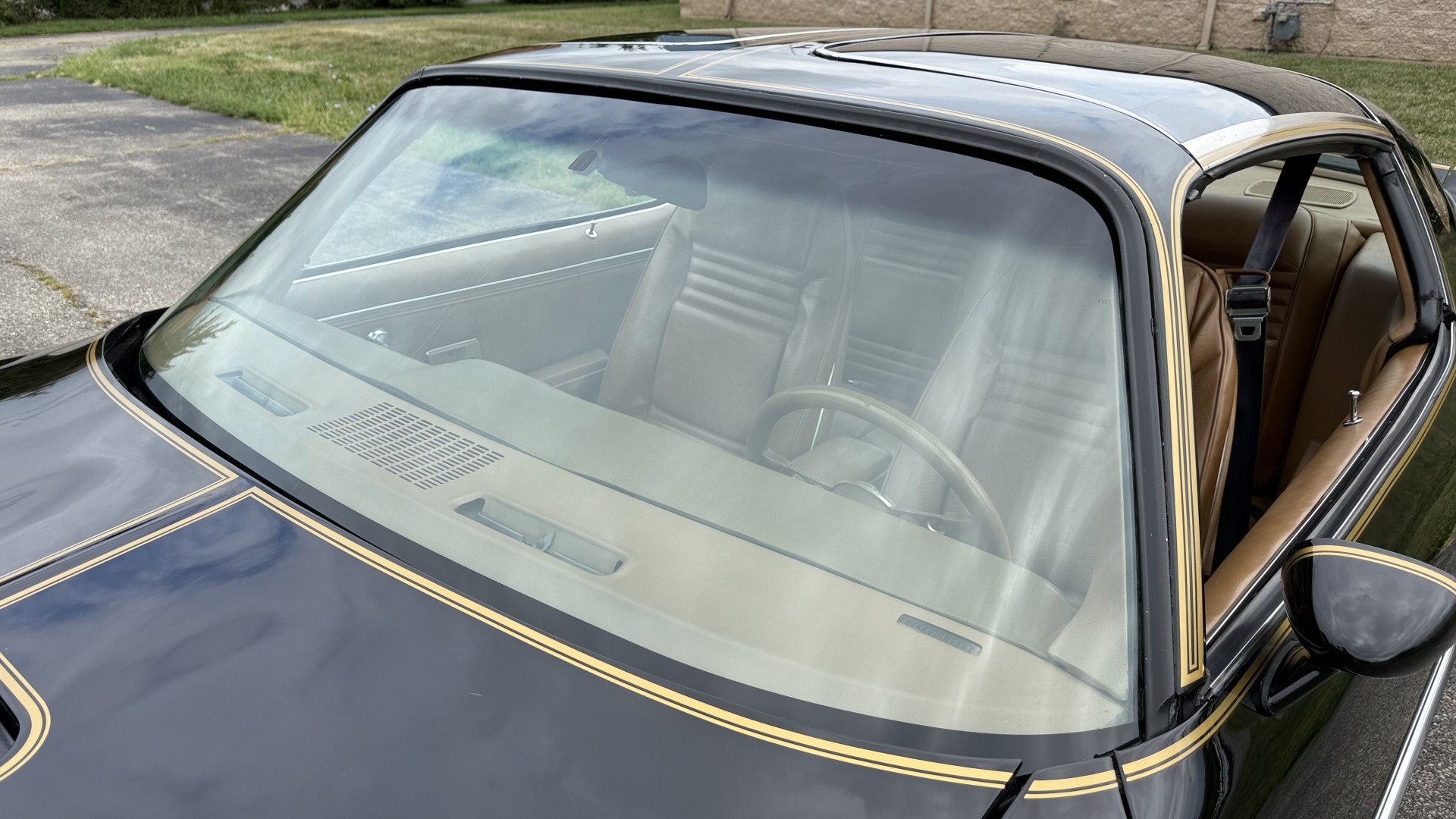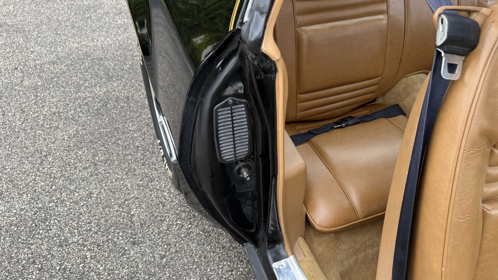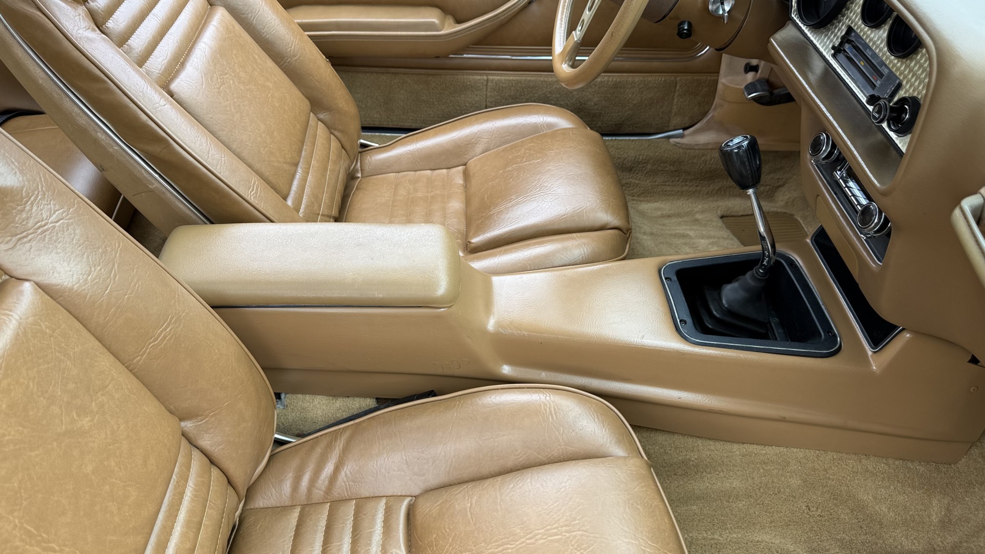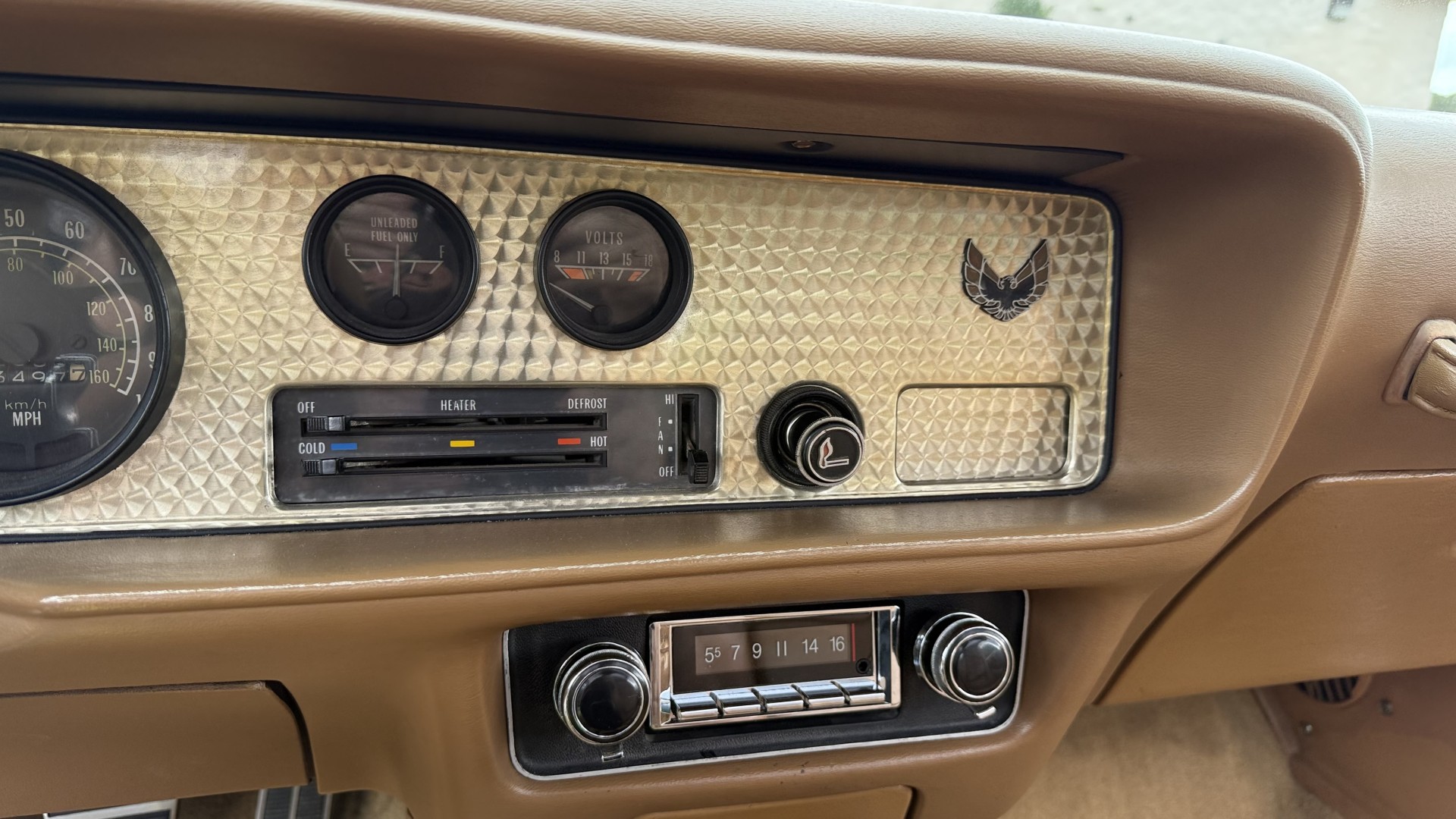 The Camel Tan deluxe vinyl interior of this Trans Am is in restored great overall condition. The seat covers were replaced with no major wear, no rips, or seam splits. These covers were replaced and the seat foams are in good condition as well. The carpet was replaced as well and is like new with no stains, rips, or holes. The original dash is in great condition with no cracks, no warping, and no fading. Most importantly this is the original dash, not a dash cap or the like. The dash bezel was restored by Randy Combs and truly makes the interior. The stereo system was fully upgraded with new speakers, new amplifier, and new digital mp3 deck. Thankfully the dash has not been cut for a modern stereo. The door panels are like new and were replaced and are in great condition and both door pulls are solid and in tact. New door cups and door lock pulls were added. New sill plates were added. The headliner was replaced. The entire center console is brand new including a new shifter bezel, new console lid and bin, and new map pocket. All interior and exterior lights and gauges work outside of the cigarette lighter and clock. The stereo, wipers, and blower motor all work. This car has not been smoked in; there is no aroma what so ever. The oil pressure gauge is intermittent.