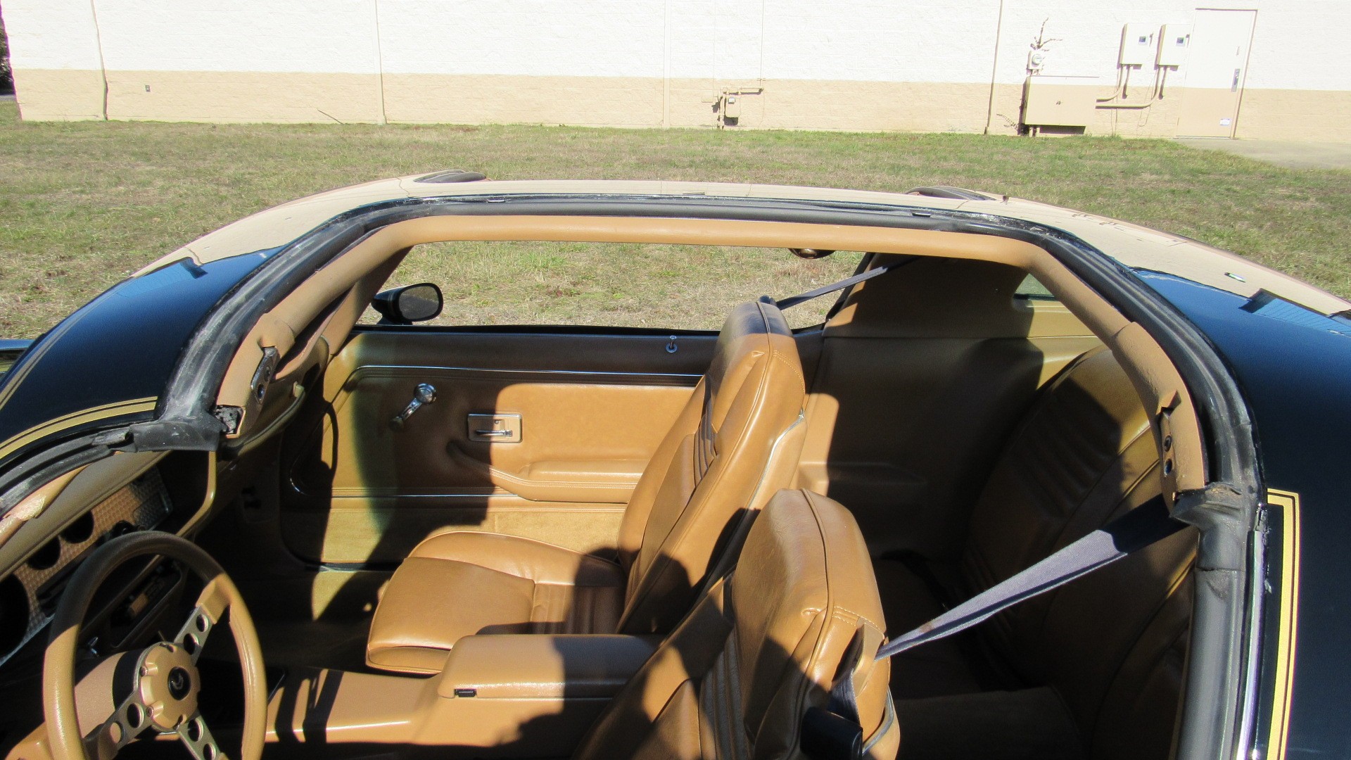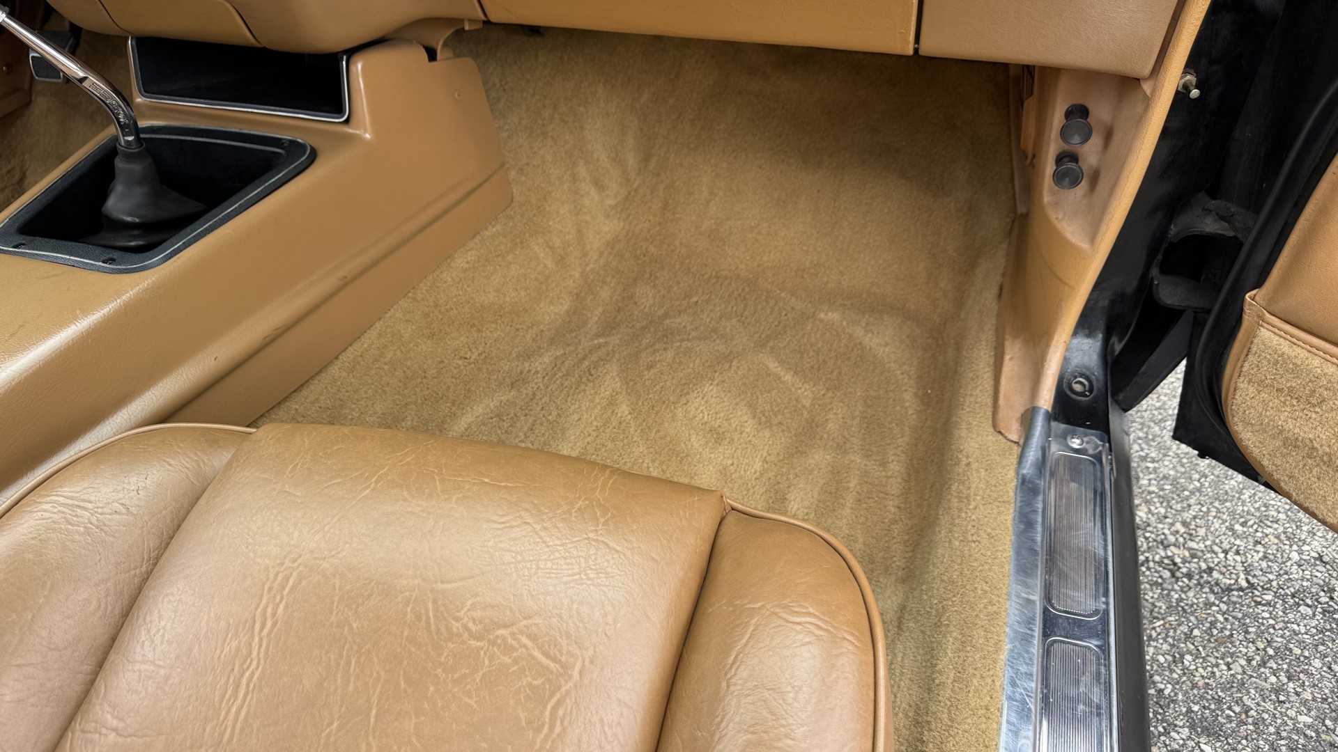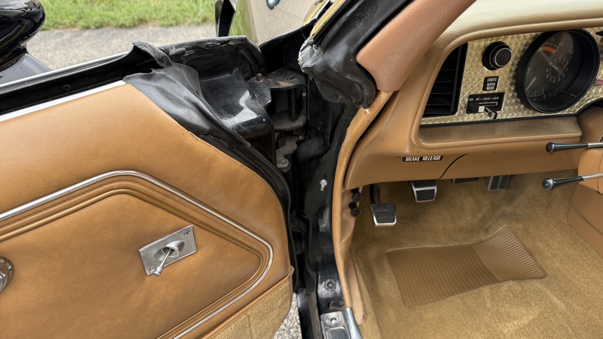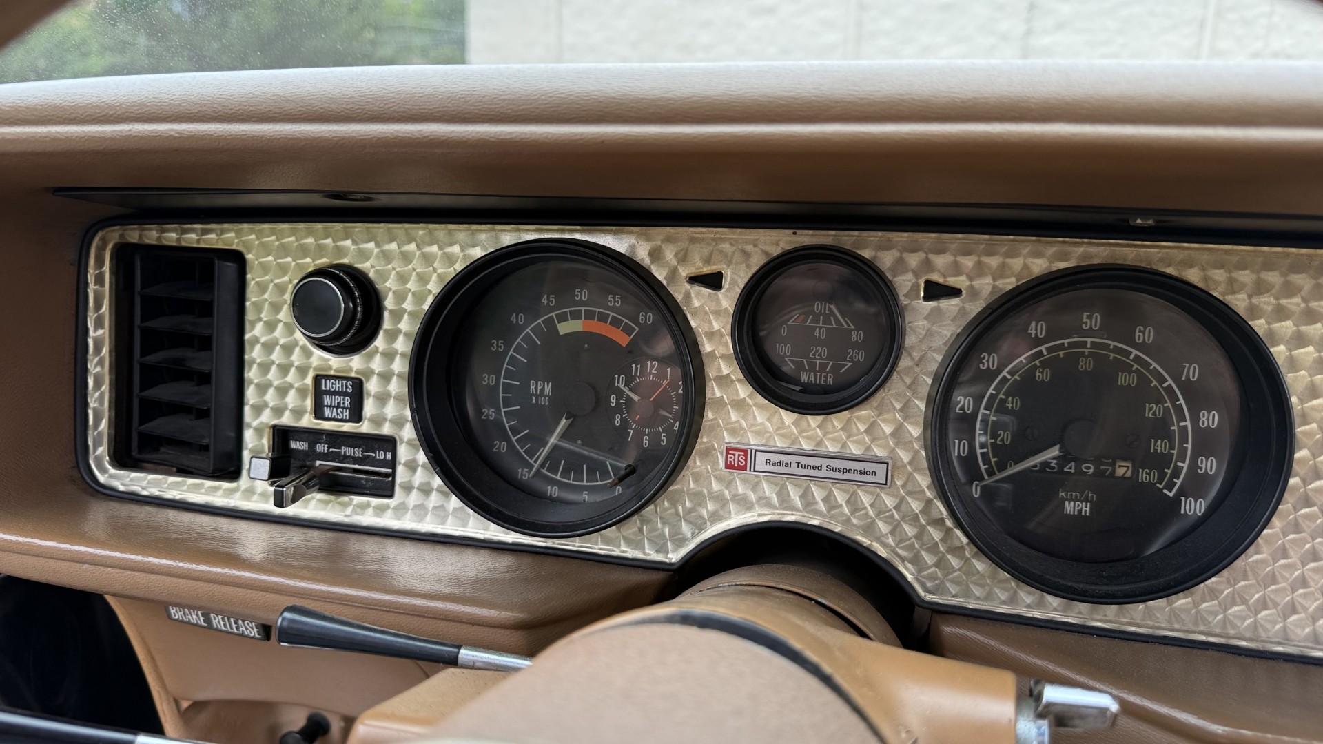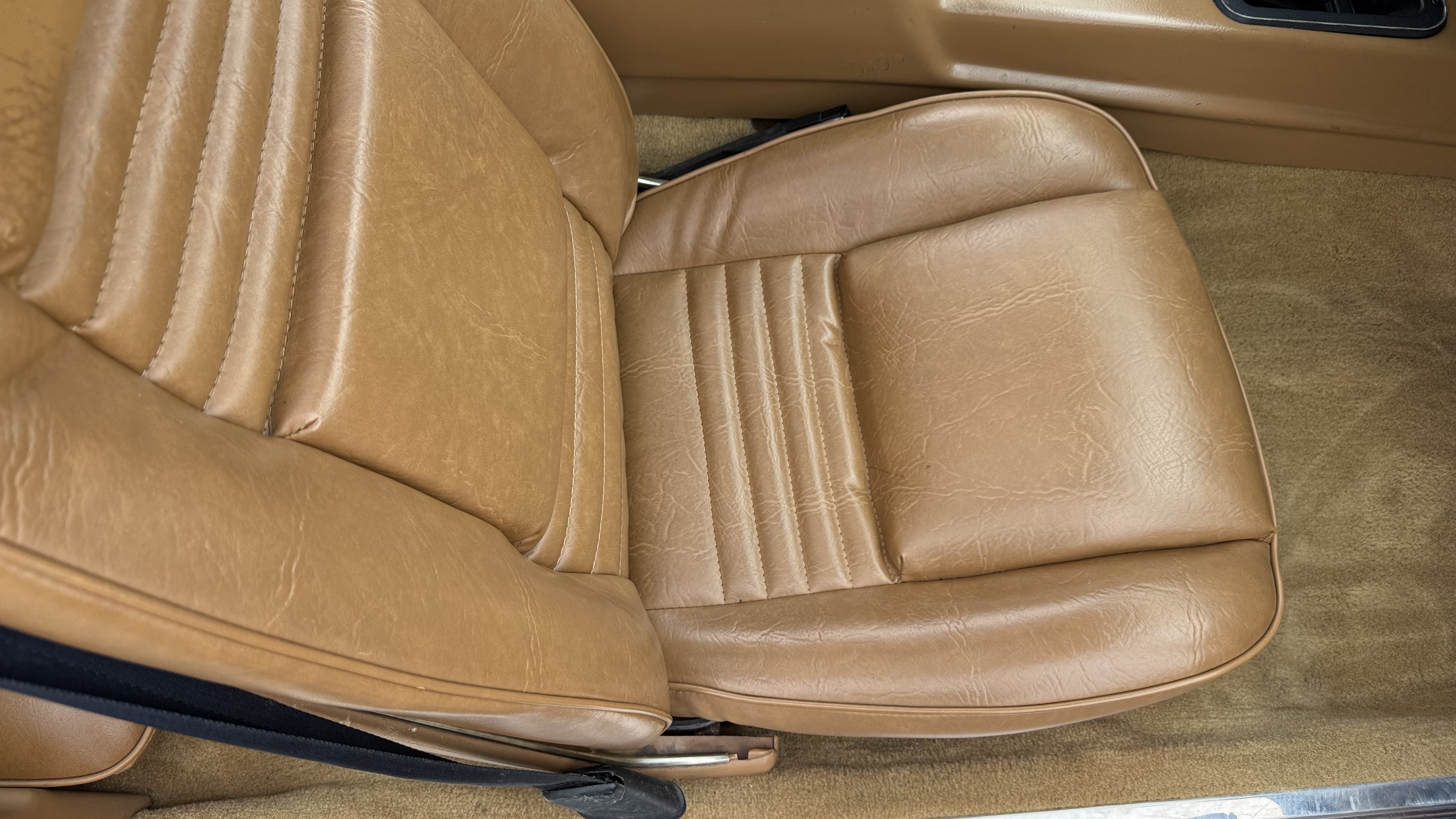 The Camel Tan deluxe vinyl interior of this Trans Am is in restored great overall condition. The seat covers were replaced with no major wear, no rips, or seam splits. These covers were replaced and the seat foams are in good condition as well. The carpet was replaced as well and is like new with no stains, rips, or holes. The original dash is in great condition with no cracks, no warping, and no fading. Most importantly this is the original dash, not a dash cap or the like. The dash bezel was restored by Randy Combs and truly makes the interior. The stereo system was fully upgraded with new speakers, new amplifier, and new digital mp3 deck. Thankfully the dash has not been cut for a modern stereo. The door panels are like new and were replaced and are in great condition and both door pulls are solid and in tact. New door cups and door lock pulls were added. New sill plates were added. The headliner was replaced. The entire center console is brand new including a new shifter bezel, new console lid and bin, and new map pocket. All interior and exterior lights and gauges work outside of the cigarette lighter and clock. The stereo, wipers, and blower motor all work. This car has not been smoked in; there is no aroma what so ever. The oil pressure gauge is intermittent.