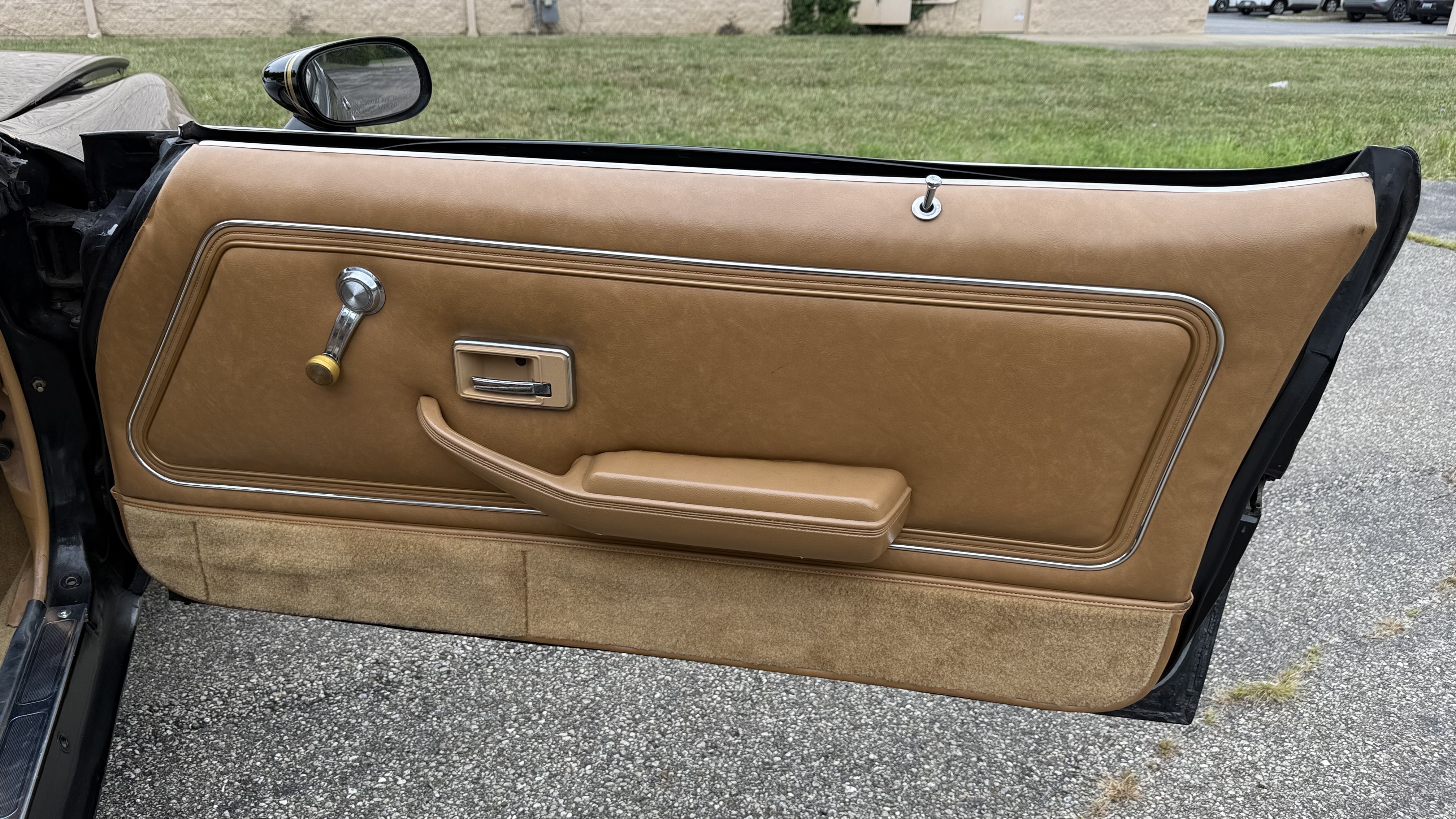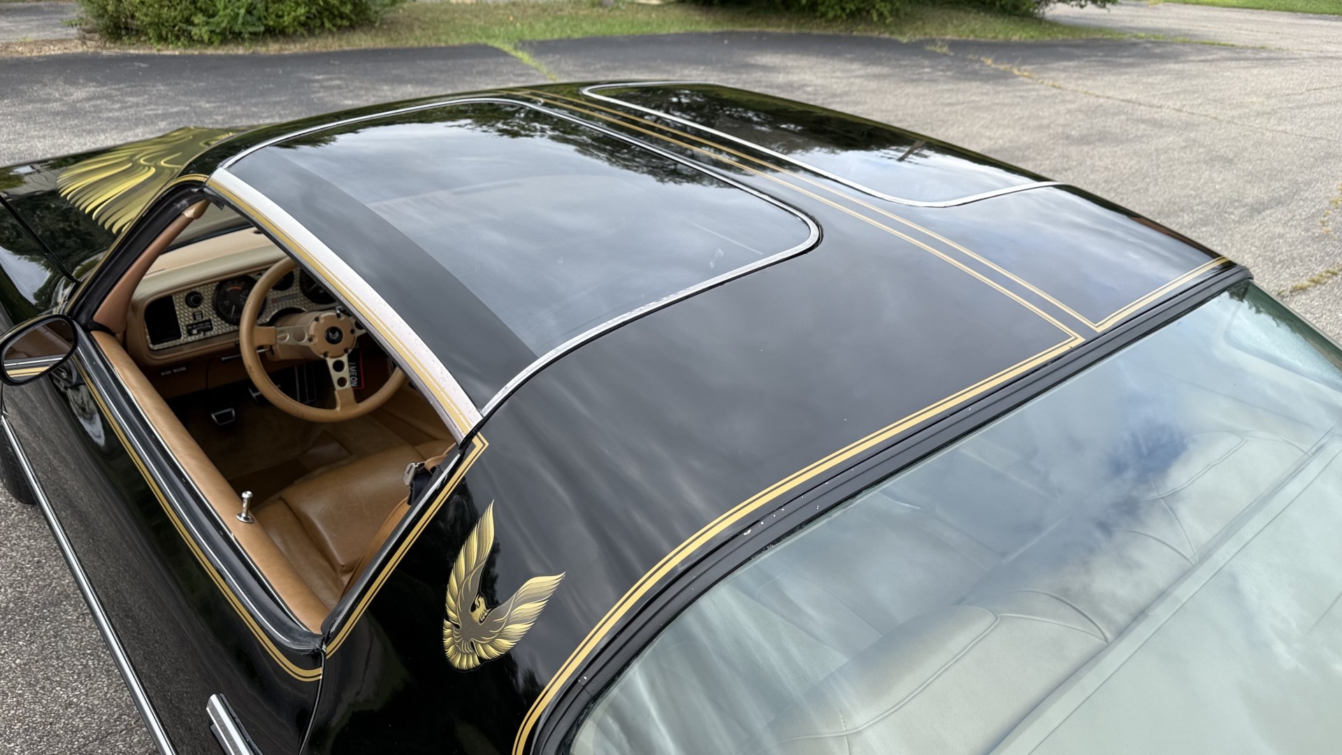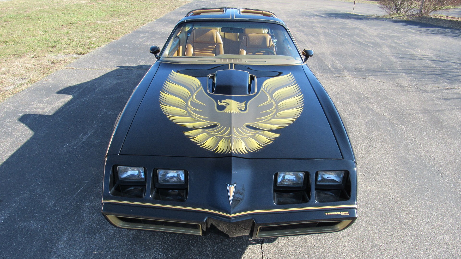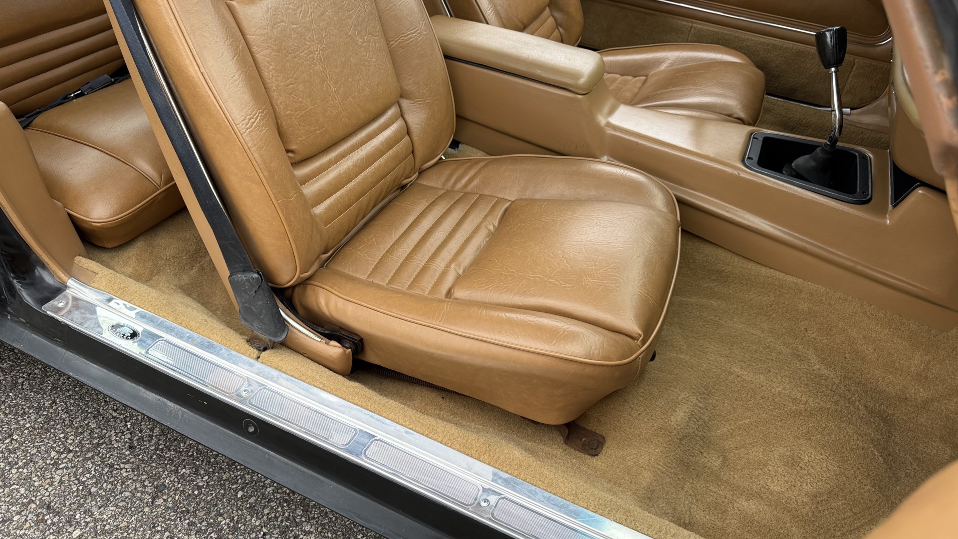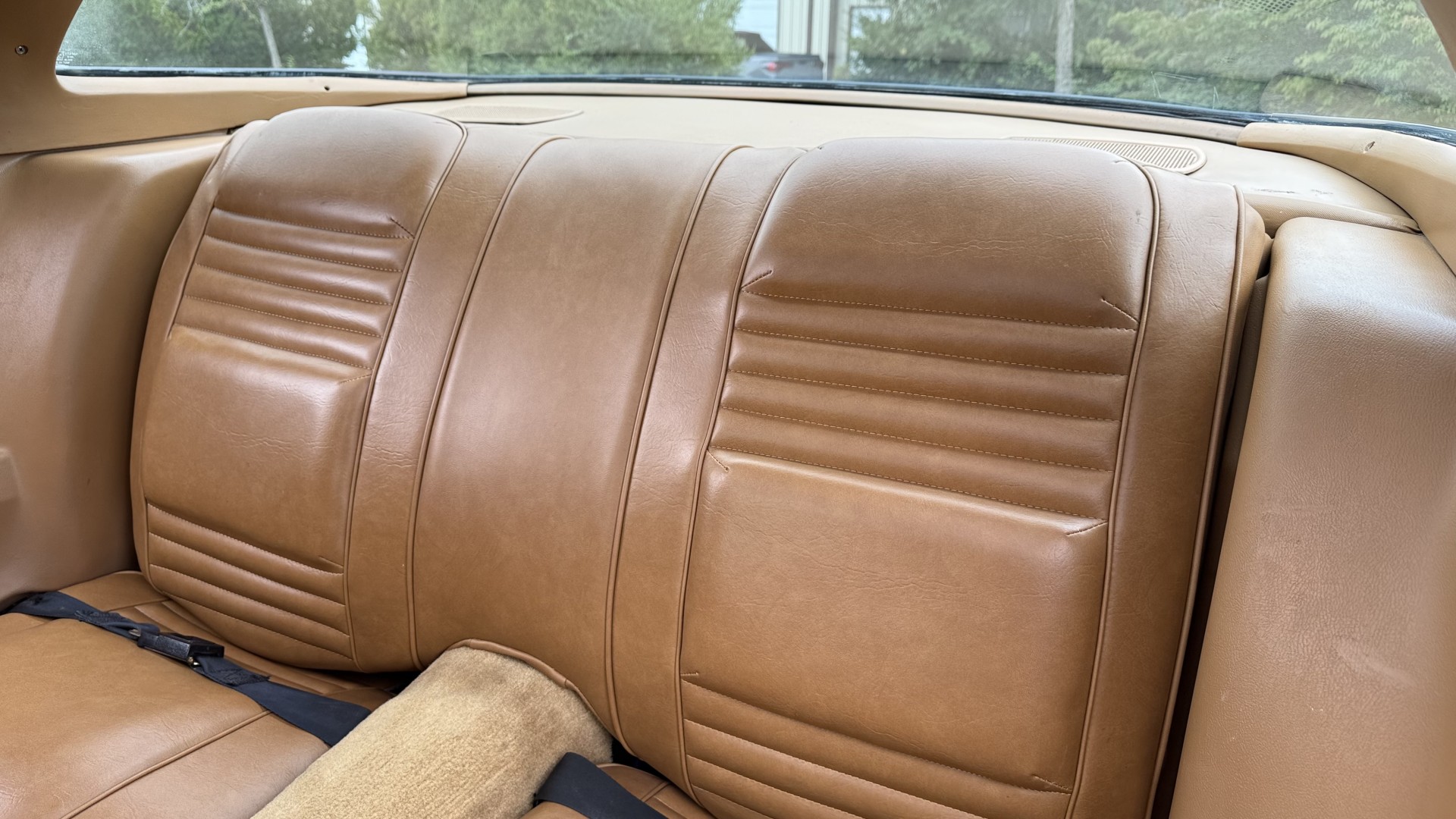 The Camel Tan deluxe vinyl interior of this Trans Am is in restored great overall condition. The seat covers were replaced with no major wear, no rips, or seam splits. These covers were replaced and the seat foams are in good condition as well. The carpet was replaced as well and is like new with no stains, rips, or holes. The original dash is in great condition with no cracks, no warping, and no fading. Most importantly this is the original dash, not a dash cap or the like. The dash bezel was restored by Randy Combs and truly makes the interior. The stereo system was fully upgraded with new speakers, new amplifier, and new digital mp3 deck. Thankfully the dash has not been cut for a modern stereo. The door panels are like new and were replaced and are in great condition and both door pulls are solid and in tact. New door cups and door lock pulls were added. New sill plates were added. The headliner was replaced. The entire center console is brand new including a new shifter bezel, new console lid and bin, and new map pocket. All interior and exterior lights and gauges work outside of the cigarette lighter and clock. The stereo, wipers, and blower motor all work. This car has not been smoked in; there is no aroma what so ever. The oil pressure gauge is intermittent.