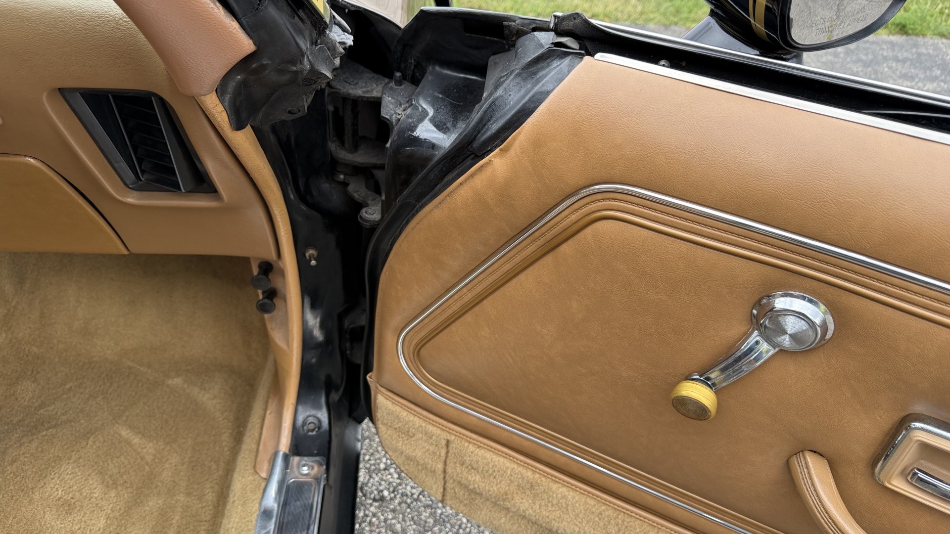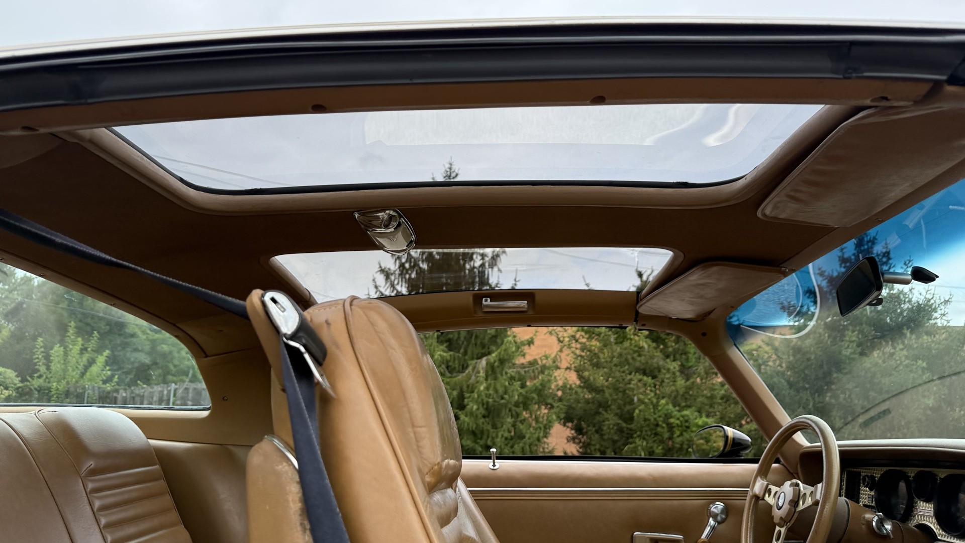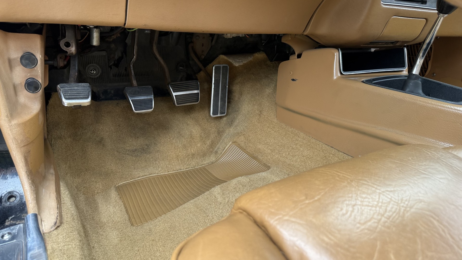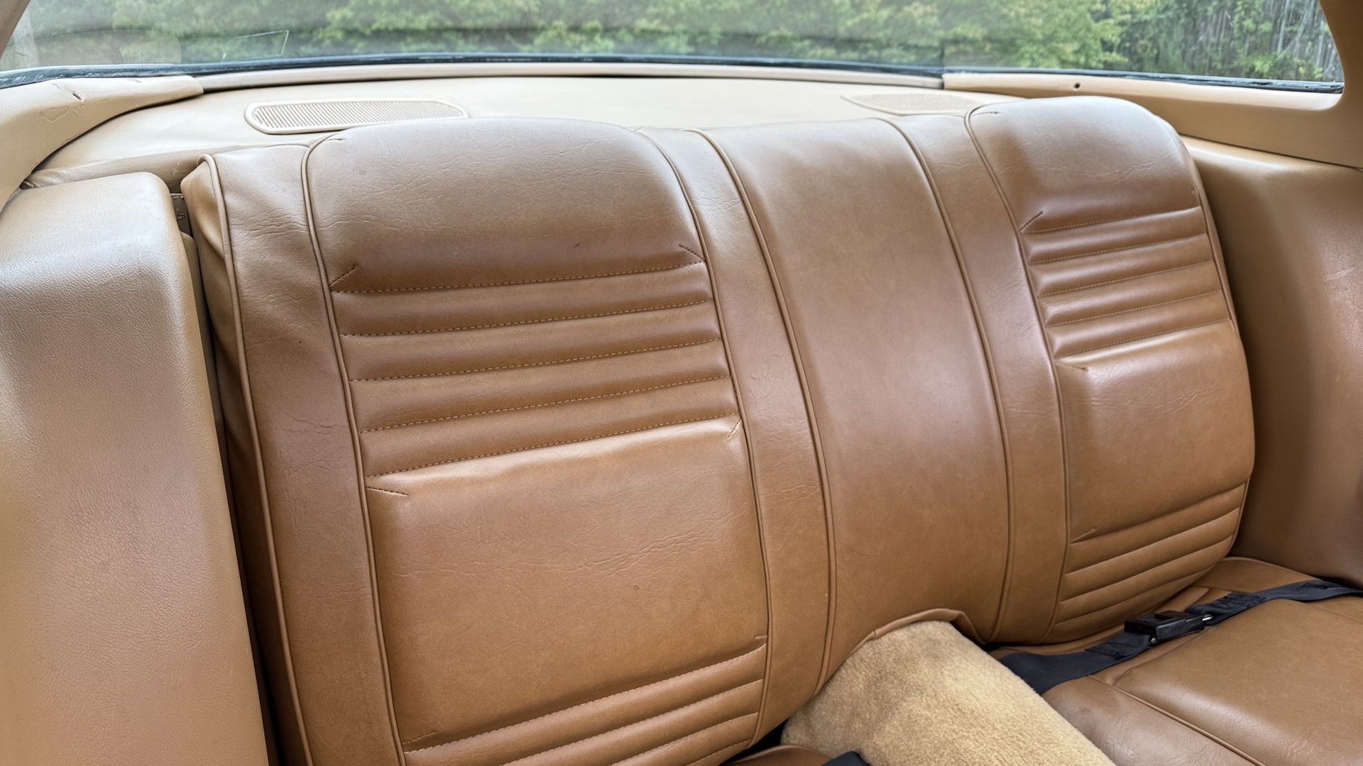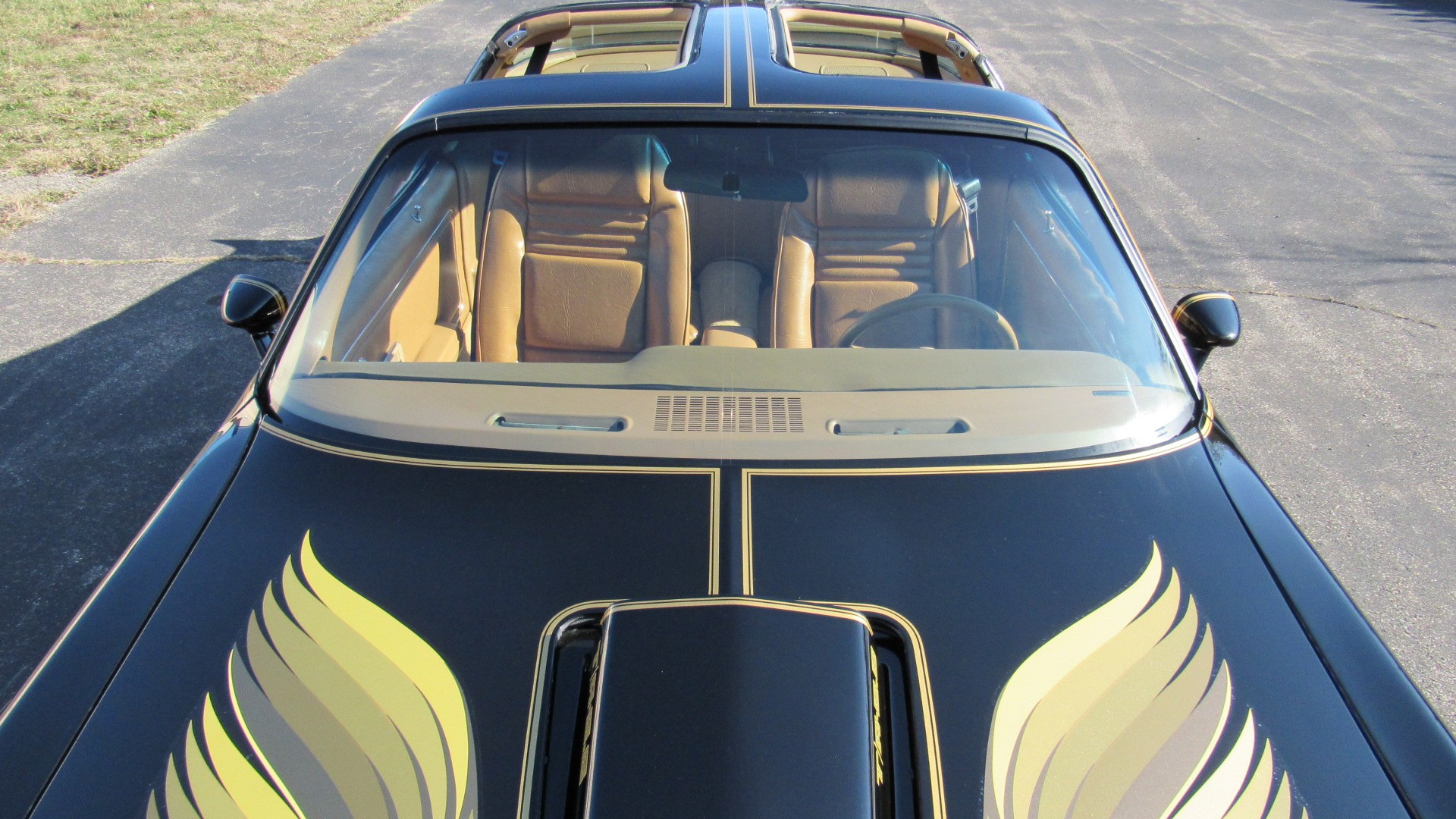 The Camel Tan deluxe vinyl interior of this Trans Am is in restored great overall condition. The seat covers were replaced with no major wear, no rips, or seam splits. These covers were replaced and the seat foams are in good condition as well. The carpet was replaced as well and is like new with no stains, rips, or holes. The original dash is in great condition with no cracks, no warping, and no fading. Most importantly this is the original dash, not a dash cap or the like. The dash bezel was restored by Randy Combs and truly makes the interior. The stereo system was fully upgraded with new speakers, new amplifier, and new digital mp3 deck. Thankfully the dash has not been cut for a modern stereo. The door panels are like new and were replaced and are in great condition and both door pulls are solid and in tact. New door cups and door lock pulls were added. New sill plates were added. The headliner was replaced. The entire center console is brand new including a new shifter bezel, new console lid and bin, and new map pocket. All interior and exterior lights and gauges work outside of the cigarette lighter and clock. The stereo, wipers, and blower motor all work. This car has not been smoked in; there is no aroma what so ever. The oil pressure gauge is intermittent.