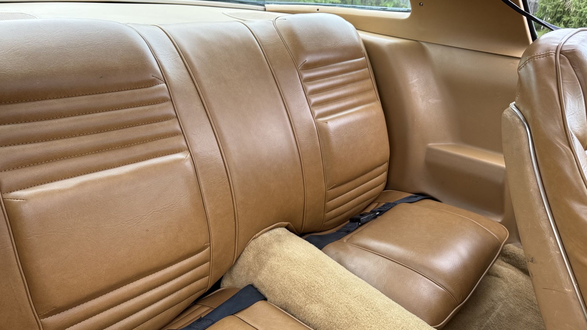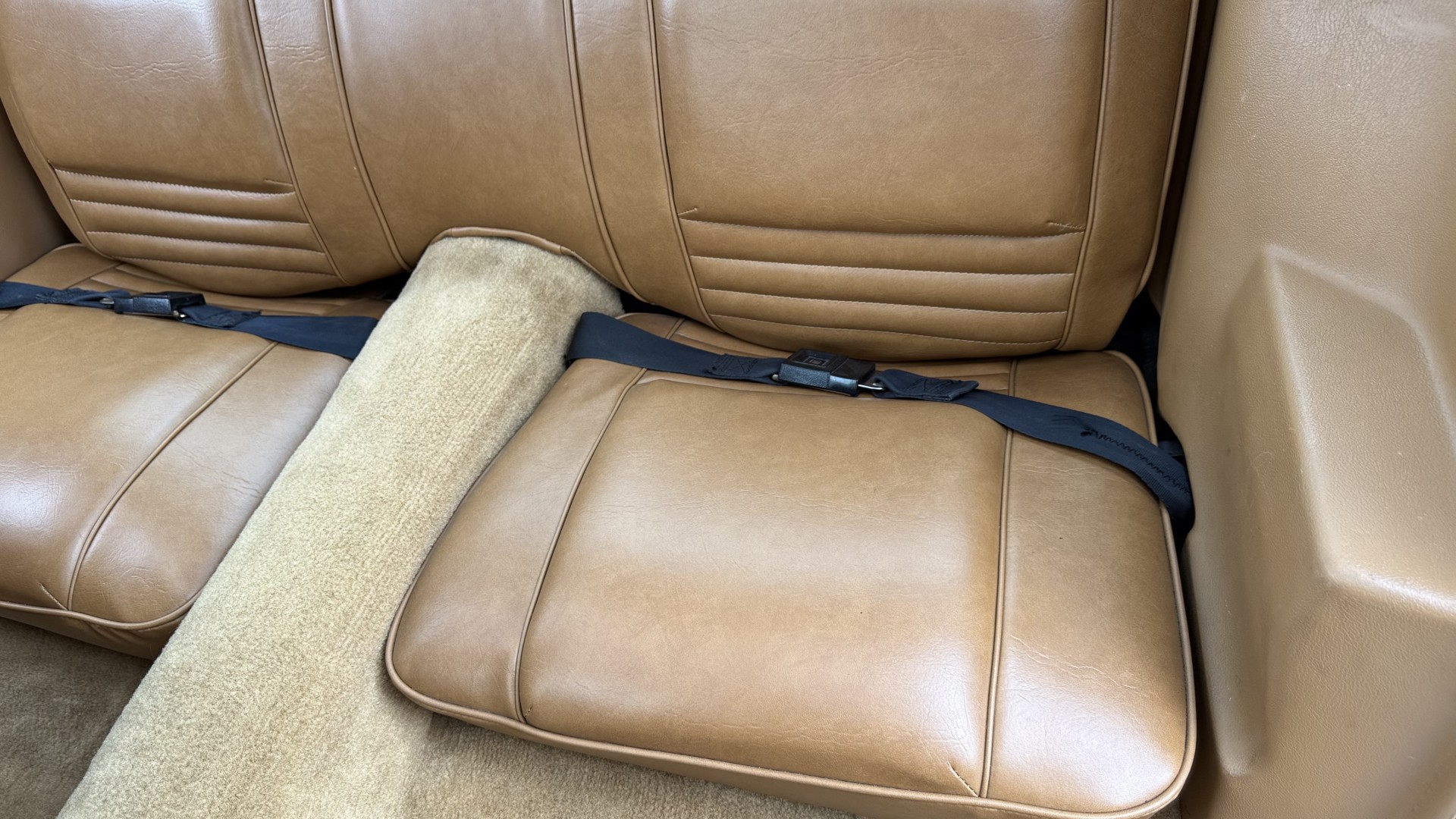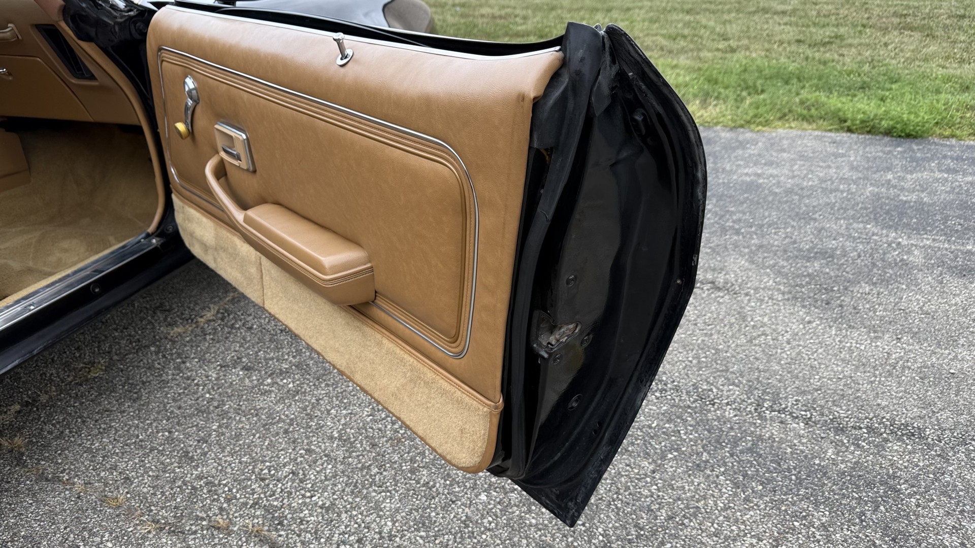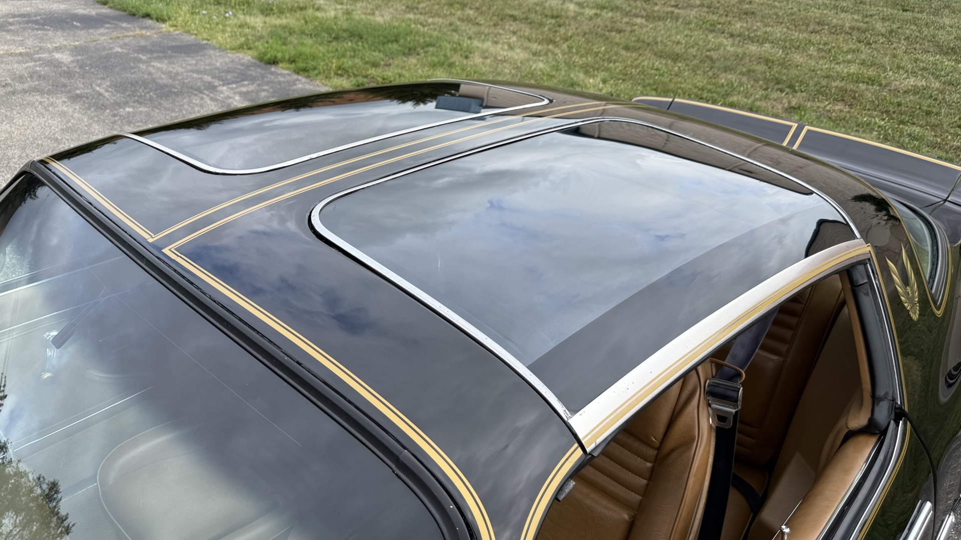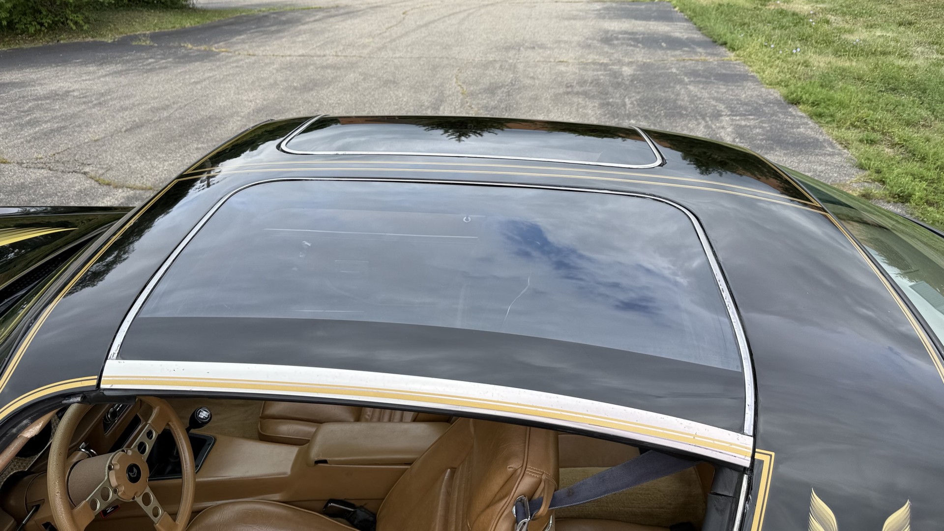 The Camel Tan deluxe vinyl interior of this Trans Am is in restored great overall condition. The seat covers were replaced with no major wear, no rips, or seam splits. These covers were replaced and the seat foams are in good condition as well. The carpet was replaced as well and is like new with no stains, rips, or holes. The original dash is in great condition with no cracks, no warping, and no fading. Most importantly this is the original dash, not a dash cap or the like. The dash bezel was restored by Randy Combs and truly makes the interior. The stereo system was fully upgraded with new speakers, new amplifier, and new digital mp3 deck. Thankfully the dash has not been cut for a modern stereo. The door panels are like new and were replaced and are in great condition and both door pulls are solid and in tact. New door cups and door lock pulls were added. New sill plates were added. The headliner was replaced. The entire center console is brand new including a new shifter bezel, new console lid and bin, and new map pocket. All interior and exterior lights and gauges work outside of the cigarette lighter and clock. The stereo, wipers, and blower motor all work. This car has not been smoked in; there is no aroma what so ever. The oil pressure gauge is intermittent.