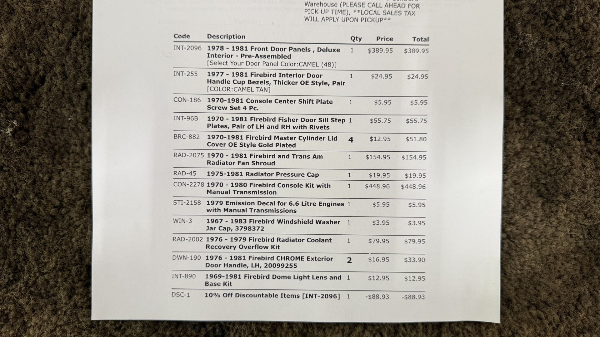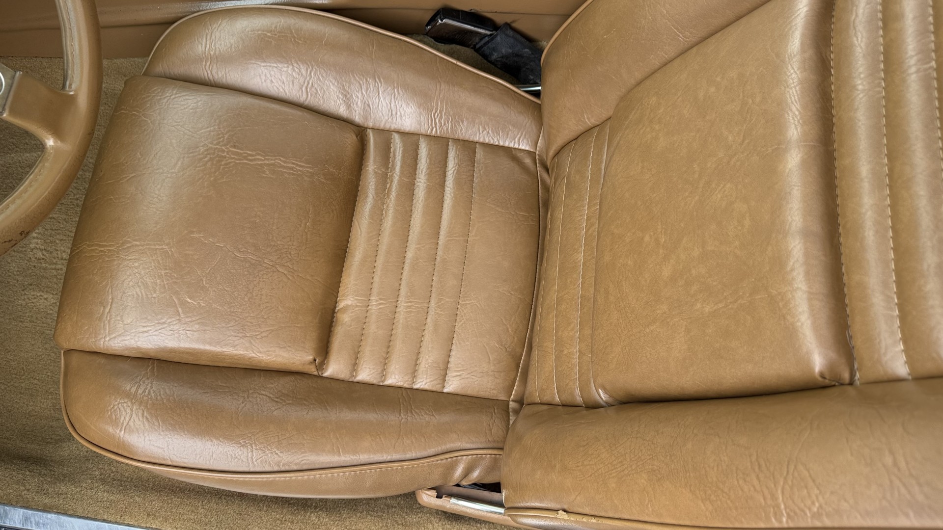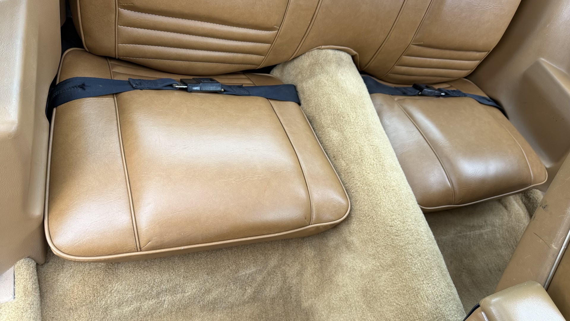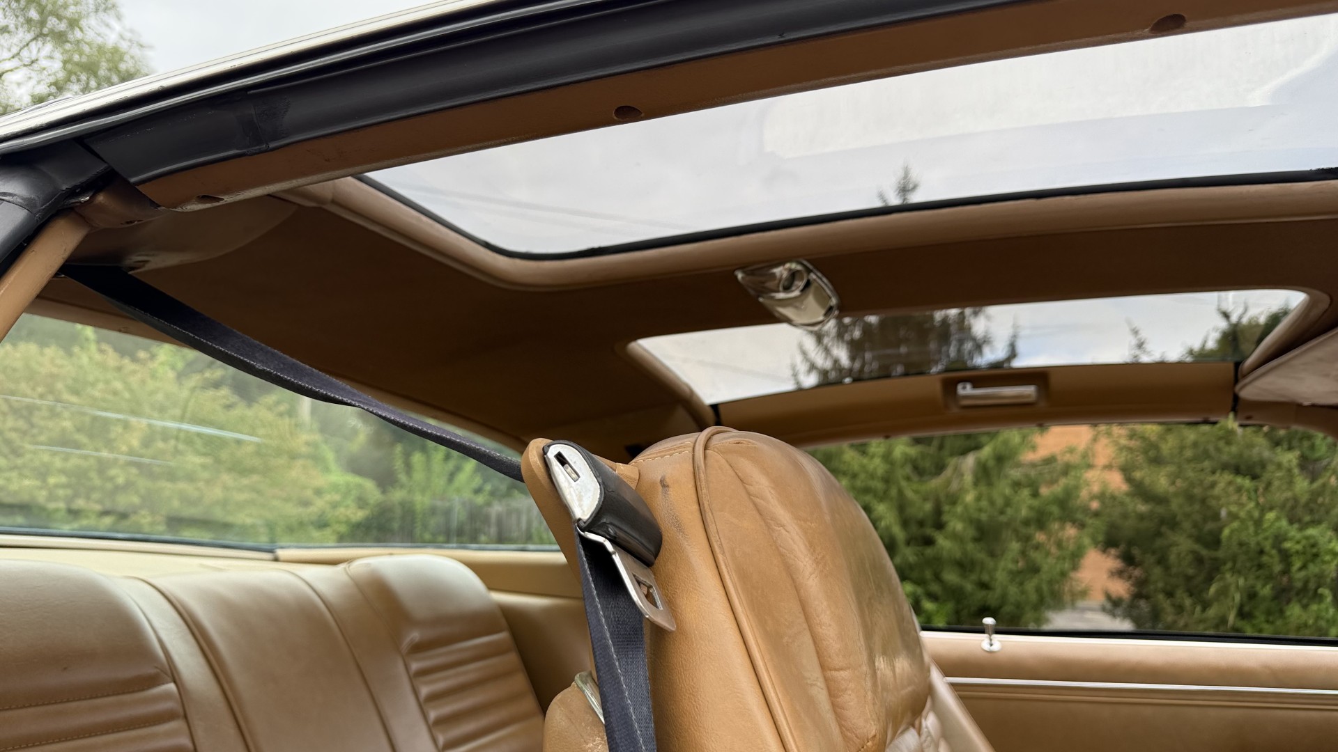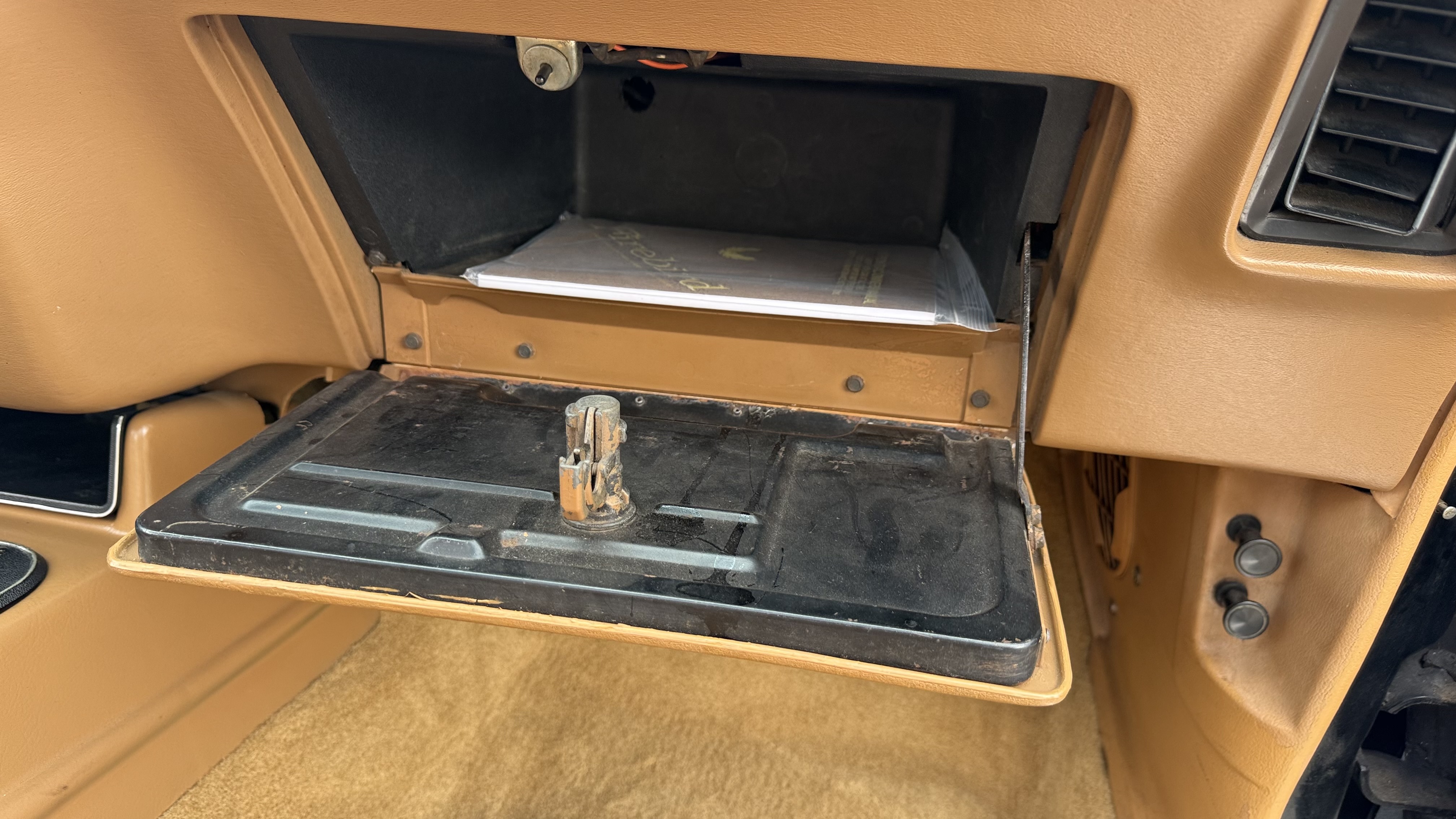 The Camel Tan deluxe vinyl interior of this Trans Am is in restored great overall condition. The seat covers were replaced with no major wear, no rips, or seam splits. These covers were replaced and the seat foams are in good condition as well. The carpet was replaced as well and is like new with no stains, rips, or holes. The original dash is in great condition with no cracks, no warping, and no fading. Most importantly this is the original dash, not a dash cap or the like. The dash bezel was restored by Randy Combs and truly makes the interior. The stereo system was fully upgraded with new speakers, new amplifier, and new digital mp3 deck. Thankfully the dash has not been cut for a modern stereo. The door panels are like new and were replaced and are in great condition and both door pulls are solid and in tact. New door cups and door lock pulls were added. New sill plates were added. The headliner was replaced. The entire center console is brand new including a new shifter bezel, new console lid and bin, and new map pocket. All interior and exterior lights and gauges work outside of the cigarette lighter and clock. The stereo, wipers, and blower motor all work. This car has not been smoked in; there is no aroma what so ever. The oil pressure gauge is intermittent.