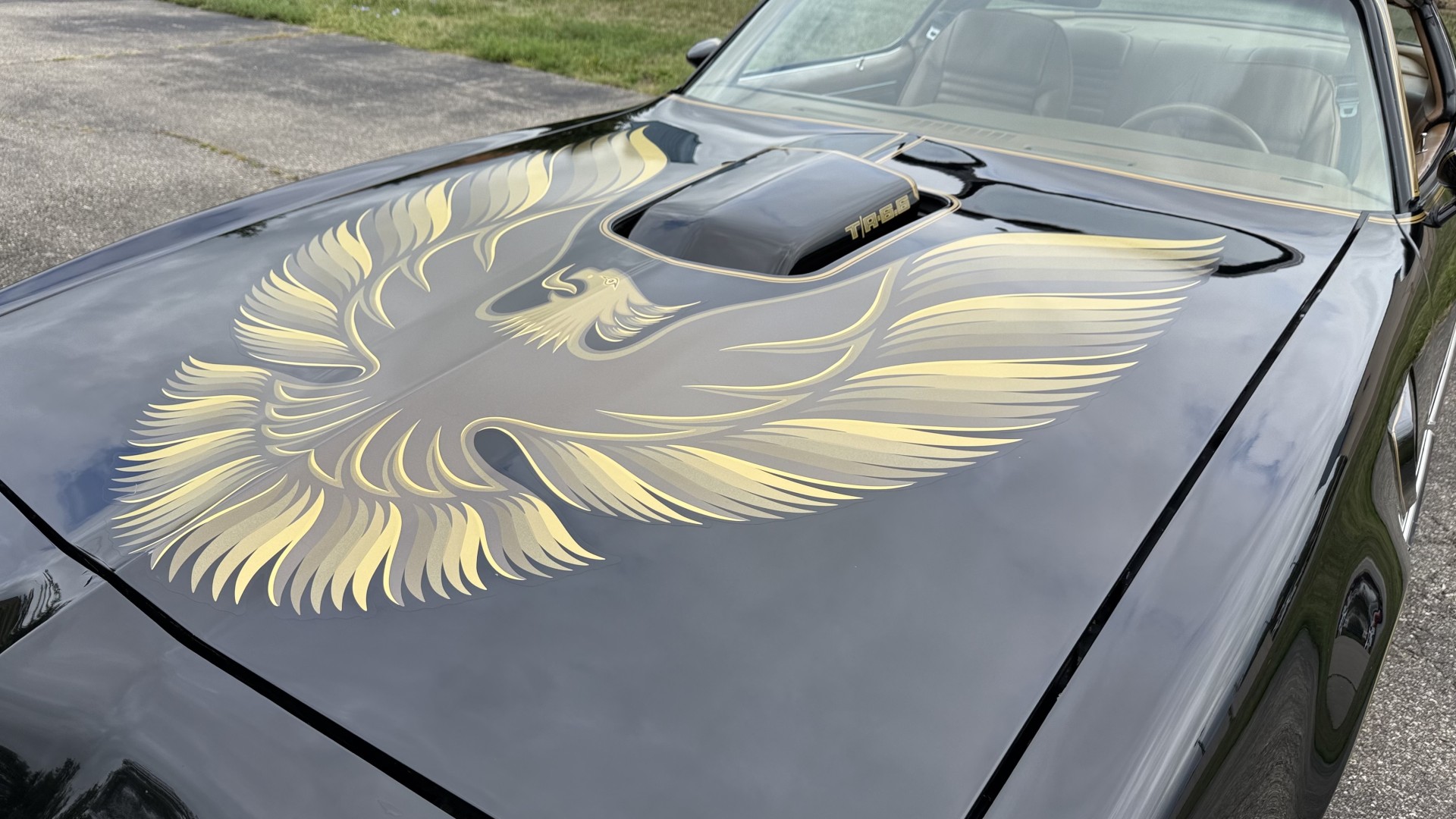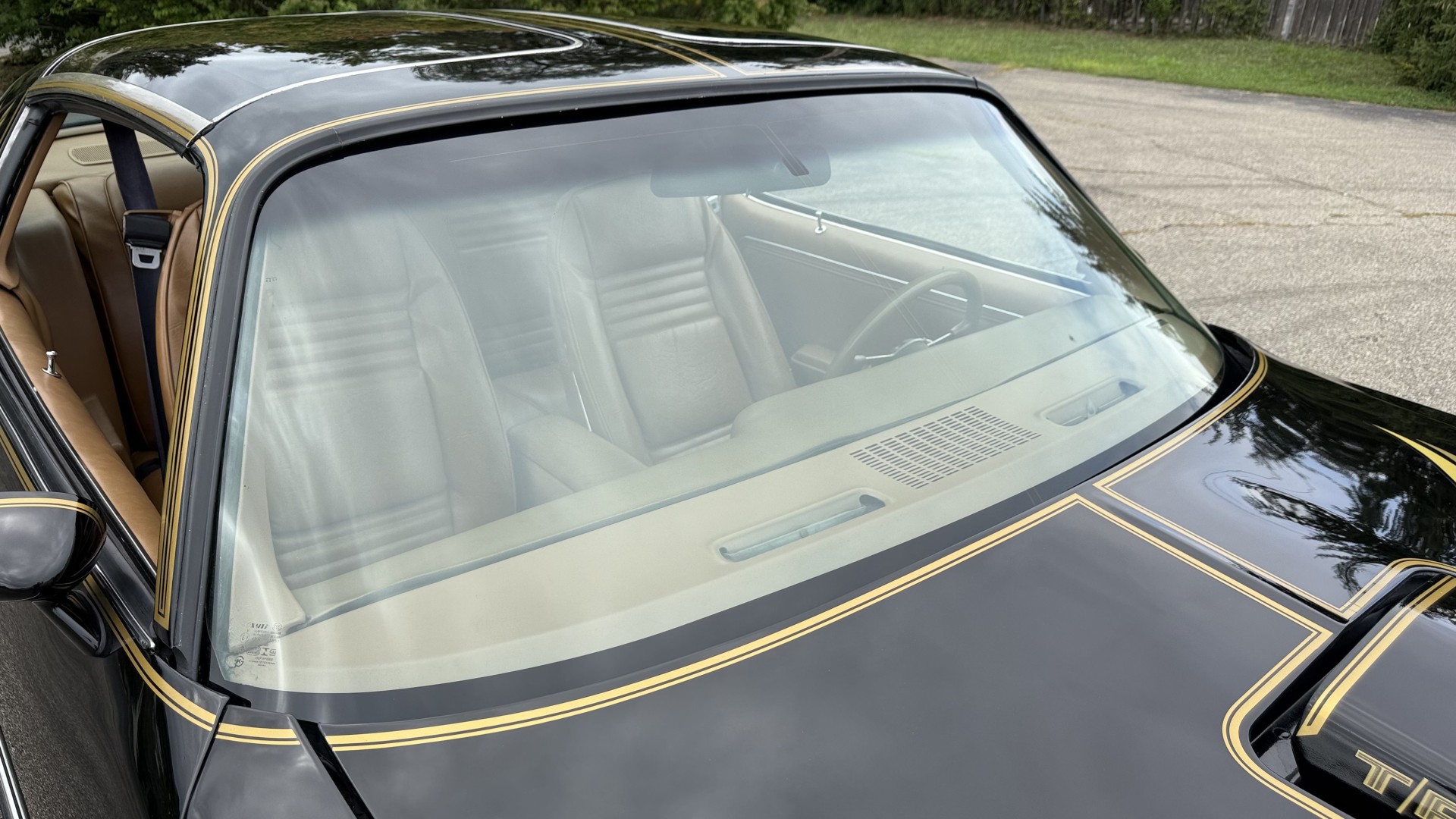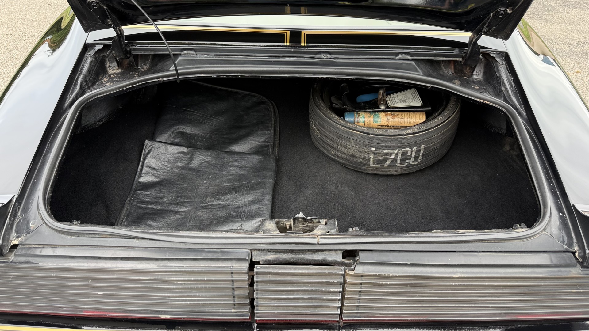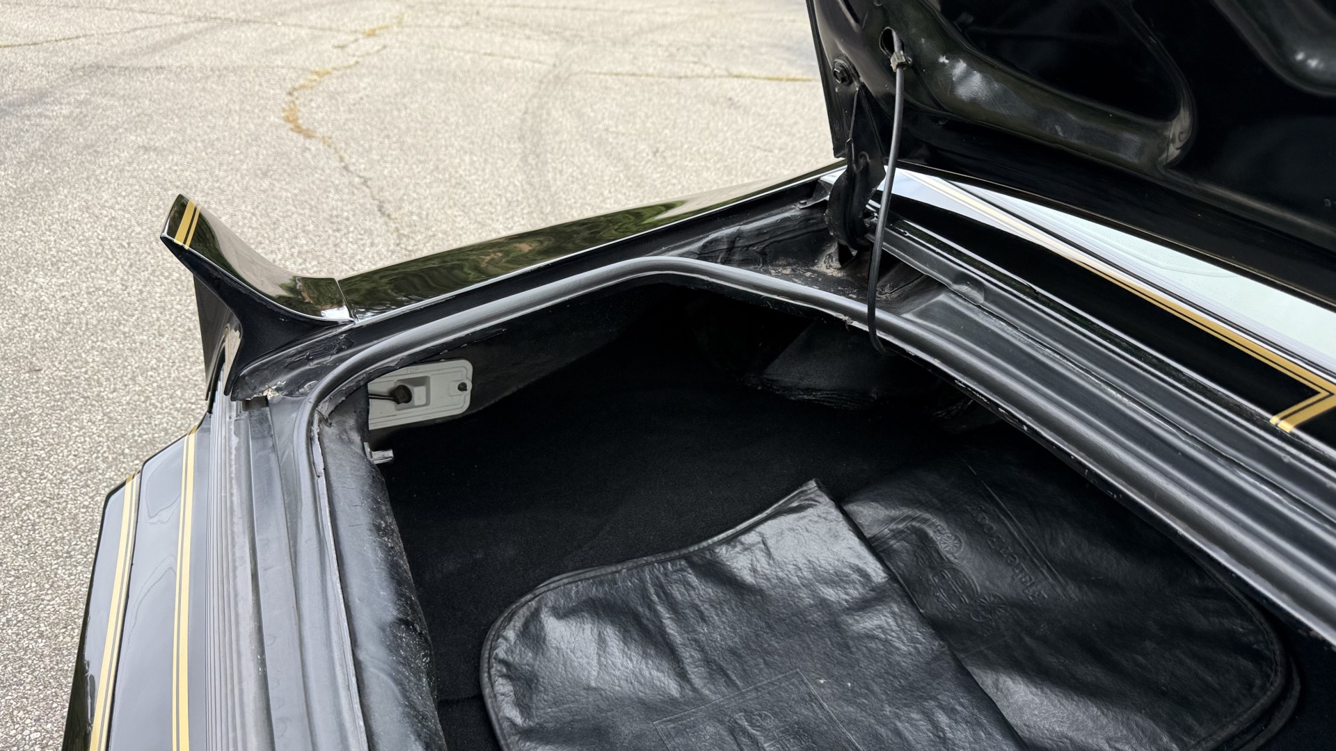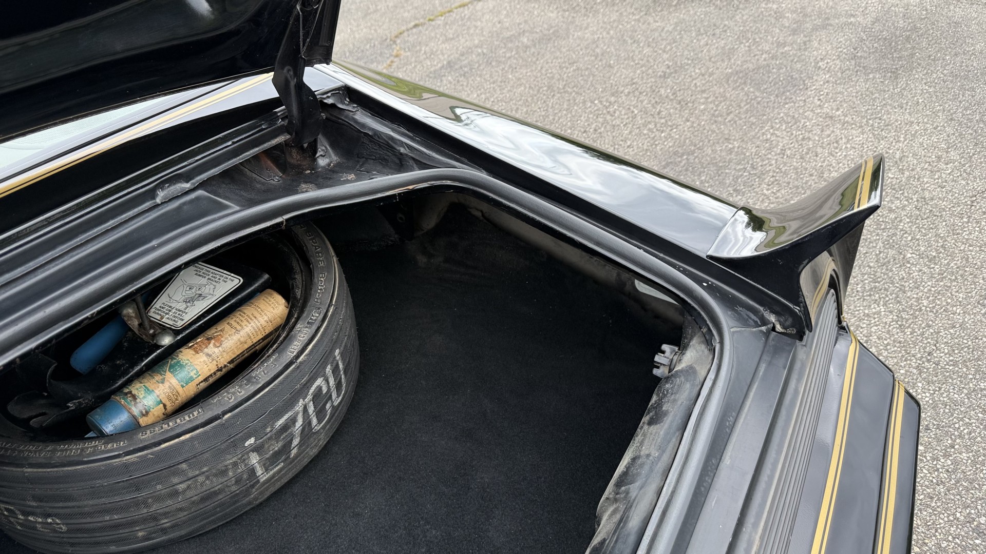 The Black exterior is in restored condition. This Trans Am features a repaint in factory starlight black with new decals and special edition pinstripes. The paint is in nice overall condition and has a great gloss and shine. There are no signs of visible rust anywhere on the body or underneath and both bumpers are in great shape. There is no bubbling paint or cracked paint due to body filler on this TA. There was no rust repair prior to the repaint as the body was in good rust free condition. The underside is very solid and honest and rust free. There may be some minor imperfections that are not noticeable in the photos, but nothing was intentionally excluded from the photos. The tires are like new and are sized 245/60/15 and the 8″ WS6 snowflake wheels are new wheels in great condition with new center caps and lug nuts. All weather stripping and window sweeps are in good shape. Trunk is clean with the original spare tire and jack and t top bags with an original style correct trunk mat. There is minor damage to the tail panel due to an improper attempt to jack up the car, but no rust in tail panel.