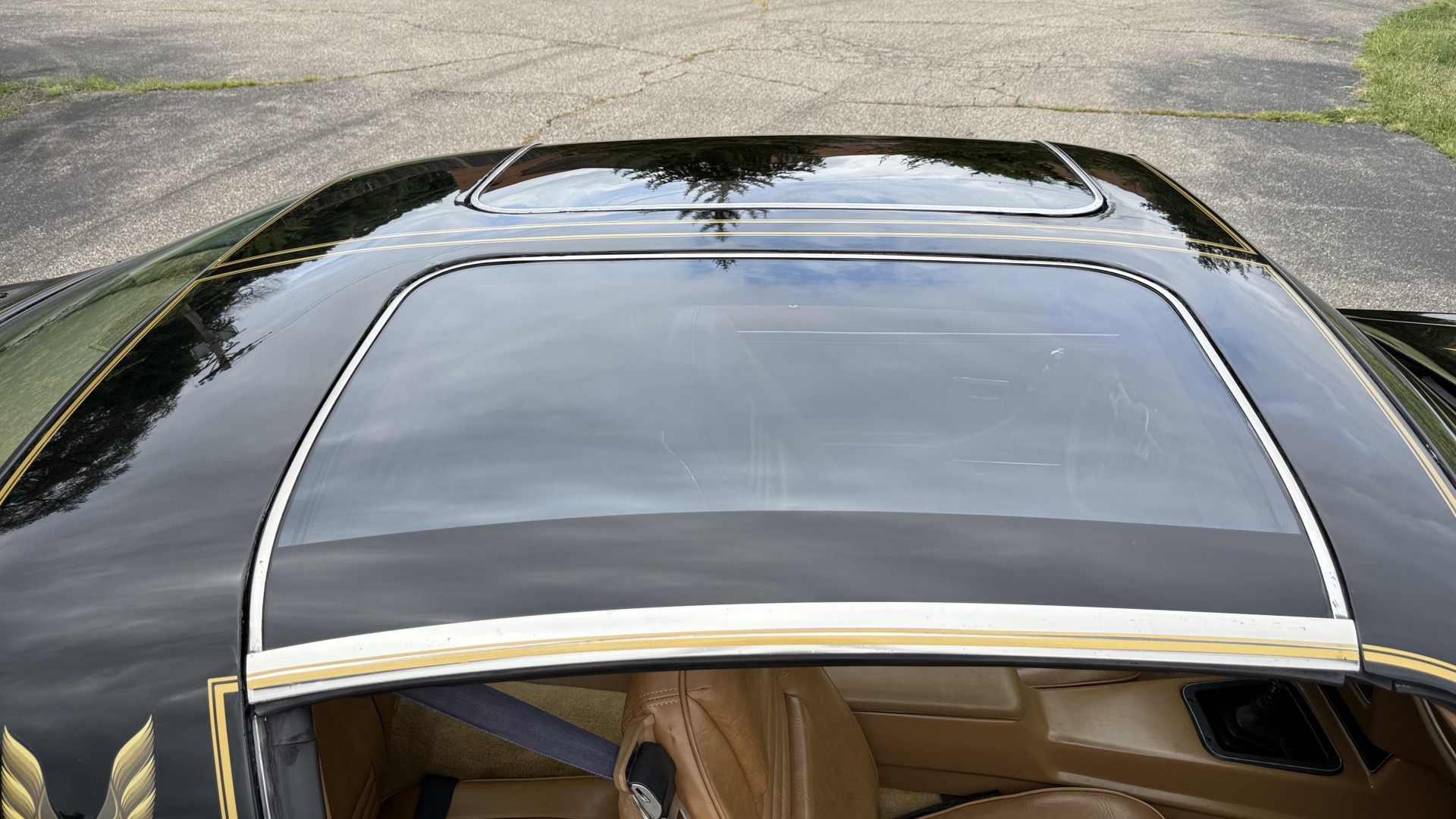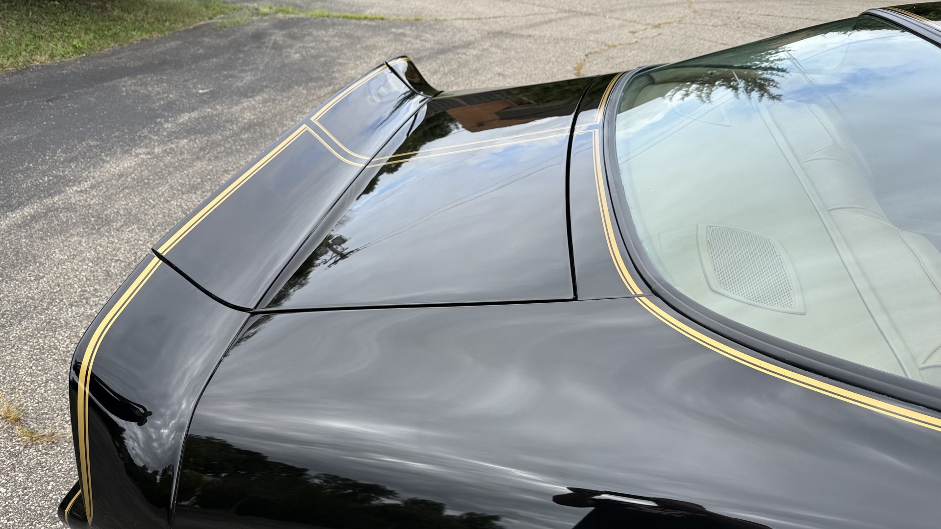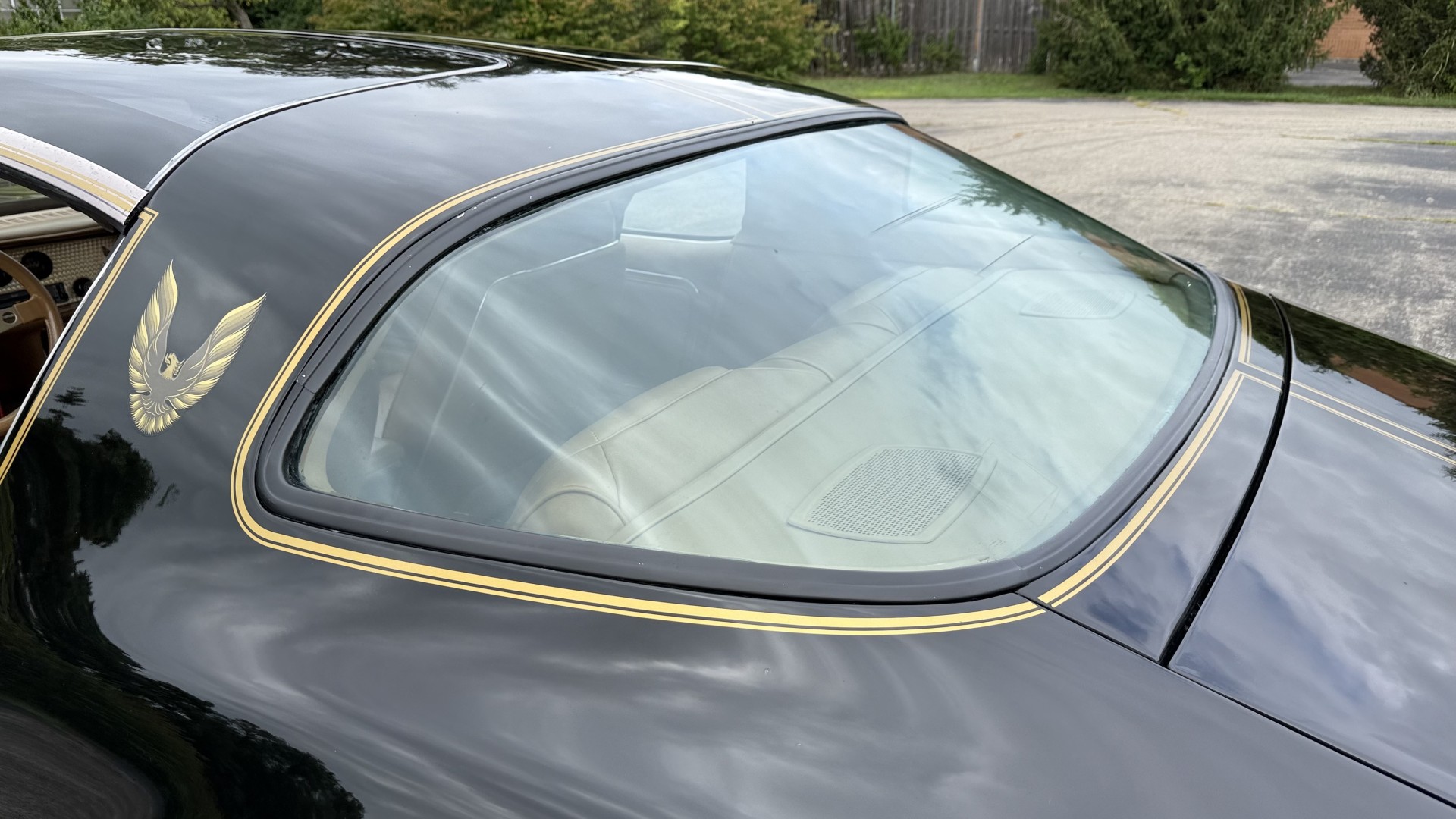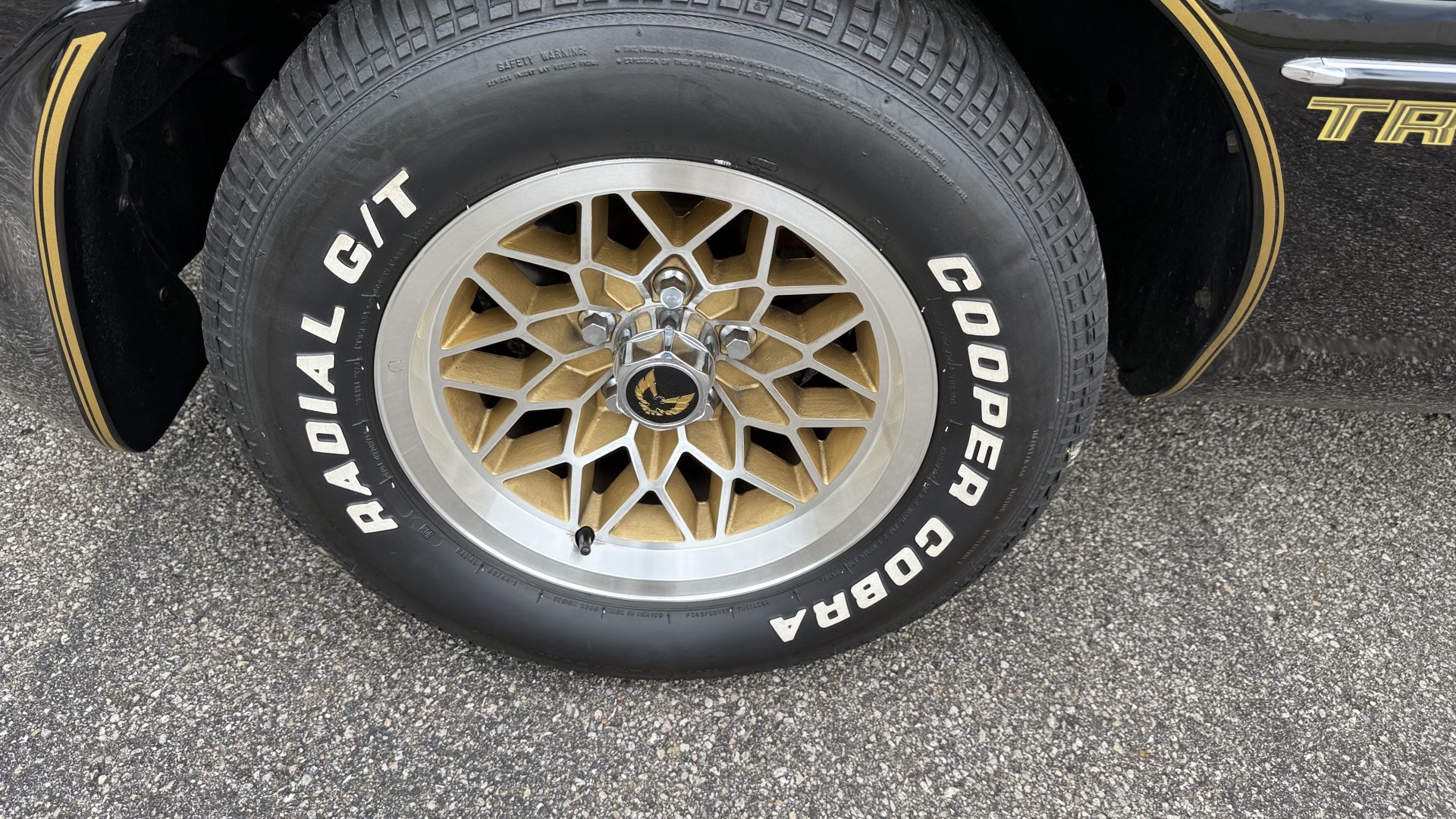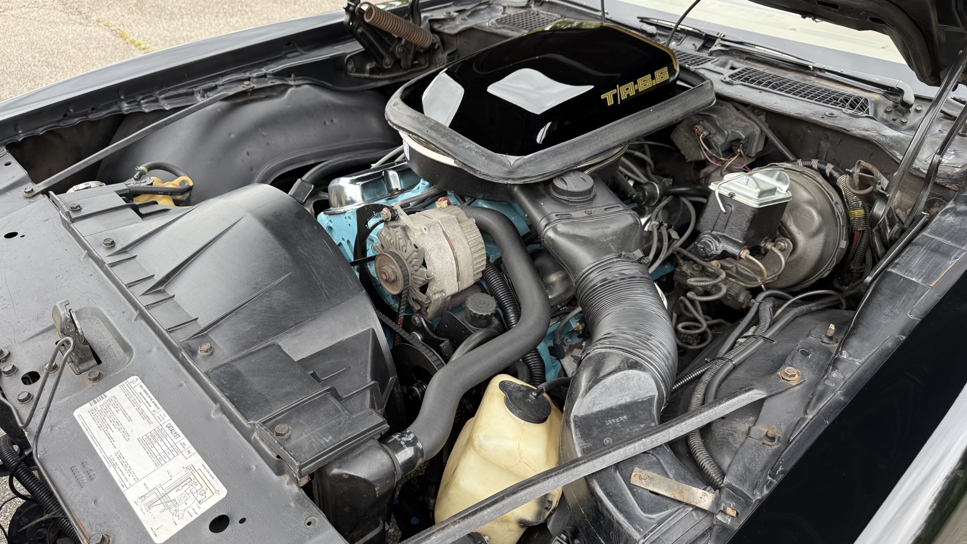 The Black exterior is in restored condition. This Trans Am features a repaint in factory starlight black with new decals and special edition pinstripes. The paint is in nice overall condition and has a great gloss and shine. There are no signs of visible rust anywhere on the body or underneath and both bumpers are in great shape. There is no bubbling paint or cracked paint due to body filler on this TA. There was no rust repair prior to the repaint as the body was in good rust free condition. The underside is very solid and honest and rust free. There may be some minor imperfections that are not noticeable in the photos, but nothing was intentionally excluded from the photos. The tires are like new and are sized 245/60/15 and the 8″ WS6 snowflake wheels are new wheels in great condition with new center caps and lug nuts. All weather stripping and window sweeps are in good shape. Trunk is clean with the original spare tire and jack and t top bags with an original style correct trunk mat. There is minor damage to the tail panel due to an improper attempt to jack up the car, but no rust in tail panel.