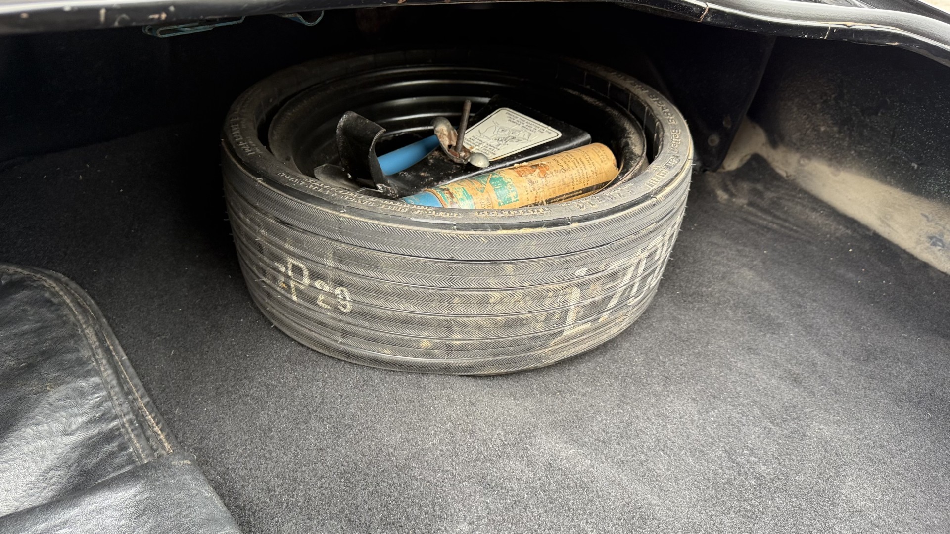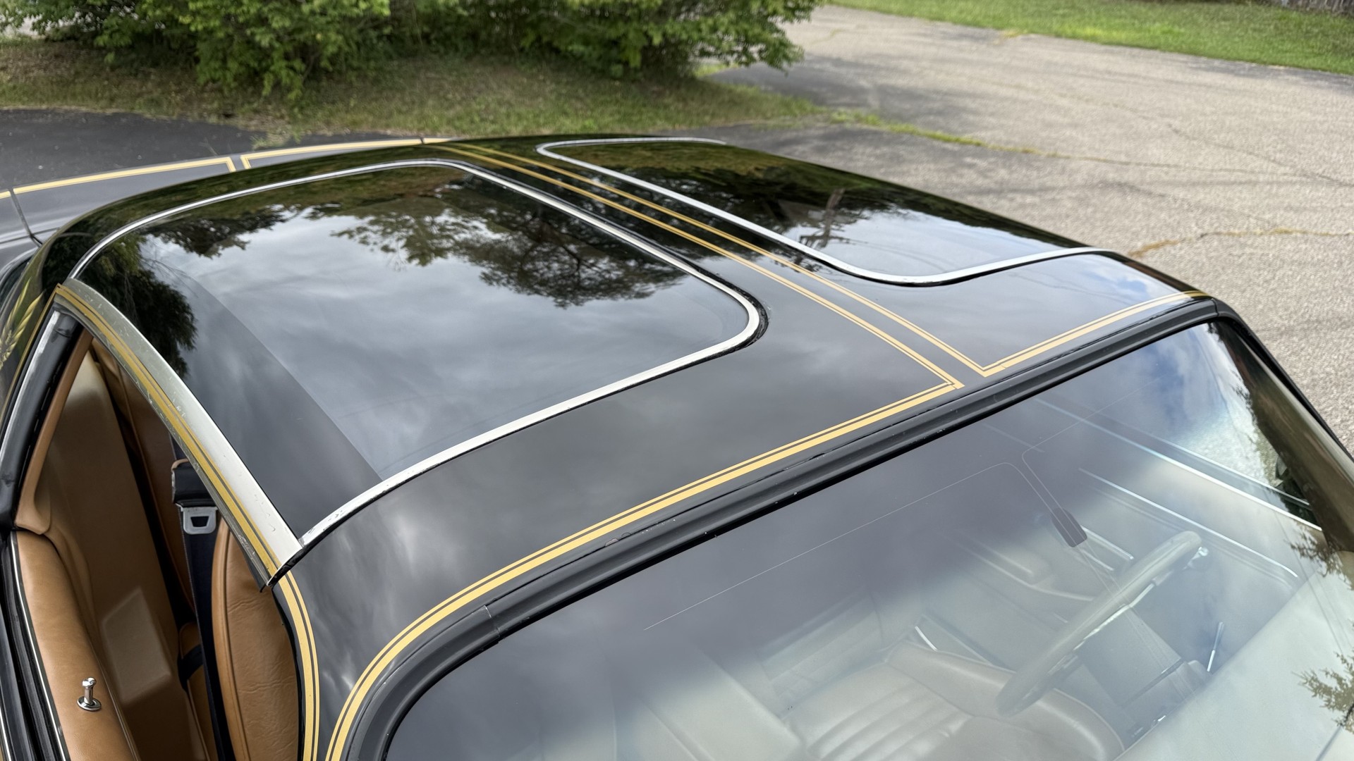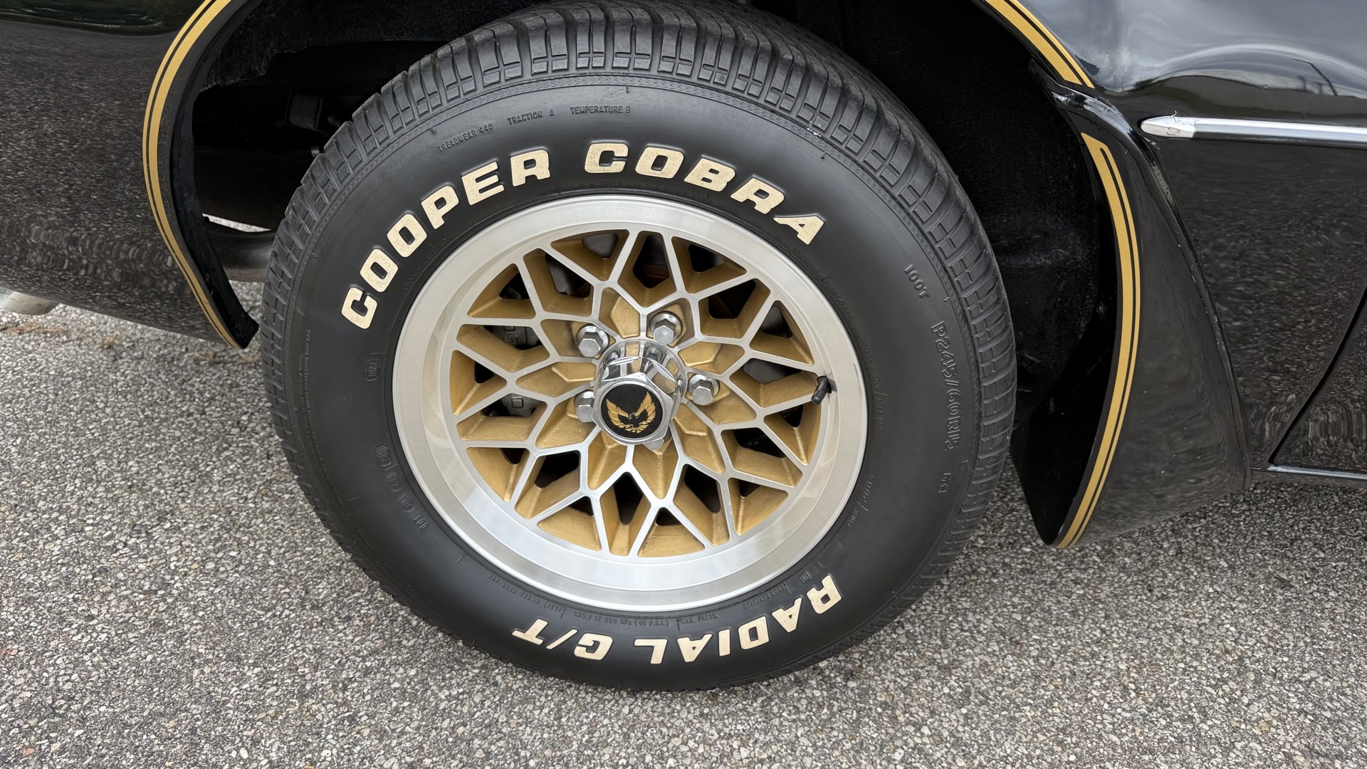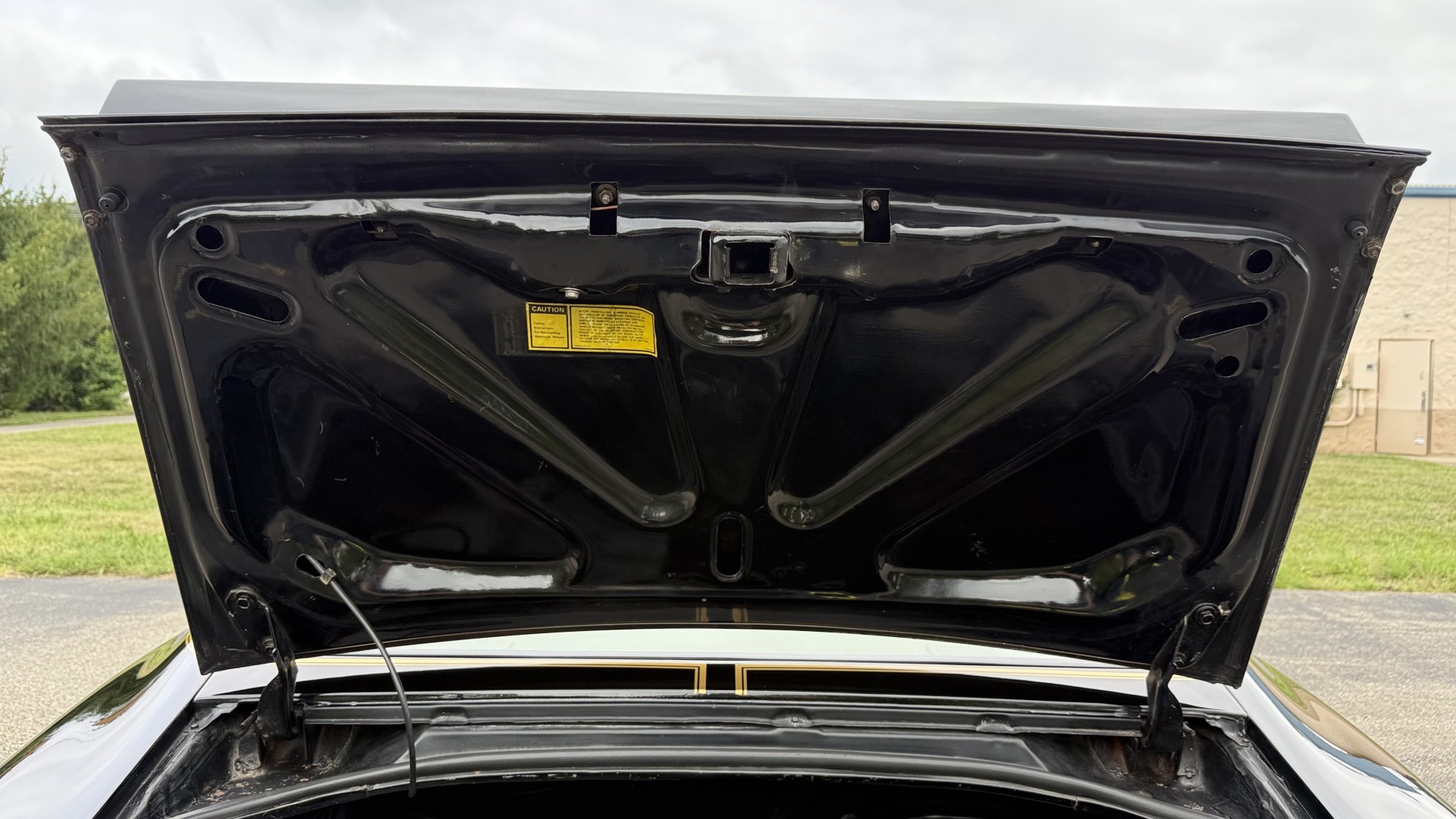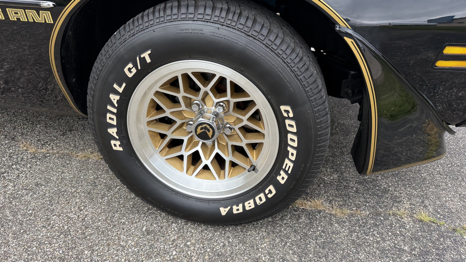 The Black exterior is in restored condition. This Trans Am features a repaint in factory starlight black with new decals and special edition pinstripes. The paint is in nice overall condition and has a great gloss and shine. There are no signs of visible rust anywhere on the body or underneath and both bumpers are in great shape. There is no bubbling paint or cracked paint due to body filler on this TA. There was no rust repair prior to the repaint as the body was in good rust free condition. The underside is very solid and honest and rust free. There may be some minor imperfections that are not noticeable in the photos, but nothing was intentionally excluded from the photos. The tires are like new and are sized 245/60/15 and the 8″ WS6 snowflake wheels are new wheels in great condition with new center caps and lug nuts. All weather stripping and window sweeps are in good shape. Trunk is clean with the original spare tire and jack and t top bags with an original style correct trunk mat. There is minor damage to the tail panel due to an improper attempt to jack up the car, but no rust in tail panel.