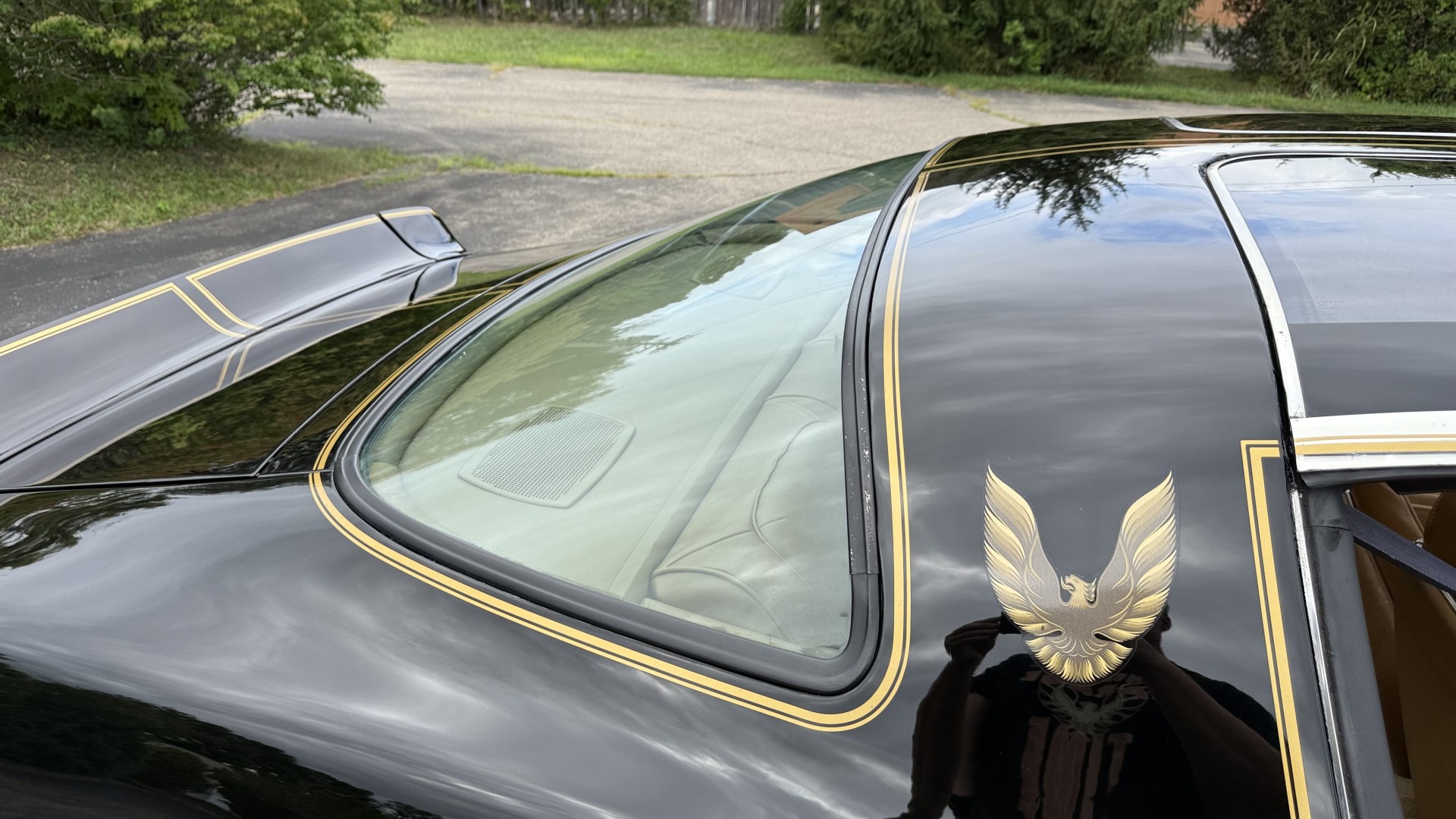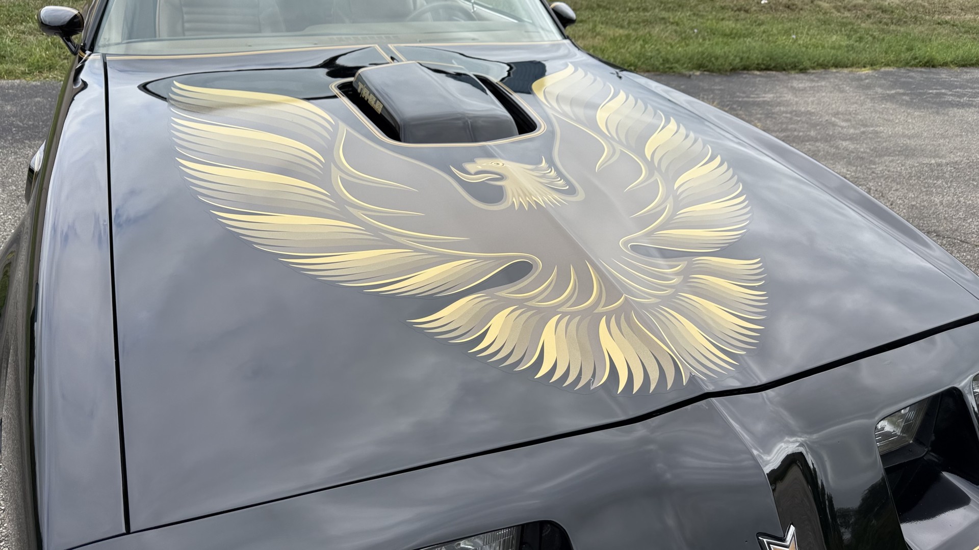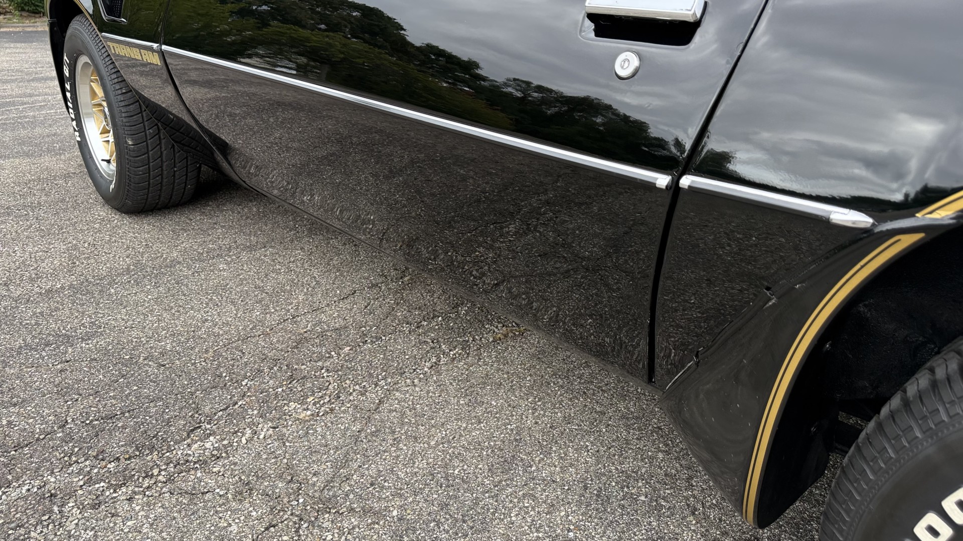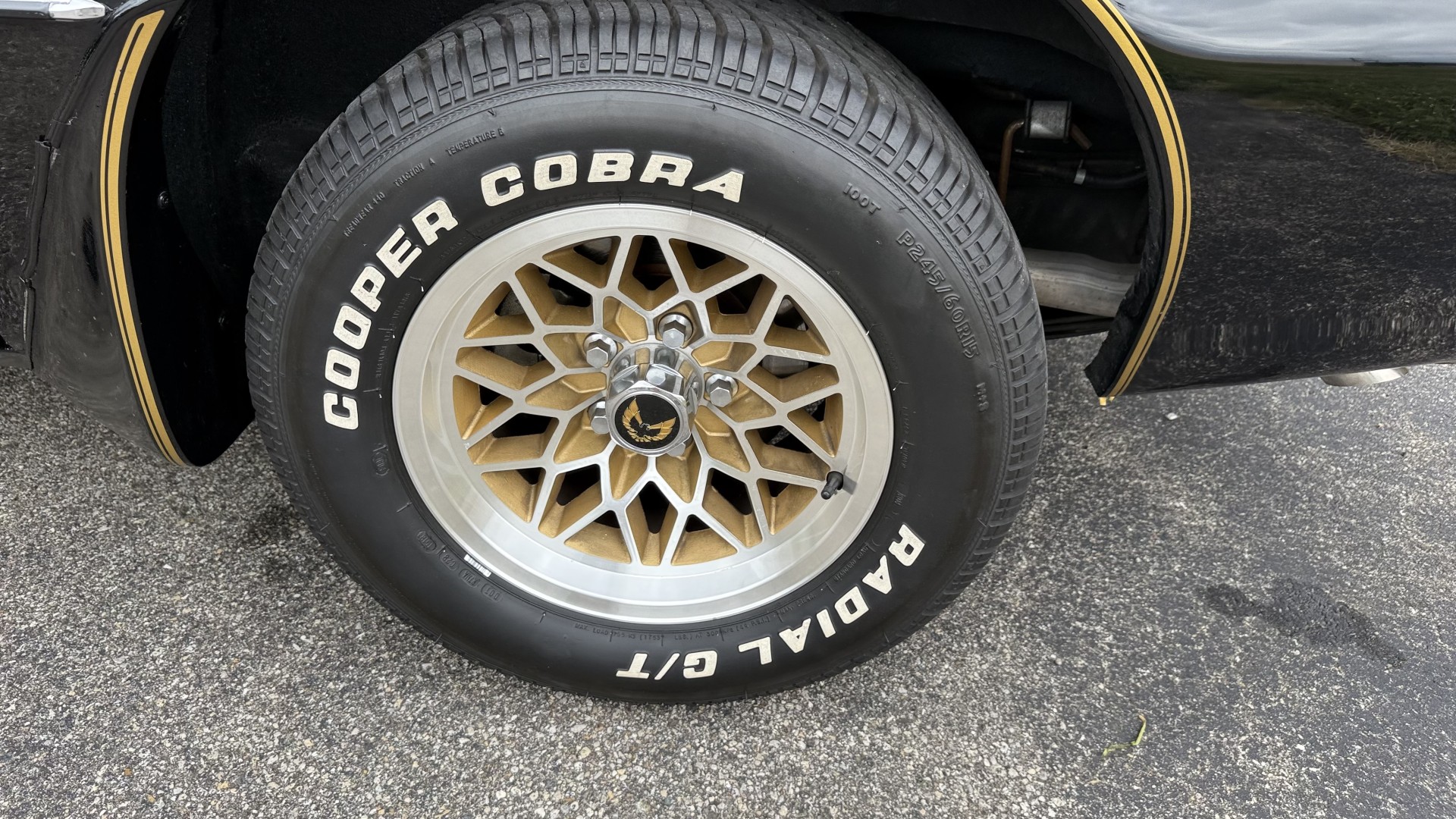 The Black exterior is in restored condition. This Trans Am features a repaint in factory starlight black with new decals and special edition pinstripes. The paint is in nice overall condition and has a great gloss and shine. There are no signs of visible rust anywhere on the body or underneath and both bumpers are in great shape. There is no bubbling paint or cracked paint due to body filler on this TA. There was no rust repair prior to the repaint as the body was in good rust free condition. The underside is very solid and honest and rust free. There may be some minor imperfections that are not noticeable in the photos, but nothing was intentionally excluded from the photos. The tires are like new and are sized 245/60/15 and the 8″ WS6 snowflake wheels are new wheels in great condition with new center caps and lug nuts. All weather stripping and window sweeps are in good shape. Trunk is clean with the original spare tire and jack and t top bags with an original style correct trunk mat. There is minor damage to the tail panel due to an improper attempt to jack up the car, but no rust in tail panel.