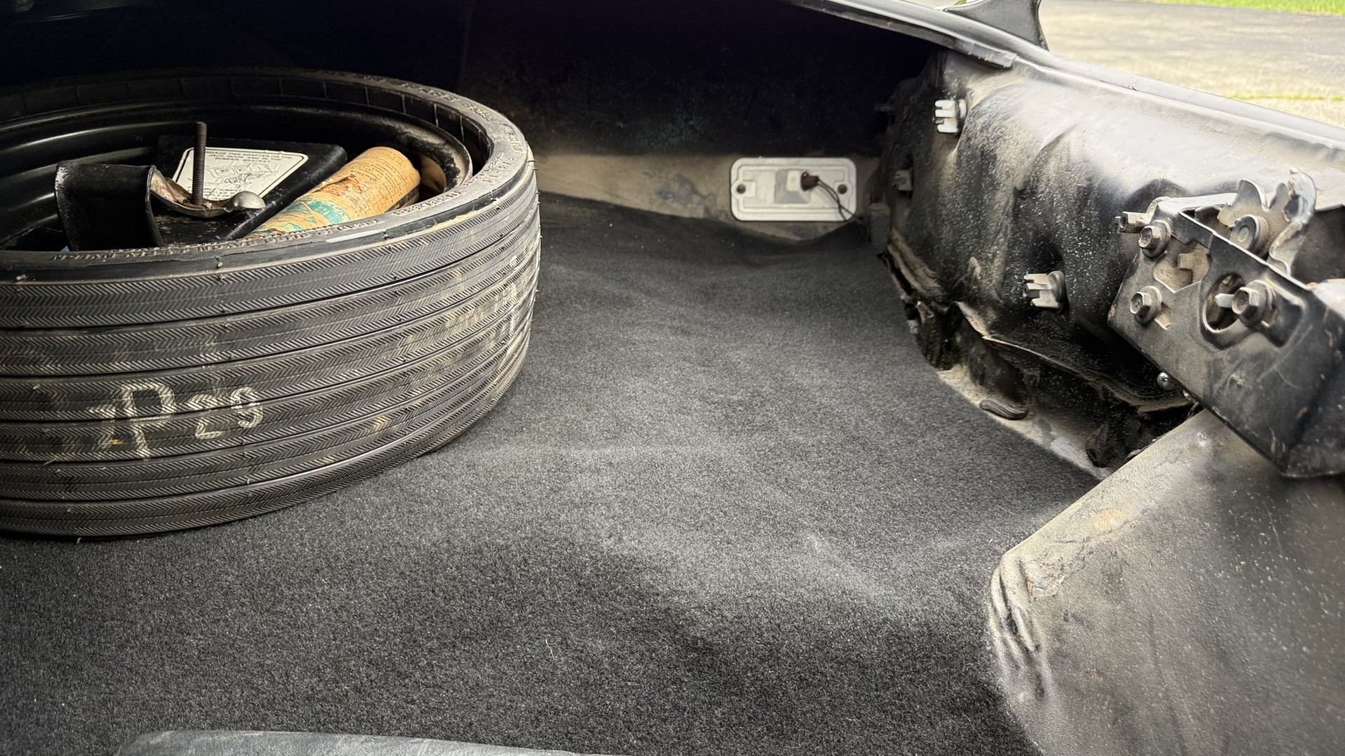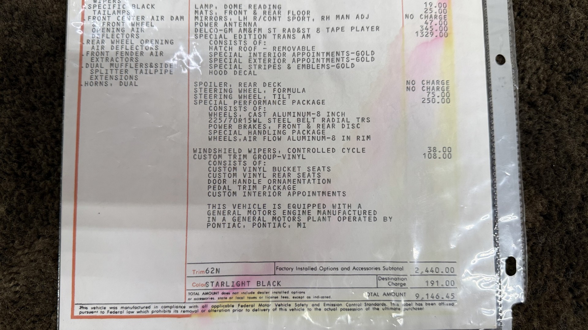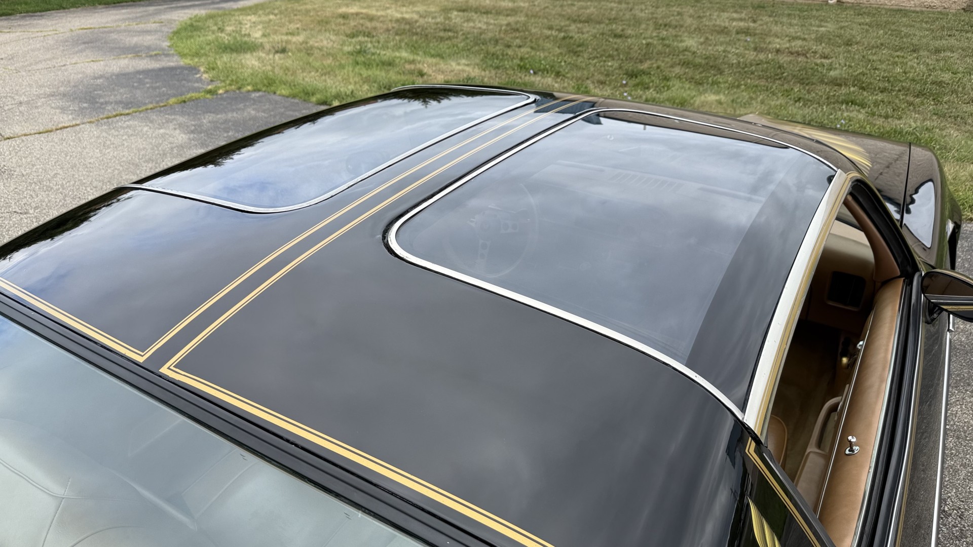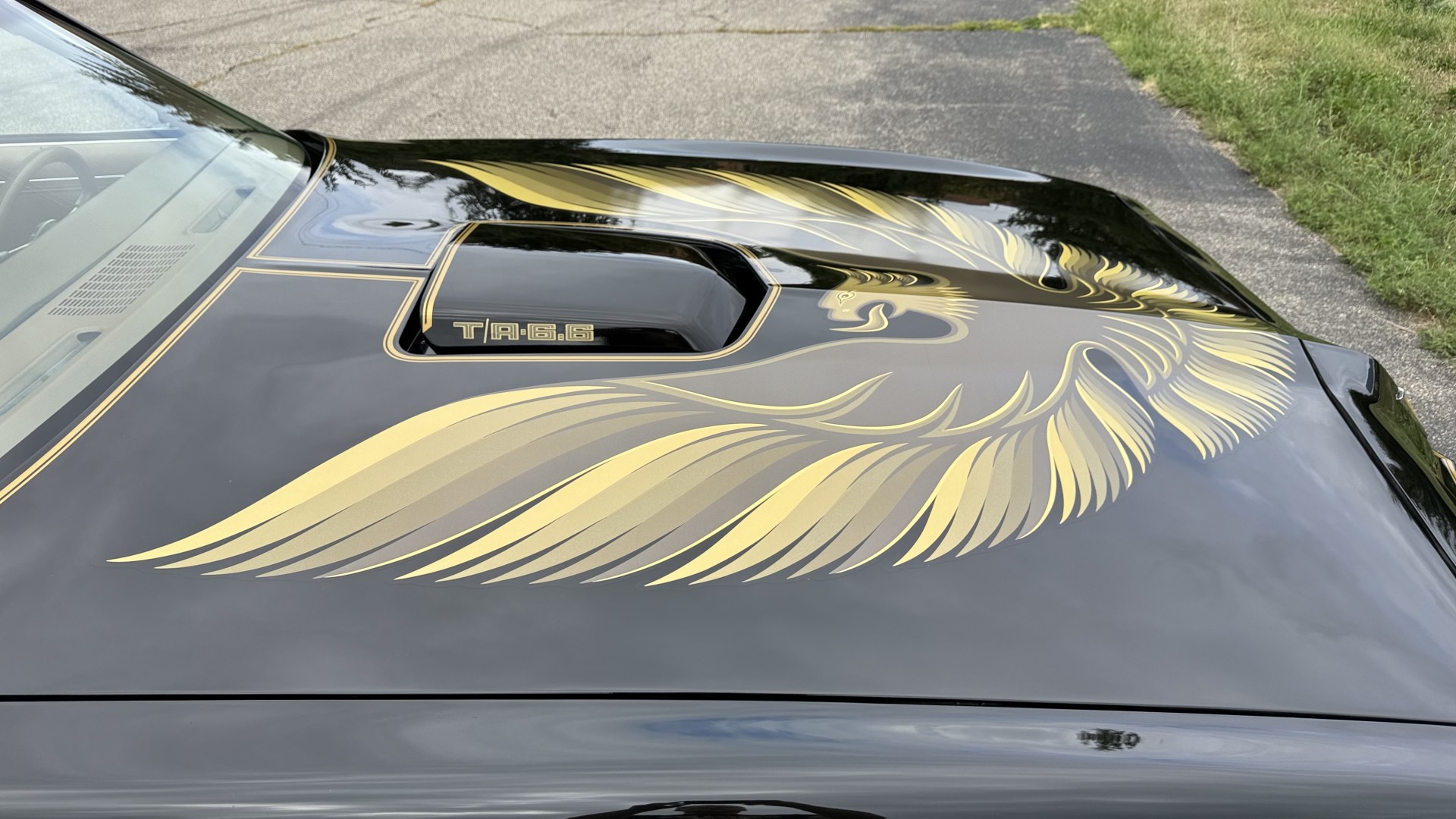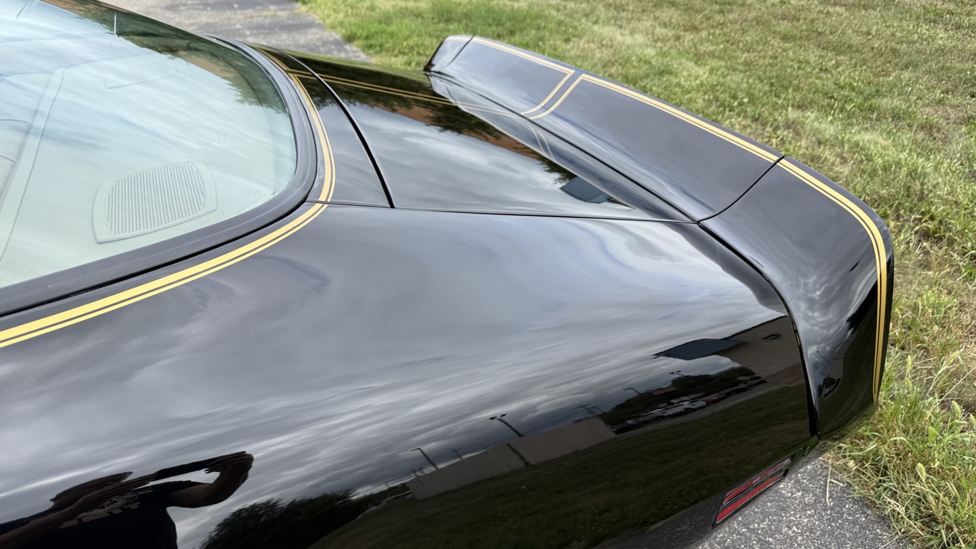 The Black exterior is in restored condition. This Trans Am features a repaint in factory starlight black with new decals and special edition pinstripes. The paint is in nice overall condition and has a great gloss and shine. There are no signs of visible rust anywhere on the body or underneath and both bumpers are in great shape. There is no bubbling paint or cracked paint due to body filler on this TA. There was no rust repair prior to the repaint as the body was in good rust free condition. The underside is very solid and honest and rust free. There may be some minor imperfections that are not noticeable in the photos, but nothing was intentionally excluded from the photos. The tires are like new and are sized 245/60/15 and the 8″ WS6 snowflake wheels are new wheels in great condition with new center caps and lug nuts. All weather stripping and window sweeps are in good shape. Trunk is clean with the original spare tire and jack and t top bags with an original style correct trunk mat. There is minor damage to the tail panel due to an improper attempt to jack up the car, but no rust in tail panel.