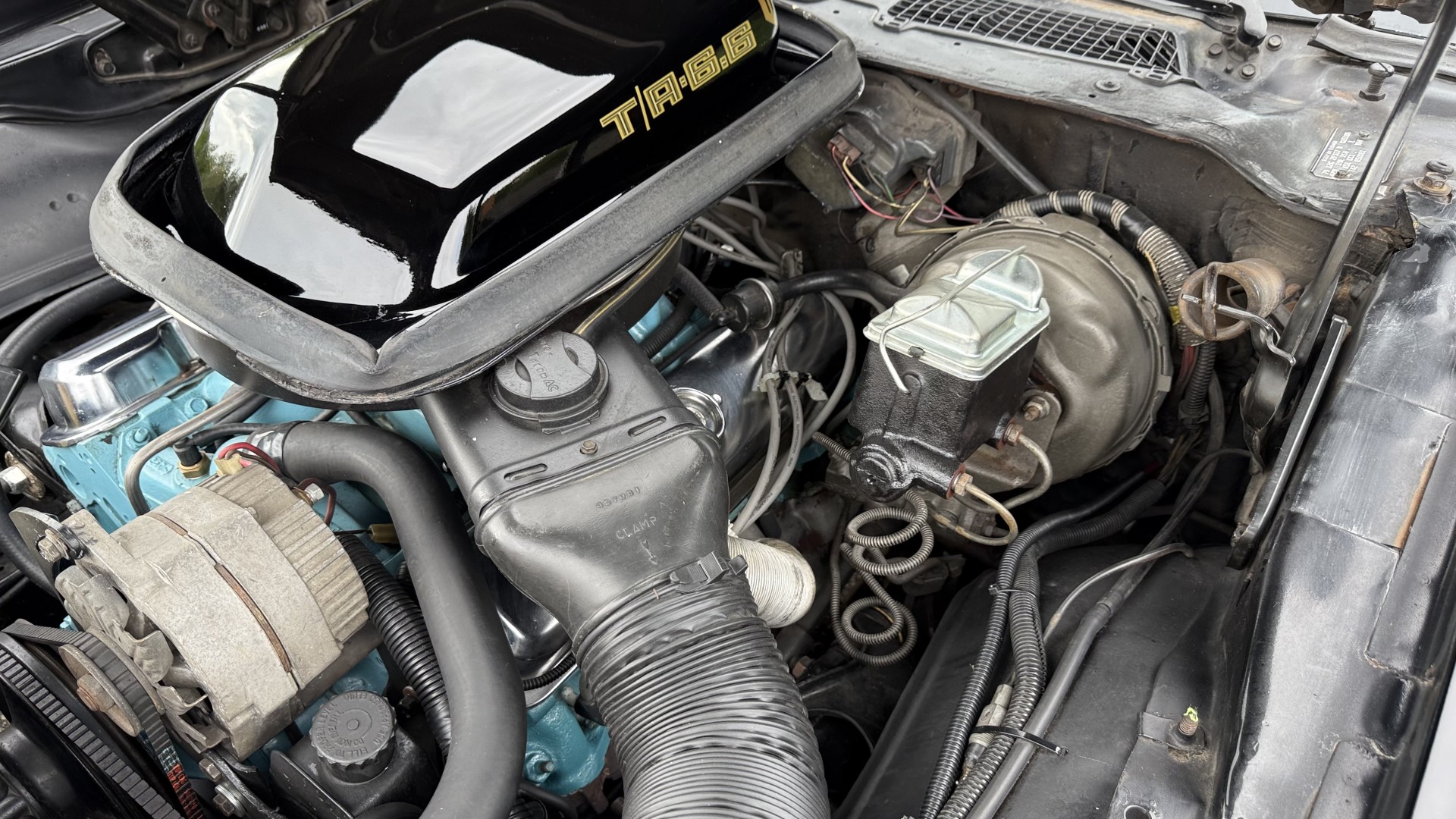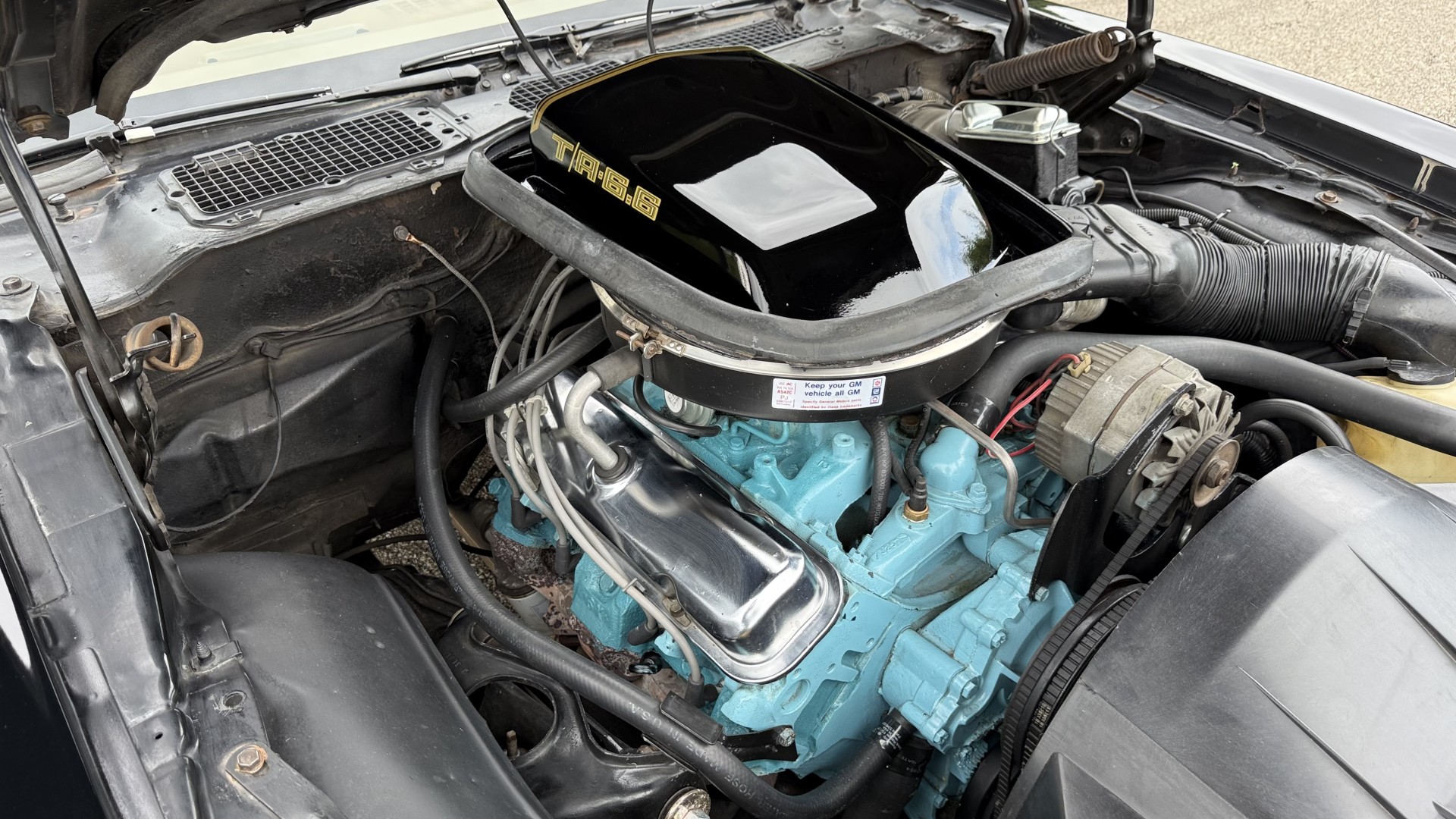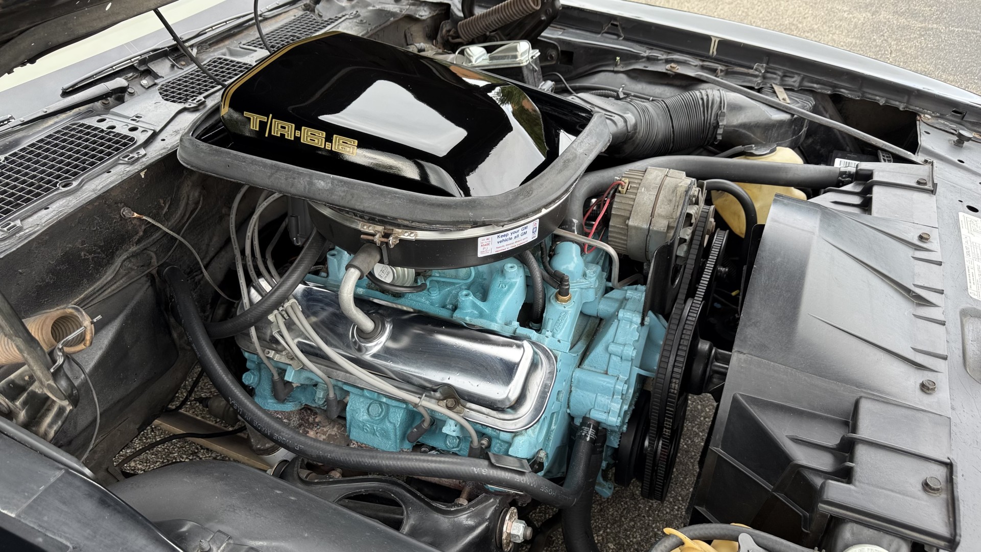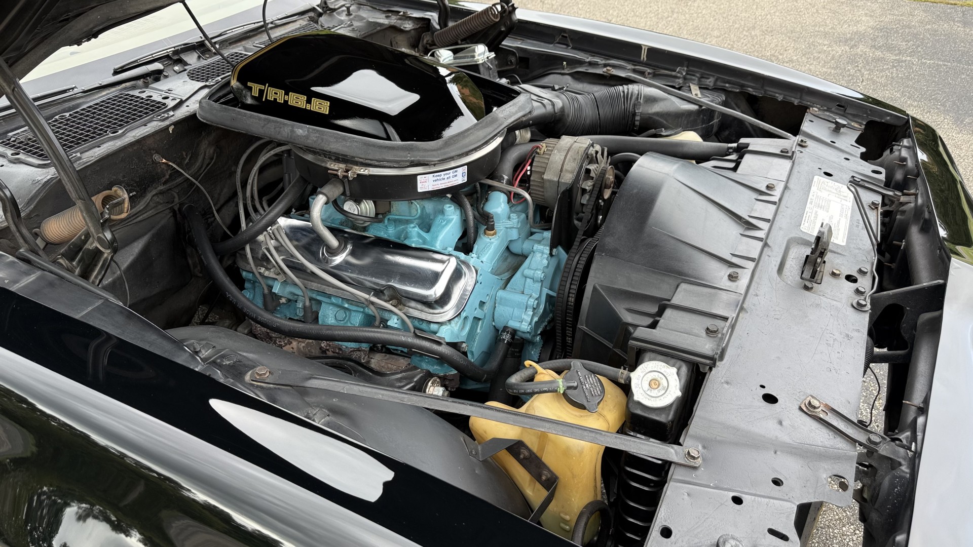 This Trans Am is in nice mechanical condition and runs and drives nicely. Most importantly the original Pontiac W72 400 engine is still in the car with matching numbers. The original 4 speed manual transmission is still in the car with matching numbers as well. A front new subframe was added and all front suspension parts were restored at that time. New shocks, new springs, new bushings, new steering box and linkage were all replaced. A new radiator was added with new hoses. 4 new shocks were added as well. New sway bar end links were installed. The exhaust was recently replaced with Magna Flow style mufflers which gives this TA a nice rumble at idle and cruising speeds. A new starter was just added. We have driven this car numerous times and it always performs well, it rides well, and is always a joy to drive. The smiles, thumbs up, and attention you get driving this car is addictive. There is no smoke when starting or driving the car. It starts right away every time, idles well, and runs good. The brakes do not pull and stop as they should and were serviced with new calipers and new master cylinder new pads and hoses. Also, the engine is very clean and nicely detailed as one can see from the photos. This is a factory NON AC car which really cleans up the engine bay and enhances performance.