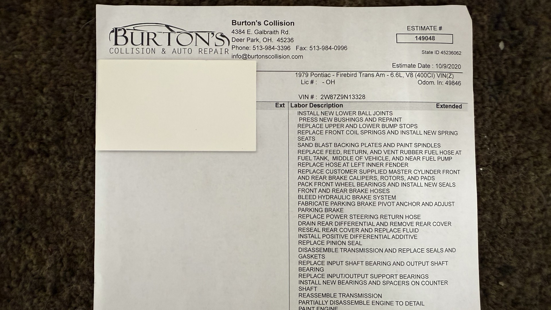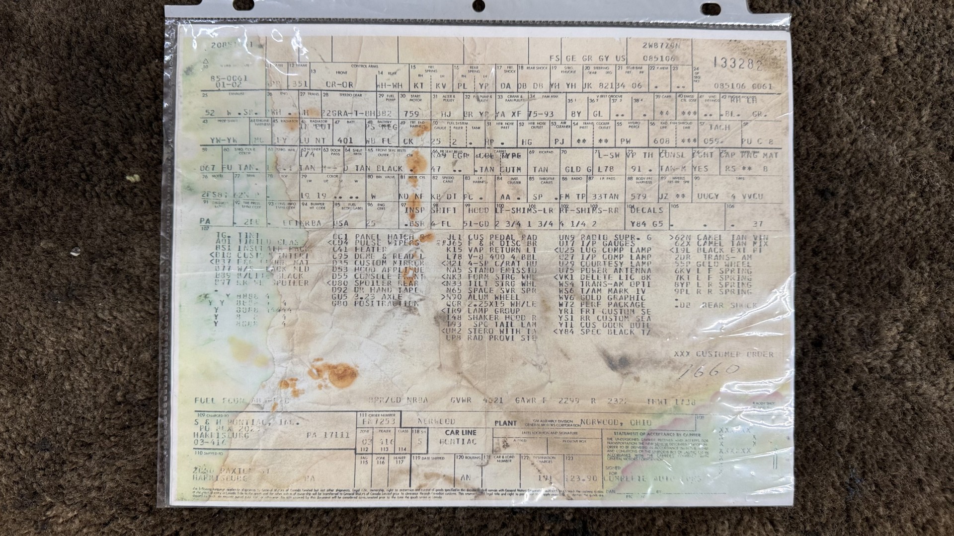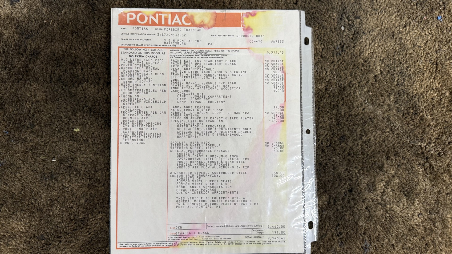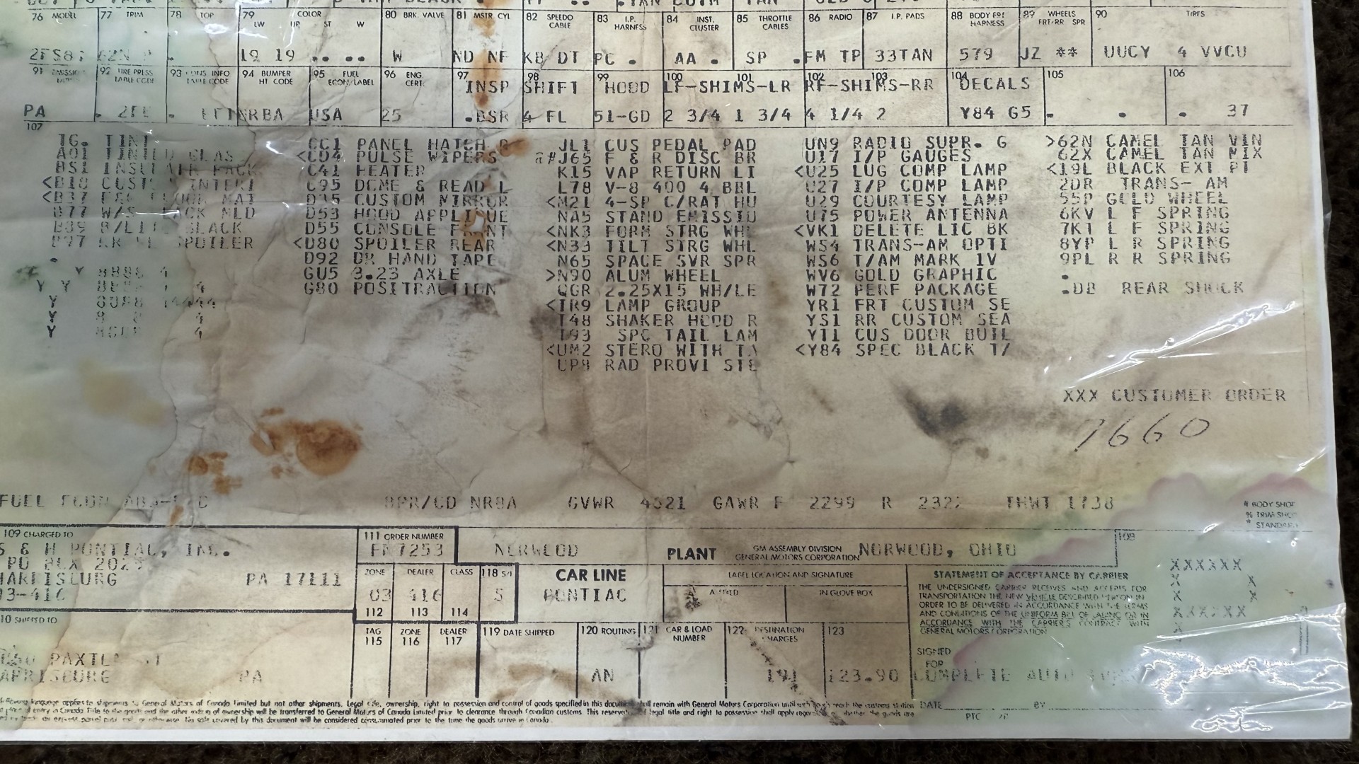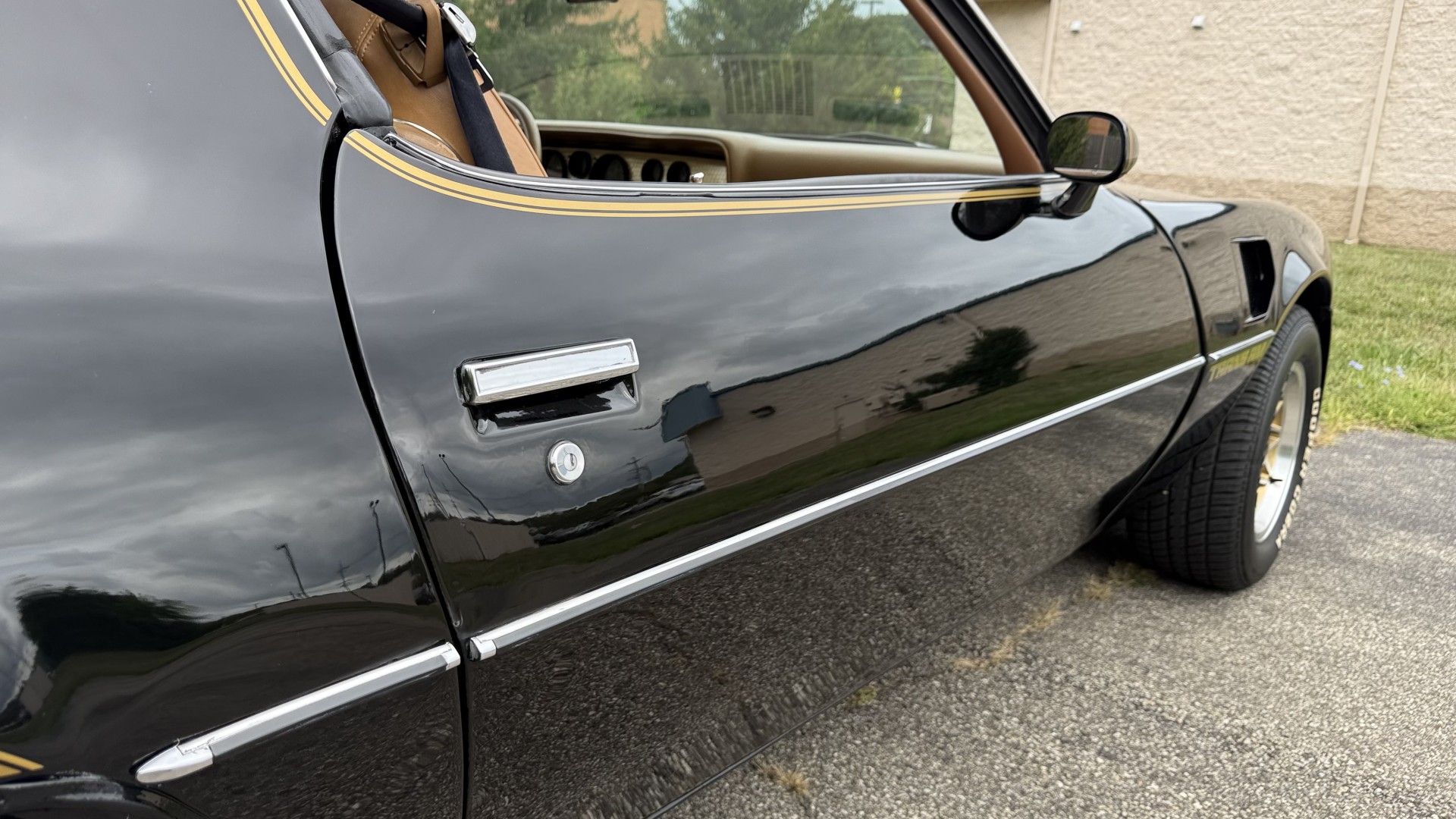 Cincy Classic Cars is proud to offer this stunning 1979 Pontiac TA which is a documented Factory Y84 Special Edition Trans AM. In 1979 Pontiac only made 1107 Special Edition Trans AM’s with a factory 4 speed manual transmission coupled with a Pontiac 400 engine, this TA is 1 of the 1107 made. Per the included PHS Report and Factory Build sheet this TA is a Factory 4 speed manual transmission TA with a Factory Pontiac 400 engine which is original to the car, see photos of vin stamp on block and “PWH” stamp on block. The transmission has a matching vin stamp as well meaning the engine and transmission are both original to the car which is extremely important when determining value. This TA is a factory Black car with Factory Camel Tan deluxe interior with factory gold SE pin stripes. This TA features a repaint with new decals and pin stripes completed 1/2020, a restored Camel deluxe vinyl interior, the original Pontiac 400 engine and 4 speed transmission, and PHS documents and Factory build sheet authenticating this special TA. This TA is finished in the most desirable color combination of Starlight Black exterior over Camel Tan vinyl interior. This is the factory color scheme as verified on the included build sheet and PHS documents and trim tag. These special low production 4 Speed Trans Am’s are some of the most sought after collectible TA’s on the market. They continue to increase in value and desirability. The front sub frame was replaced with a new one and the suspension parts, brakes, and steering system were all upgraded at that time to a cost of $18,000.