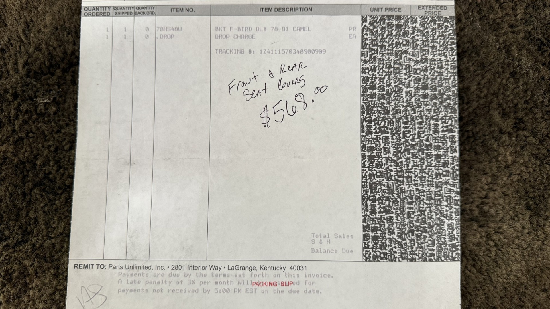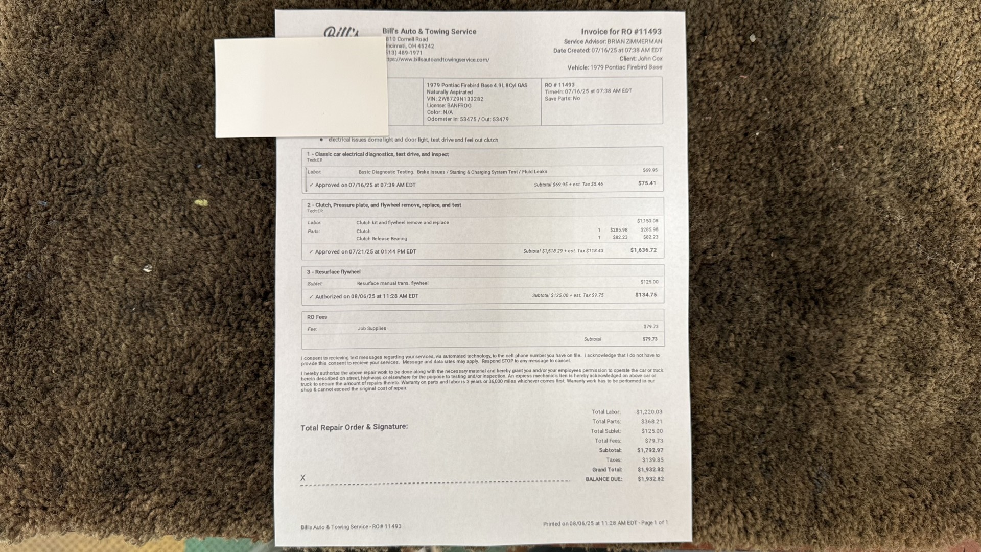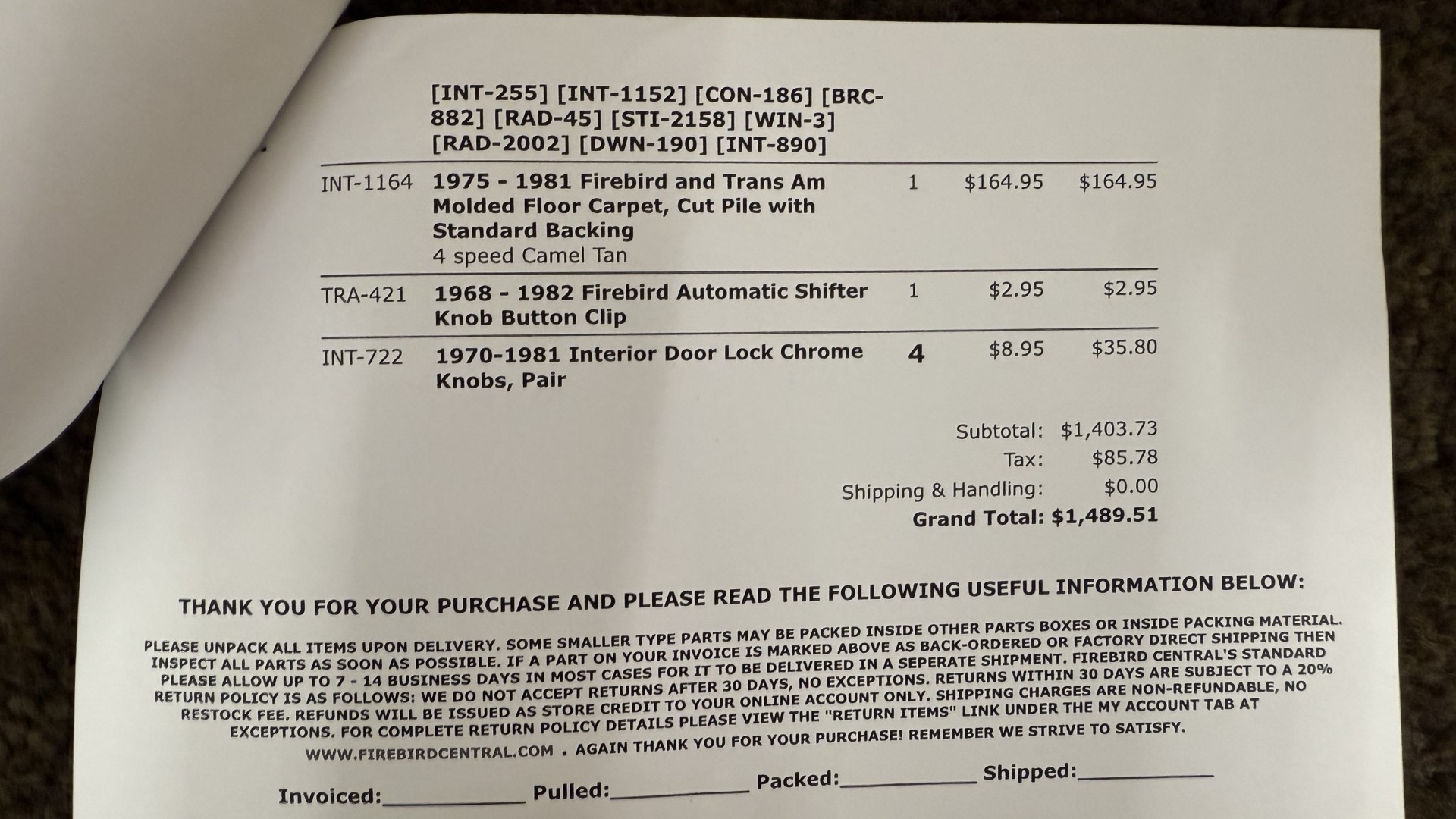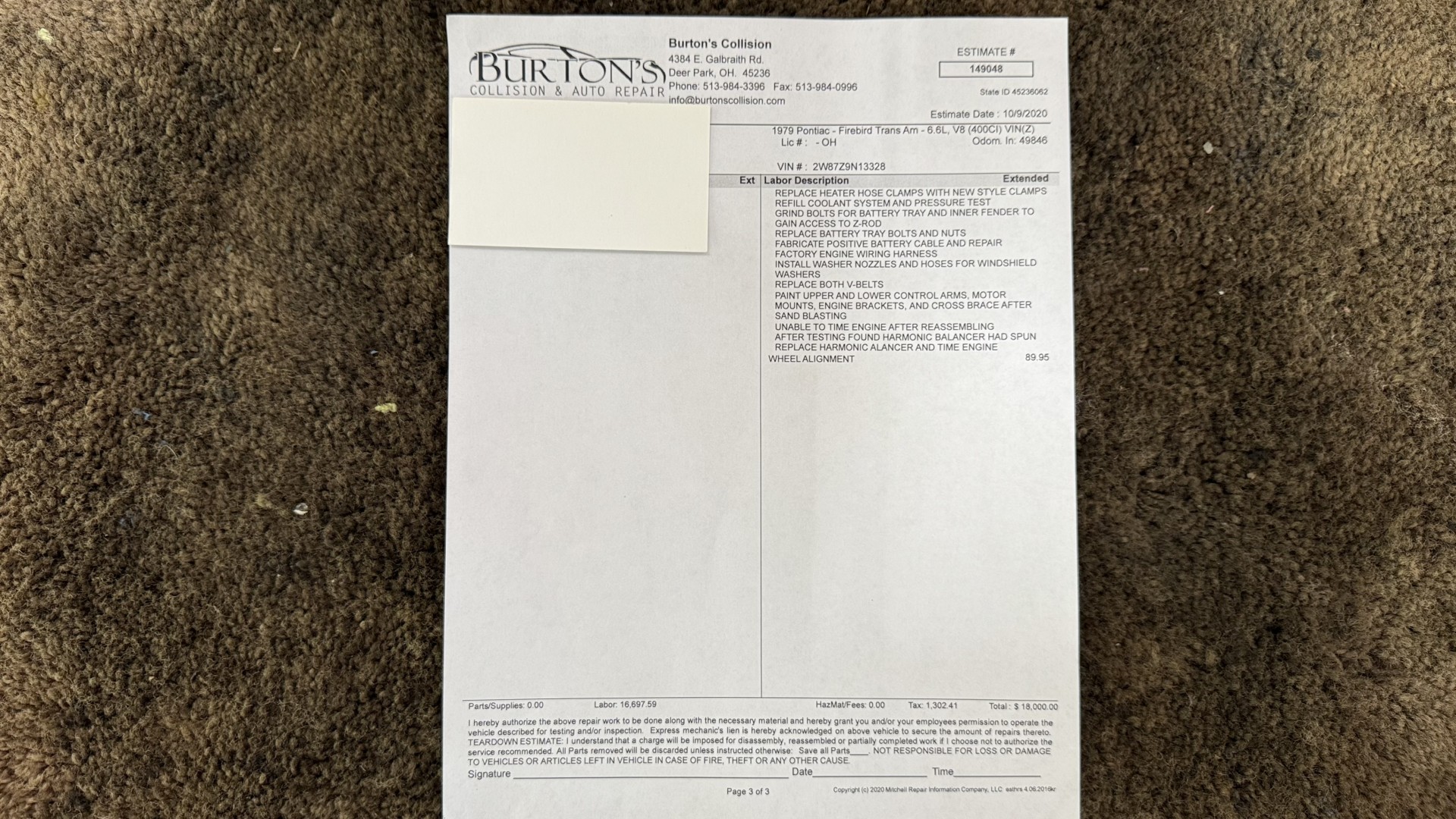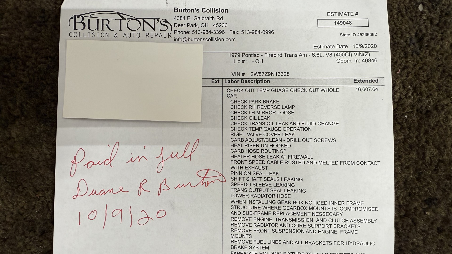 Cincy Classic Cars is proud to offer this stunning 1979 Pontiac TA which is a documented Factory Y84 Special Edition Trans AM. In 1979 Pontiac only made 1107 Special Edition Trans AM’s with a factory 4 speed manual transmission coupled with a Pontiac 400 engine, this TA is 1 of the 1107 made. Per the included PHS Report and Factory Build sheet this TA is a Factory 4 speed manual transmission TA with a Factory Pontiac 400 engine which is original to the car, see photos of vin stamp on block and “PWH” stamp on block. The transmission has a matching vin stamp as well meaning the engine and transmission are both original to the car which is extremely important when determining value. This TA is a factory Black car with Factory Camel Tan deluxe interior with factory gold SE pin stripes. This TA features a repaint with new decals and pin stripes completed 1/2020, a restored Camel deluxe vinyl interior, the original Pontiac 400 engine and 4 speed transmission, and PHS documents and Factory build sheet authenticating this special TA. This TA is finished in the most desirable color combination of Starlight Black exterior over Camel Tan vinyl interior. This is the factory color scheme as verified on the included build sheet and PHS documents and trim tag. These special low production 4 Speed Trans Am’s are some of the most sought after collectible TA’s on the market. They continue to increase in value and desirability. The front sub frame was replaced with a new one and the suspension parts, brakes, and steering system were all upgraded at that time to a cost of $18,000.