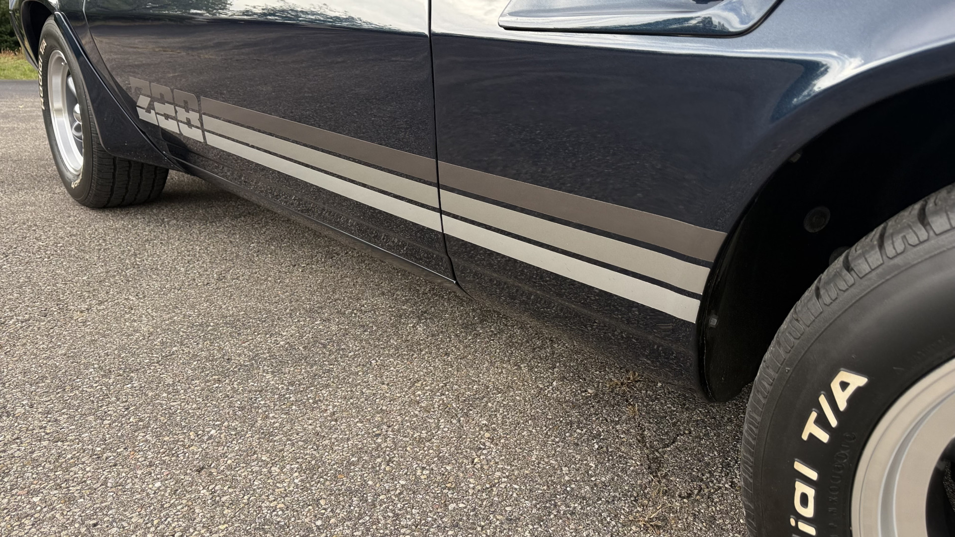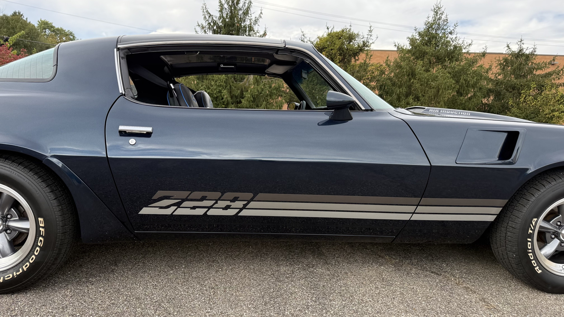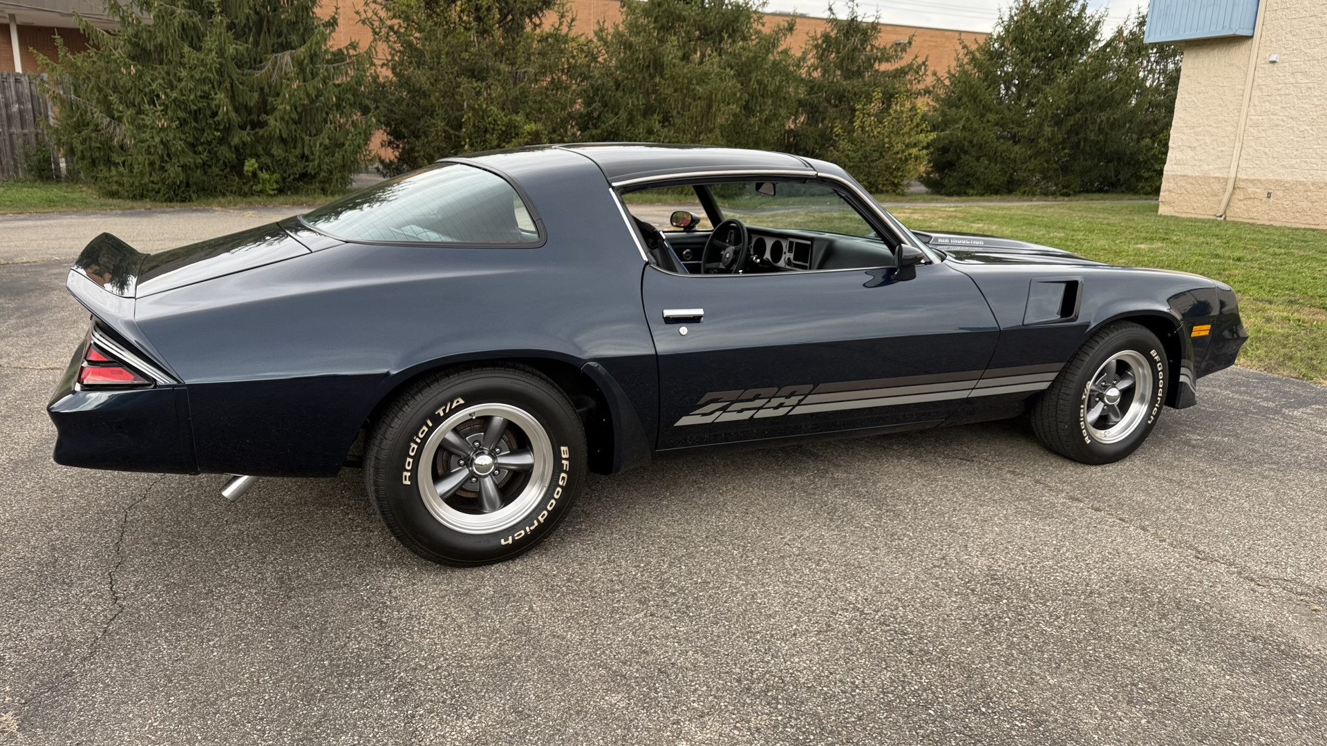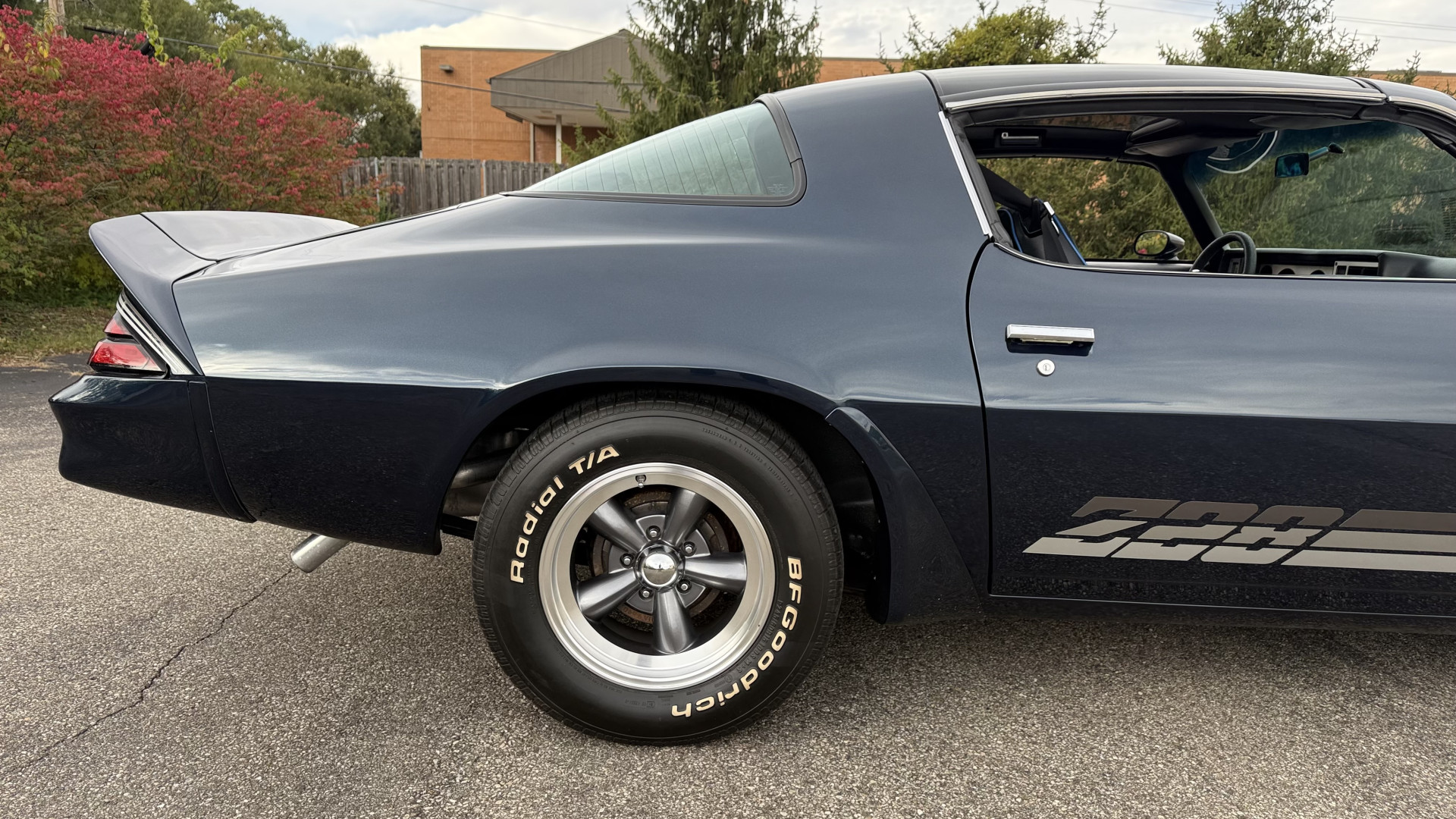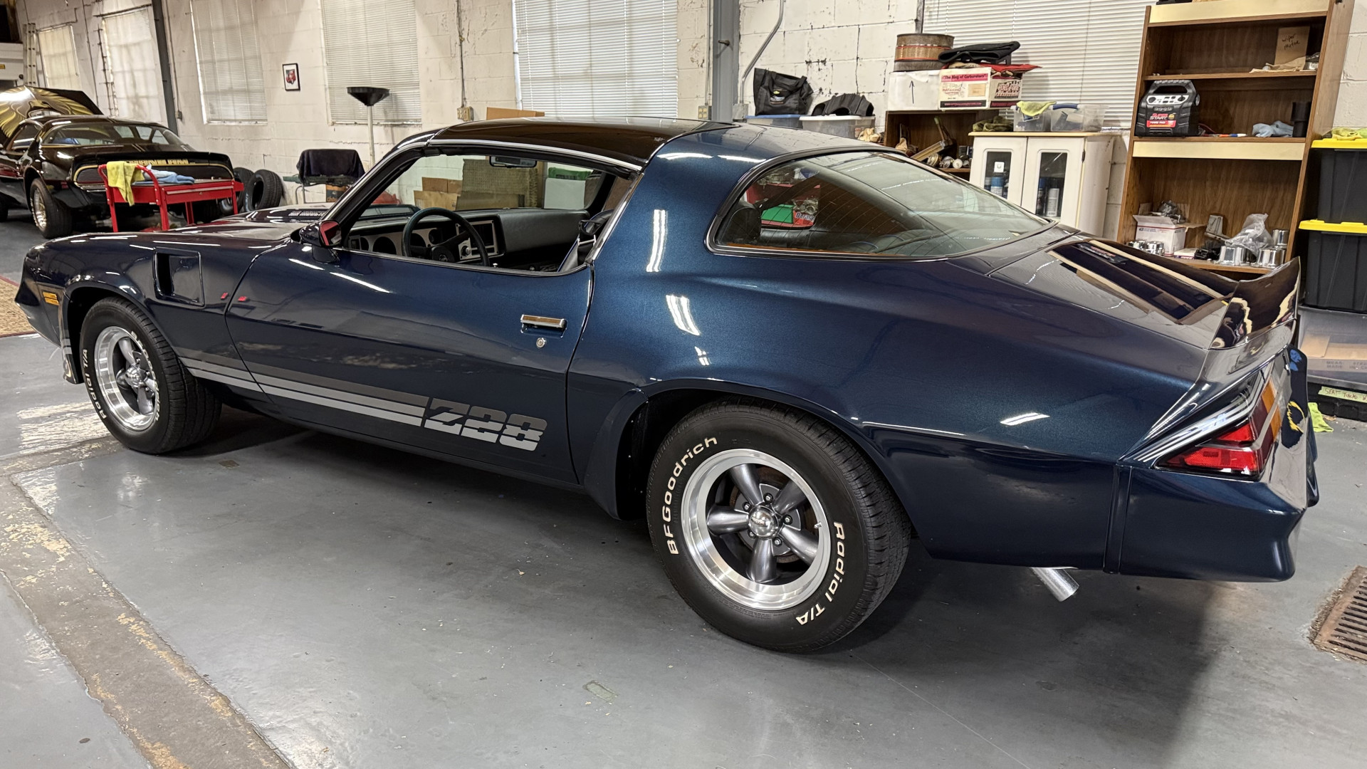 The Blue exterior is in superb restored condition. This Z28 was put on a rotisserie and treated to a professional repaint and the body and paint are in show condition. The paint quality is excellent with an excellent gloss and is smooth to the touch. The decals and trim all look new. The body is very solid and the gaps and lines are excellent. Both bumpers are in excellent shape with no flaking or faded paint and no spider webbing. The decals are new and in perfect shape and really accent the car and Z28 package. There is zero rust on this car and no bubbling paint or cracked paint or areas with heavy bondo or repairs. There may be some minor imperfections that are not noticeable in the photos, but nothing was intentionally excluded from the photos. The BF Goodrich tires have great tread left and the aftermarket wheels look excellent on the car and are like new. All weather stripping and window sweeps are in excellent new condition. The door seals, trunk seal, window sweeps, and window seals are all newer. Trunk is very solid and clean with the spare tire, trunk mat, and jack and tools. A power sub woofer and new 6×9 speakers were installed.