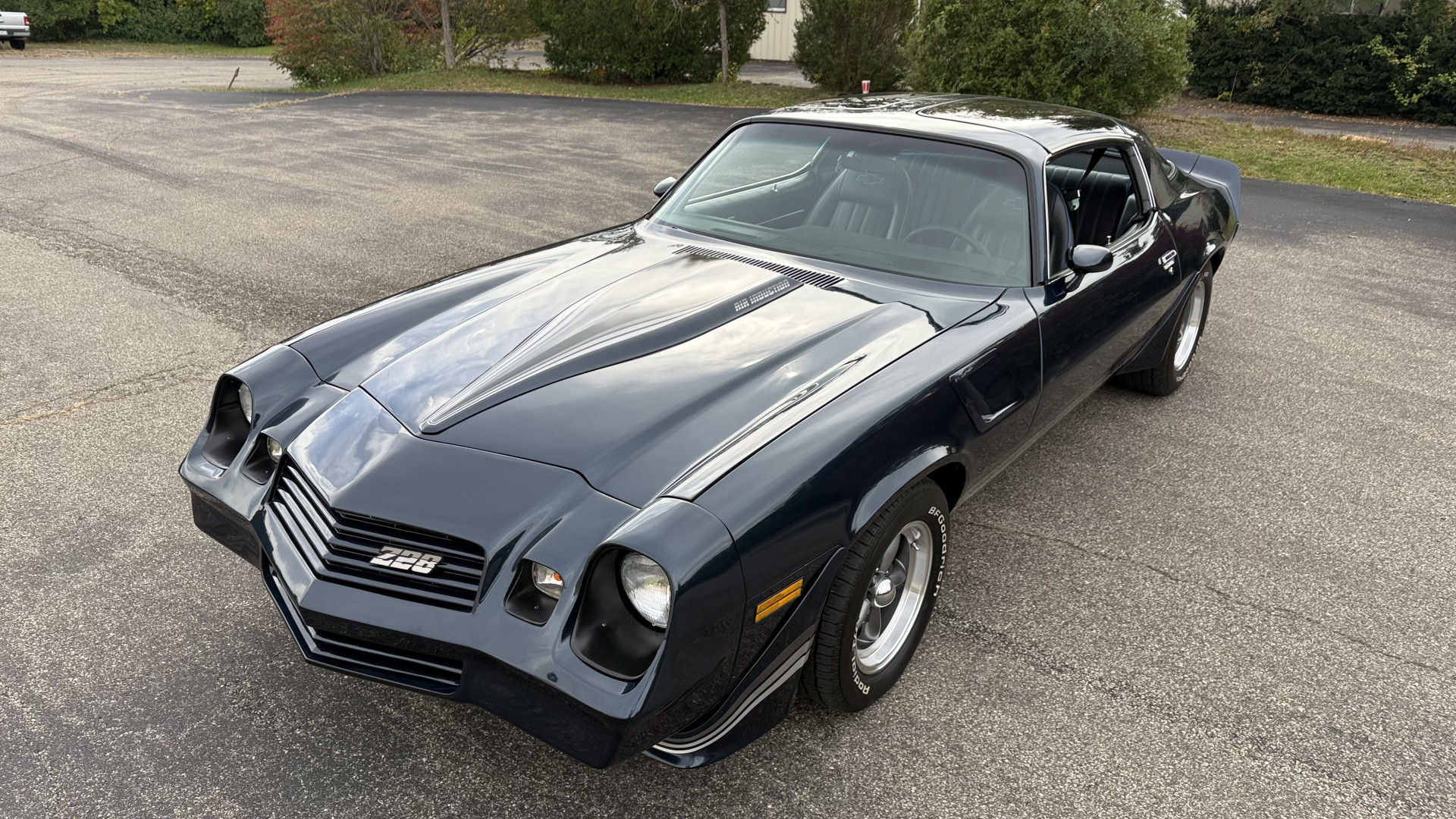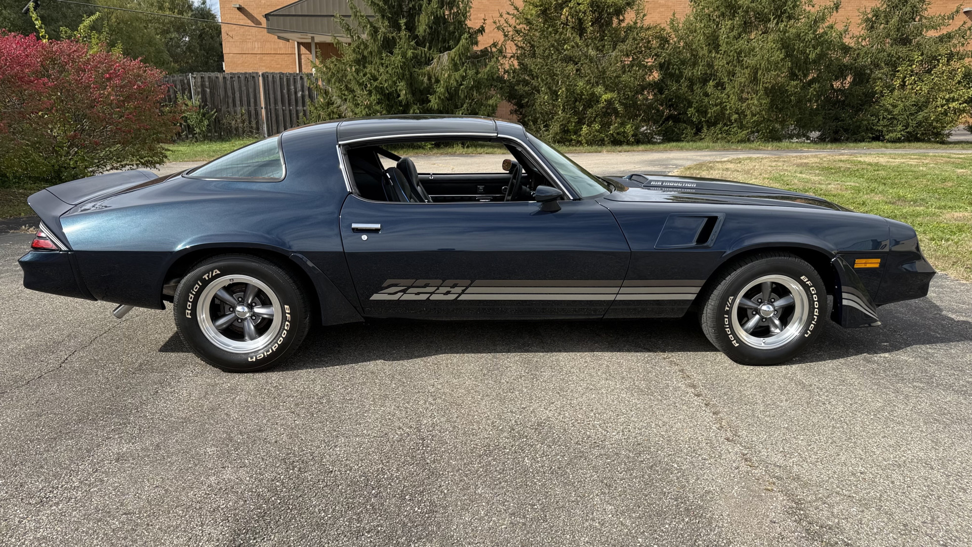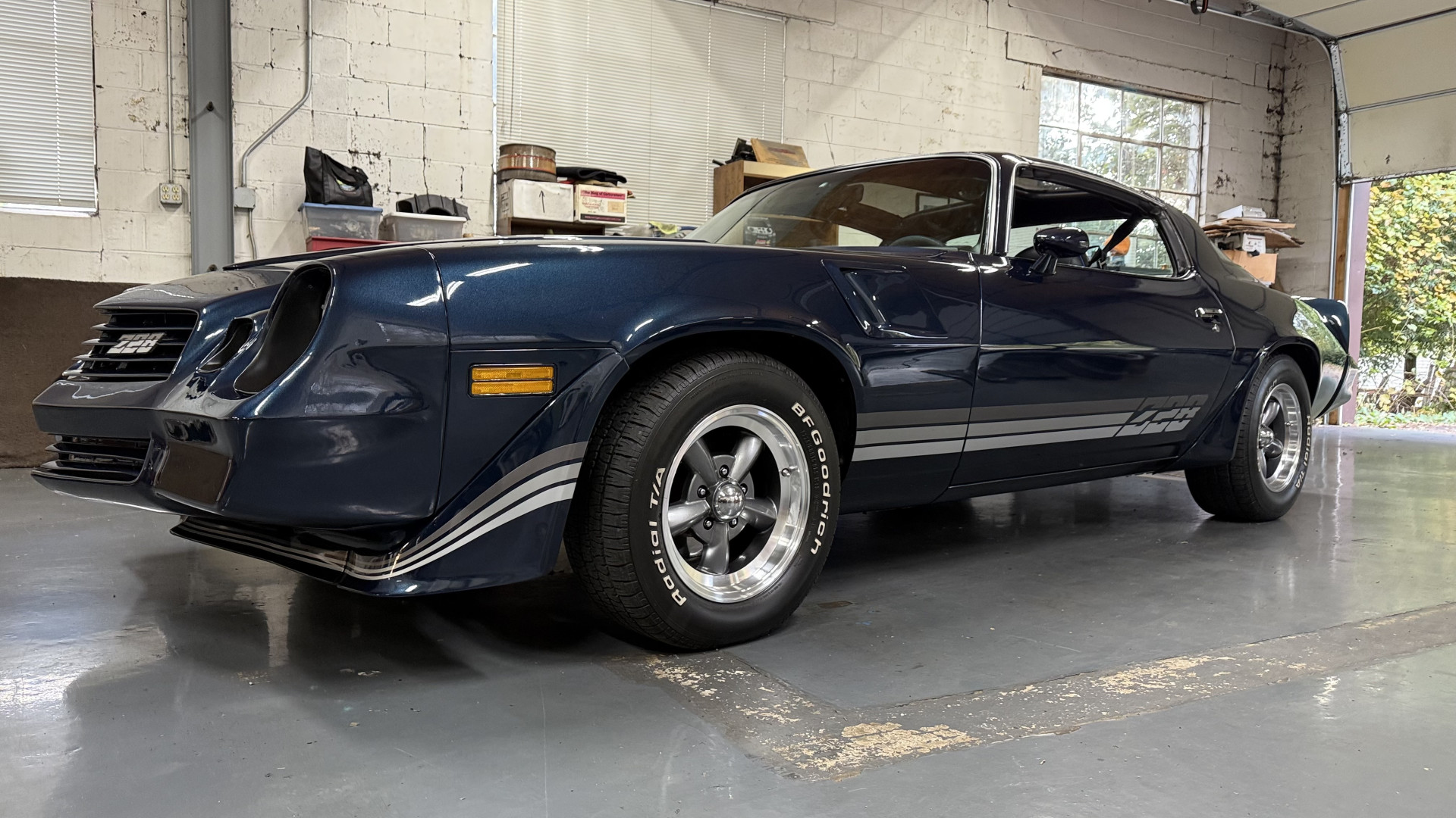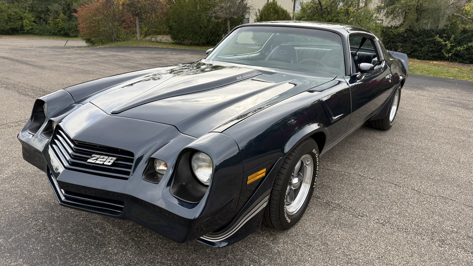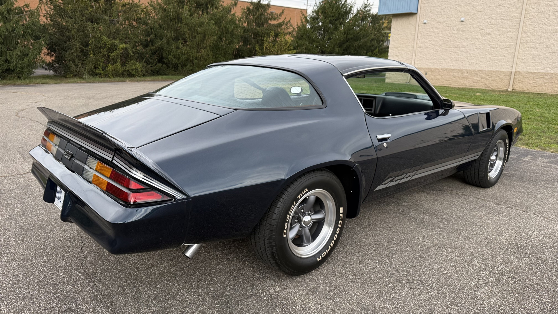 The Blue exterior is in superb restored condition. This Z28 was put on a rotisserie and treated to a professional repaint and the body and paint are in show condition. The paint quality is excellent with an excellent gloss and is smooth to the touch. The decals and trim all look new. The body is very solid and the gaps and lines are excellent. Both bumpers are in excellent shape with no flaking or faded paint and no spider webbing. The decals are new and in perfect shape and really accent the car and Z28 package. There is zero rust on this car and no bubbling paint or cracked paint or areas with heavy bondo or repairs. There may be some minor imperfections that are not noticeable in the photos, but nothing was intentionally excluded from the photos. The BF Goodrich tires have great tread left and the aftermarket wheels look excellent on the car and are like new. All weather stripping and window sweeps are in excellent new condition. The door seals, trunk seal, window sweeps, and window seals are all newer. Trunk is very solid and clean with the spare tire, trunk mat, and jack and tools. A power sub woofer and new 6×9 speakers were installed.