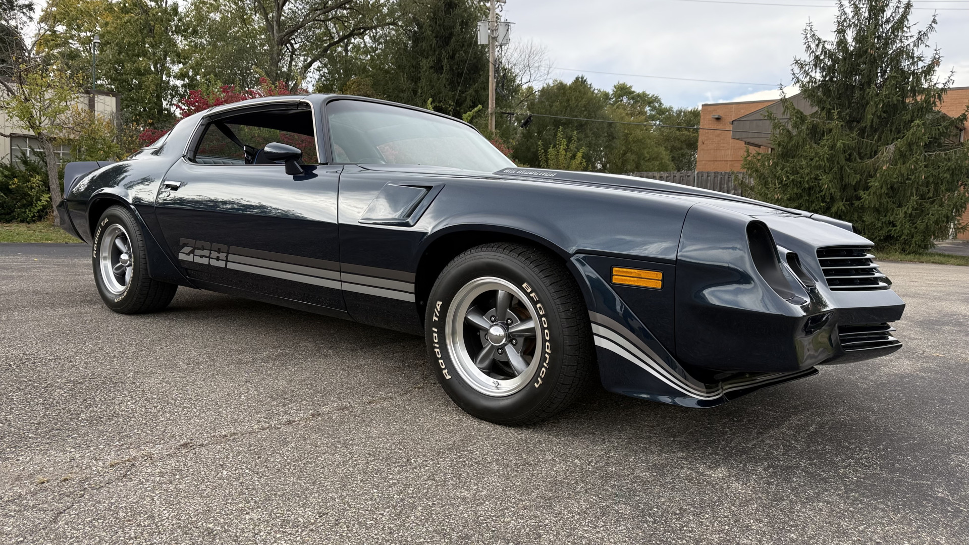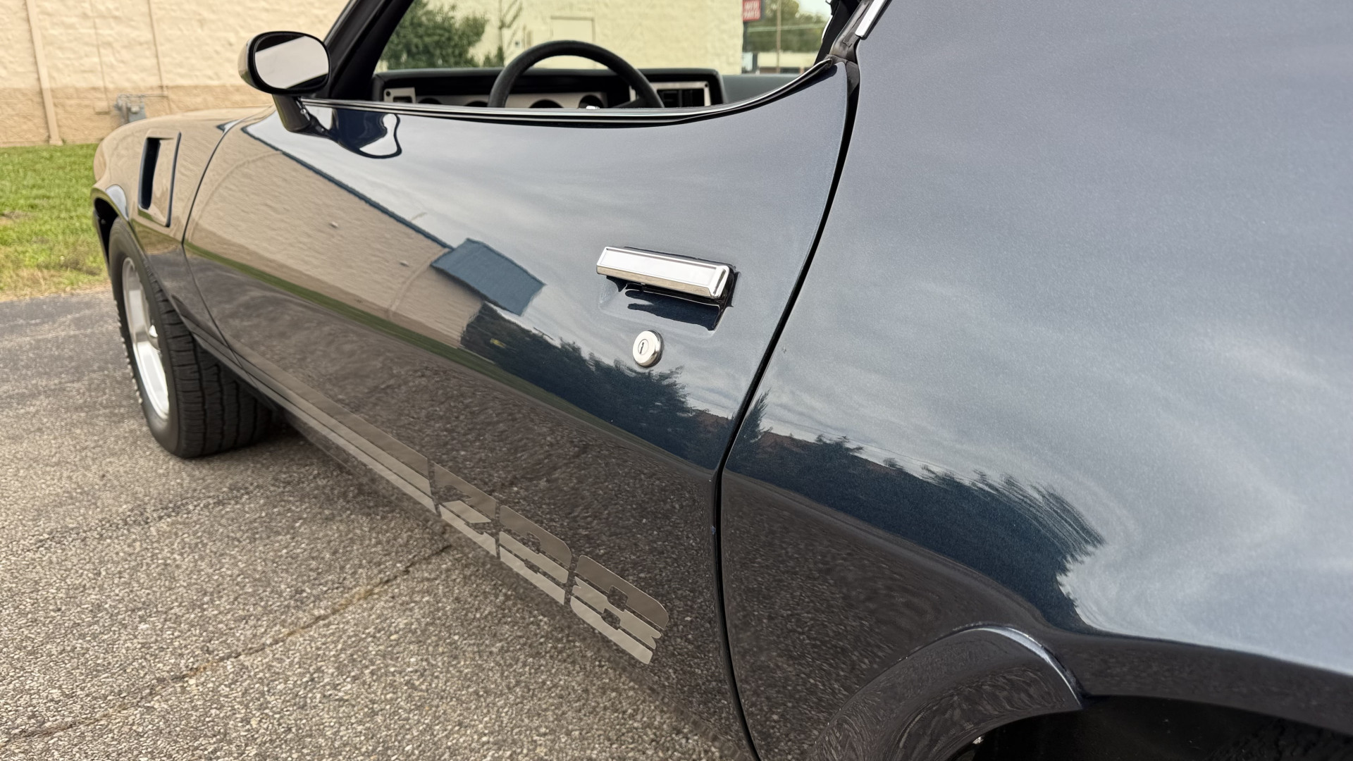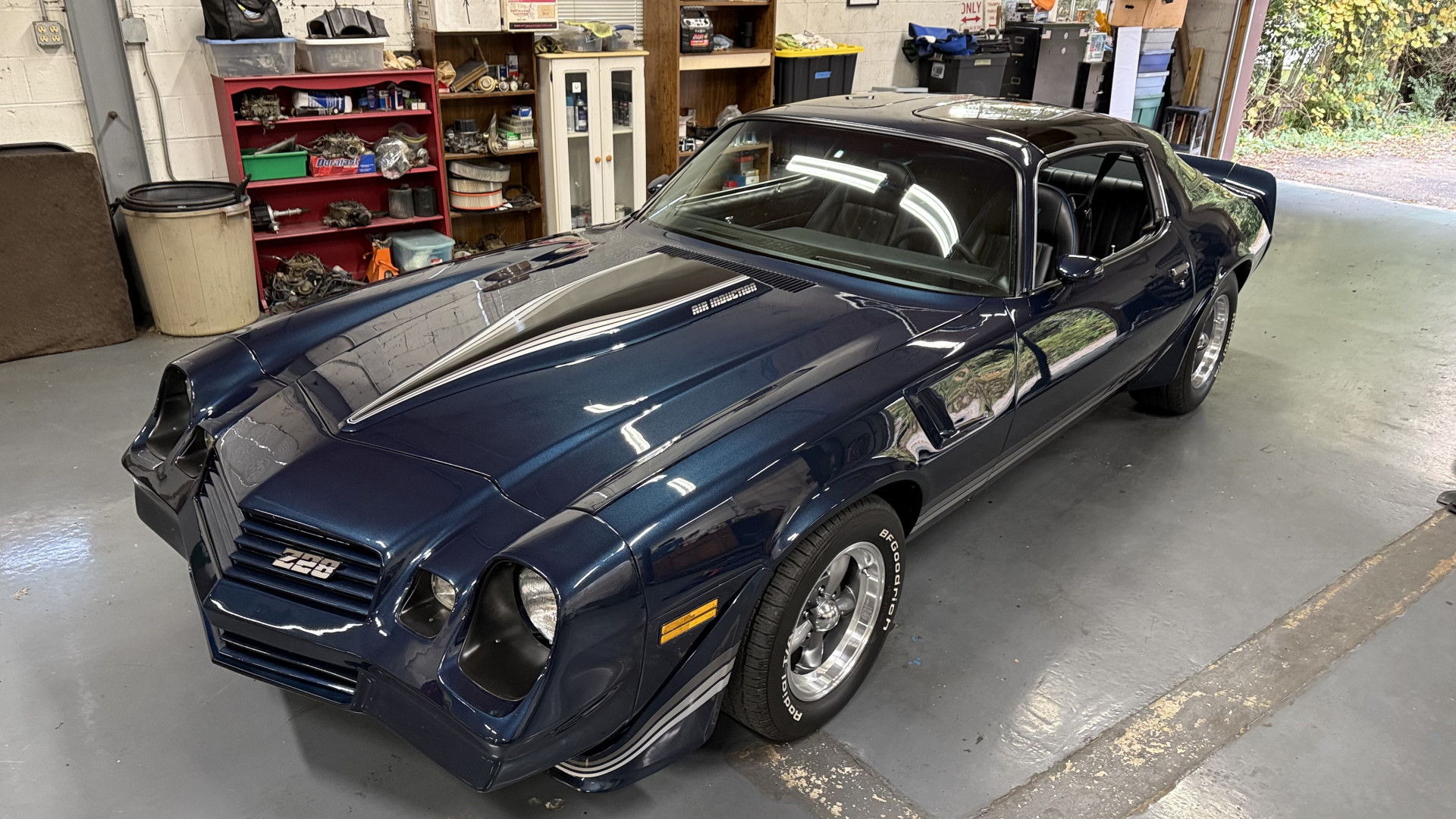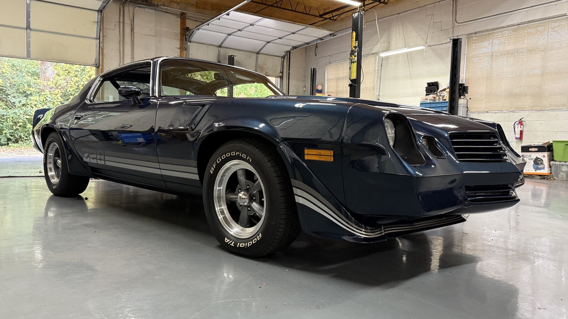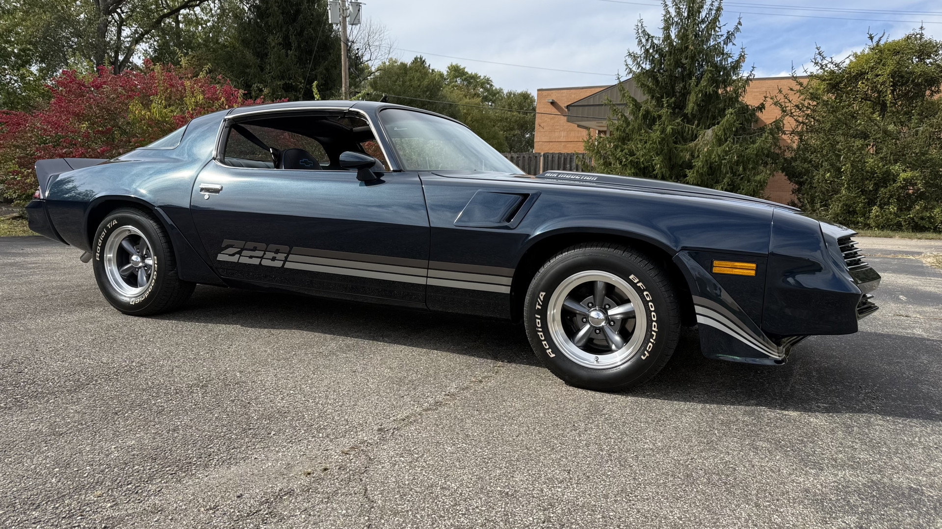 The Blue exterior is in superb restored condition. This Z28 was put on a rotisserie and treated to a professional repaint and the body and paint are in show condition. The paint quality is excellent with an excellent gloss and is smooth to the touch. The decals and trim all look new. The body is very solid and the gaps and lines are excellent. Both bumpers are in excellent shape with no flaking or faded paint and no spider webbing. The decals are new and in perfect shape and really accent the car and Z28 package. There is zero rust on this car and no bubbling paint or cracked paint or areas with heavy bondo or repairs. There may be some minor imperfections that are not noticeable in the photos, but nothing was intentionally excluded from the photos. The BF Goodrich tires have great tread left and the aftermarket wheels look excellent on the car and are like new. All weather stripping and window sweeps are in excellent new condition. The door seals, trunk seal, window sweeps, and window seals are all newer. Trunk is very solid and clean with the spare tire, trunk mat, and jack and tools. A power sub woofer and new 6×9 speakers were installed.