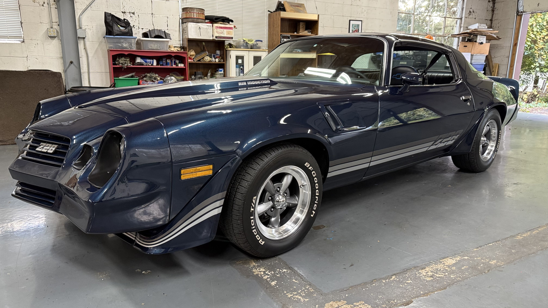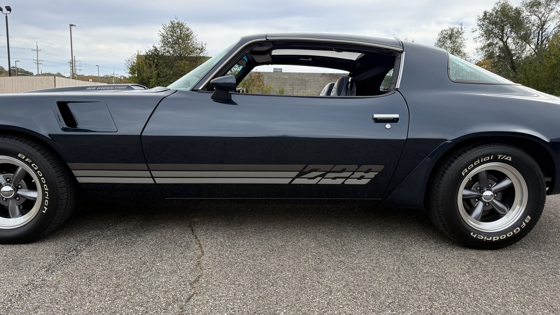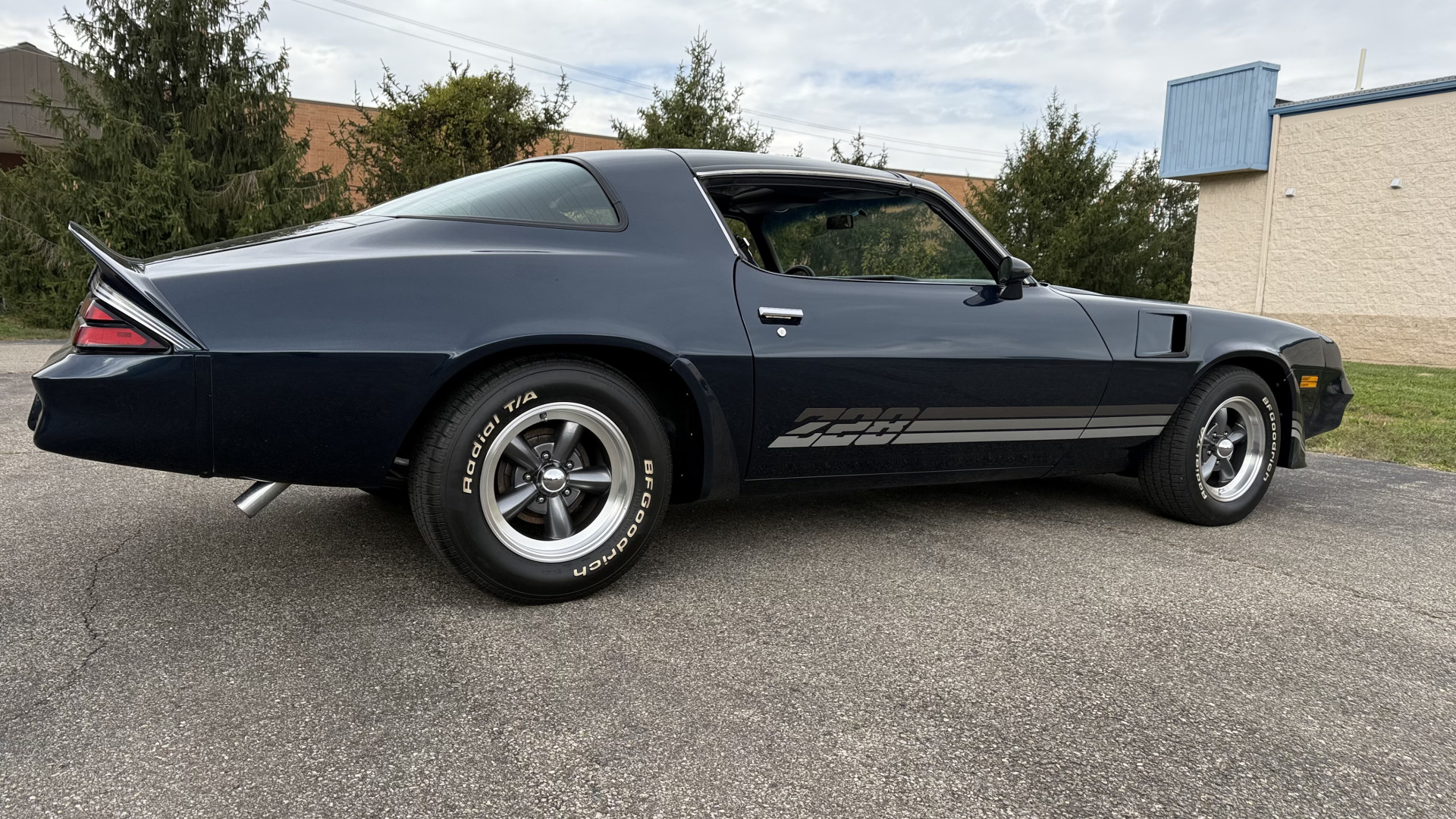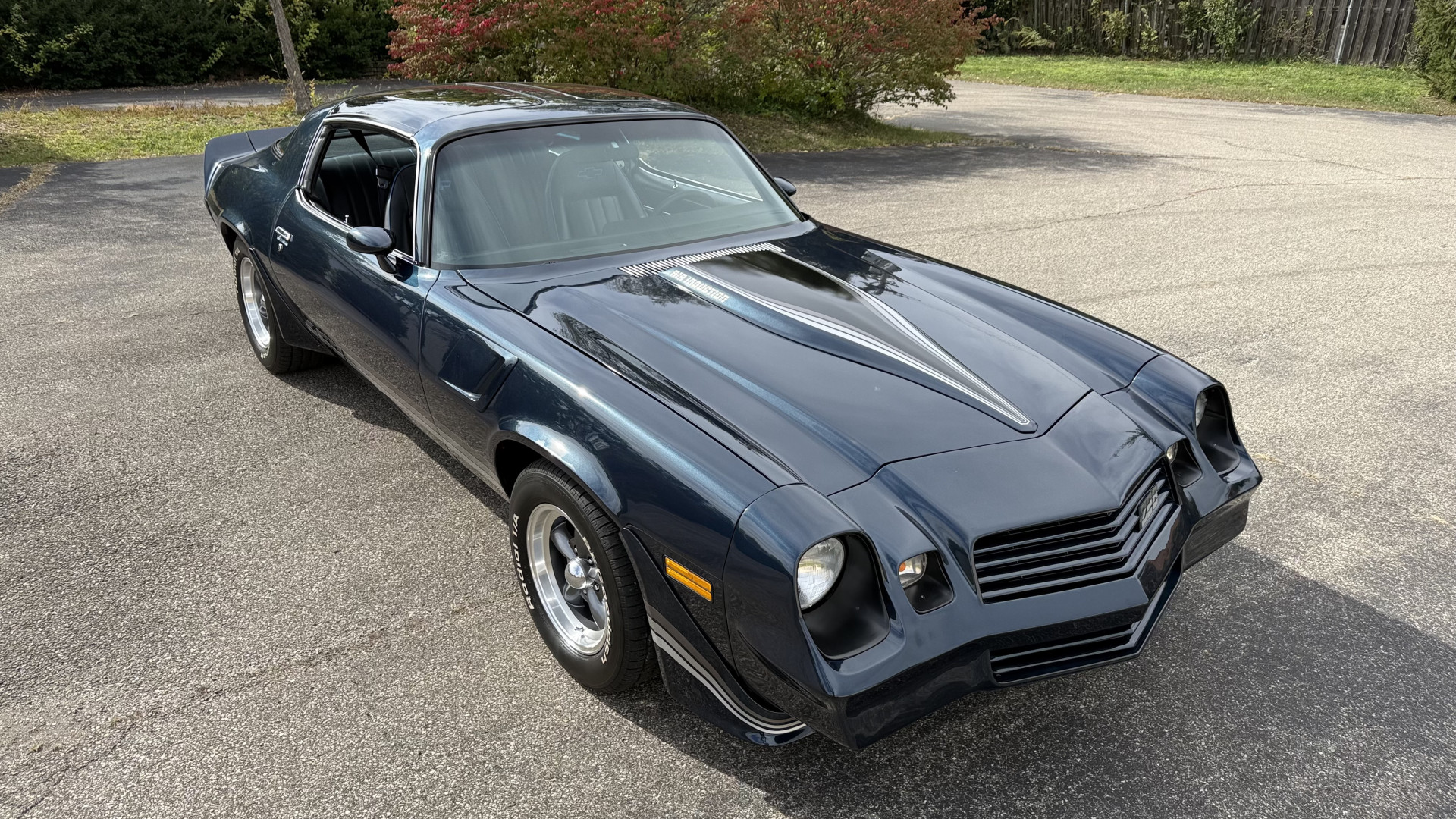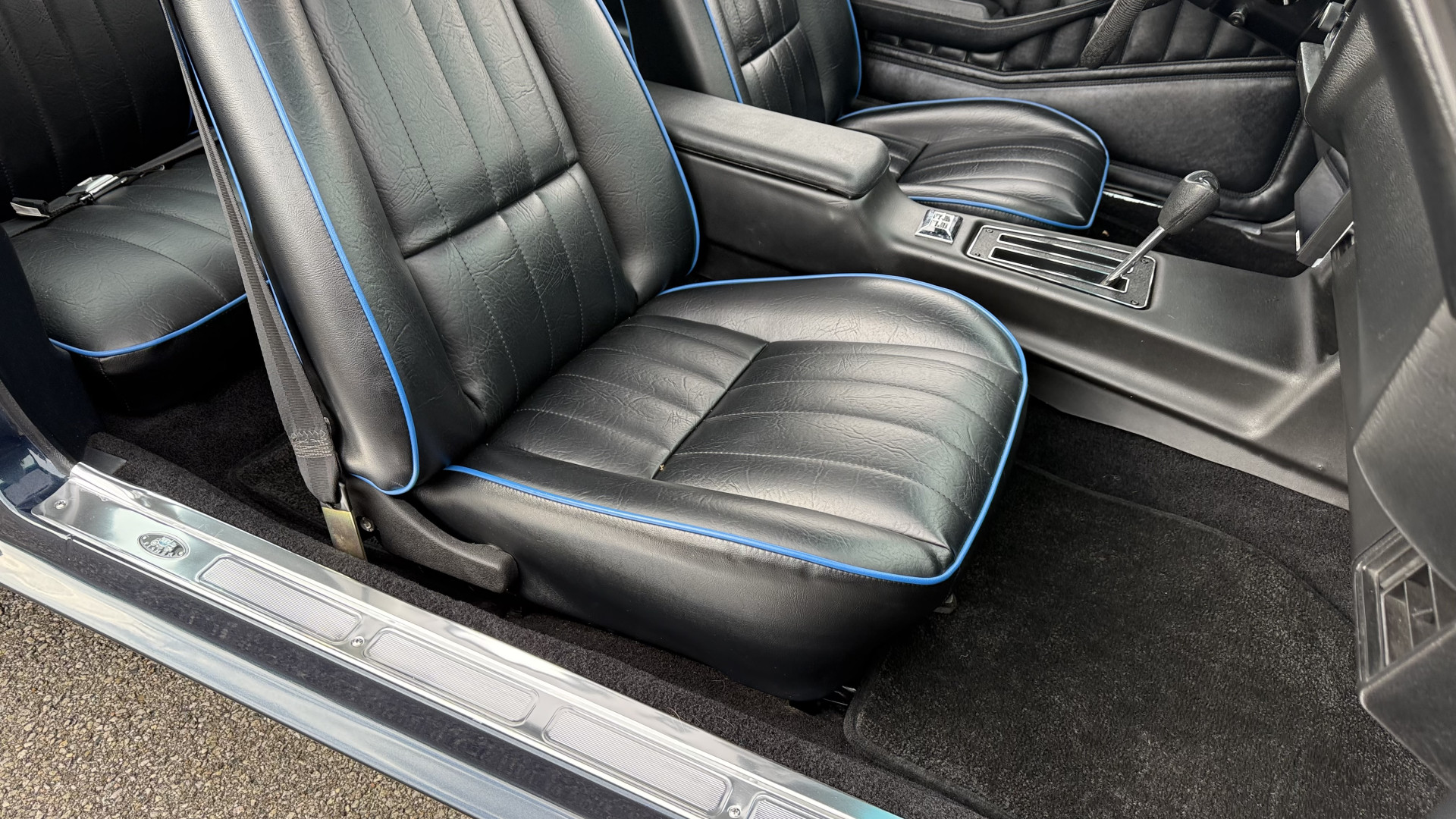 The Blue exterior is in superb restored condition. This Z28 was put on a rotisserie and treated to a professional repaint and the body and paint are in show condition. The paint quality is excellent with an excellent gloss and is smooth to the touch. The decals and trim all look new. The body is very solid and the gaps and lines are excellent. Both bumpers are in excellent shape with no flaking or faded paint and no spider webbing. The decals are new and in perfect shape and really accent the car and Z28 package. There is zero rust on this car and no bubbling paint or cracked paint or areas with heavy bondo or repairs. There may be some minor imperfections that are not noticeable in the photos, but nothing was intentionally excluded from the photos. The BF Goodrich tires have great tread left and the aftermarket wheels look excellent on the car and are like new. All weather stripping and window sweeps are in excellent new condition. The door seals, trunk seal, window sweeps, and window seals are all newer. Trunk is very solid and clean with the spare tire, trunk mat, and jack and tools. A power sub woofer and new 6×9 speakers were installed.