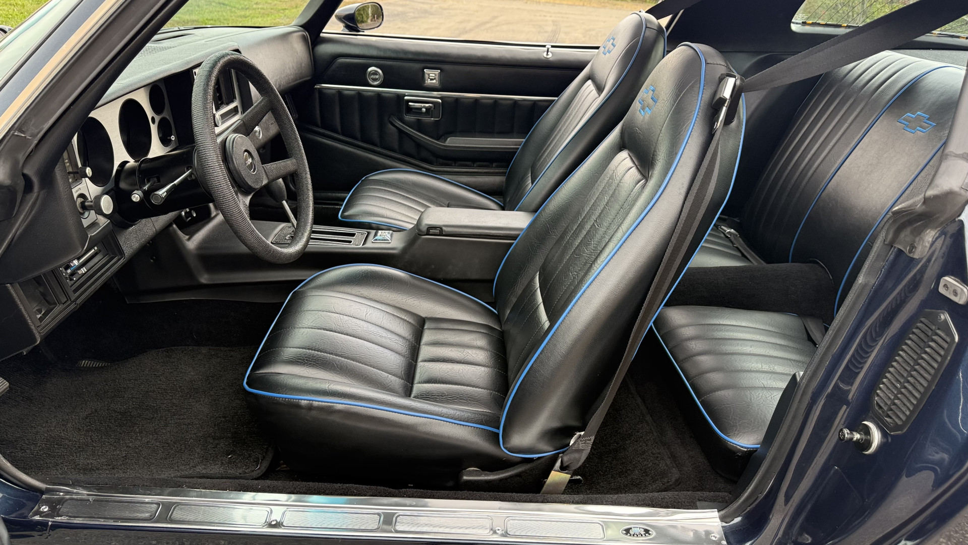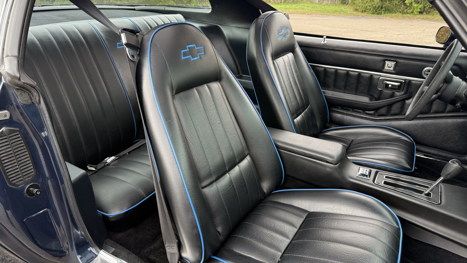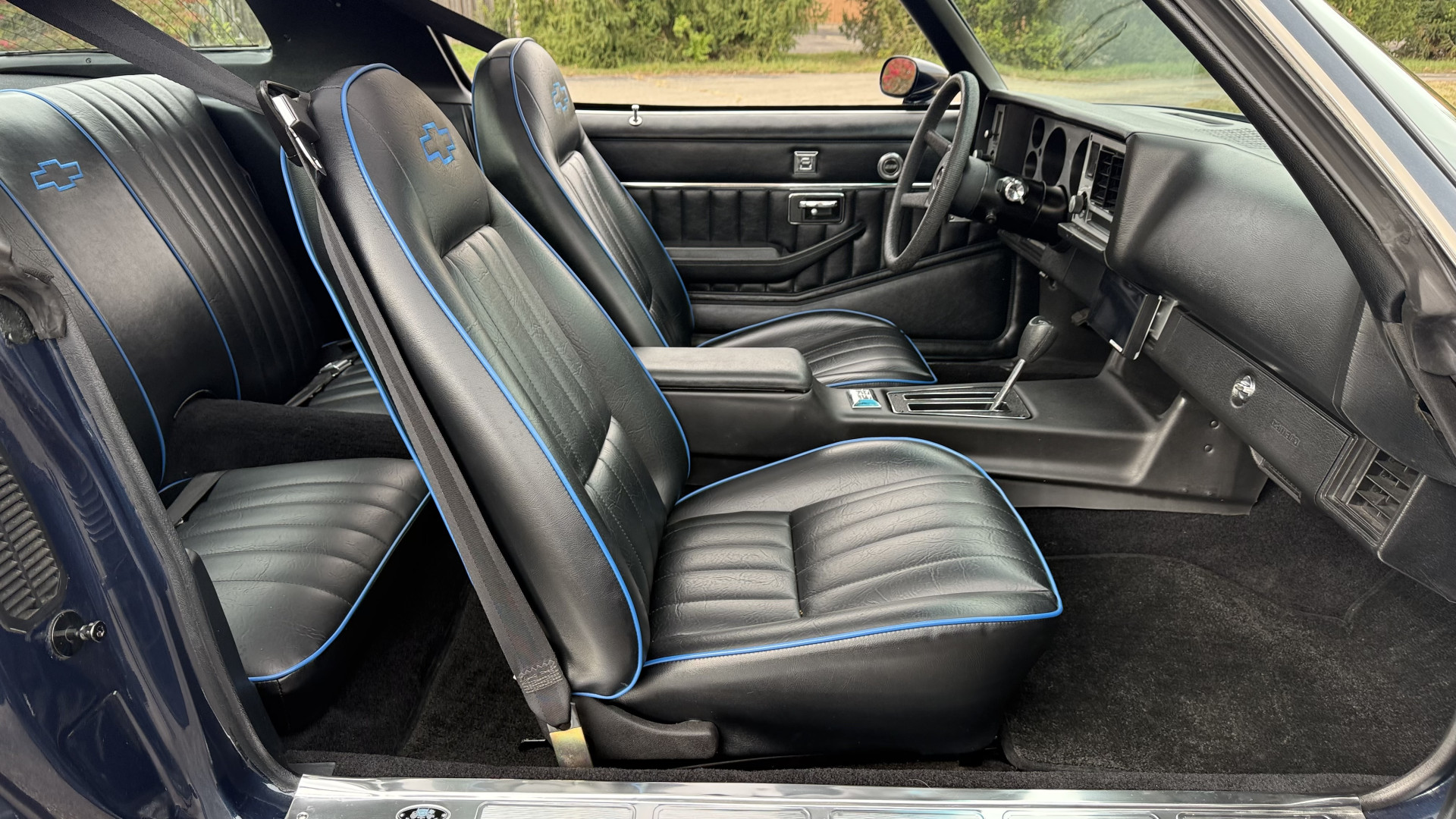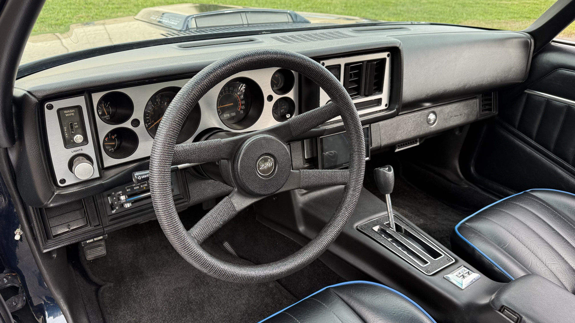 The Black vinyl interior of this Z28 is in excellent restored condition. The seat covers are fully restored with new foam and covers with custom logos and piping. The carpet is like new and was replaced and is in very good condition too with no major stains, rips, or holes. The dash is in excellent overall condition and the dash bezel is in excellent condition as well. There are no cracks in the dash and no warping or fading. The stereo was upgraded this year with a new bluetooth touch screen system which looks and sounds excellent. The dash was not cut at all for the installation. The door panels are in like new condition and both door pulls are solid and in tact. The headliner is in great condition with no stains and is not sagging at all. The package tray is like new and in great condition. All interior lights and gauges work as they should outside of the clock which is common for not working. The stereo, wipers, horn, and blower motor all work. The tilt wheel works as it should. This car has not been smoked in; there is no aroma what so ever.