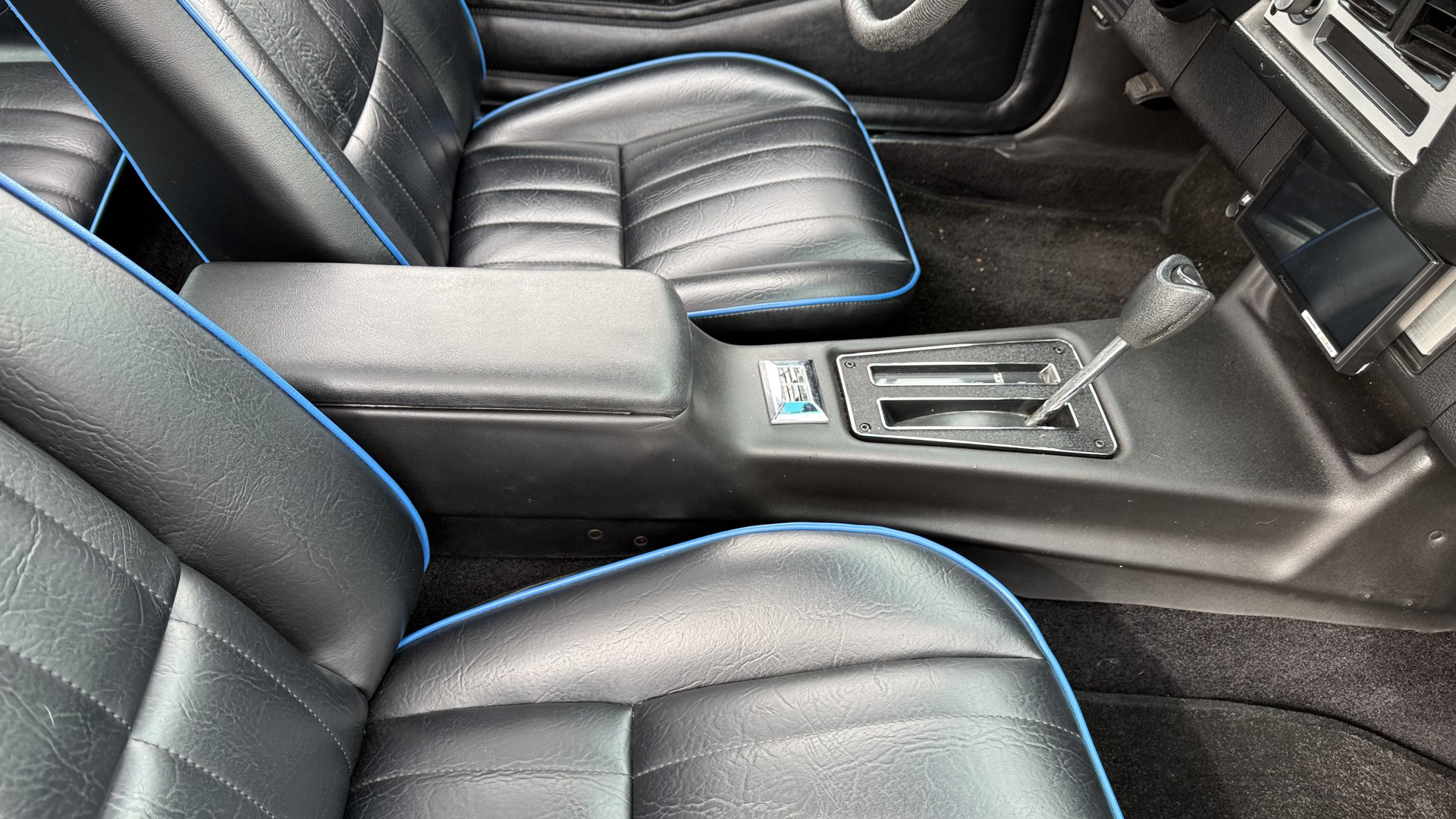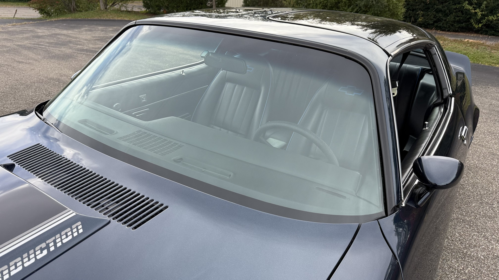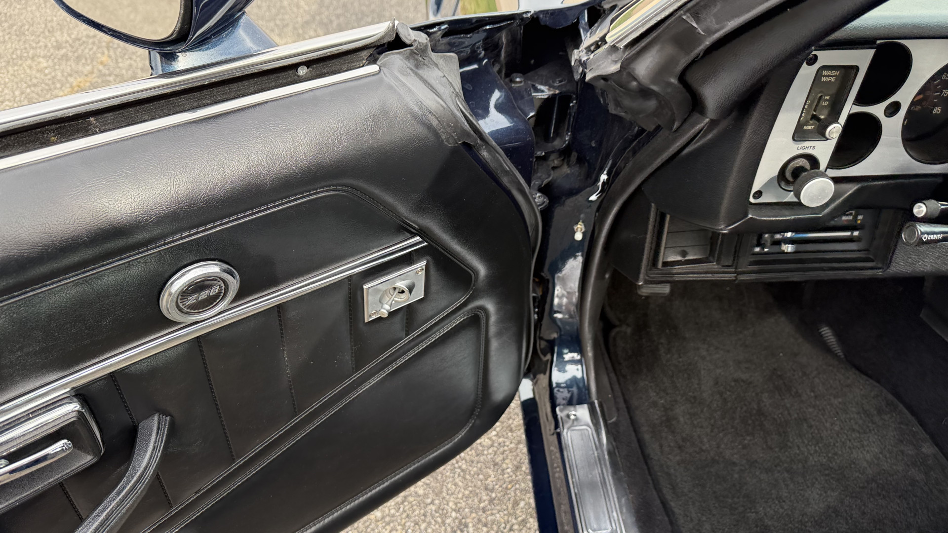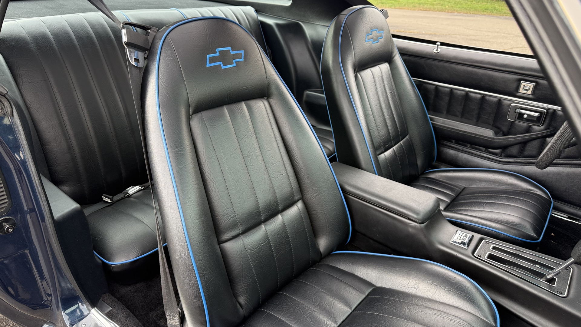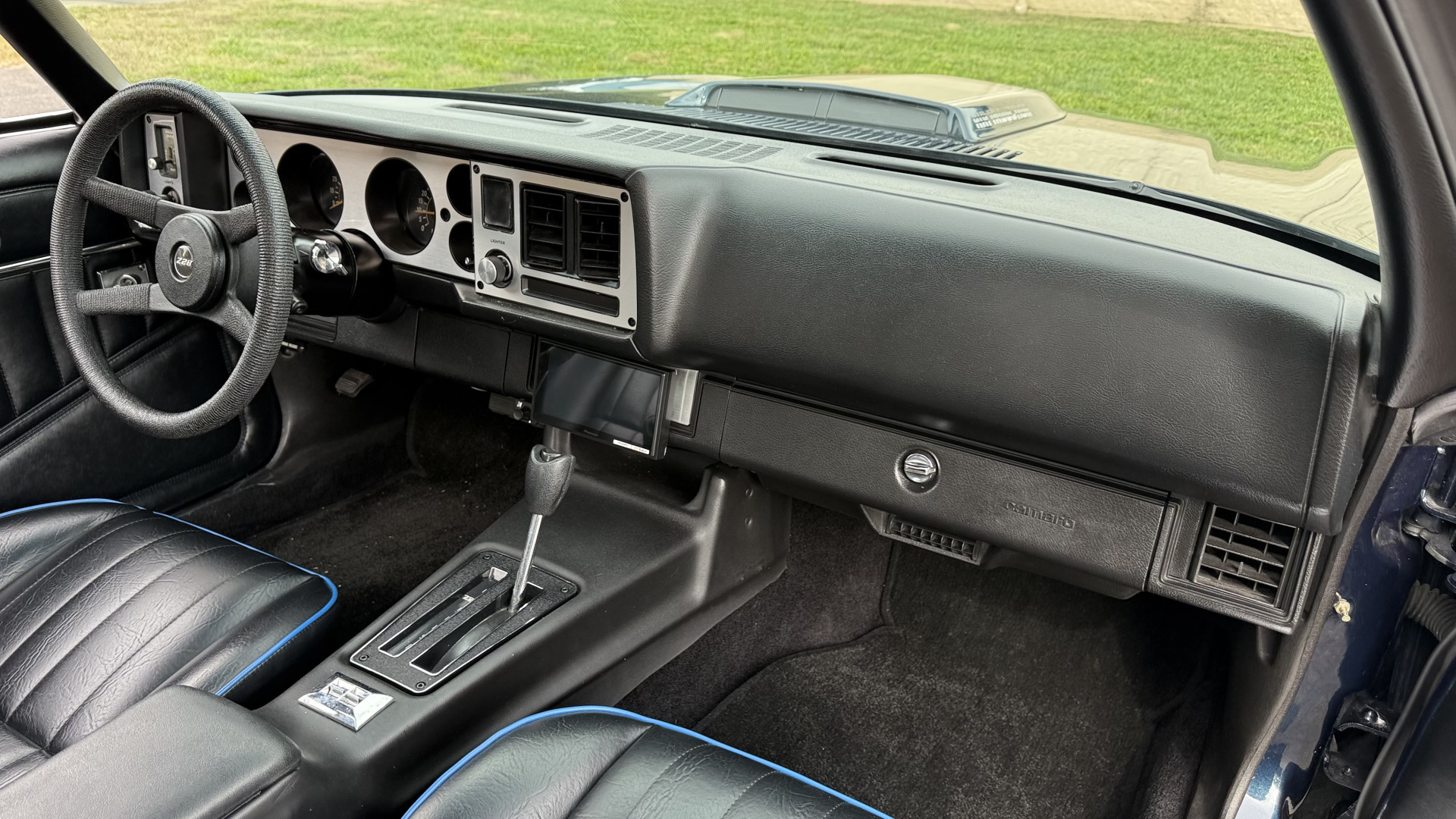 The Black vinyl interior of this Z28 is in excellent restored condition. The seat covers are fully restored with new foam and covers with custom logos and piping. The carpet is like new and was replaced and is in very good condition too with no major stains, rips, or holes. The dash is in excellent overall condition and the dash bezel is in excellent condition as well. There are no cracks in the dash and no warping or fading. The stereo was upgraded this year with a new bluetooth touch screen system which looks and sounds excellent. The dash was not cut at all for the installation. The door panels are in like new condition and both door pulls are solid and in tact. The headliner is in great condition with no stains and is not sagging at all. The package tray is like new and in great condition. All interior lights and gauges work as they should outside of the clock which is common for not working. The stereo, wipers, horn, and blower motor all work. The tilt wheel works as it should. This car has not been smoked in; there is no aroma what so ever.