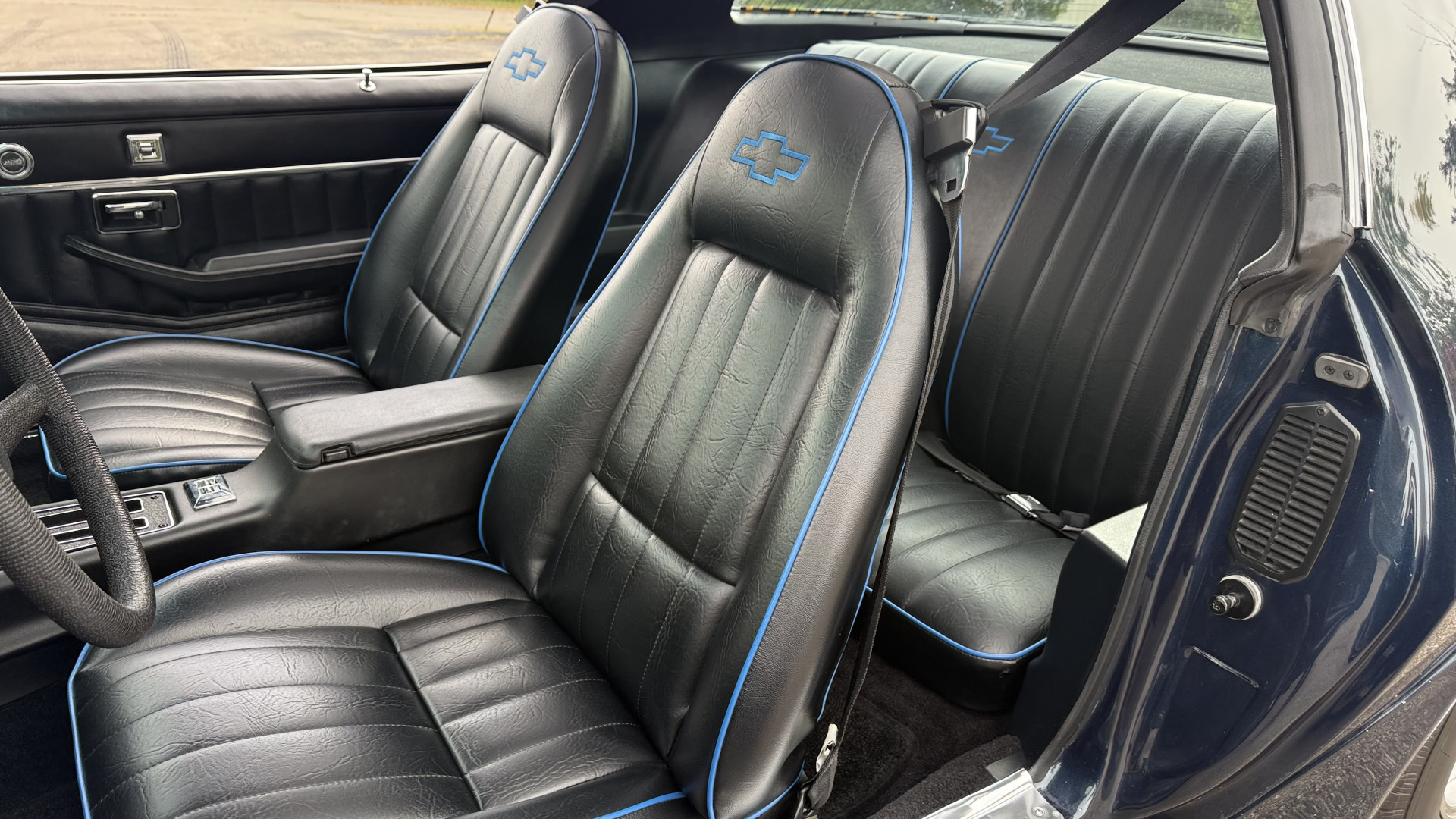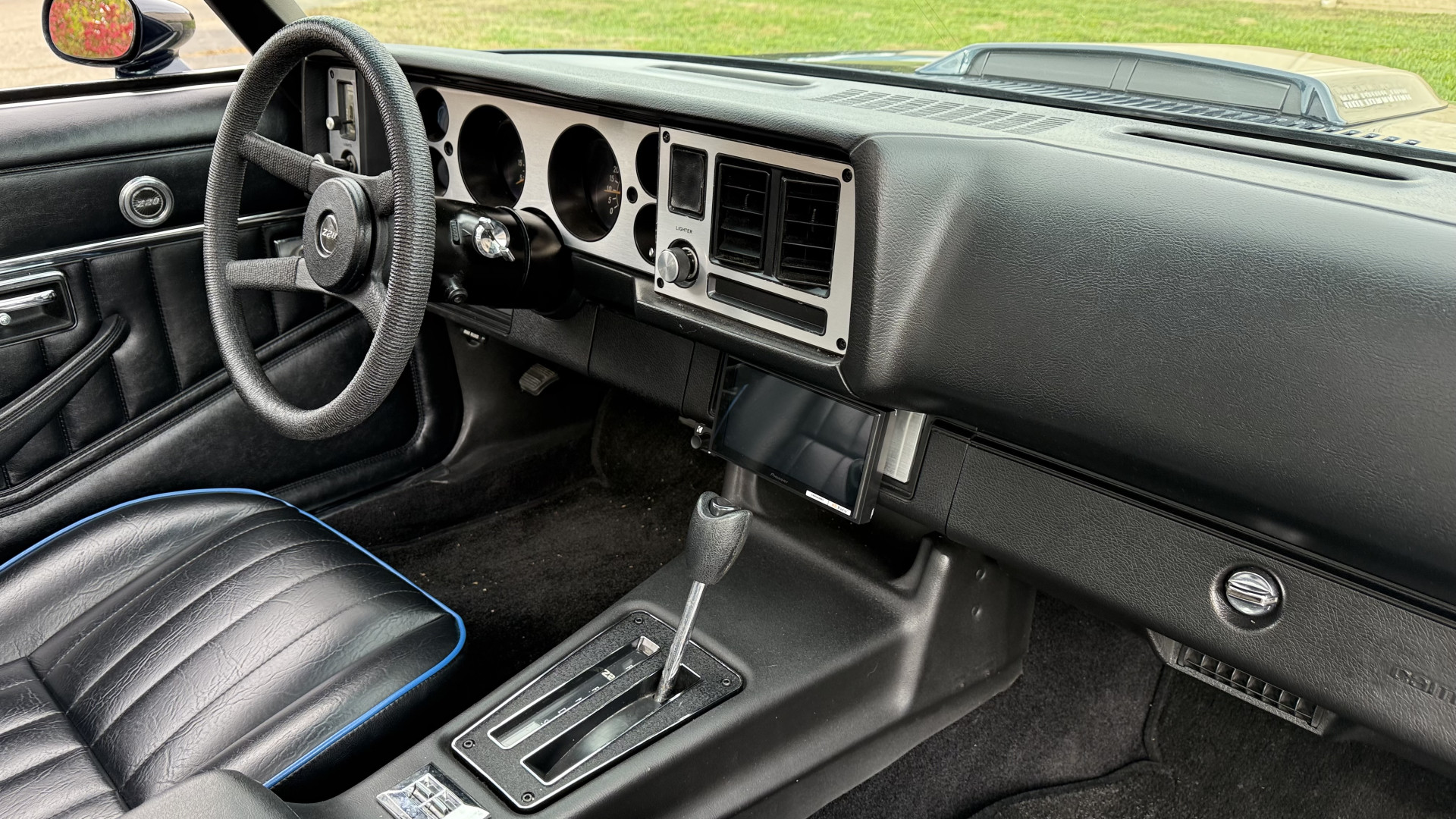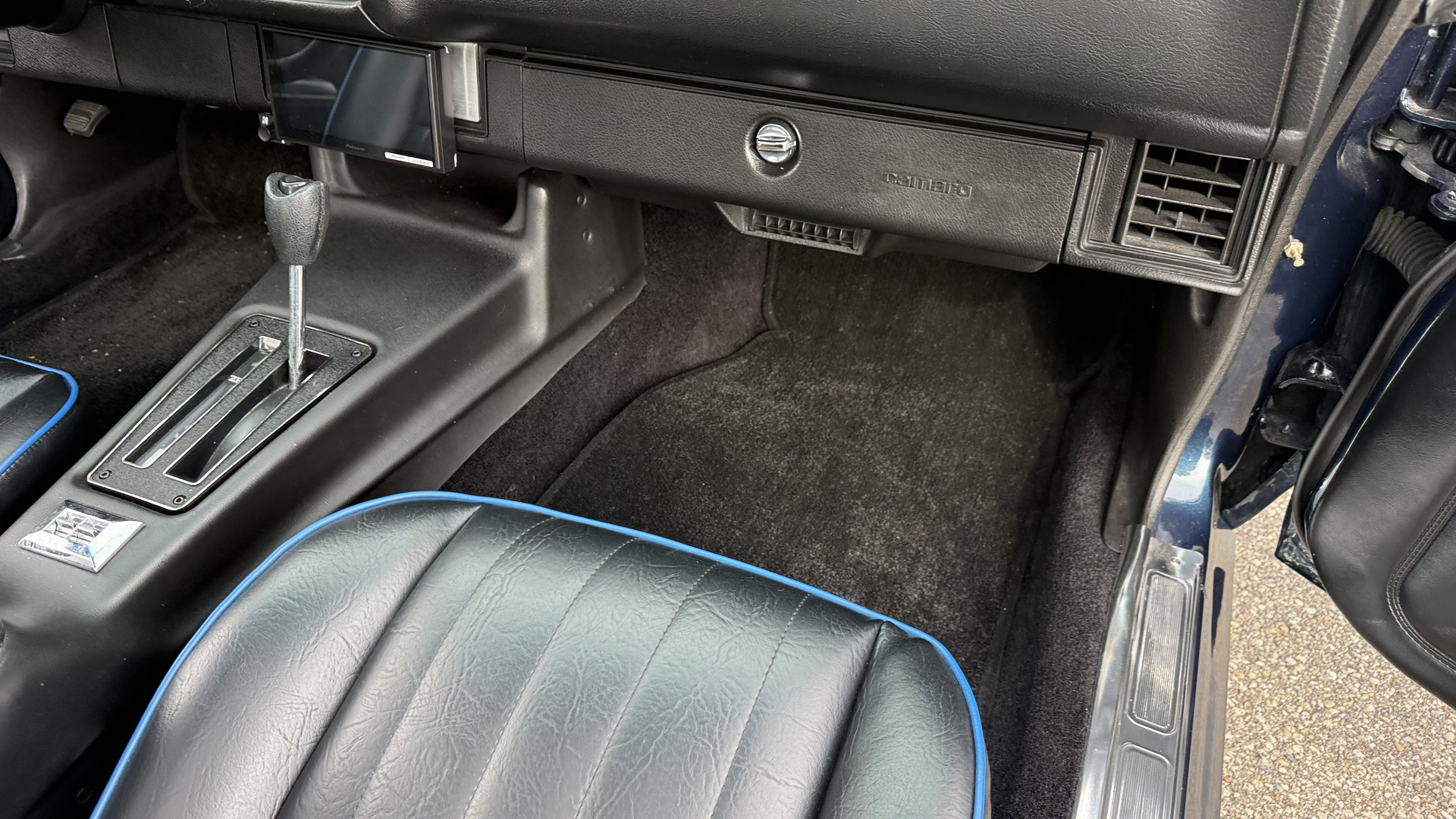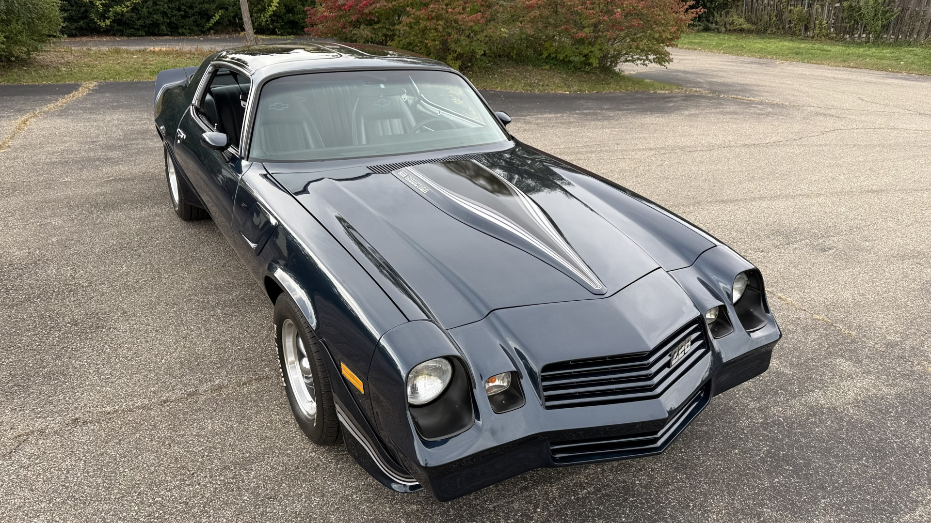 The Black vinyl interior of this Z28 is in excellent restored condition. The seat covers are fully restored with new foam and covers with custom logos and piping. The carpet is like new and was replaced and is in very good condition too with no major stains, rips, or holes. The dash is in excellent overall condition and the dash bezel is in excellent condition as well. There are no cracks in the dash and no warping or fading. The stereo was upgraded this year with a new bluetooth touch screen system which looks and sounds excellent. The dash was not cut at all for the installation. The door panels are in like new condition and both door pulls are solid and in tact. The headliner is in great condition with no stains and is not sagging at all. The package tray is like new and in great condition. All interior lights and gauges work as they should outside of the clock which is common for not working. The stereo, wipers, horn, and blower motor all work. The tilt wheel works as it should. This car has not been smoked in; there is no aroma what so ever.