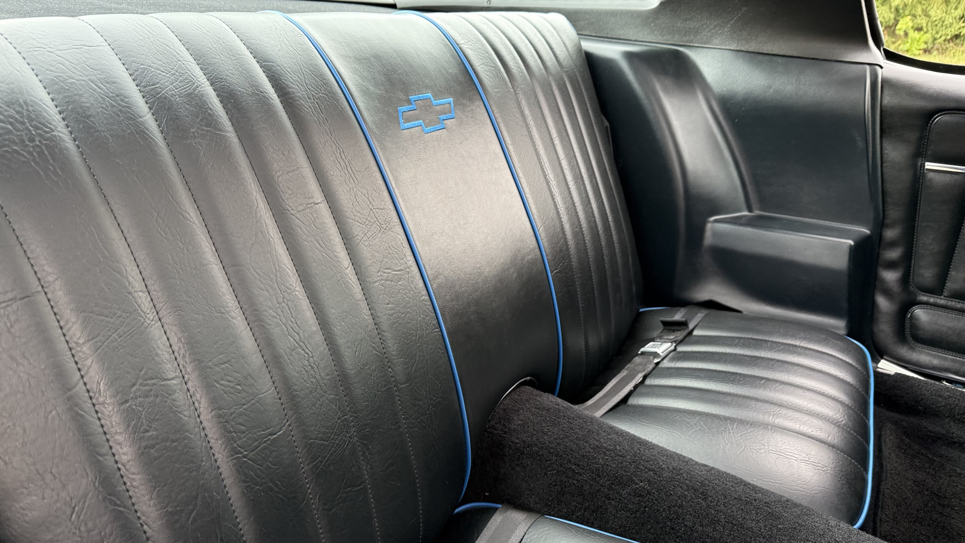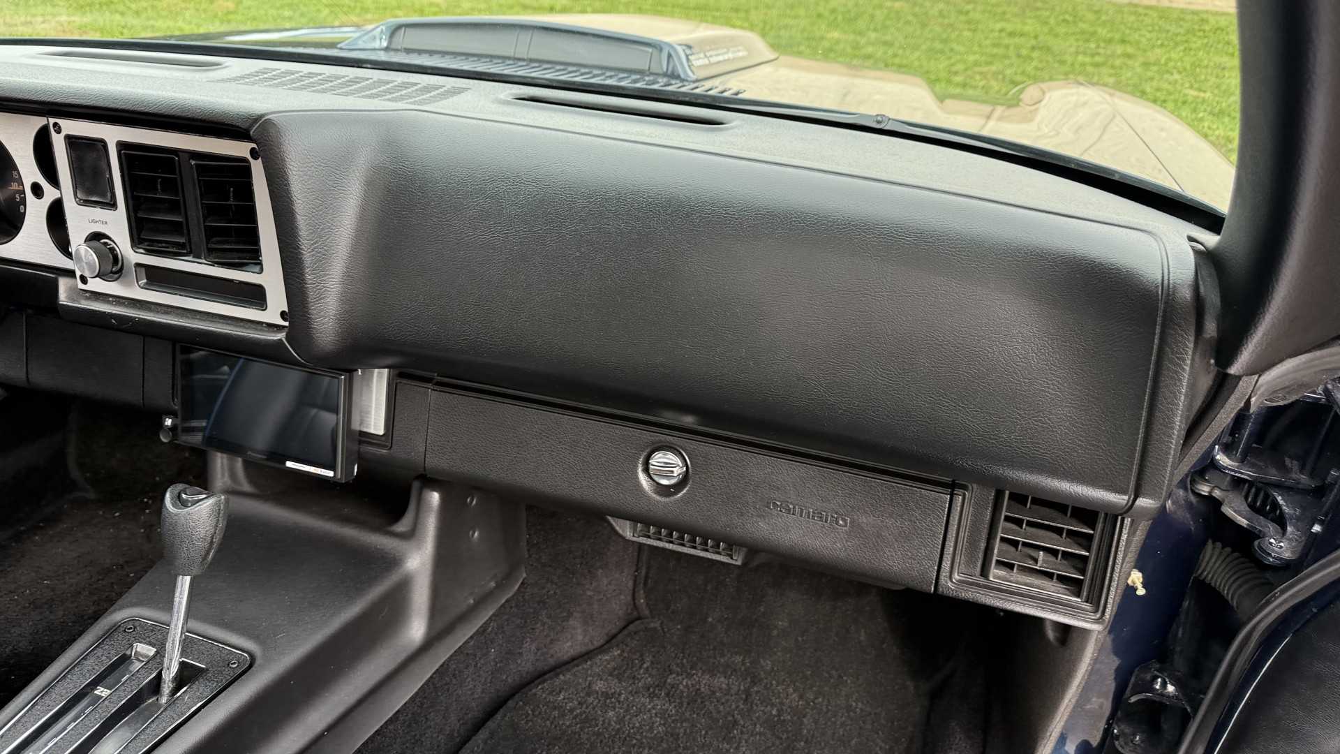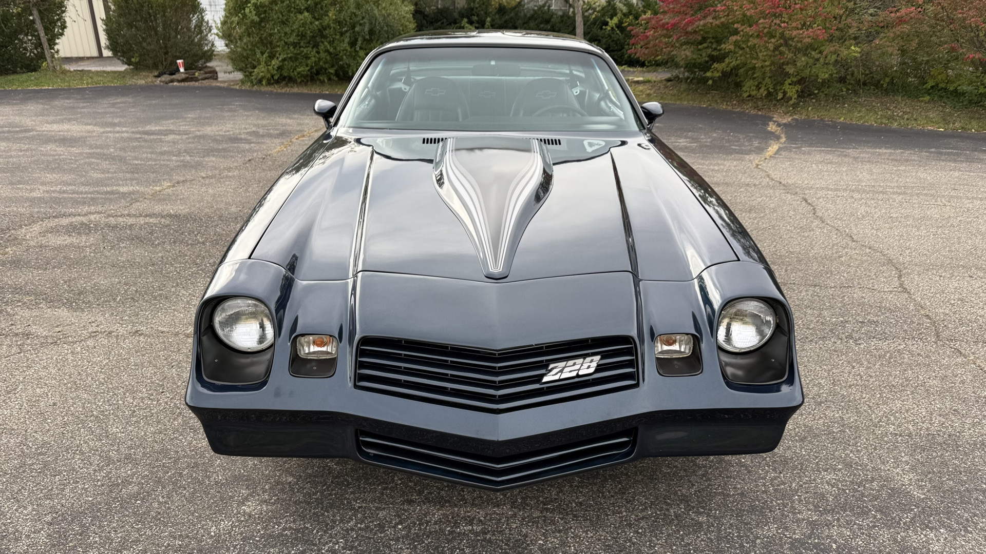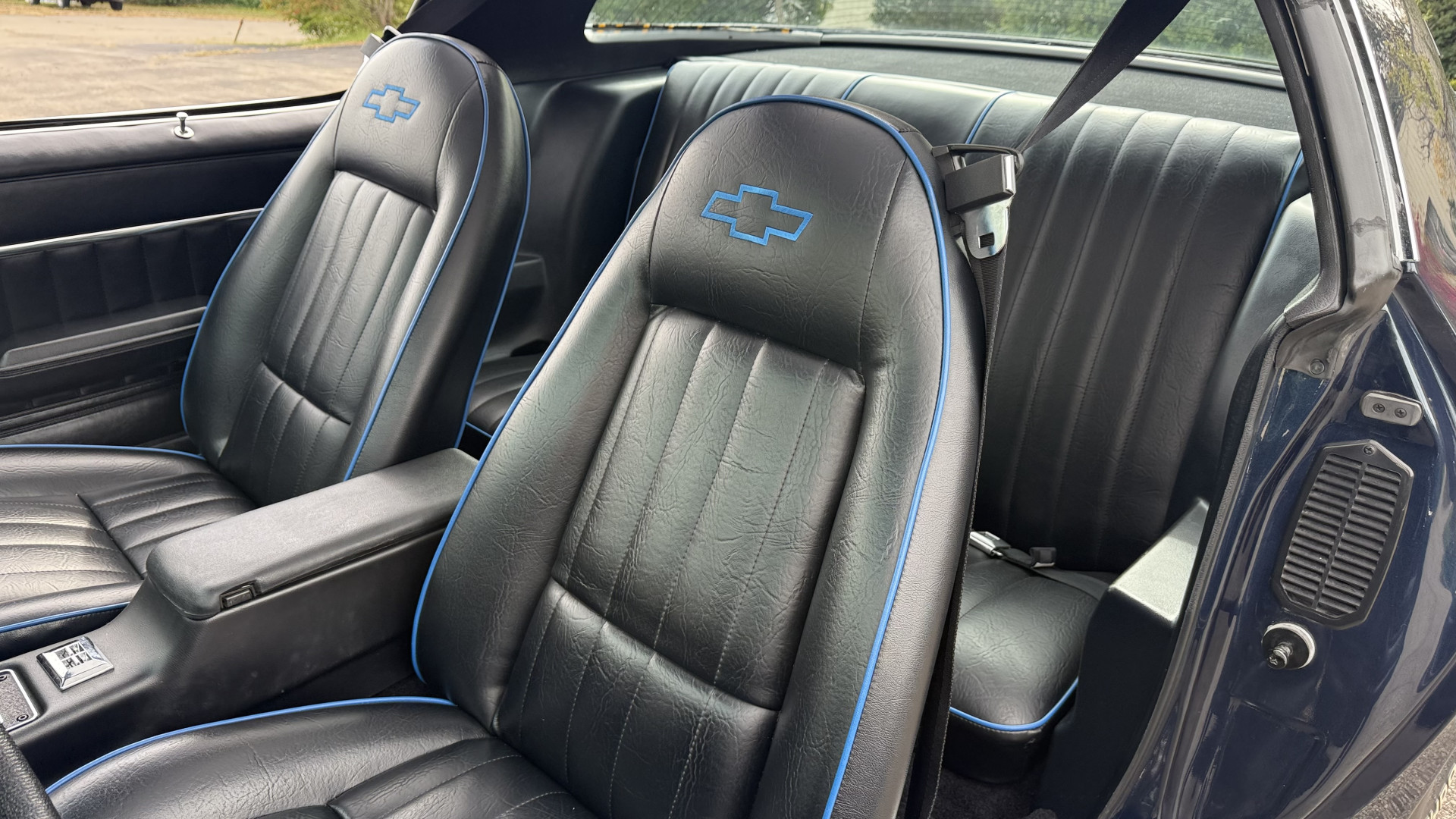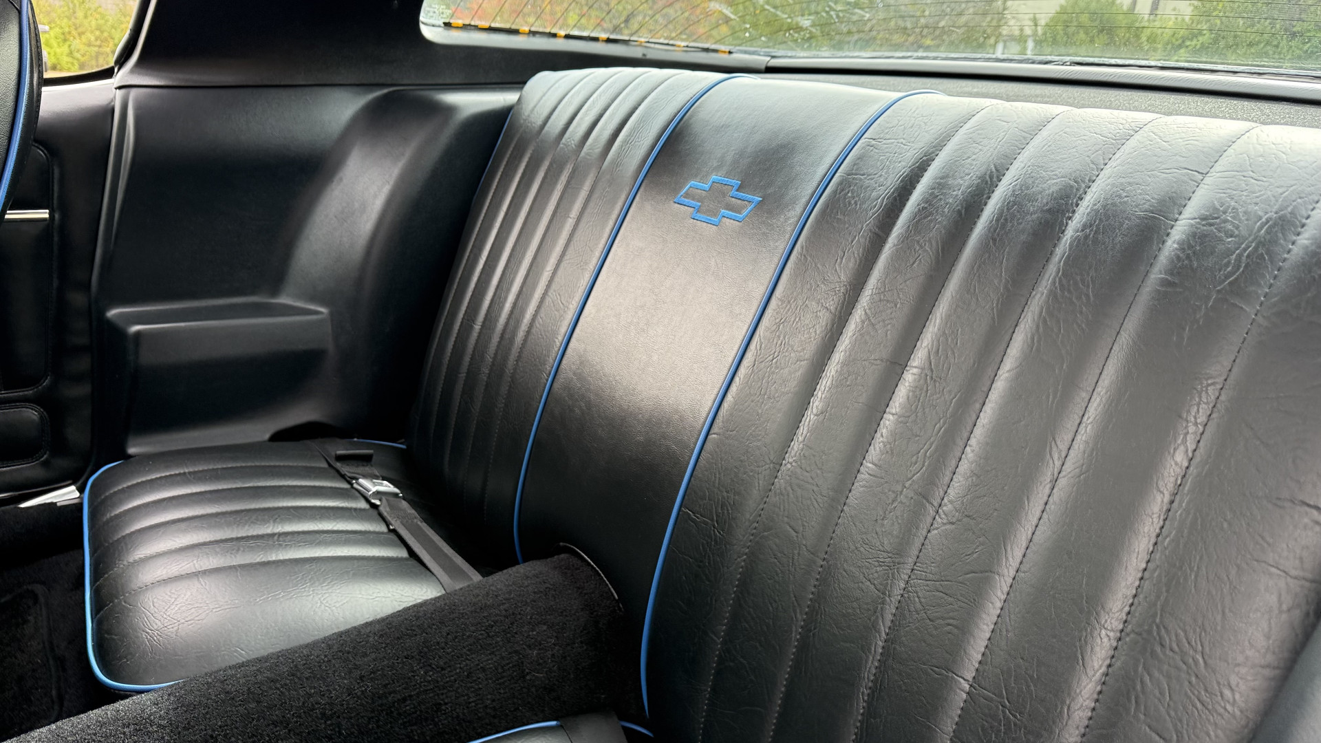 The Black vinyl interior of this Z28 is in excellent restored condition. The seat covers are fully restored with new foam and covers with custom logos and piping. The carpet is like new and was replaced and is in very good condition too with no major stains, rips, or holes. The dash is in excellent overall condition and the dash bezel is in excellent condition as well. There are no cracks in the dash and no warping or fading. The stereo was upgraded this year with a new bluetooth touch screen system which looks and sounds excellent. The dash was not cut at all for the installation. The door panels are in like new condition and both door pulls are solid and in tact. The headliner is in great condition with no stains and is not sagging at all. The package tray is like new and in great condition. All interior lights and gauges work as they should outside of the clock which is common for not working. The stereo, wipers, horn, and blower motor all work. The tilt wheel works as it should. This car has not been smoked in; there is no aroma what so ever.